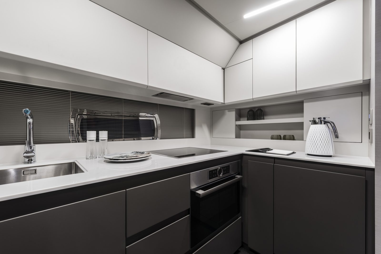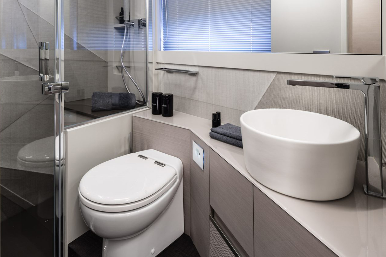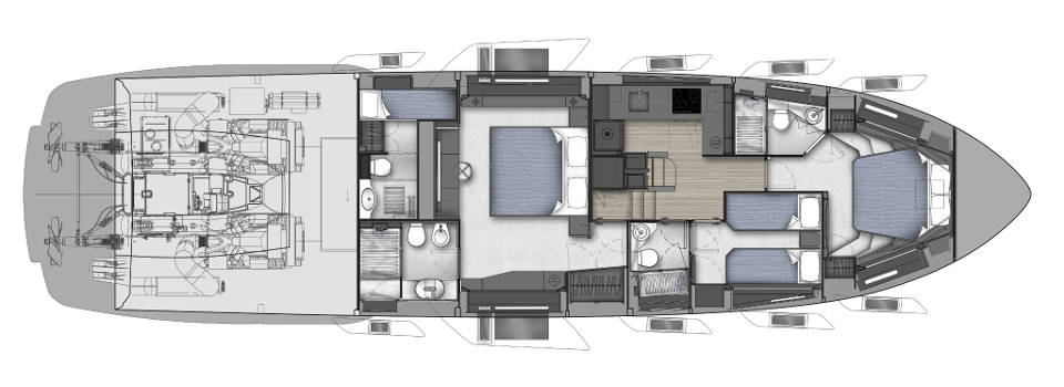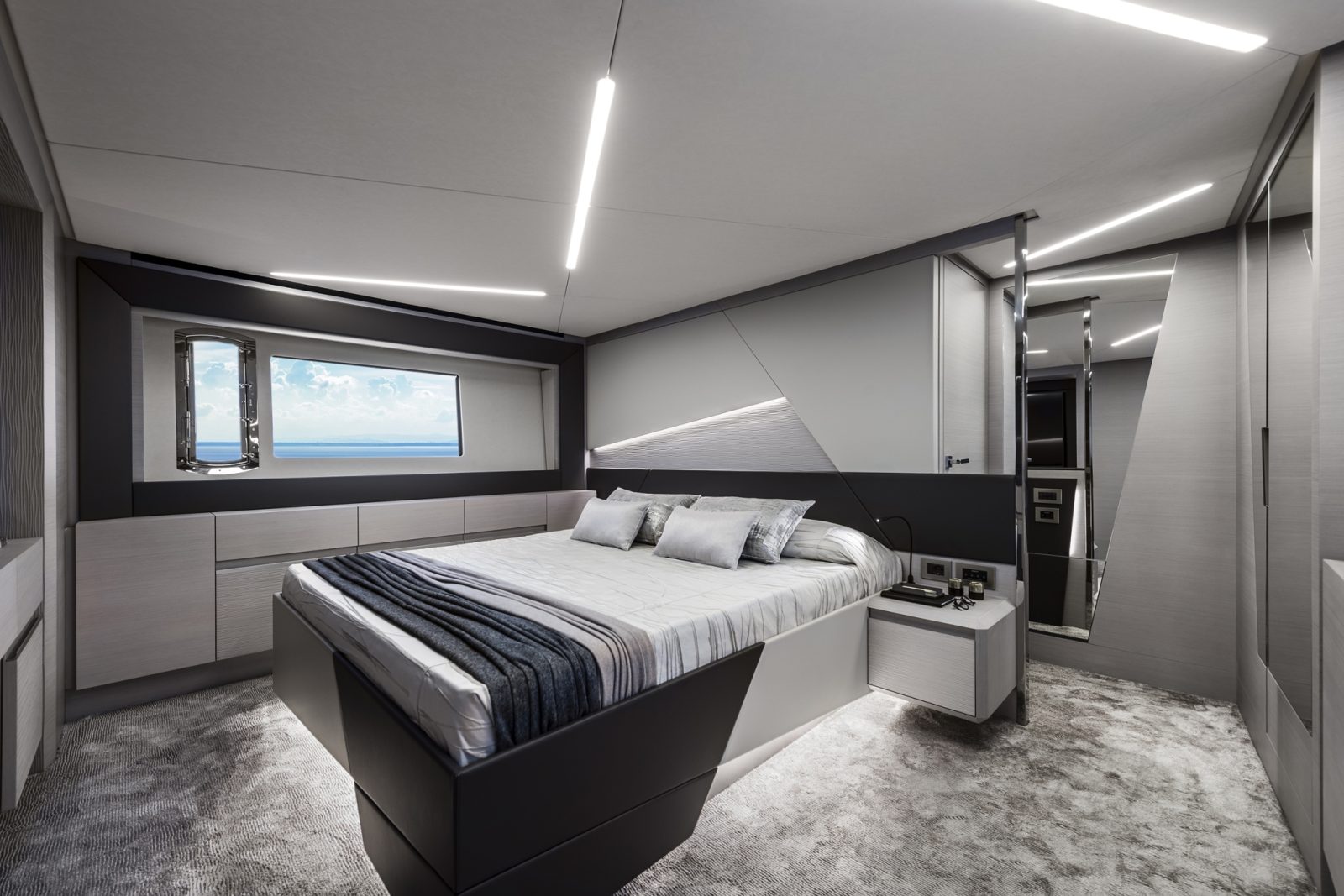 Spatial ergonomics are maximized thanks to the blending of technology and performance in perfect proportions. The open spaces allow the boat to be filled with pleasure and light, such as the large lounge characterized by the front openable windows and the dark glass sliding roof. The new, much larger rectangular portholes allow air and natural light to permeate the rooms below decks.