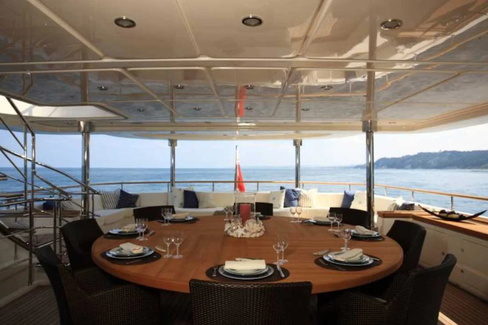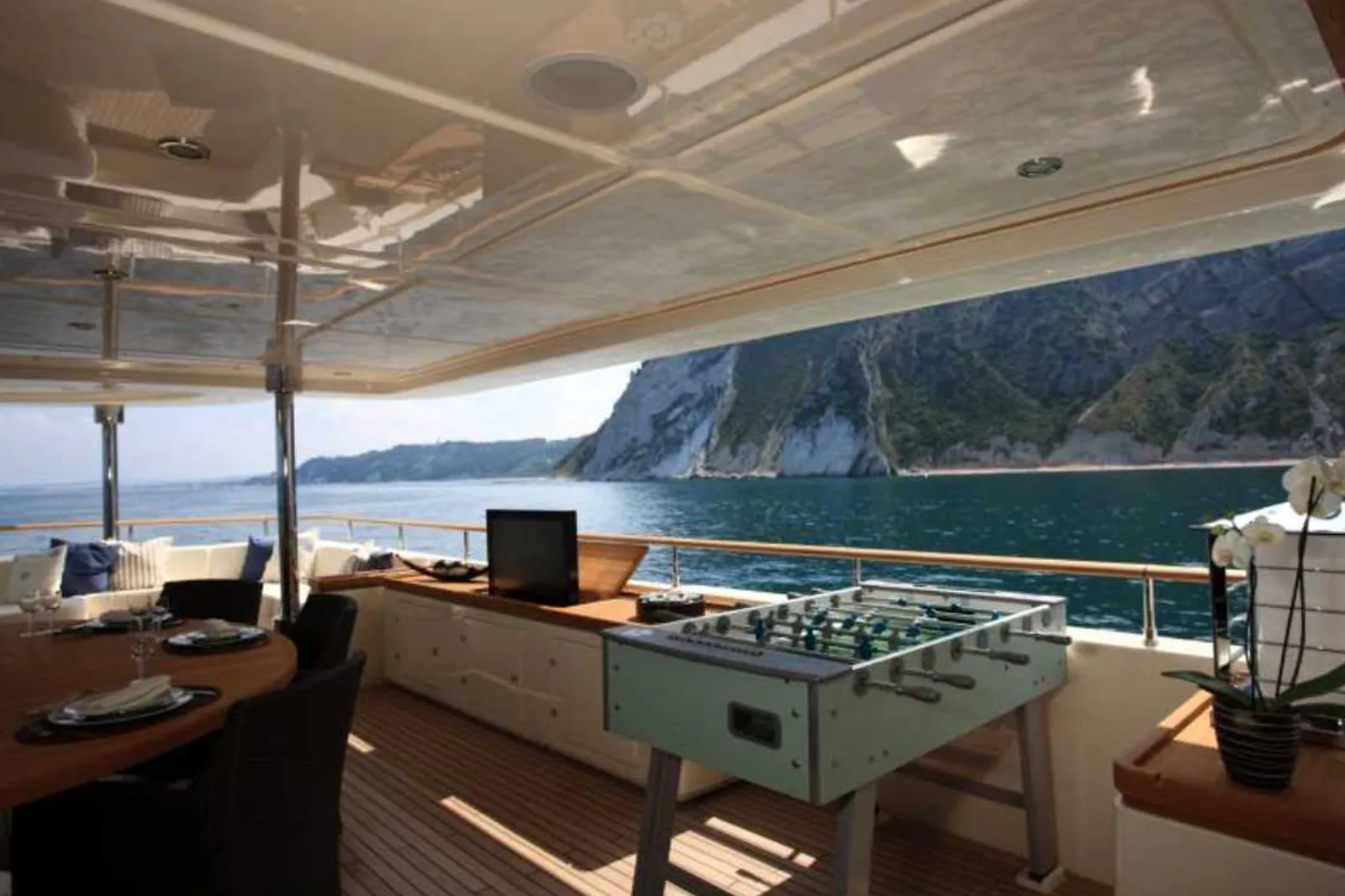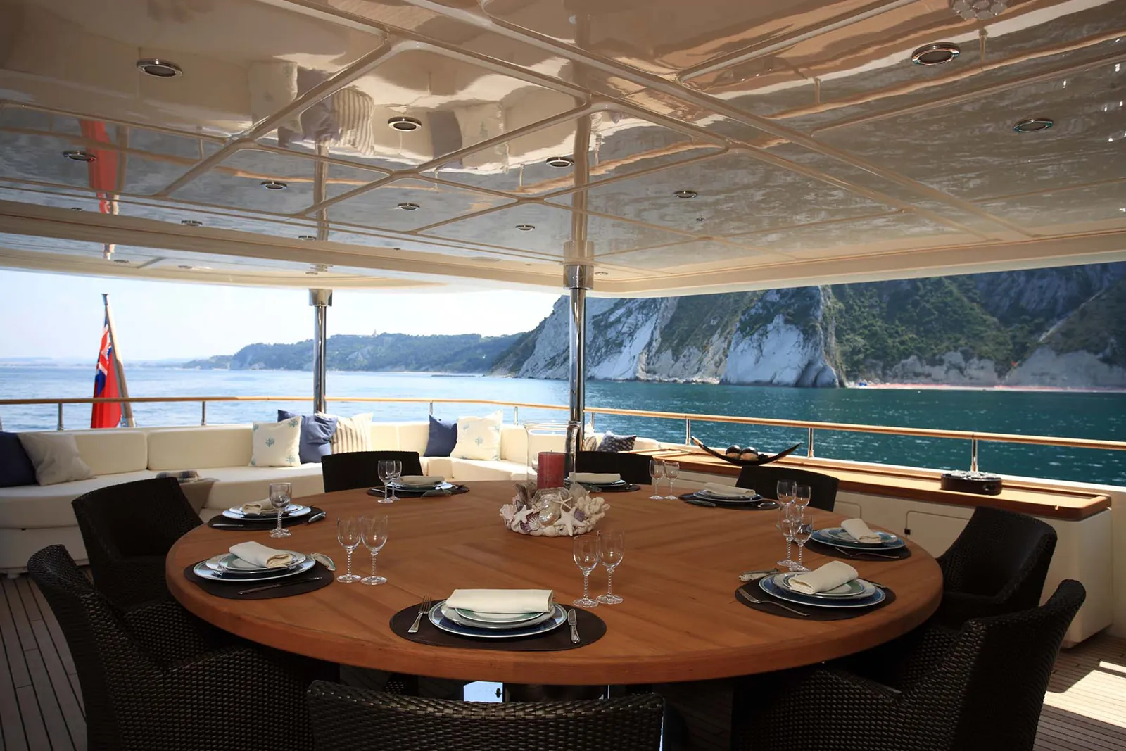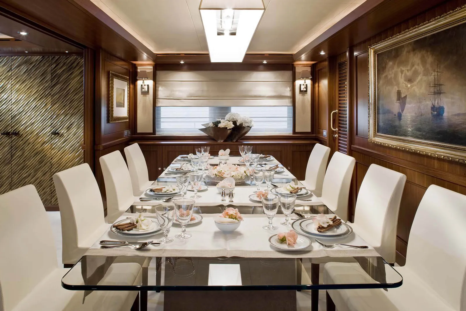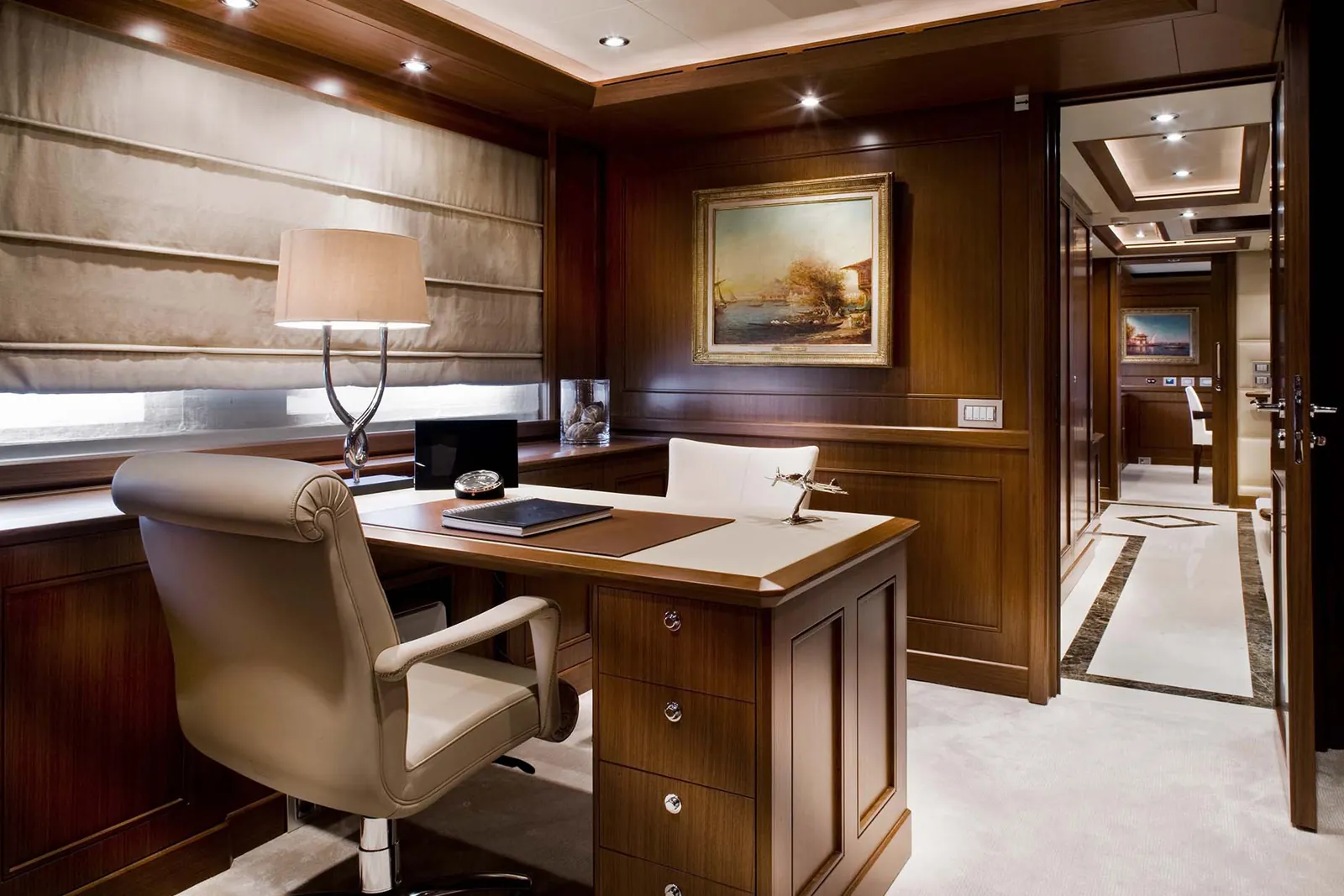 EVIVA has big hull volumes, with wide outdoor areas such as the covered aft main deck and the upper deck, the terrace in the owner’s suite, and the fitness and wellness area on the lower deck, in an indissoluble weave of personalization and tradition. The sobriety of her external lines is perfectly balanced with the elegance and refinement of the internal furnishings.