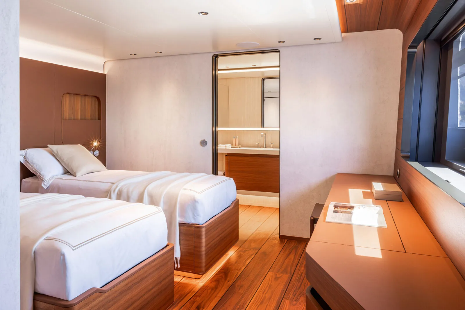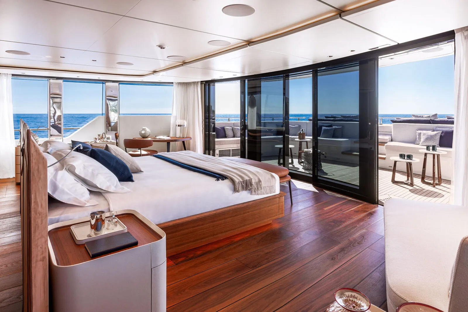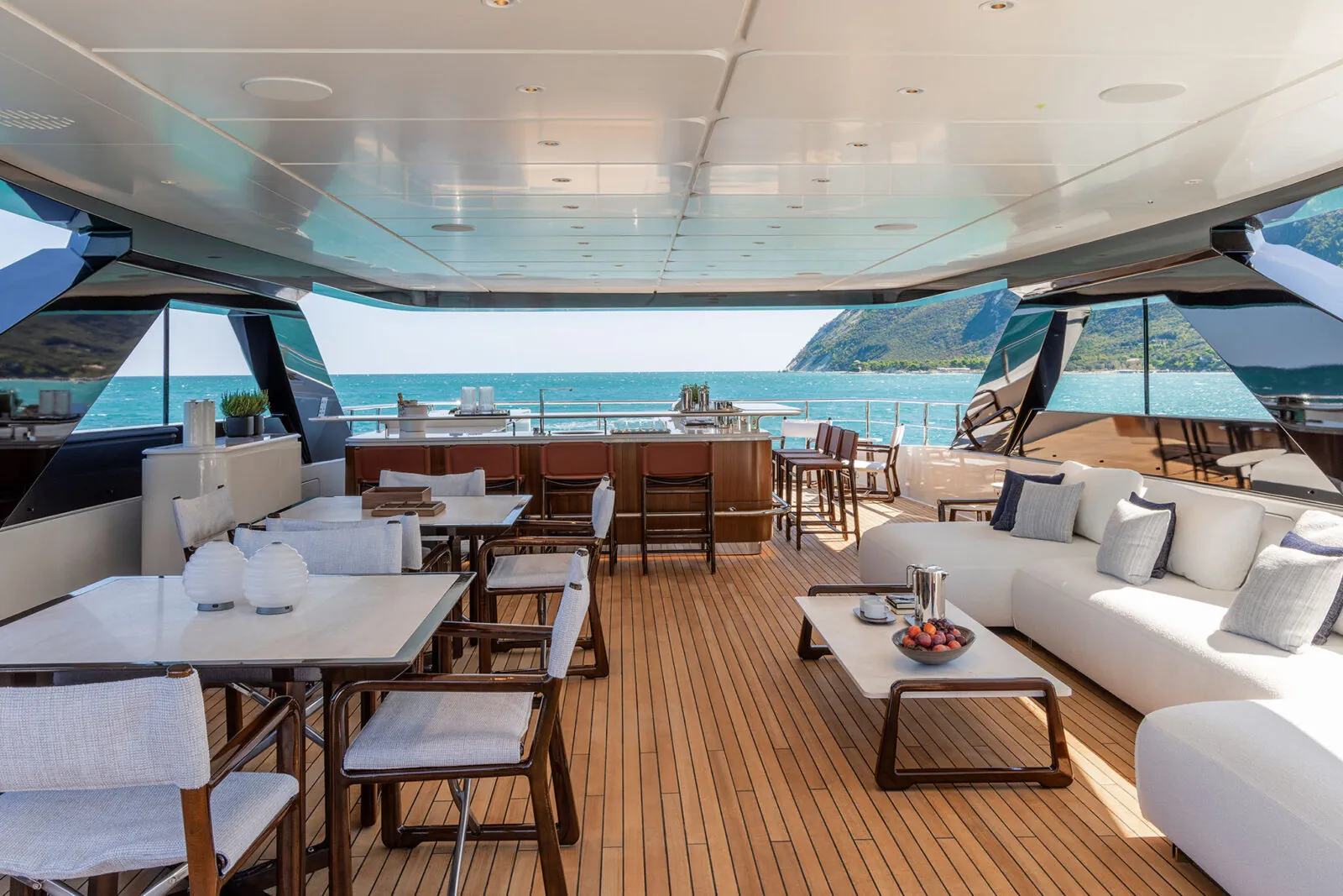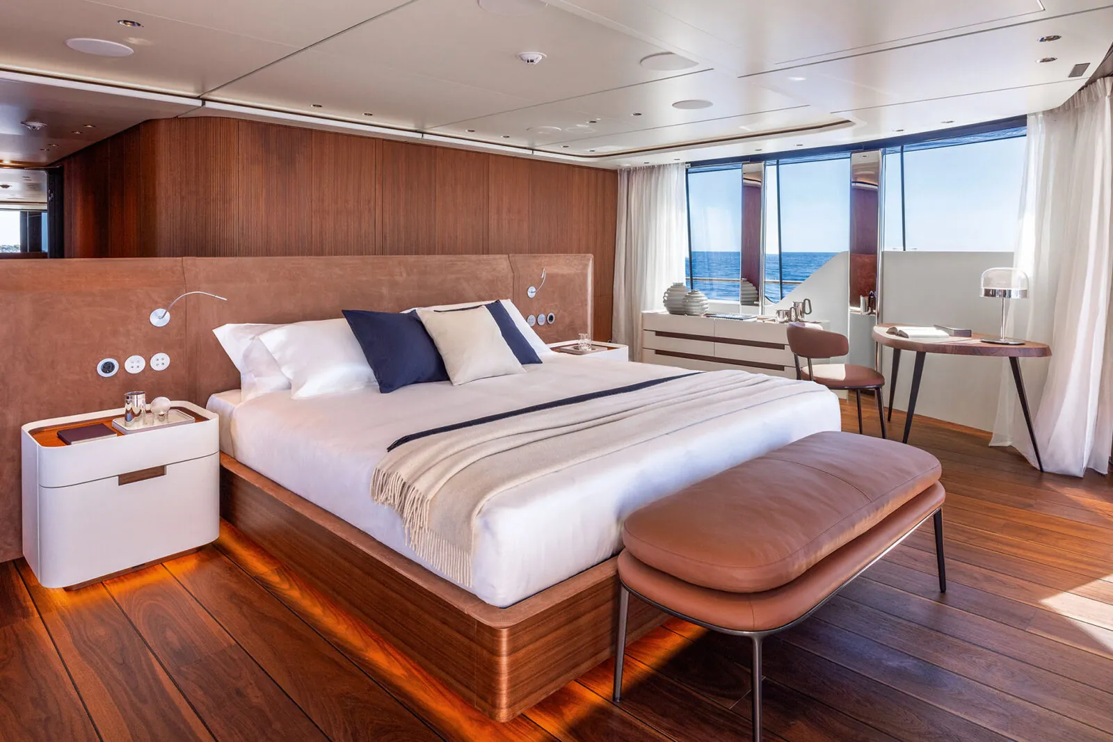 The liveable spaces on board cover over 800 square metres, of which 324 square metres of exteriors.The yacht can accommodate up to 12 guests in a master suite on the upper deck and in four cabins on the lower deck. There are also five cabins to ensure maximum comfort for the nine crew members, including the captain.