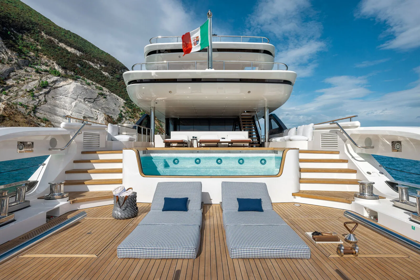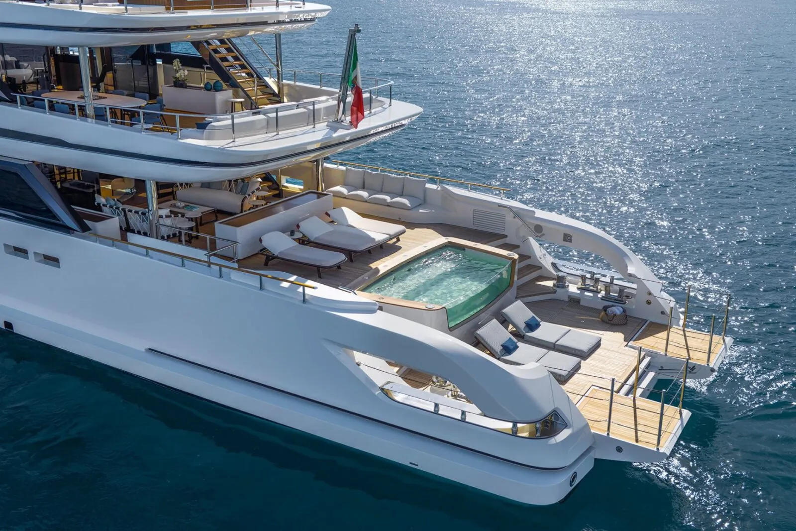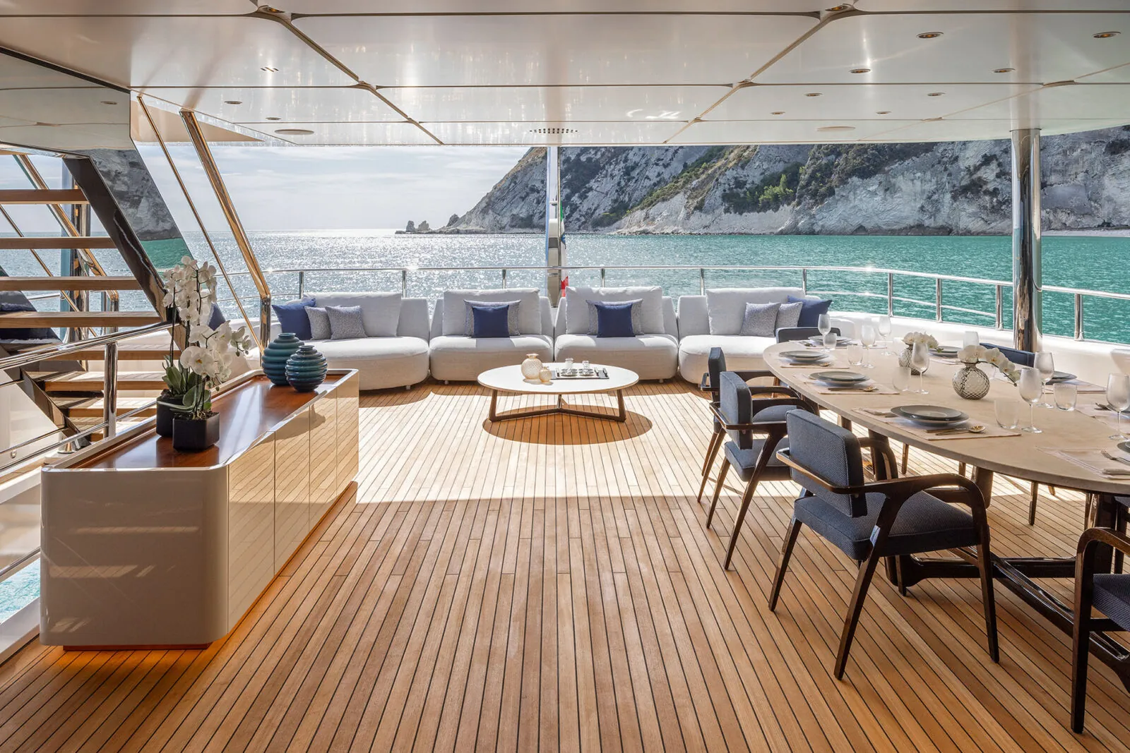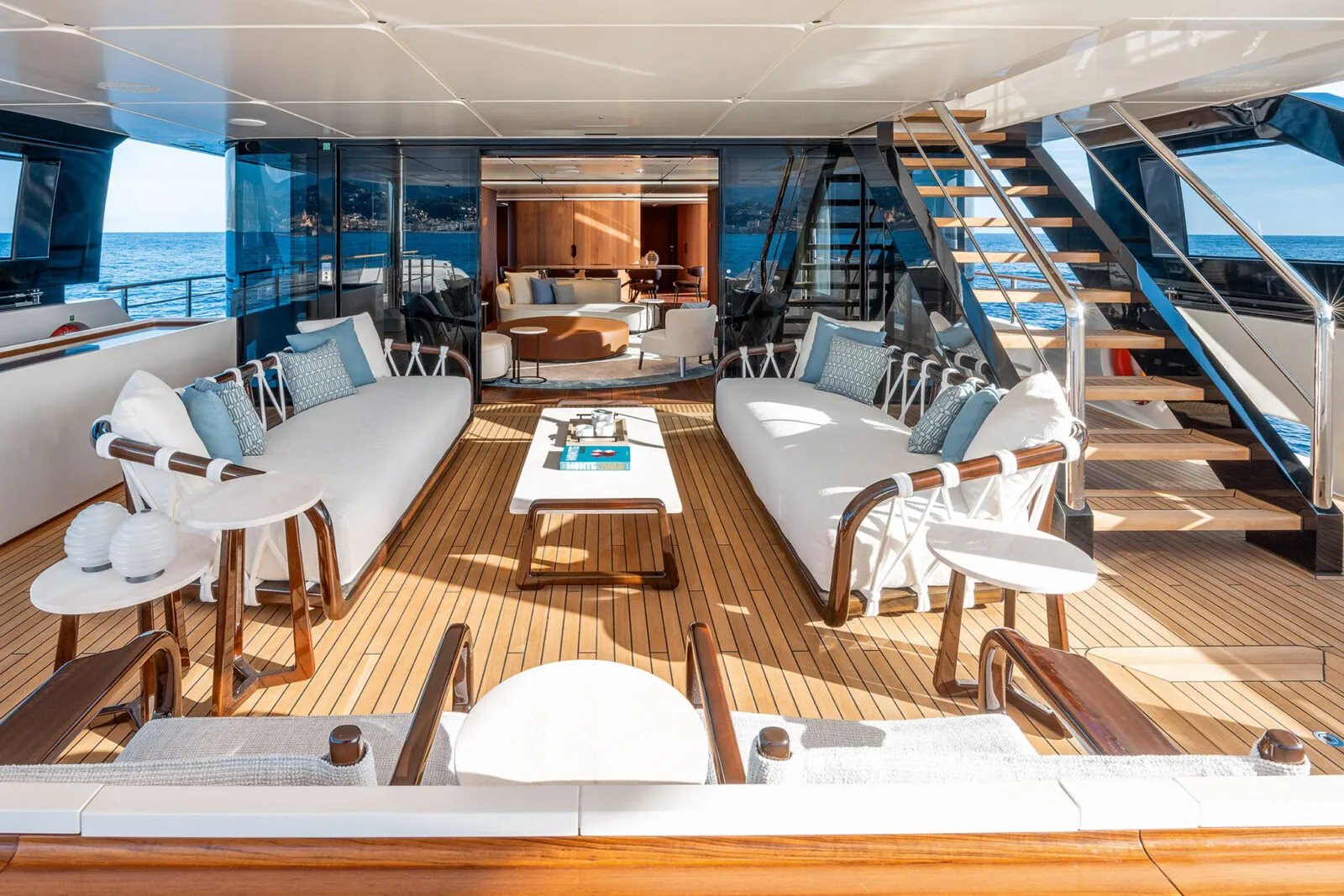 The liveable spaces on board cover over 800 square metres, of which 324 square metres of exteriors.The yacht can accommodate up to 12 guests in a master suite on the upper deck and in four cabins on the lower deck. There are also five cabins to ensure maximum comfort for the nine crew members, including the captain.