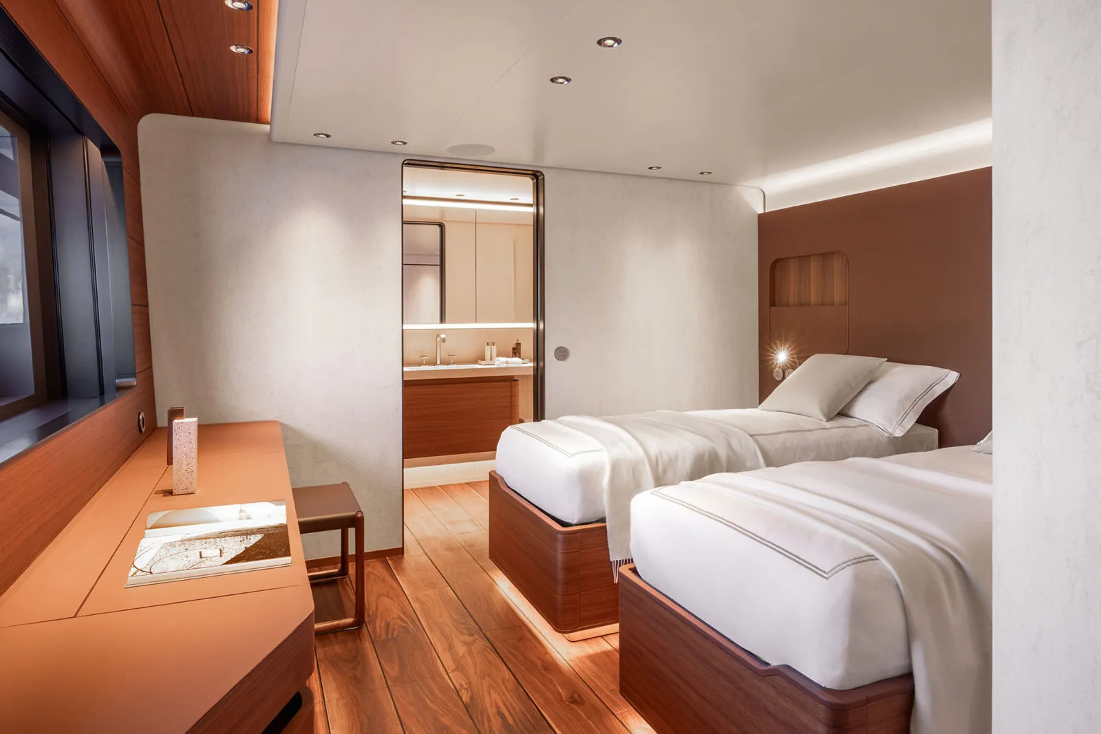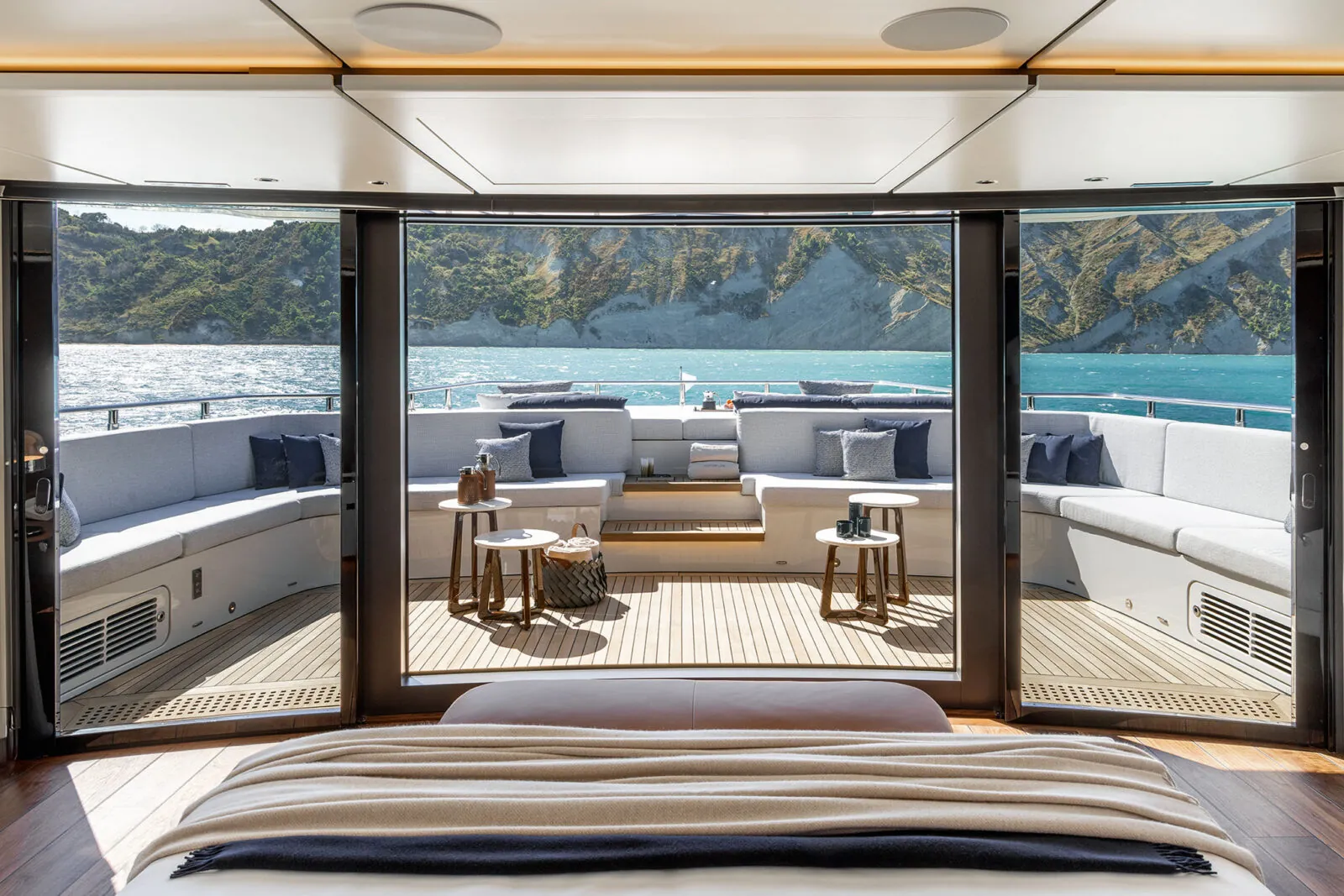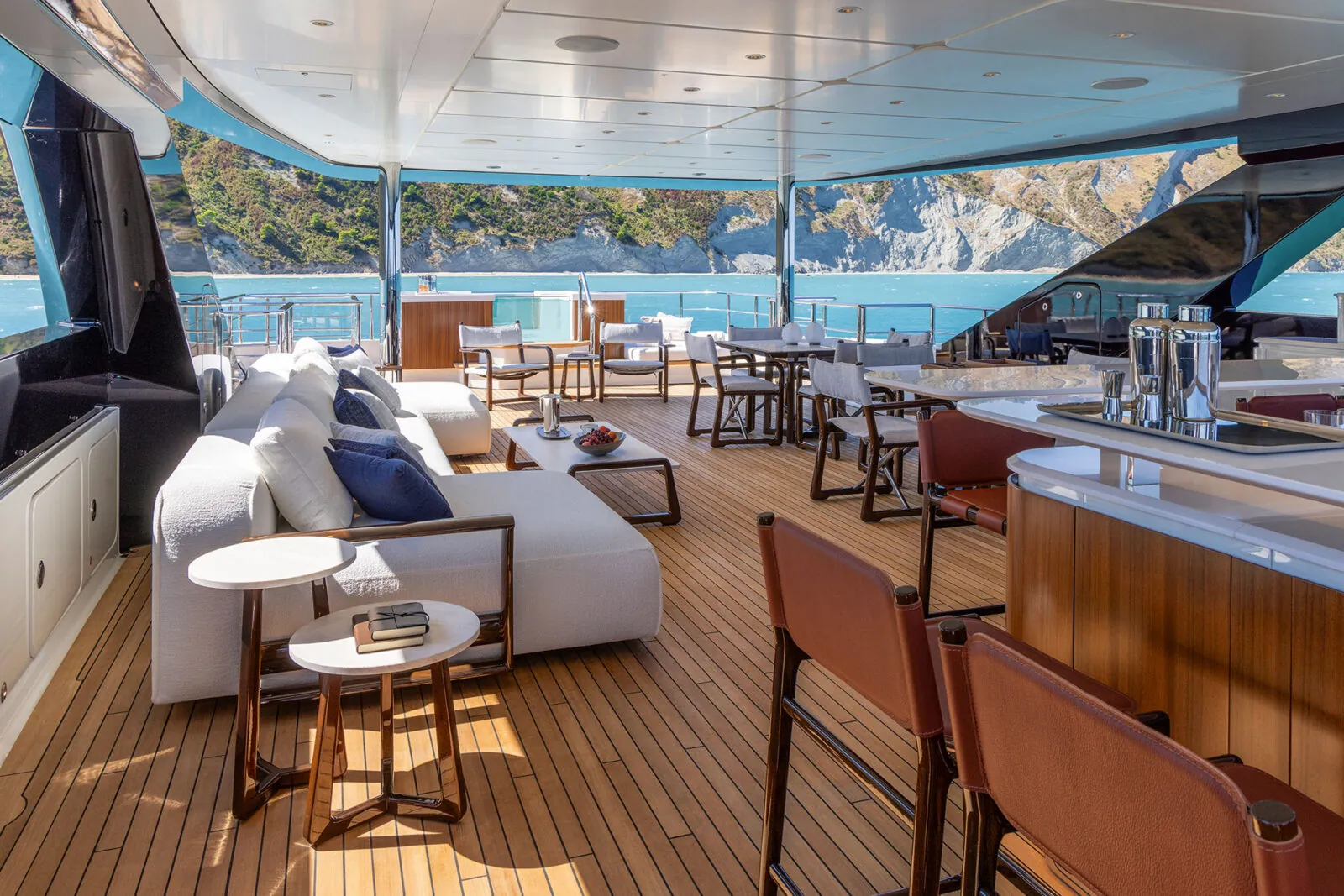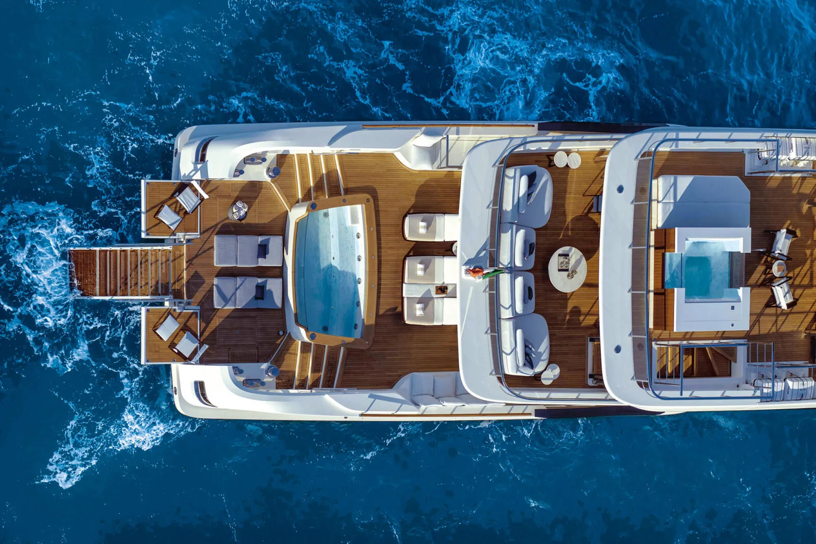 The liveable spaces on board cover over 800 square metres, of which 324 square metres of exteriors.The yacht can accommodate up to 12 guests in a master suite on the upper deck and in four cabins on the lower deck. There are also five cabins to ensure maximum comfort for the nine crew members, including the captain.