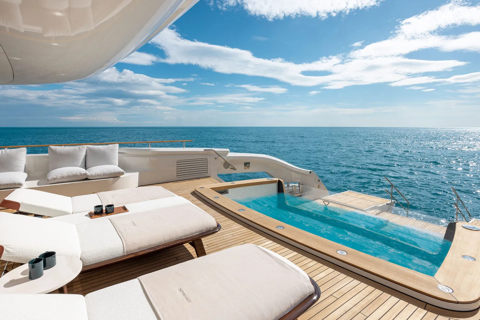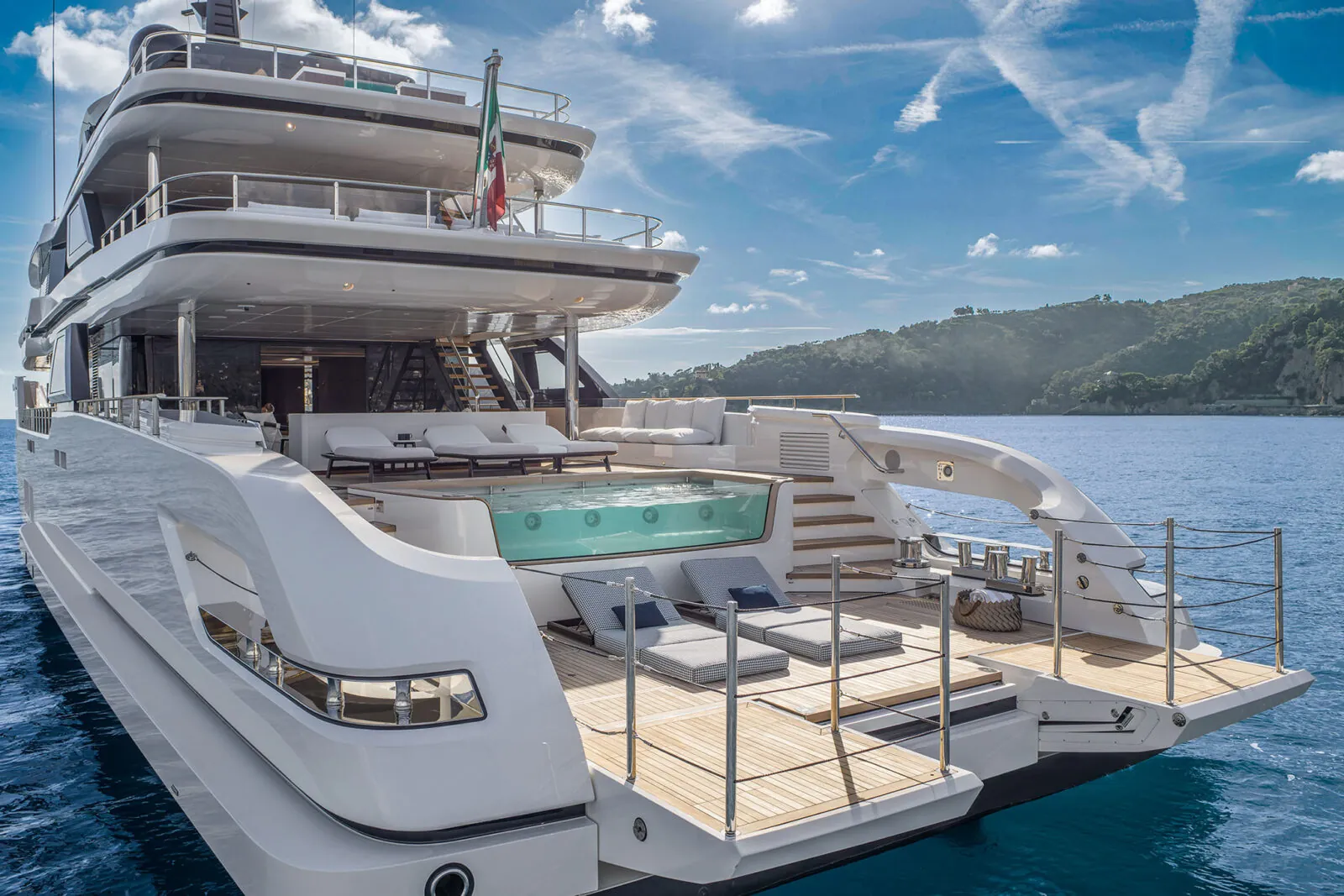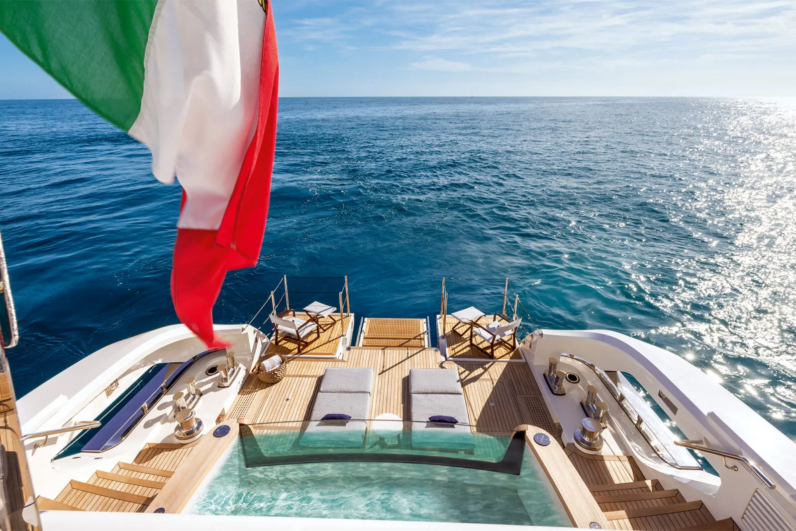Custom Line 50 is a 50-metre made to measure superyacht built entirely from aluminium and the brand’s displacement flagship in the aluminium alloy yachts segment under 500 GT. 49.90 m long and 9.60 m in the beam, with a draft of 2.2 m, she extends across four decks and introduces some innovative construction and design solutions, such as the owner’s suite with private terrace in the bow on the upper deck, reserved exclusively for the owner, and the beach club with infinity pool integrated into the main deck, a unique 120-square-metre convivial space in close contact with the water.