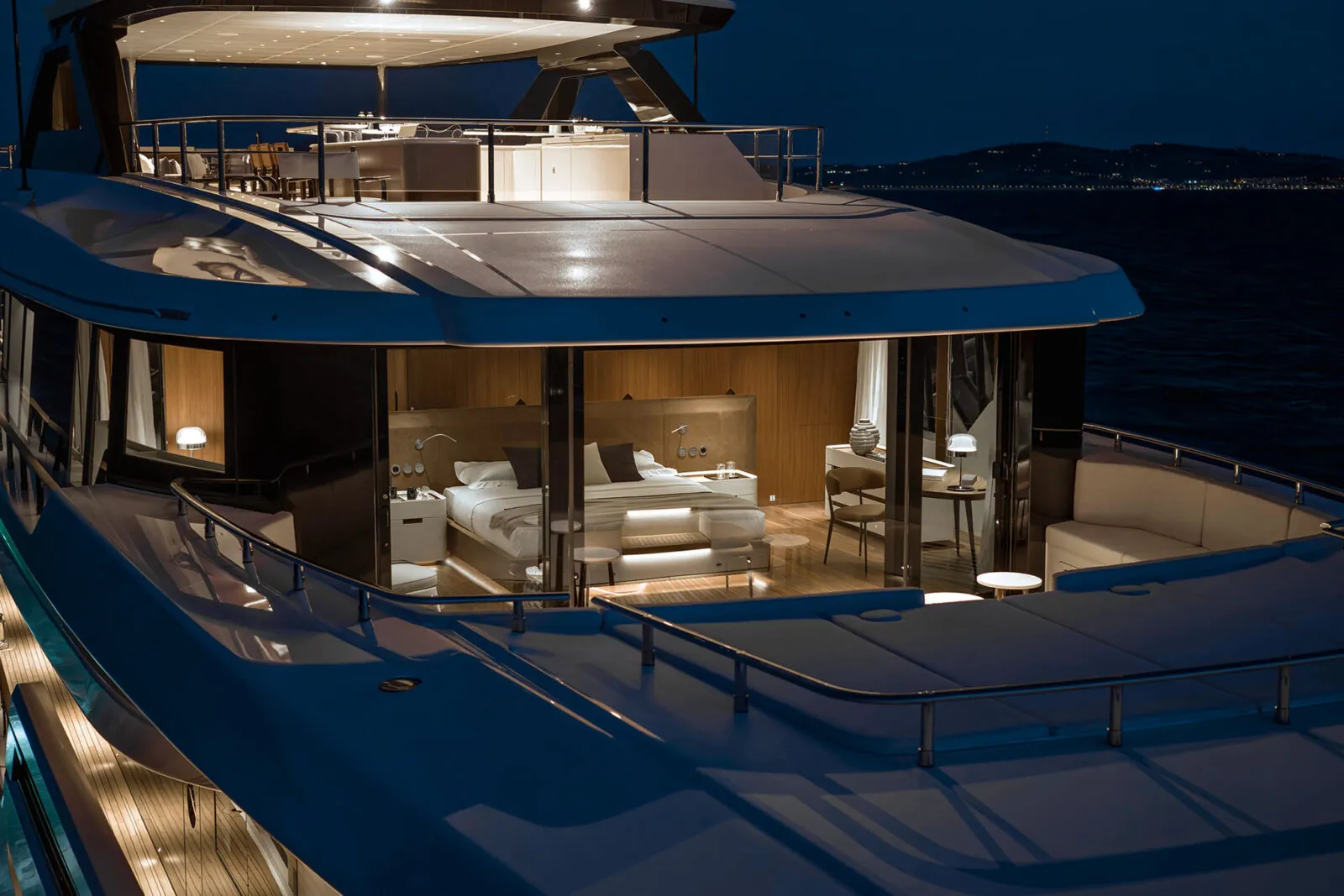 The generous outdoor spaces give each of the yacht’s decks its own personality, forming a series of sea-view terraces that can be enjoyed at all times of day thanks to the shade provided by the extensive exterior deck space. Seamless fluidity between the outdoor spaces on Custom Line 50 is expressed to perfection in the innovative two-level beach club.