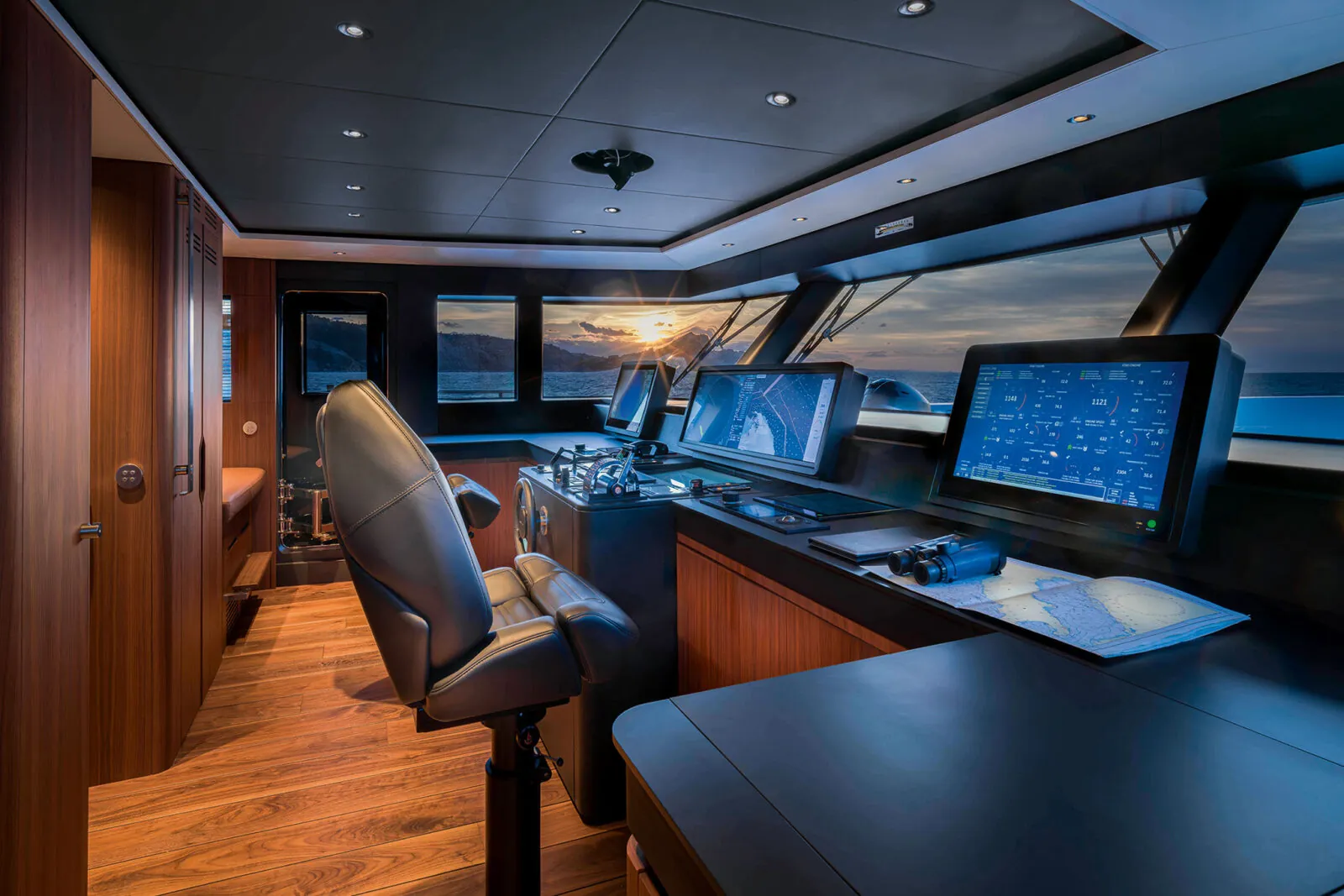 The wheelhouse on the mezzanine between the main and upper decks is designed to high standards of ergonomics, functionality and technological innovation, with a helm station that integrates management of the propulsion, navigation and on-board monitoring systems into an advanced, intuitive interface.