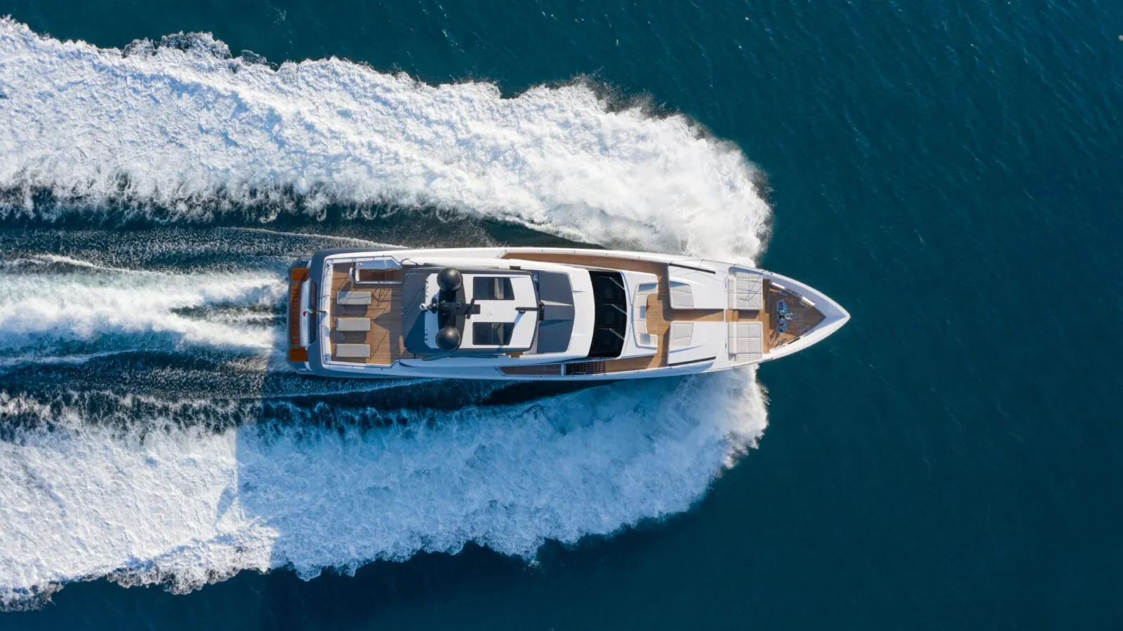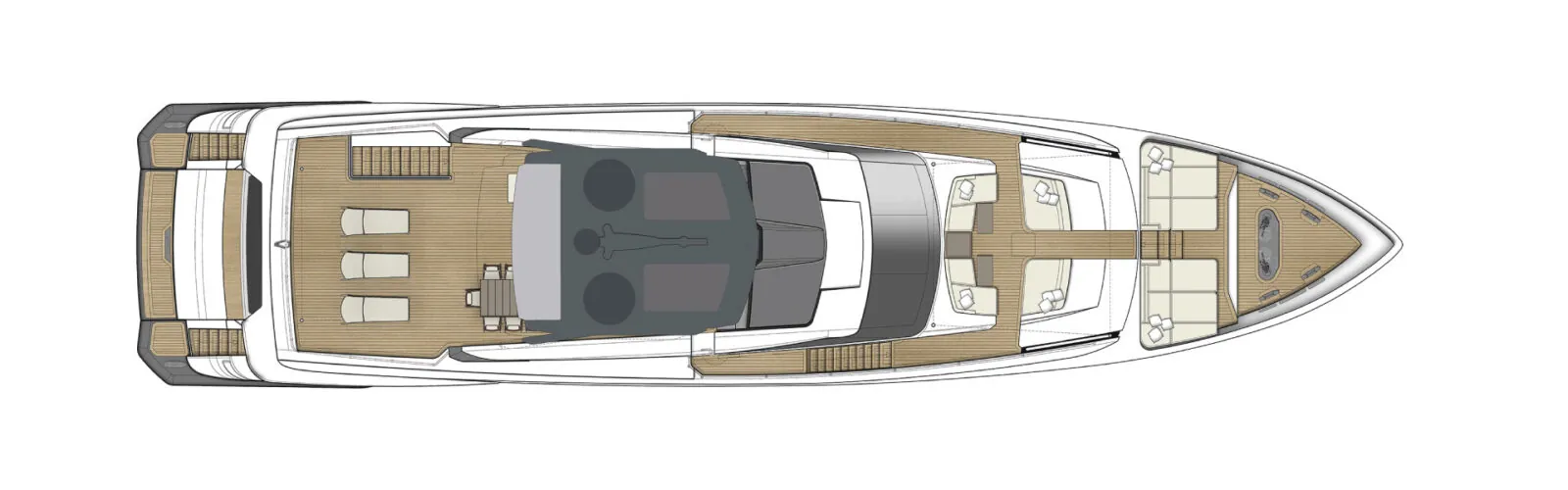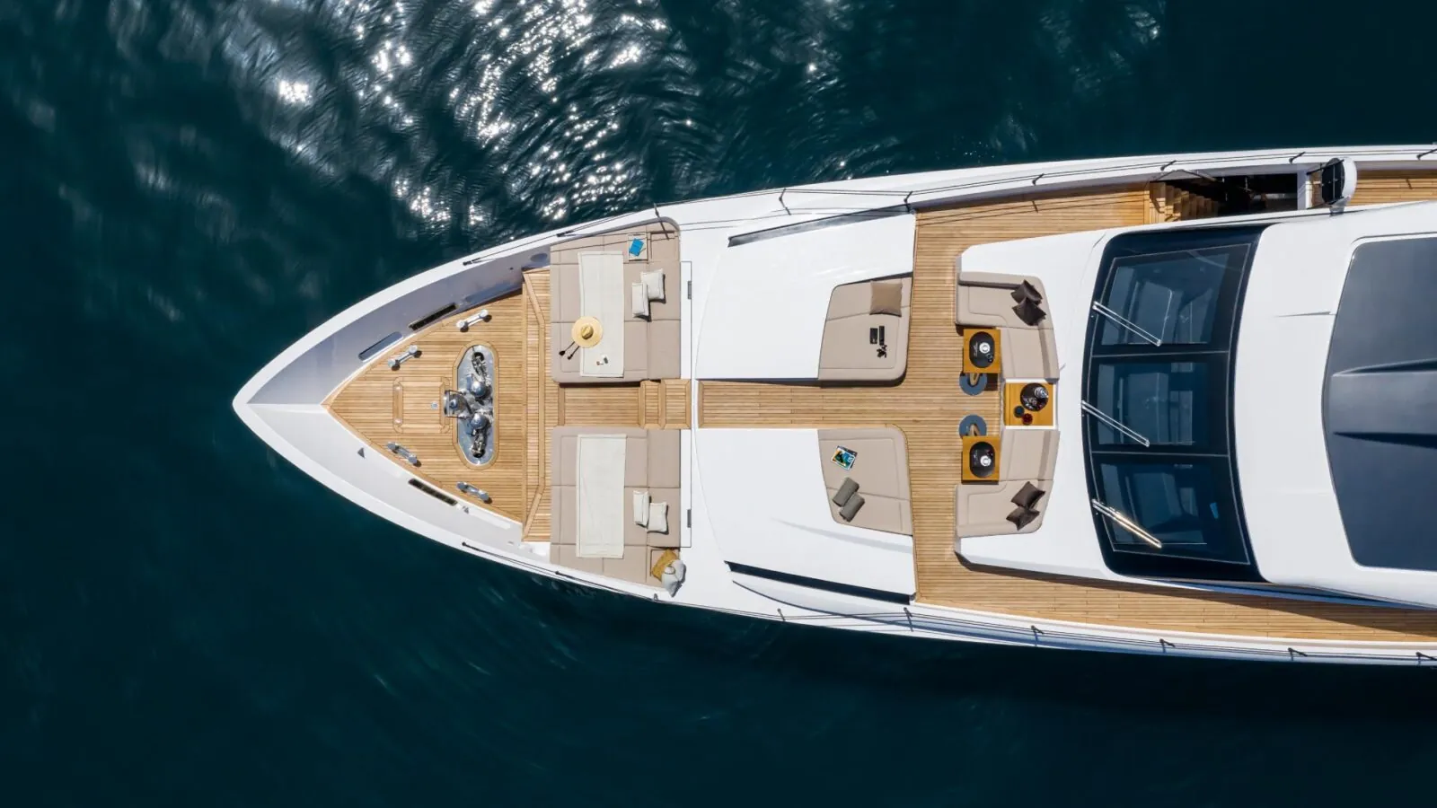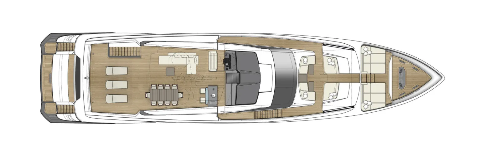 The surfaces are interconnected like a sculpture, crafting a fluid sequence of volumes running the length of the yacht. The stern vaunts a refined, clean-cut aesthetic, while the designers have dreamed up some larger, complementary spaces to relax and rest in further forward. The bow is linked to the flybridge, protected by two side windows and features a standard hard top with paired skylights – an exclusive area for admiring the wonders of the sea stretching out in all directions.