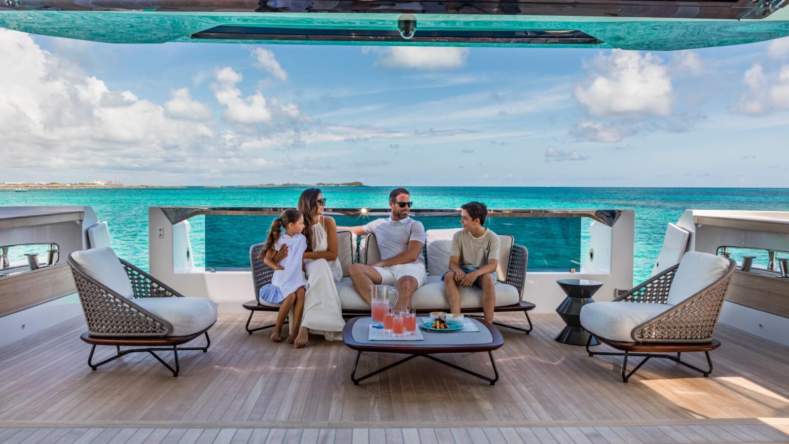 The vibrancy of the design finds its fullest flowering in the generous built-in glazing and the floor-to-sky windows on deck that tempt the gaze toward the tranquil majesty of the azure sea.