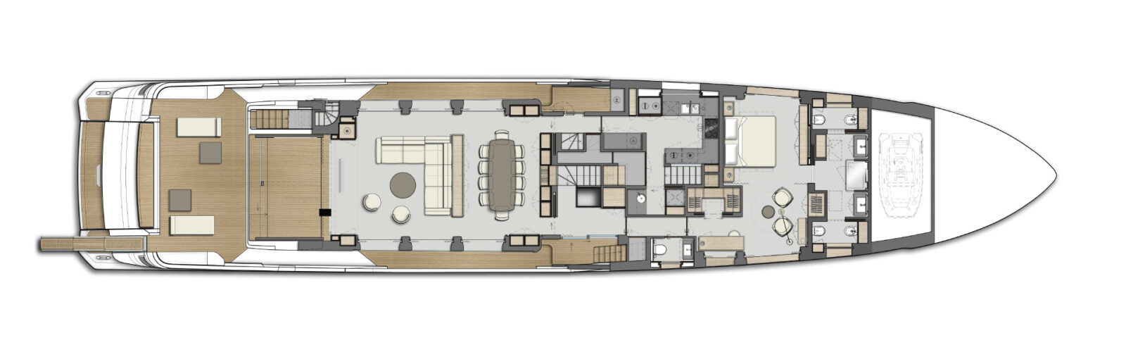 Dreams take shape in a personalized space where every detail is an aesthetic statement of unfailing elegance and taste. Here, simplicity is the ultimate in sophistication. In each of the 19 spaces laid out over 3 levels, the artisanal excellence is palpable and the attention to detail sartorial. Like a perfectly fitting suit, the interiors of Custom Line Saetta 120′ are the quintessential expression of your world.