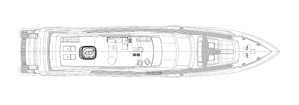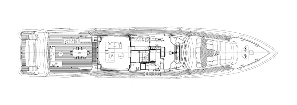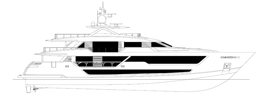 The yacht has a distinctly sporty character, set off by unparalleled elegance and refinement: taught lines sweep from bow to stern in an exciting alternation of materials and colors represented by dark plate glass and light-colored structural surfaces.