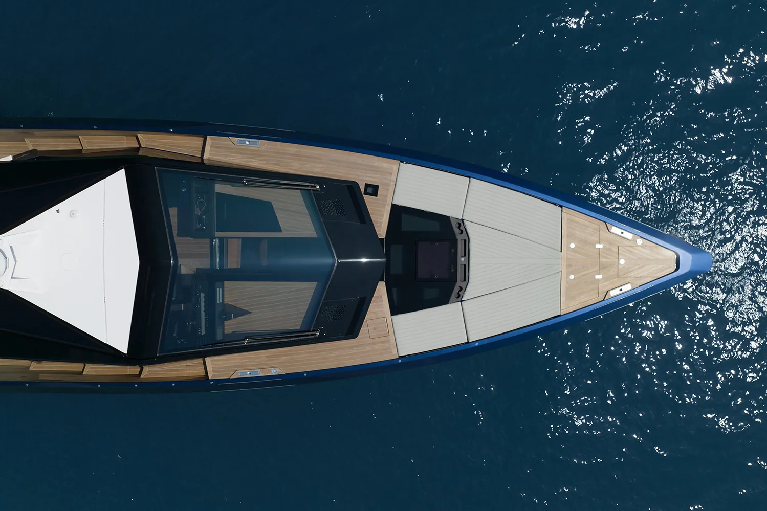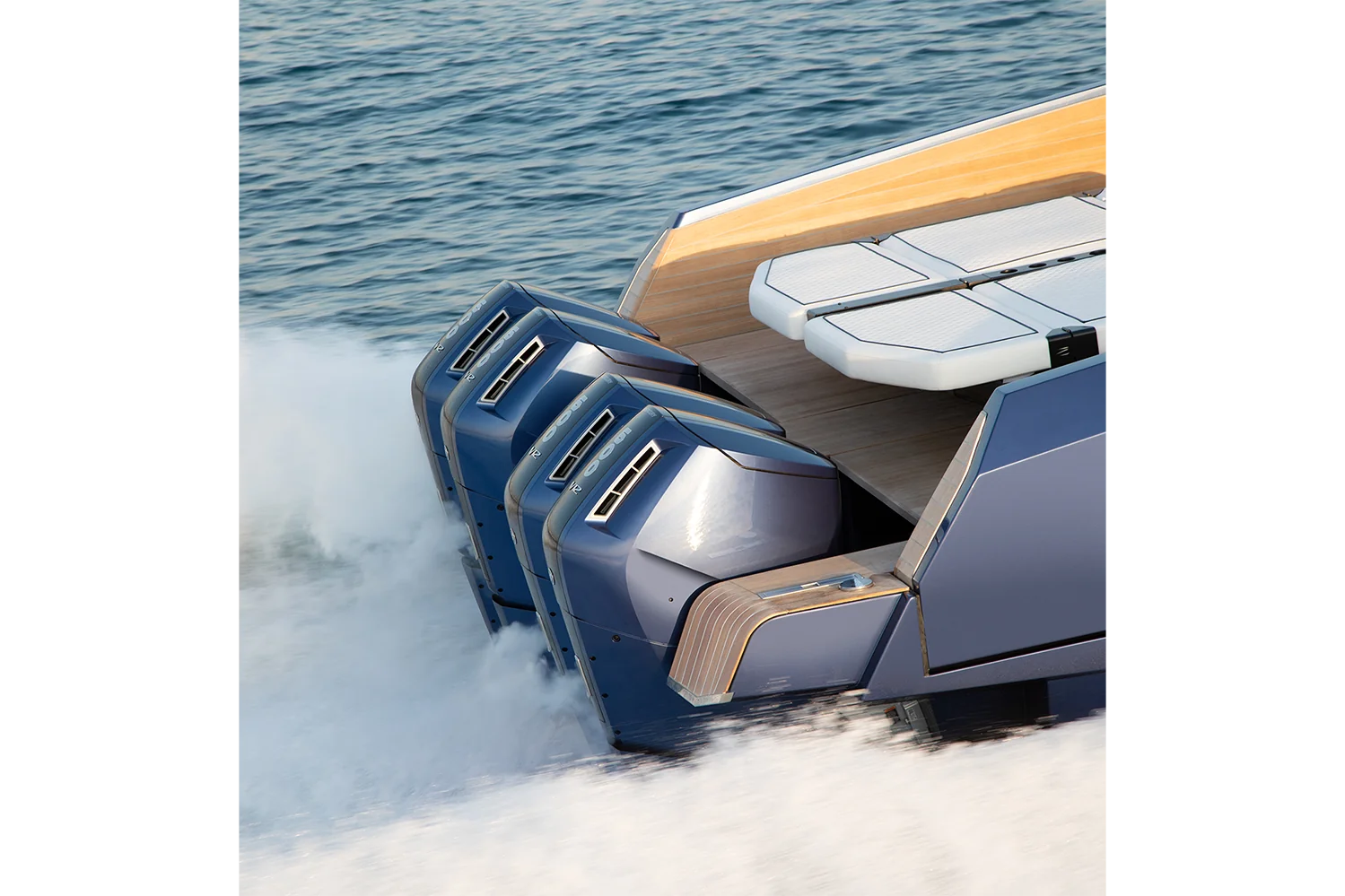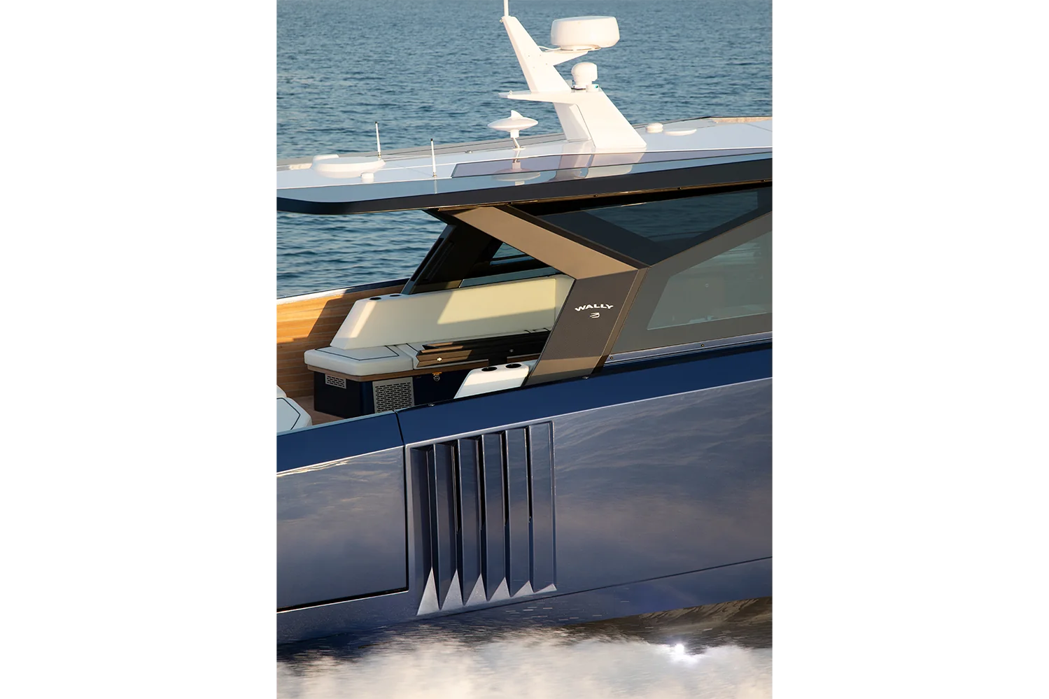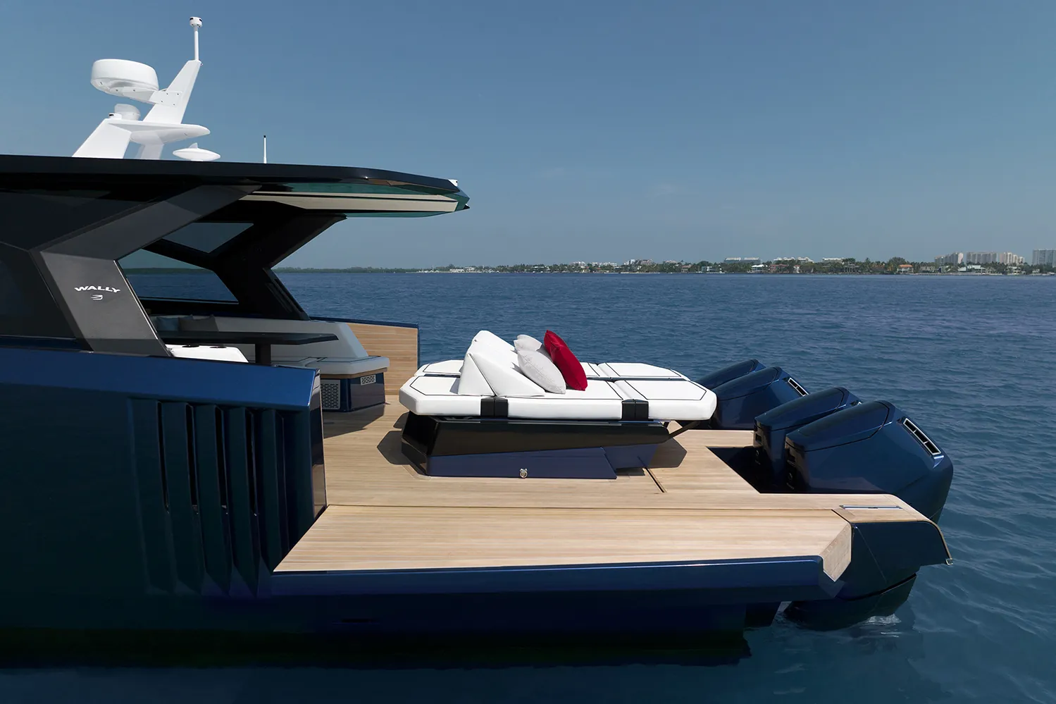 Performance is, therefore, a given, but Wally has also exploited other capabilities offered by the new Mercurys. They have a reduced draft compared to other models, making the boat suitable for shallow water operations, while the rotating gearcases and joystick maneuvering system ensure trouble-free precision docking in tight spaces.
