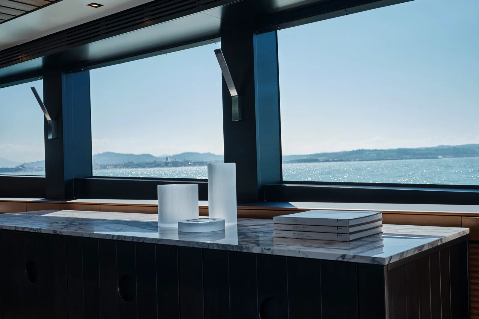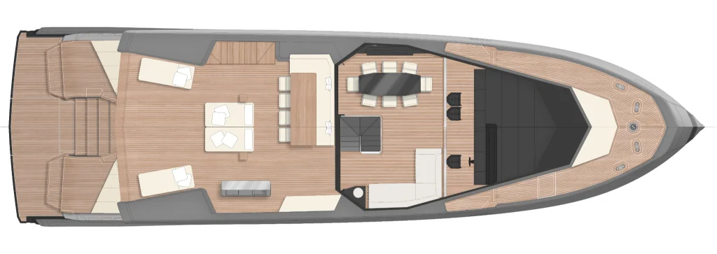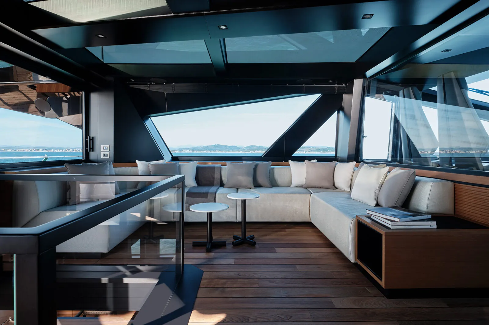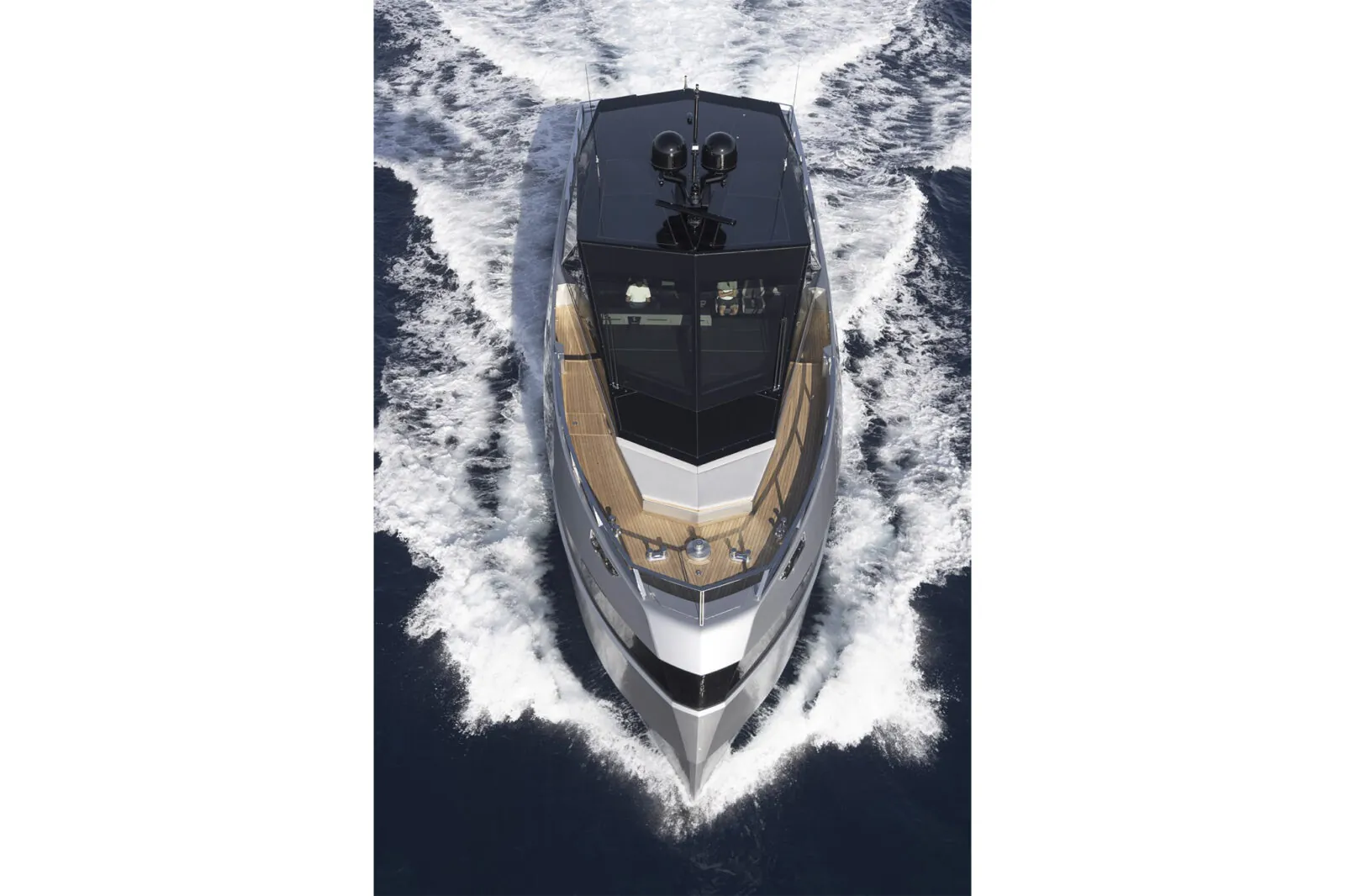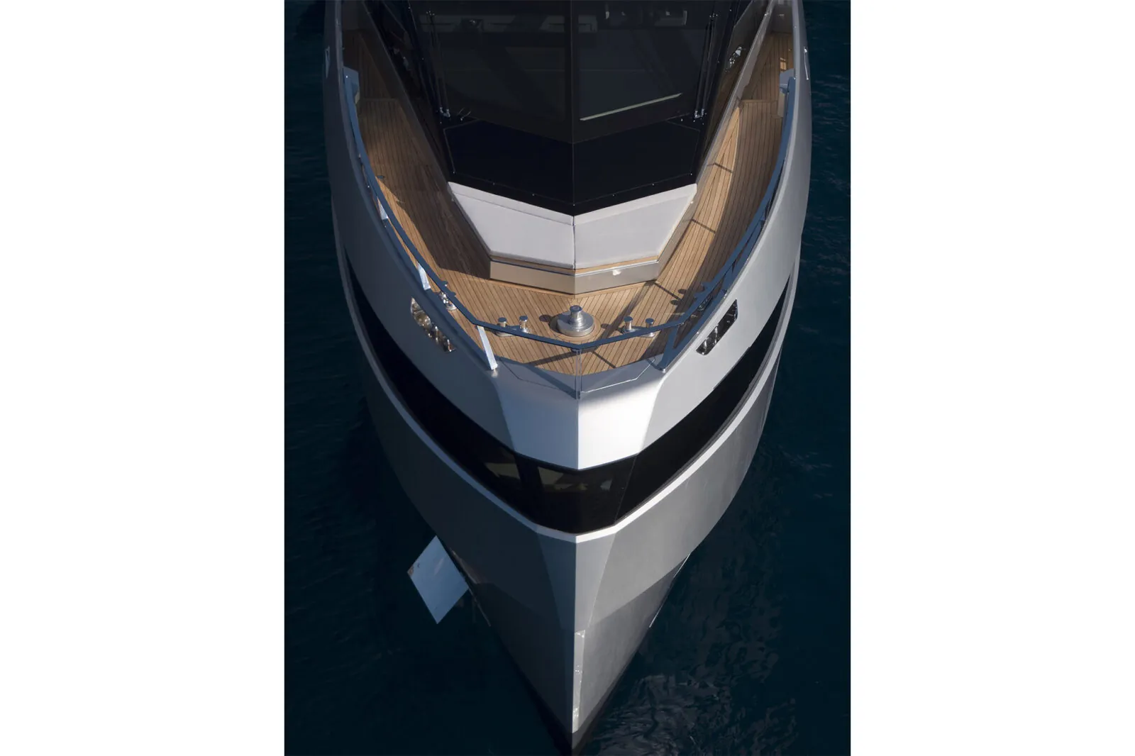 An enormous upper deck is presided over by Wally’s signature glass and carbon dome. And on the lower deck, there are a luxurious VIP suite and two dazzling guest cabins. An eye-catching carbon fiber staircase connects all the decks – laminated in a single piece to give structural support and eliminate bulkheads. This creates open entertaining spaces that blend seamlessly into the exterior.