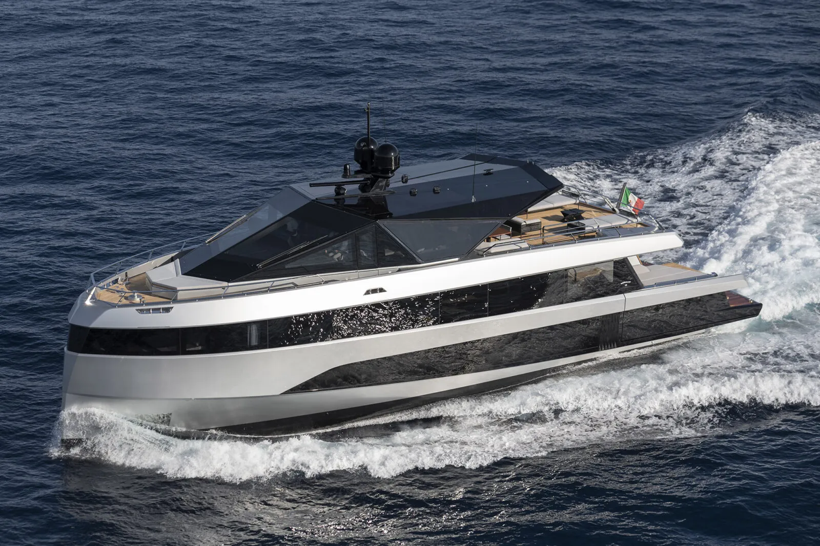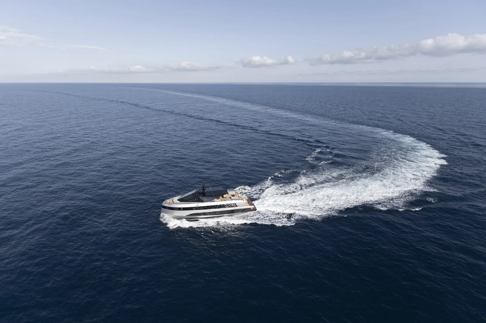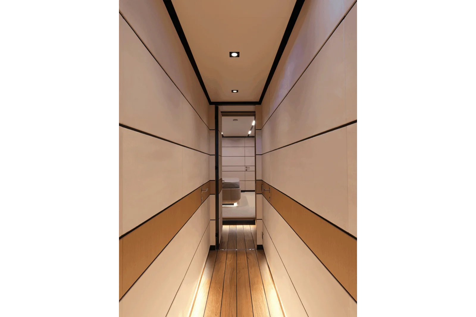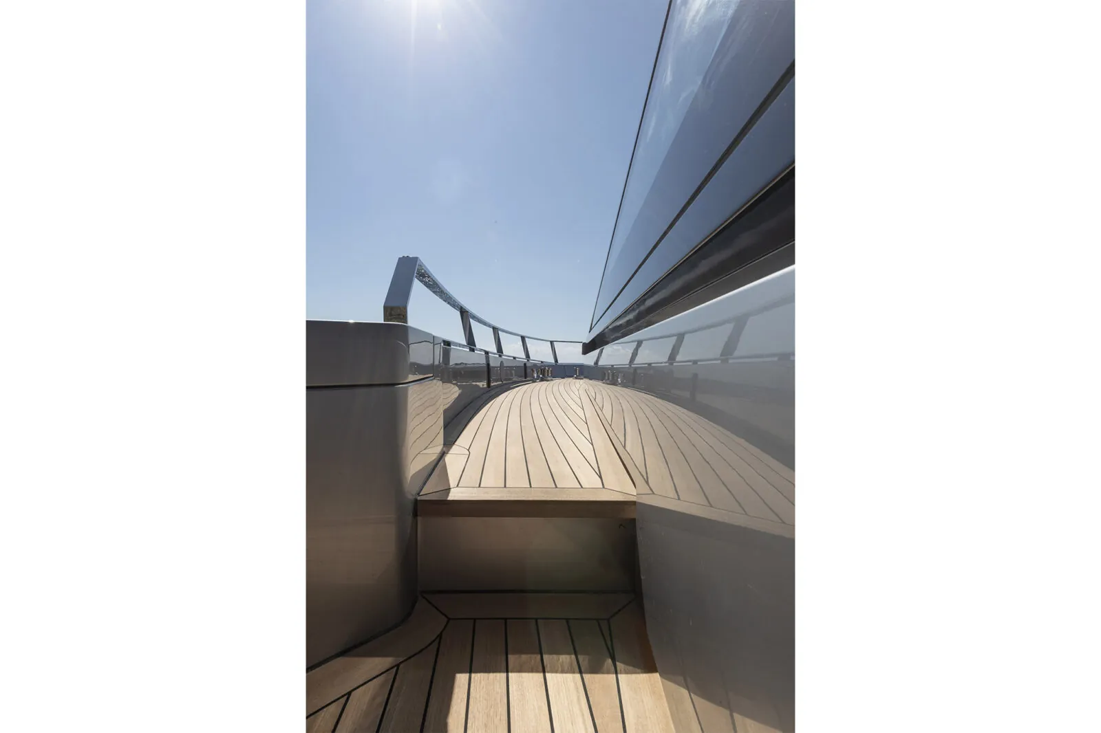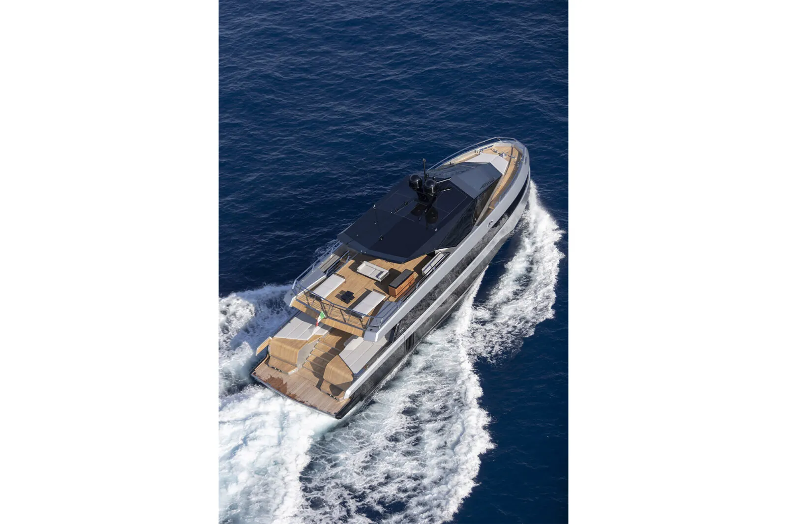 An enormous upper deck is presided over by Wally’s signature glass and carbon dome. And on the lower deck, there are a luxurious VIP suite and two dazzling guest cabins. An eye-catching carbon fiber staircase connects all the decks – laminated in a single piece to give structural support and eliminate bulkheads. This creates open entertaining spaces that blend seamlessly into the exterior.