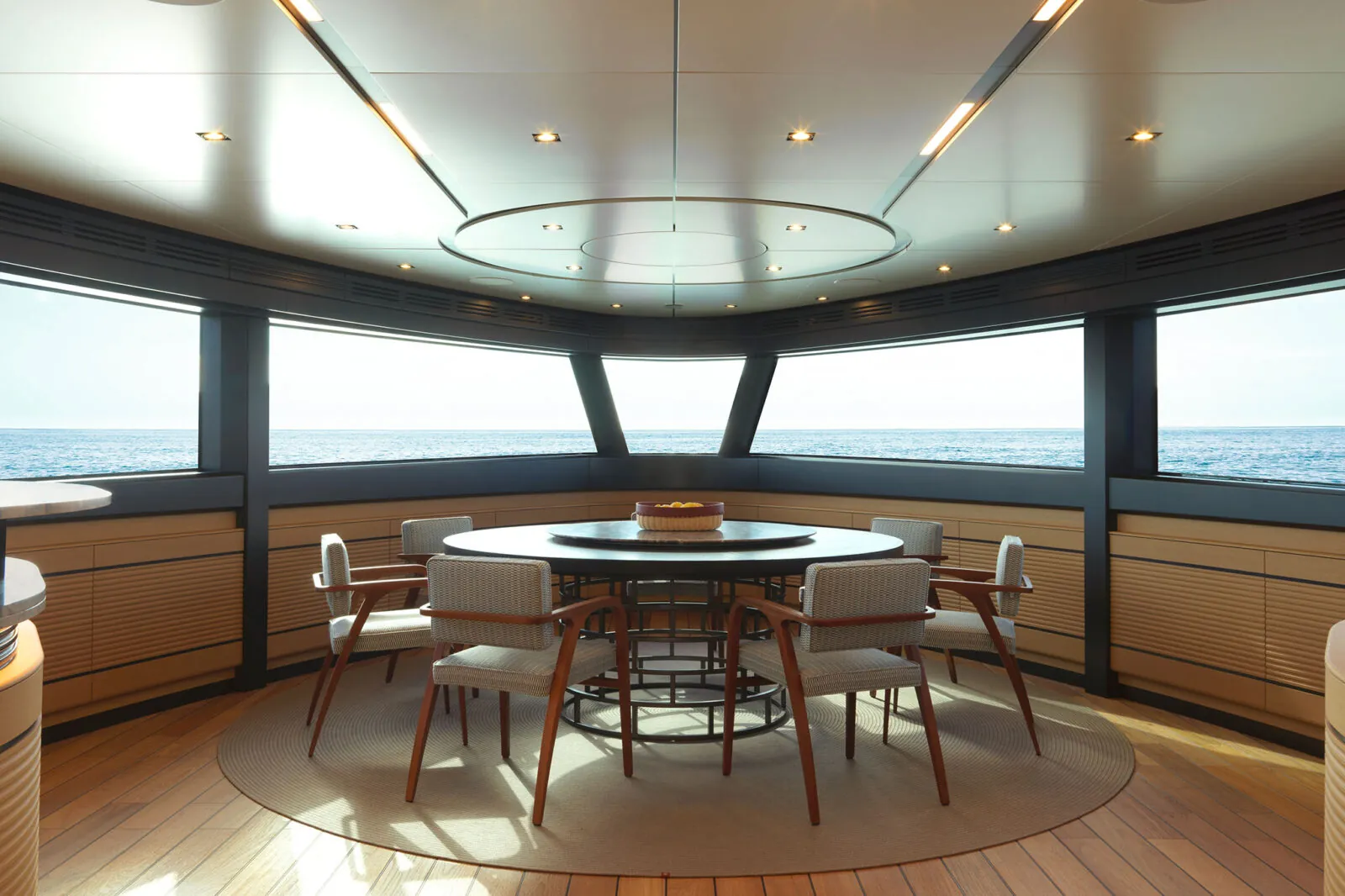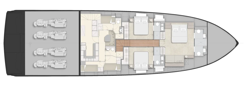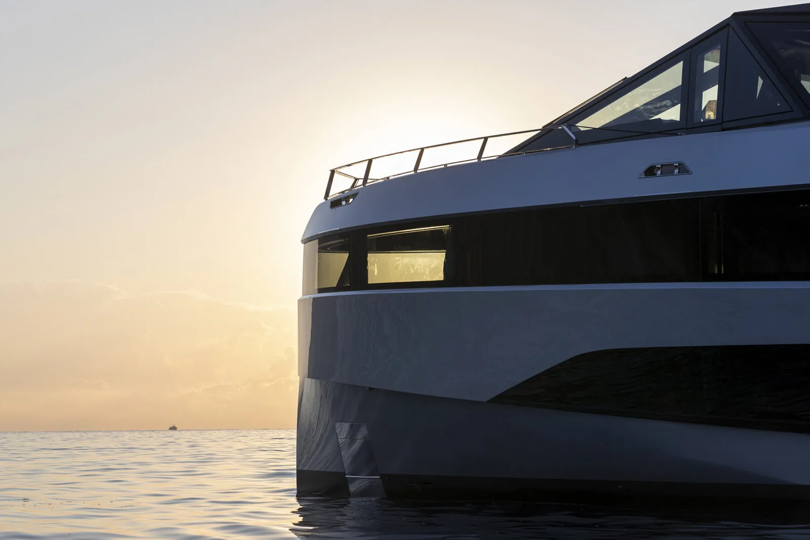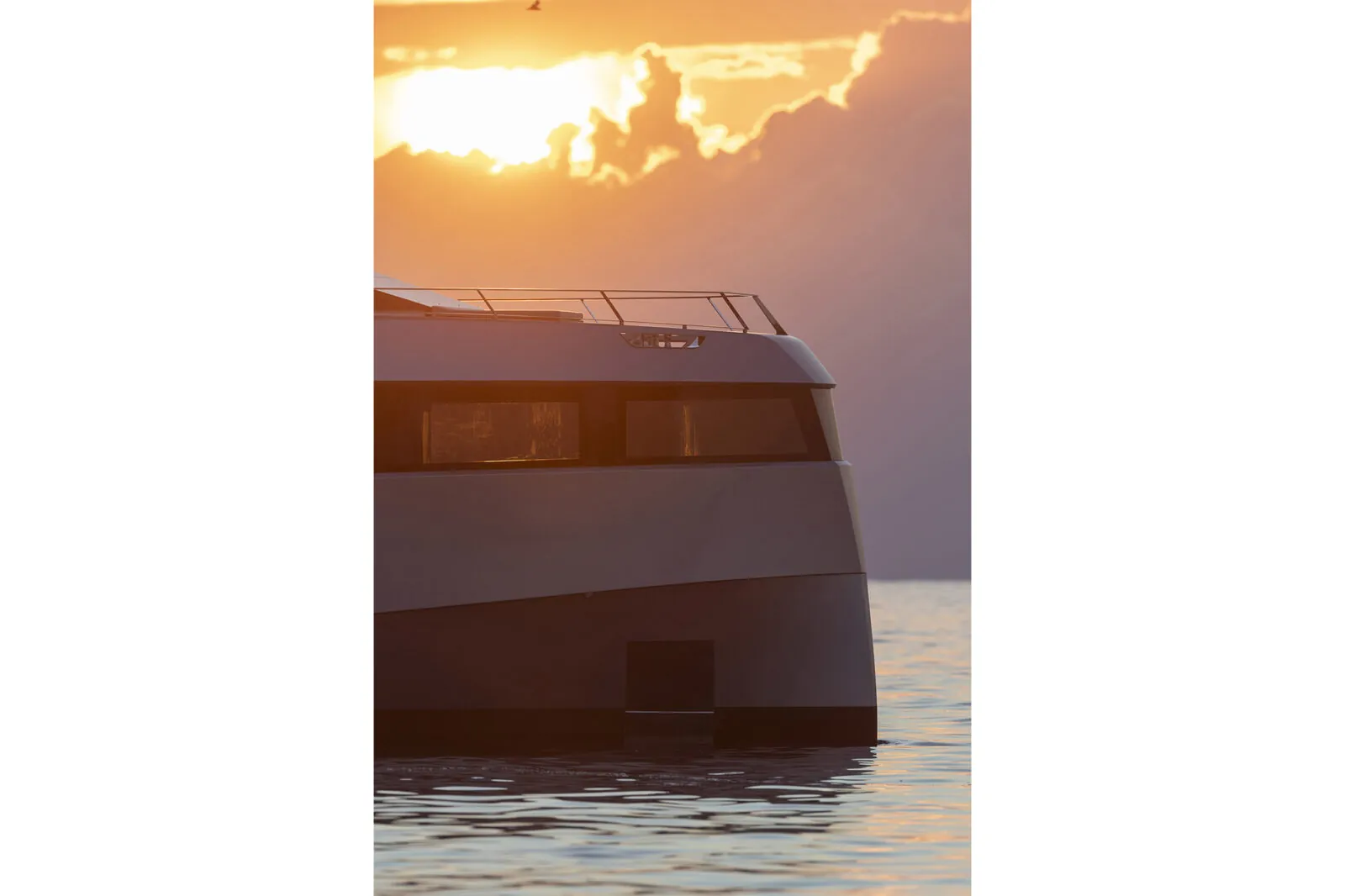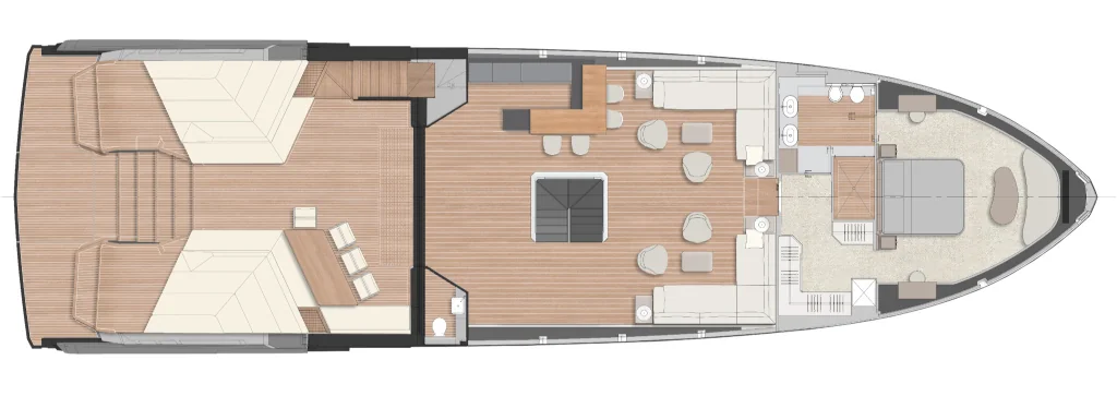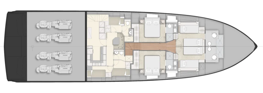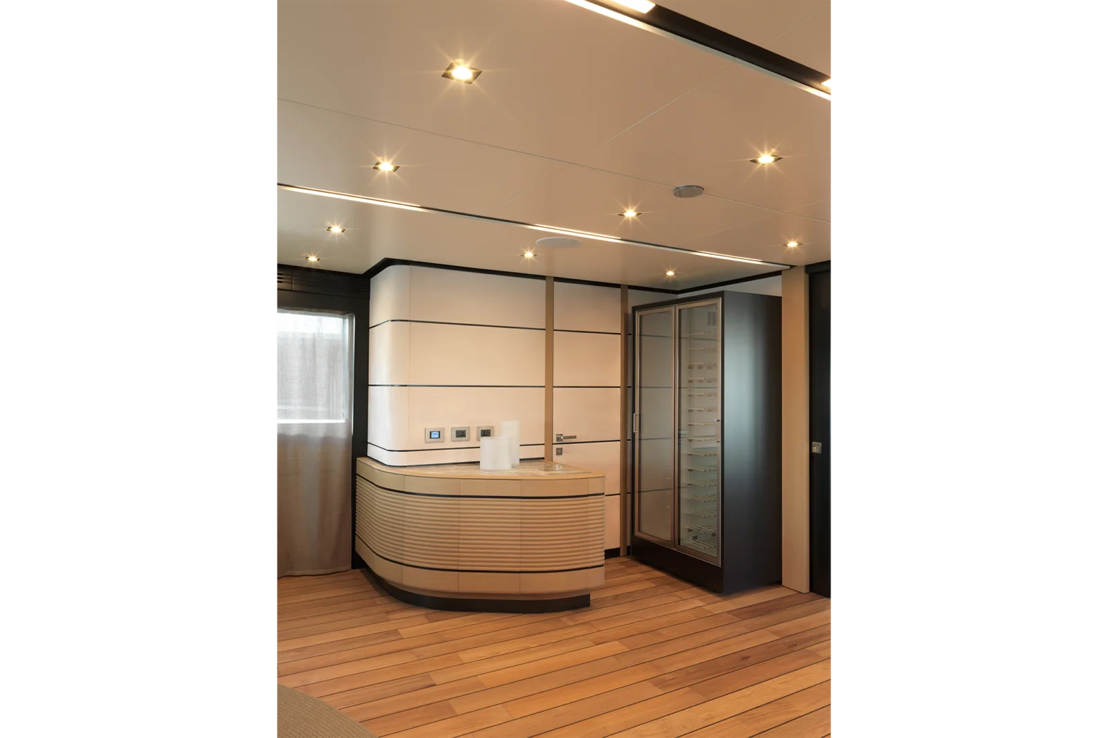 An enormous upper deck is presided over by Wally’s signature glass and carbon dome. And on the lower deck, there are a luxurious VIP suite and two dazzling guest cabins. An eye-catching carbon fiber staircase connects all the decks – laminated in a single piece to give structural support and eliminate bulkheads. This creates open entertaining spaces that blend seamlessly into the exterior.