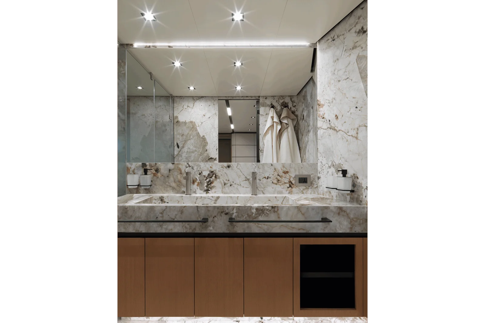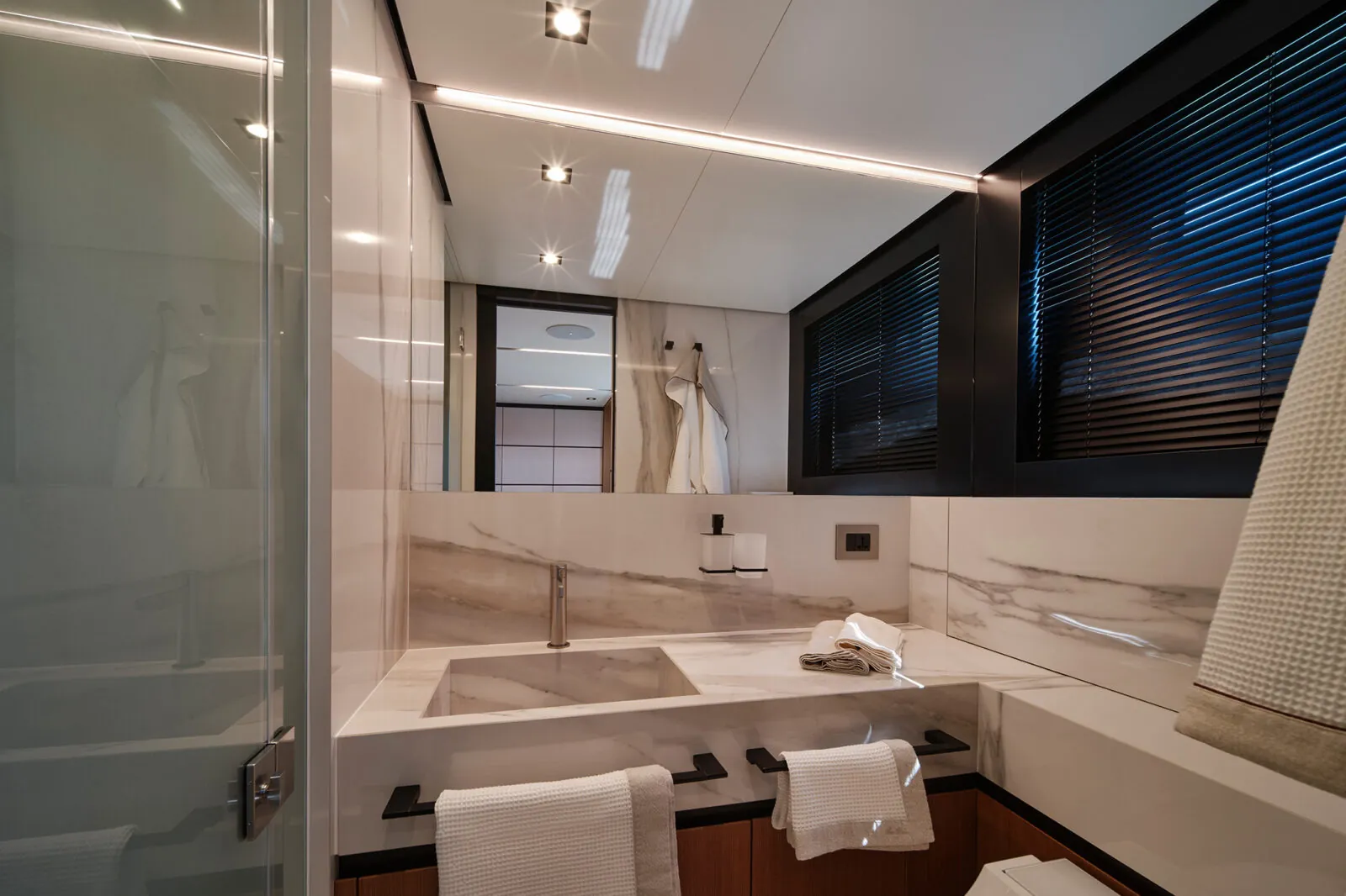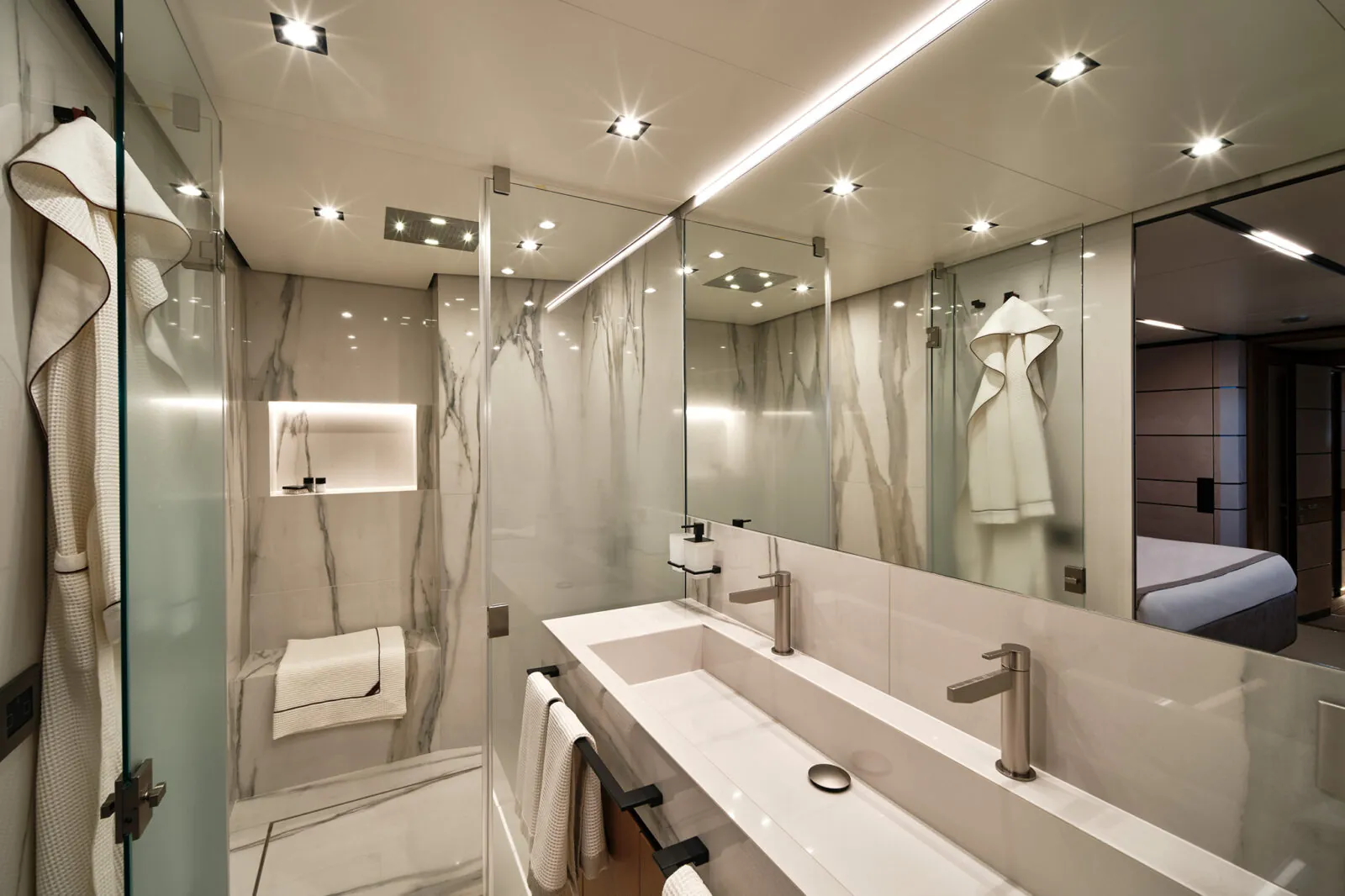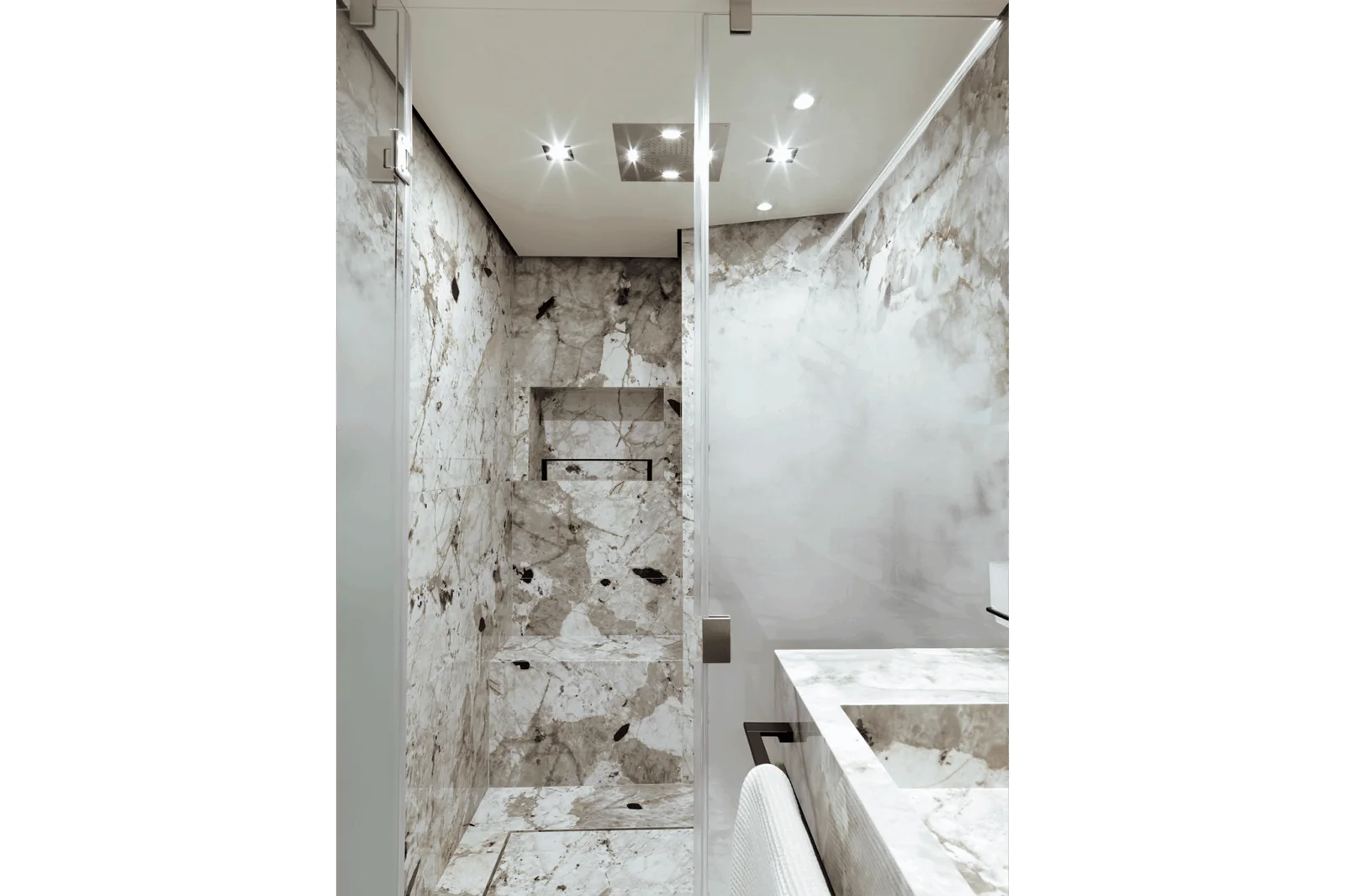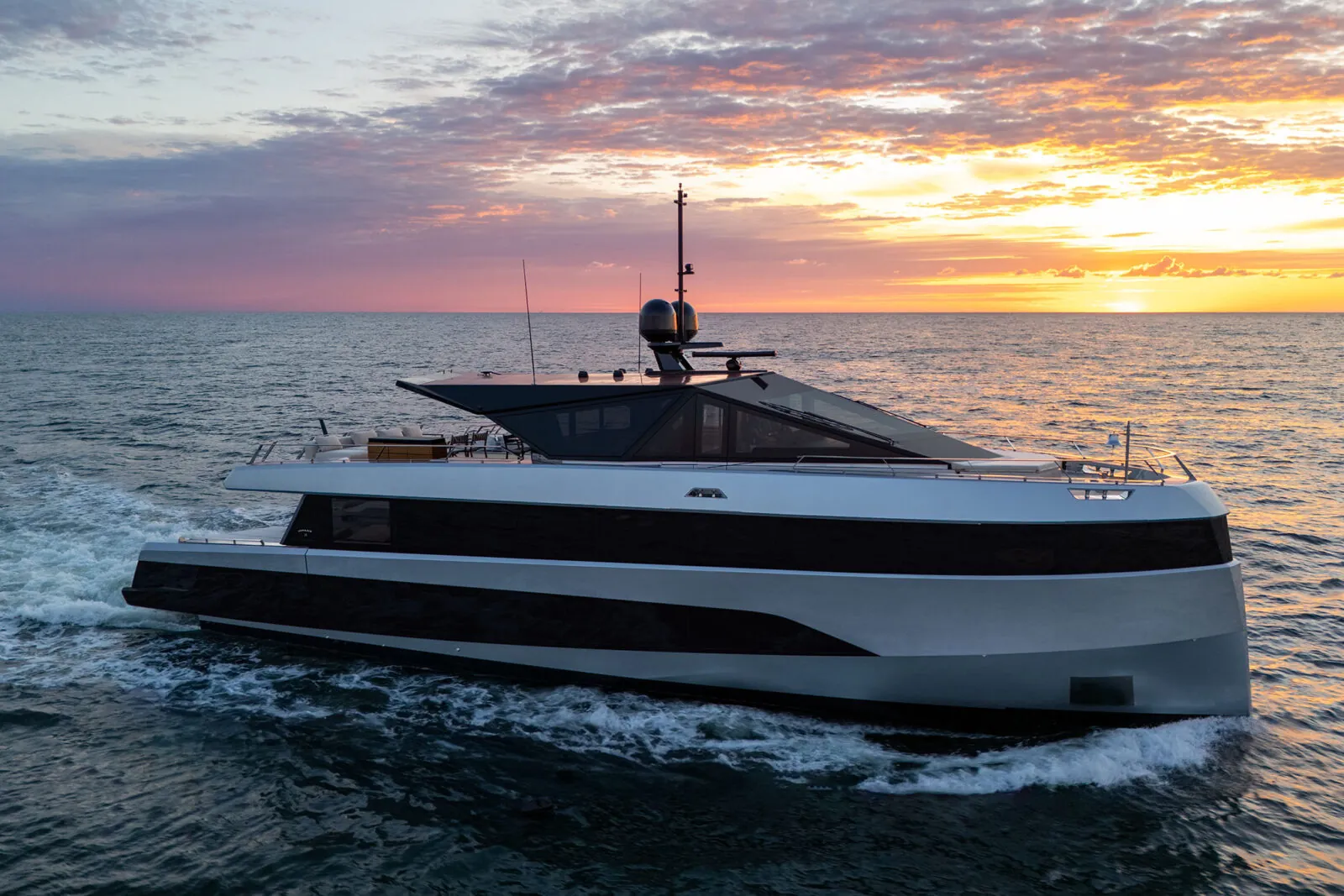 An enormous upper deck is presided over by Wally’s signature glass and carbon dome. And on the lower deck, there are a luxurious VIP suite and two dazzling guest cabins. An eye-catching carbon fiber staircase connects all the decks – laminated in a single piece to give structural support and eliminate bulkheads. This creates open entertaining spaces that blend seamlessly into the exterior.