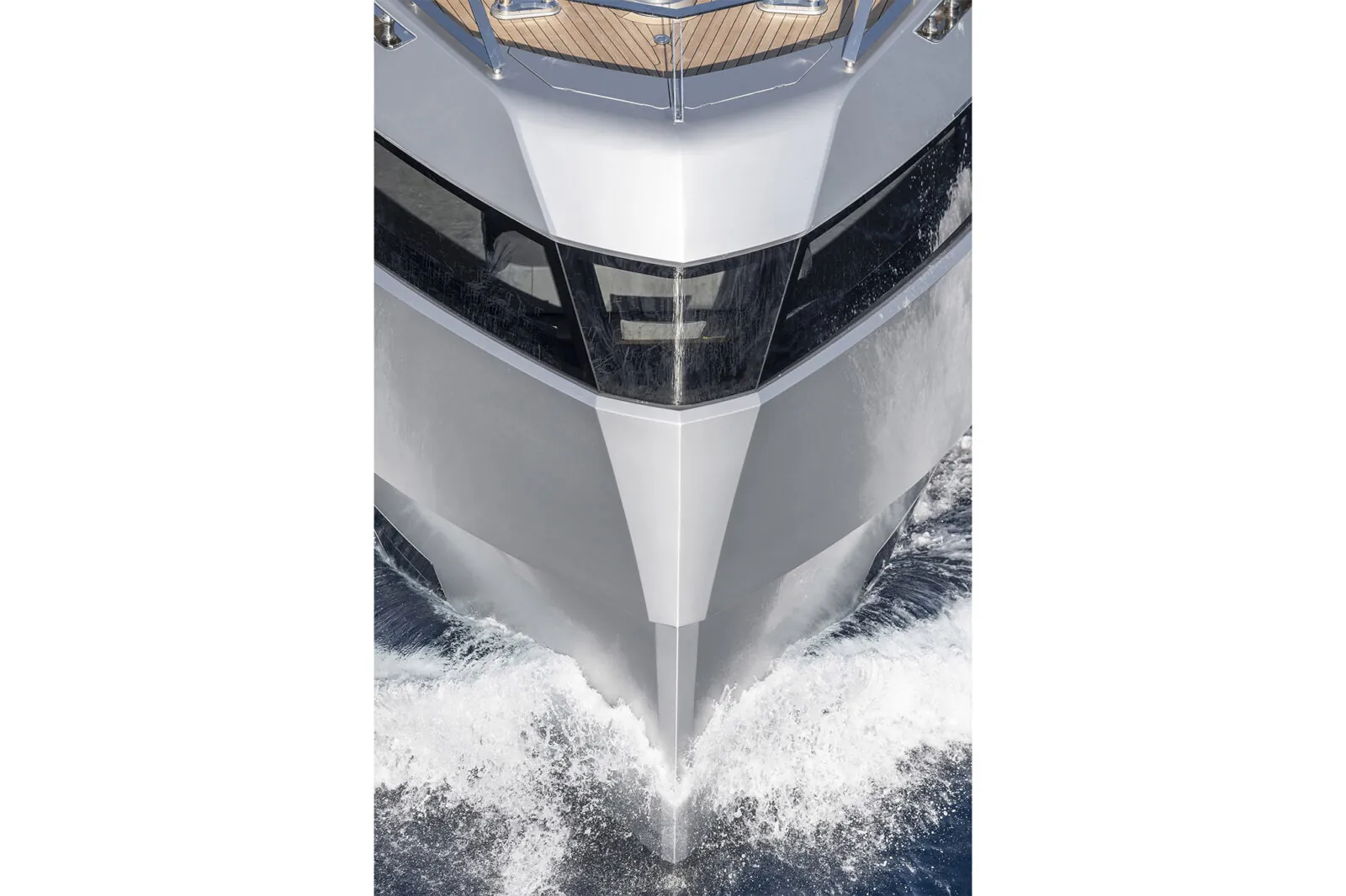 And yet, this high 4.7m bow is part of a hull form has been studied in minute detail to provide stability, eliminate slamming, and still deliver semi-displacement performance. Renowned designer Laurent Giles developed the naval architecture specifically for this yacht, which was exhaustively tank-tested in Southampton. Combined with the Volvo IPS pod propulsion system, the wallywhy200 can cruise at 20 knots and hit 23 knots flat out with the optional enhanced power package.