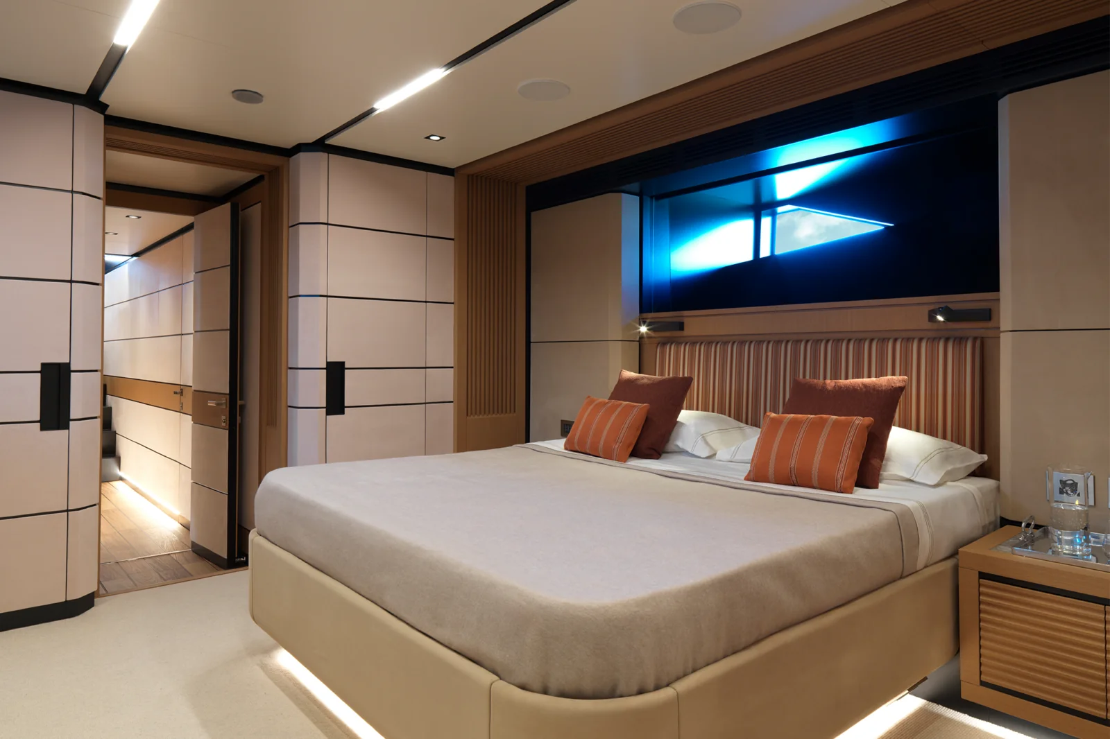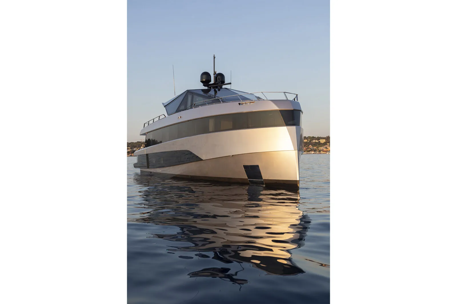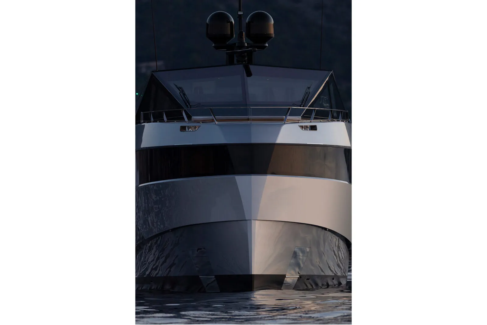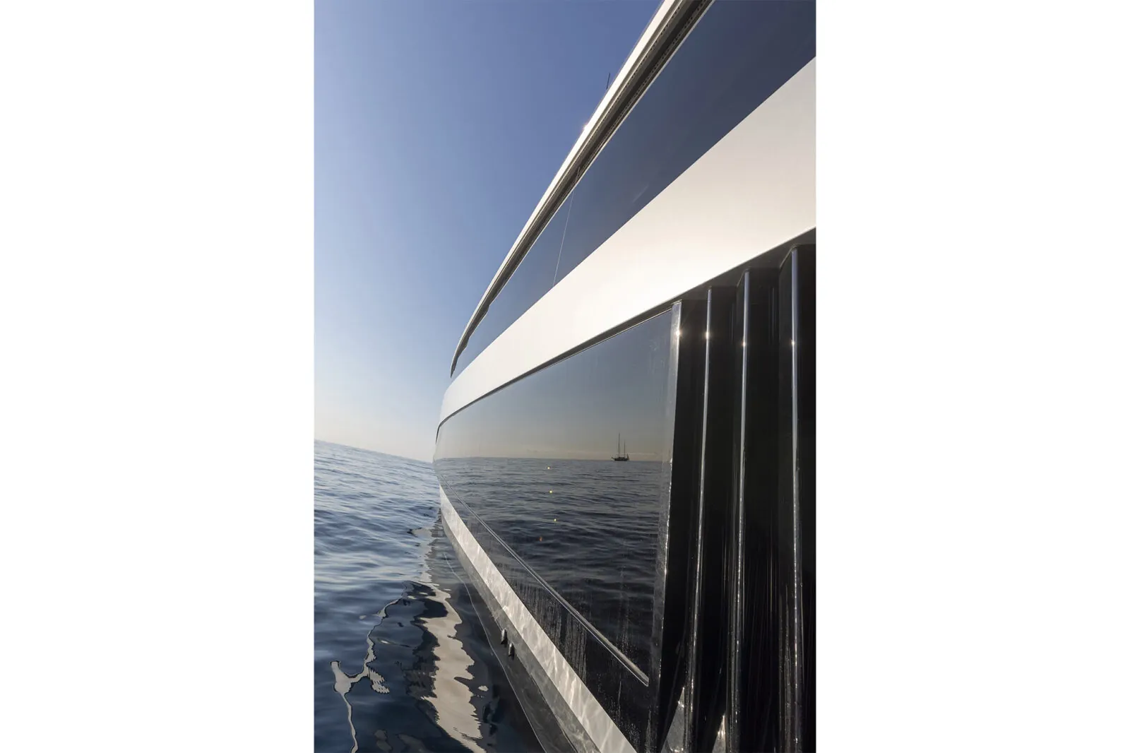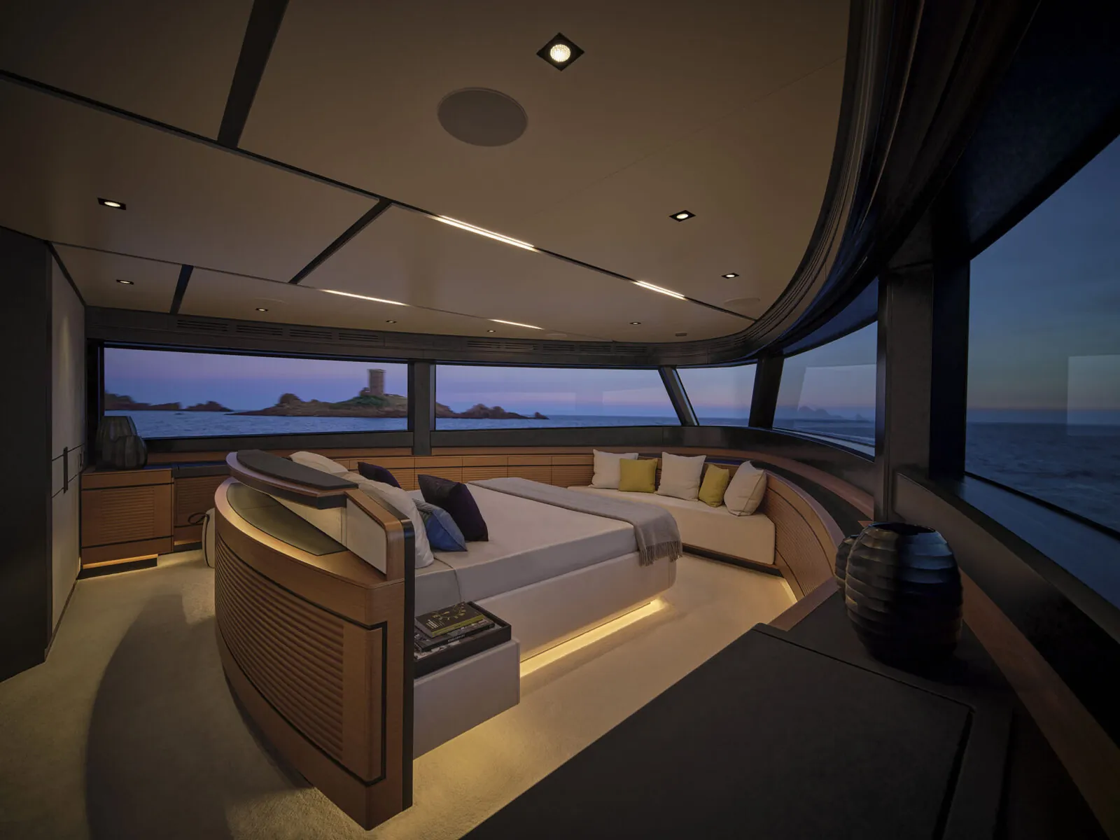With its full-wide body, the signature of this futuristic spaceship is the vast owner’s suite in the bow, which seems to hang over the water below. Wally has expertly engineered a strip of tall glass running all the way round the main deck, providing the cabin with 270-degree panoramic views and astonishing natural light.