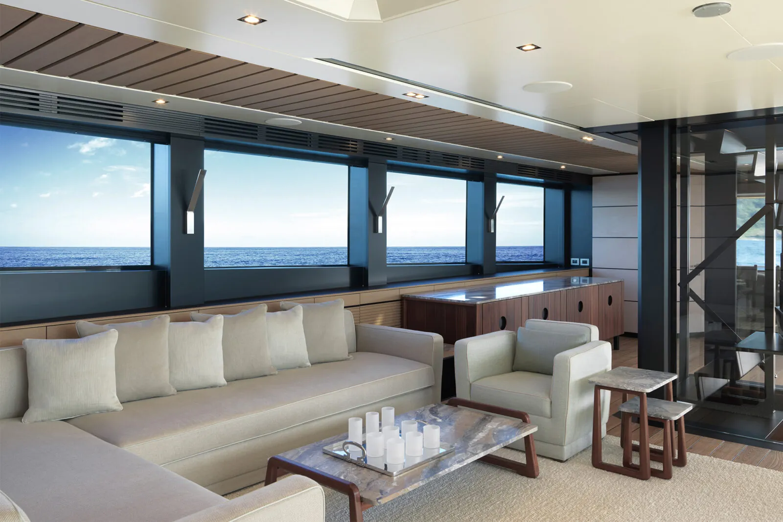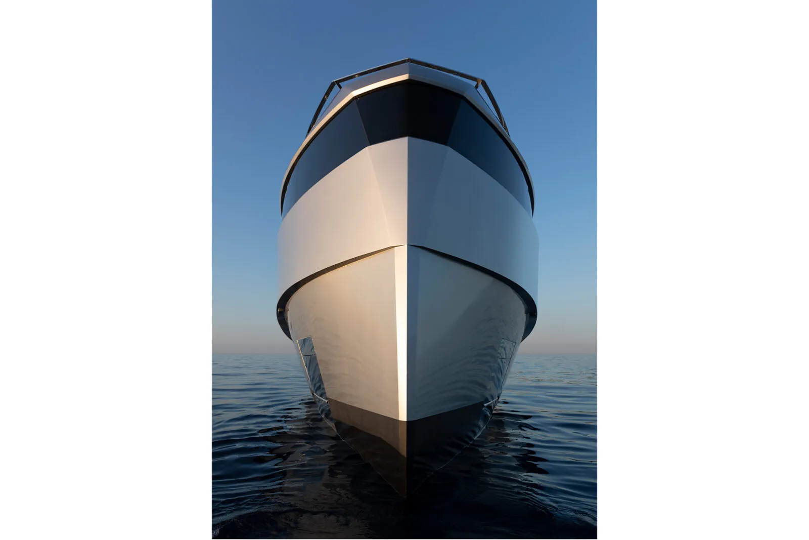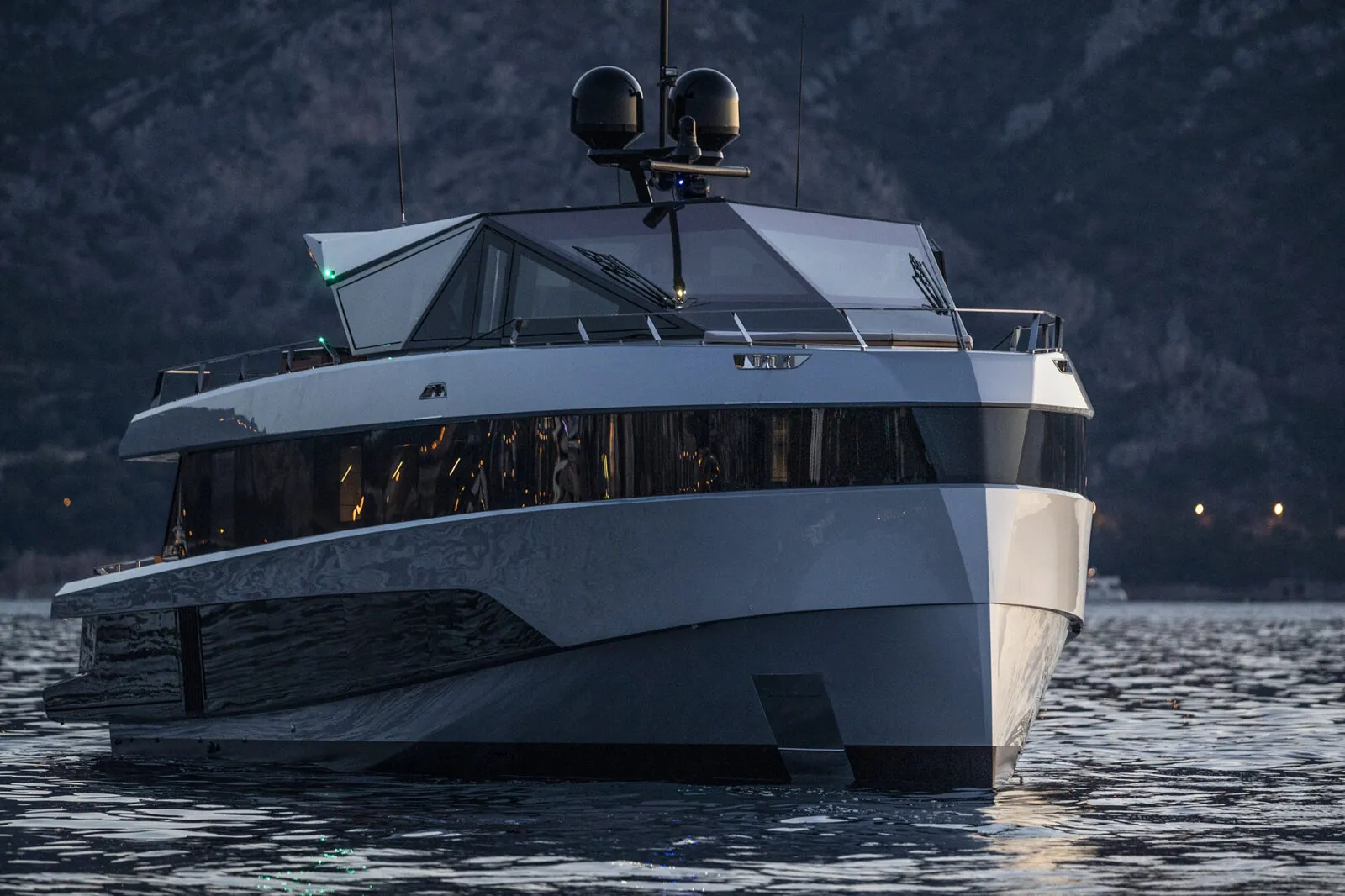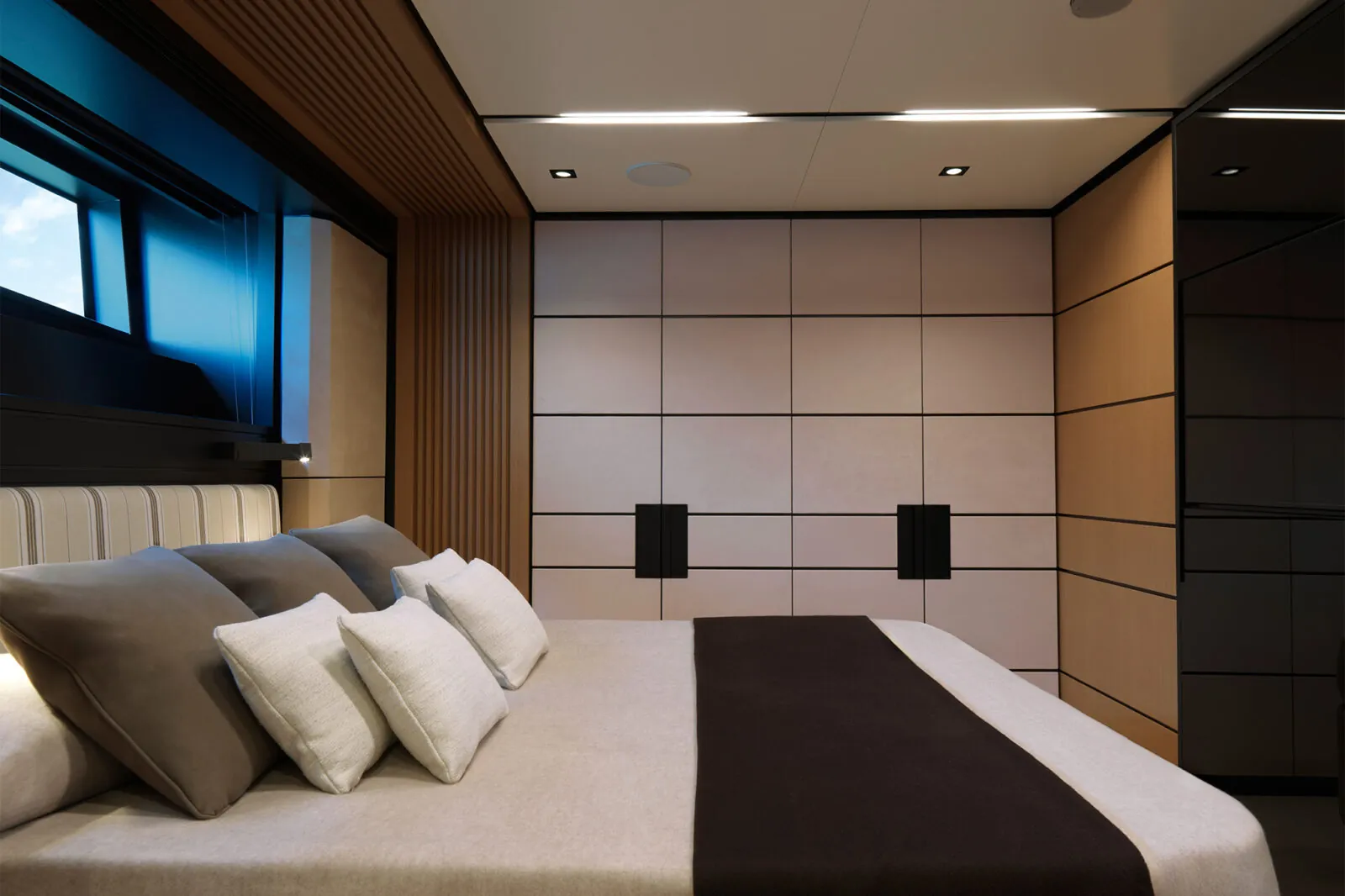 With its full-wide body, the signature of this futuristic spaceship is the vast owner’s suite in the bow, which seems to hang over the water below. Wally has expertly engineered a strip of tall glass running all the way round the main deck, providing the cabin with 270-degree panoramic views and astonishing natural light.
