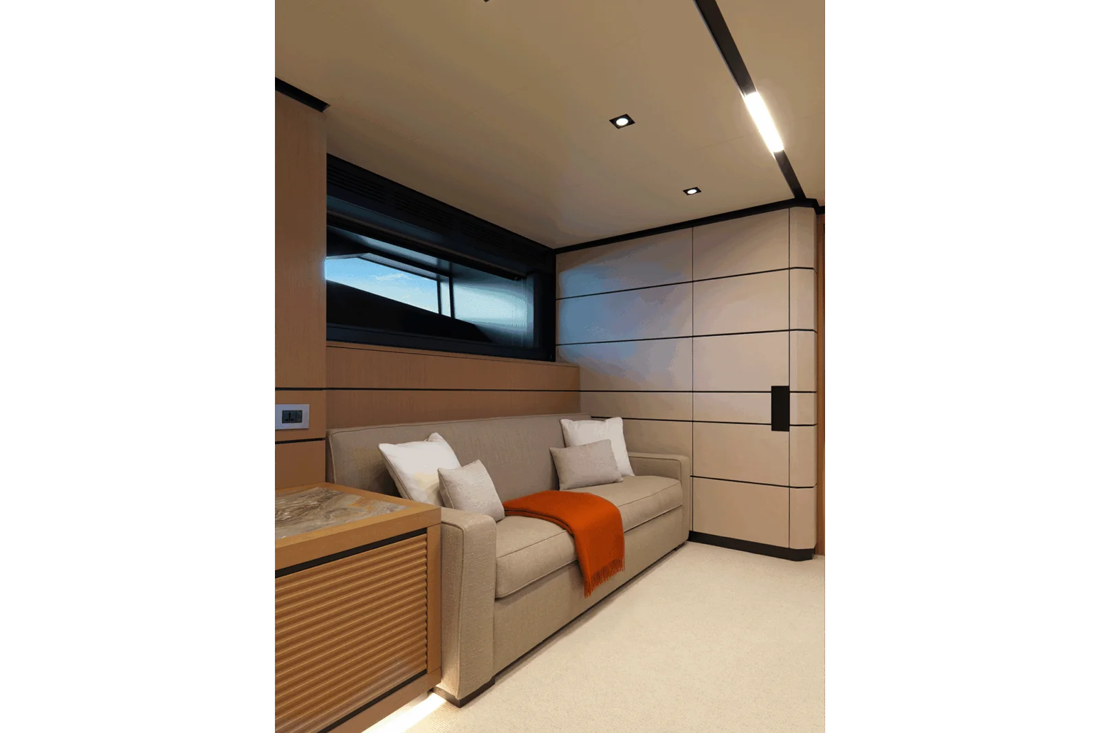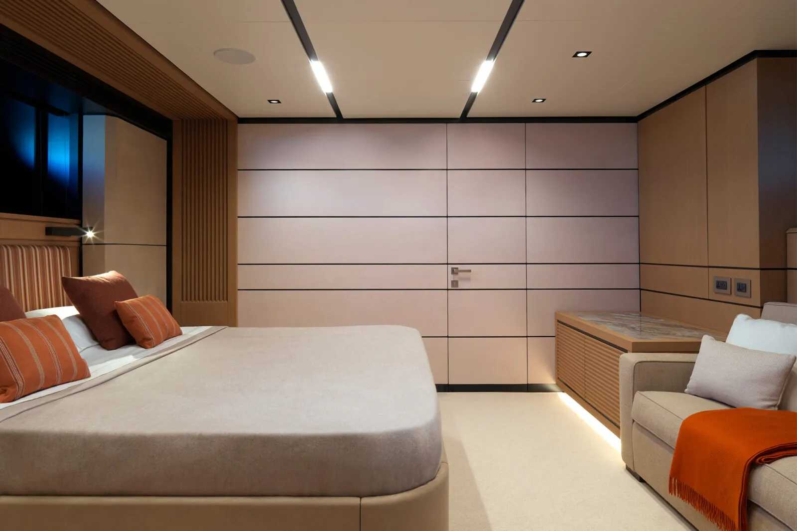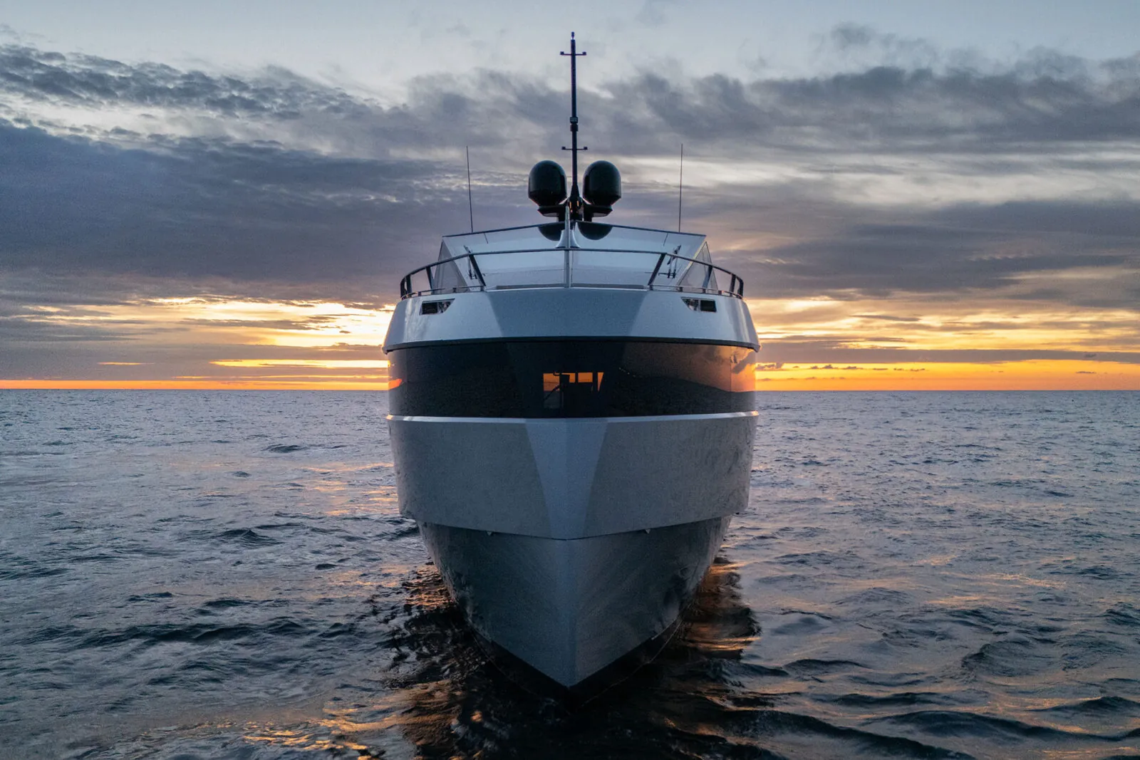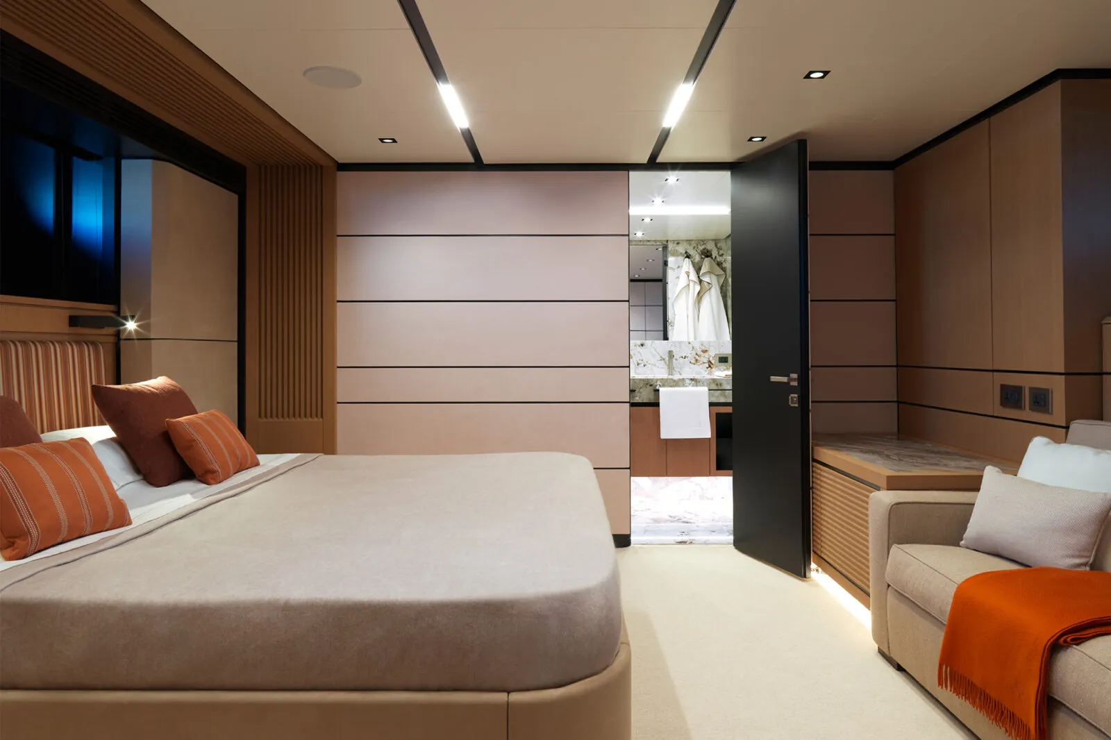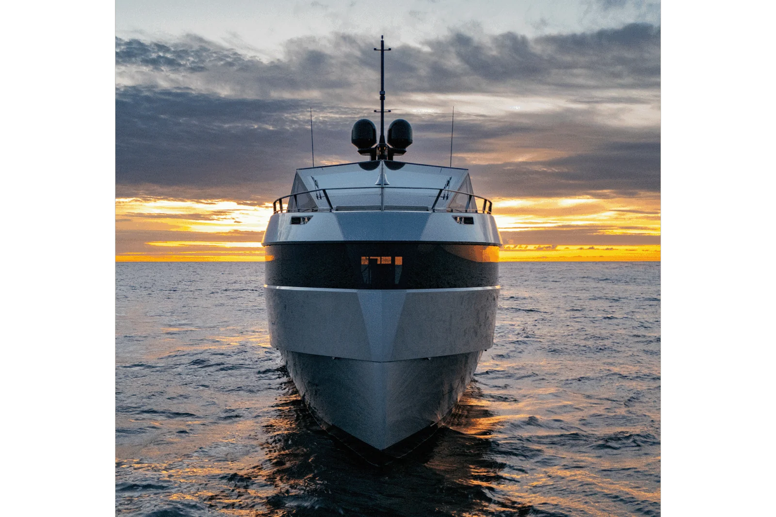 With its full-wide body, the signature of this futuristic spaceship is the vast owner’s suite in the bow, which seems to hang over the water below. Wally has expertly engineered a strip of tall glass running all the way round the main deck, providing the cabin with 270-degree panoramic views and astonishing natural light.