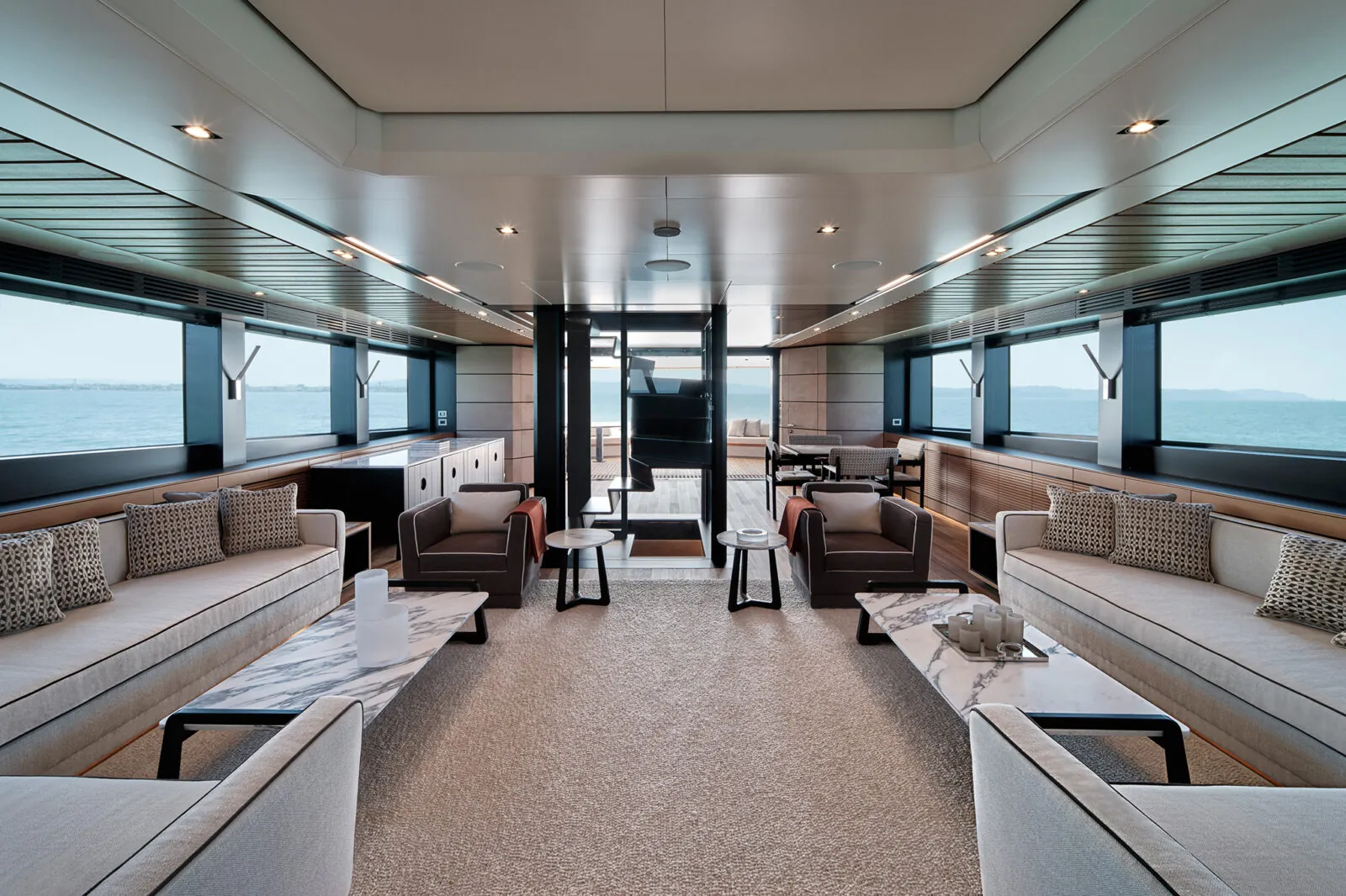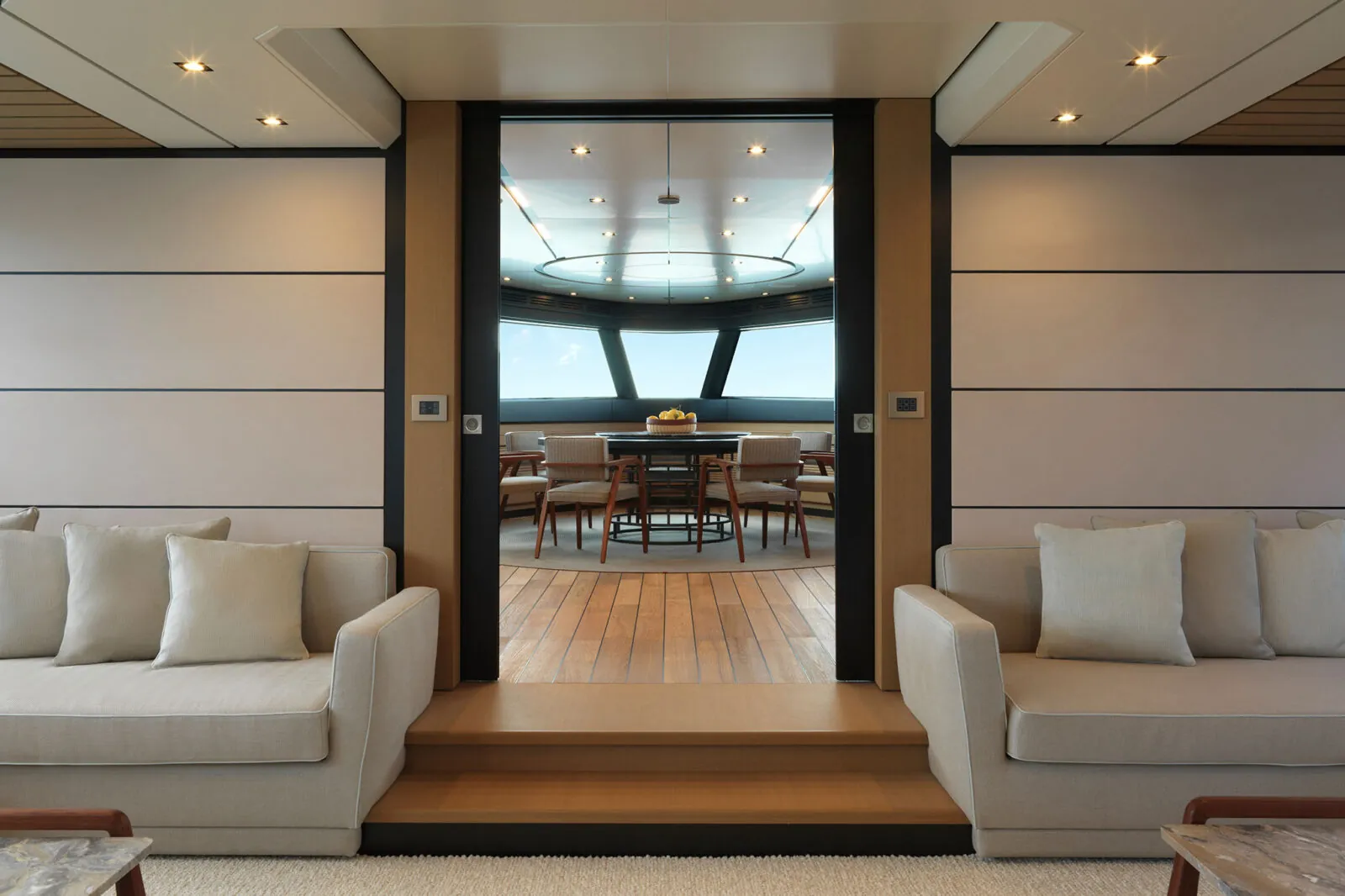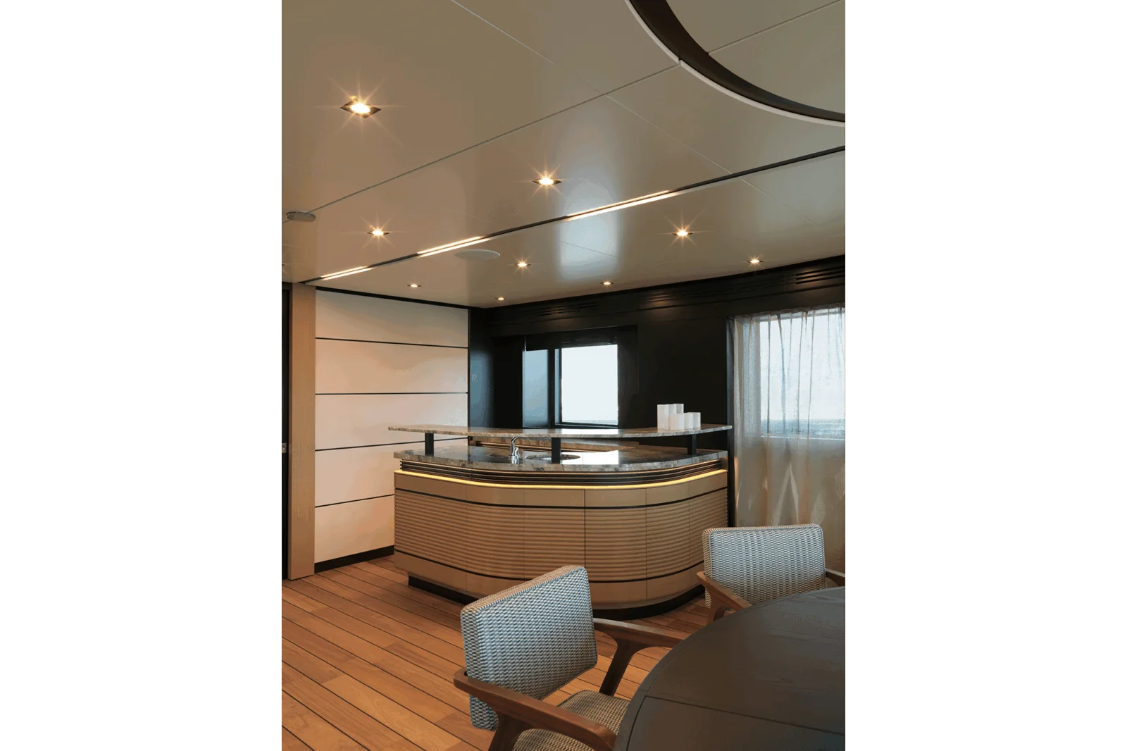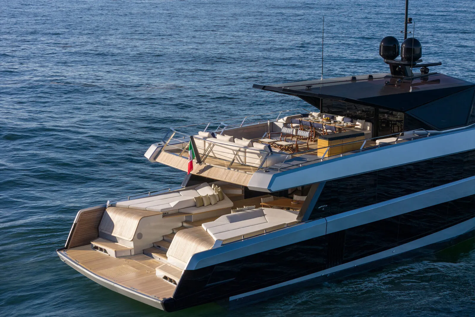 The design is breathtaking, with elegant teak decking and steps that cascade down to the beach club aft, which extends with wings at the side and a hydraulic bathing platform that doubles as a passerelle. A 4.15m tender and other toys are garaged invisibly behind the wings.