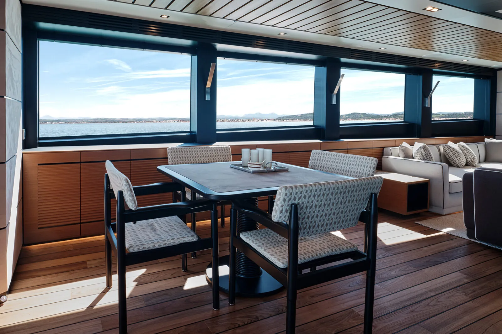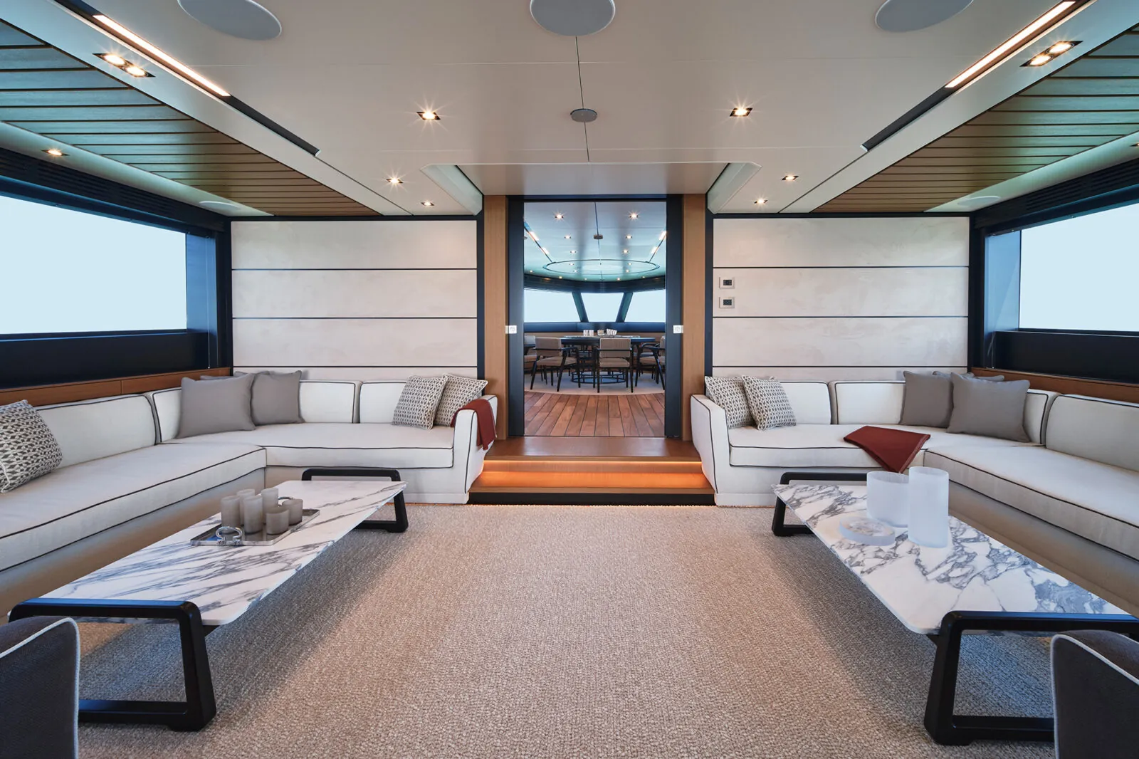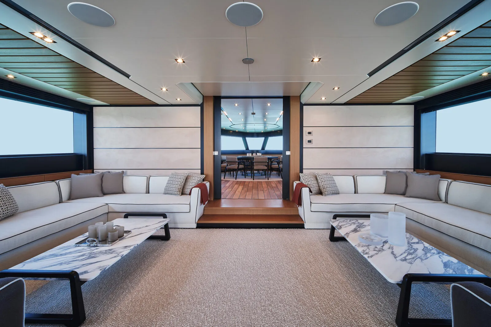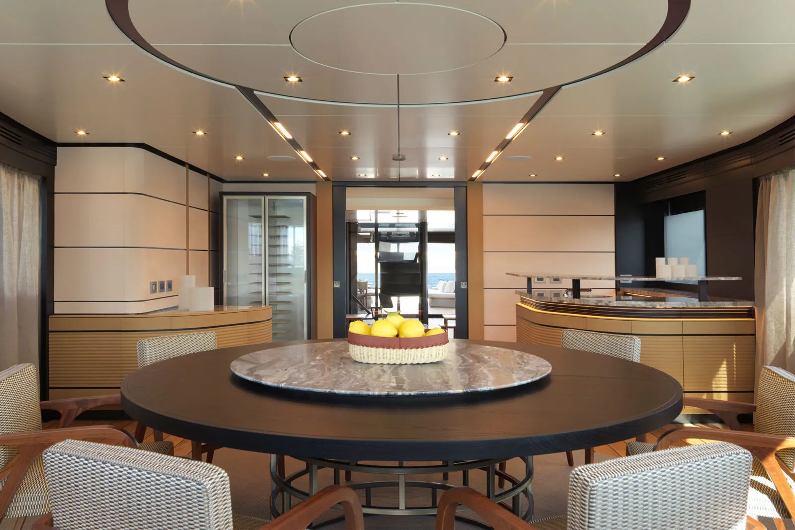 The design is breathtaking, with elegant teak decking and steps that cascade down to the beach club aft, which extends with wings at the side and a hydraulic bathing platform that doubles as a passerelle. A 4.15m tender and other toys are garaged invisibly behind the wings.
