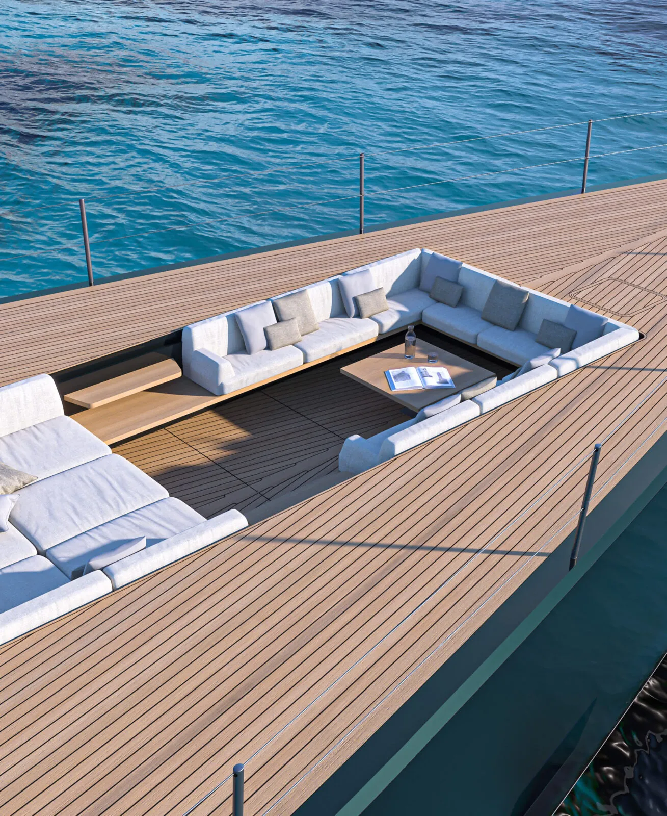 Guests will be enchanted by the many relaxing possibilities and the size of the beach club aft. But perhaps most of all by the forward cockpit, whose elegant teak steps and deep seating are revealed once the 5.0m tender has been launched.