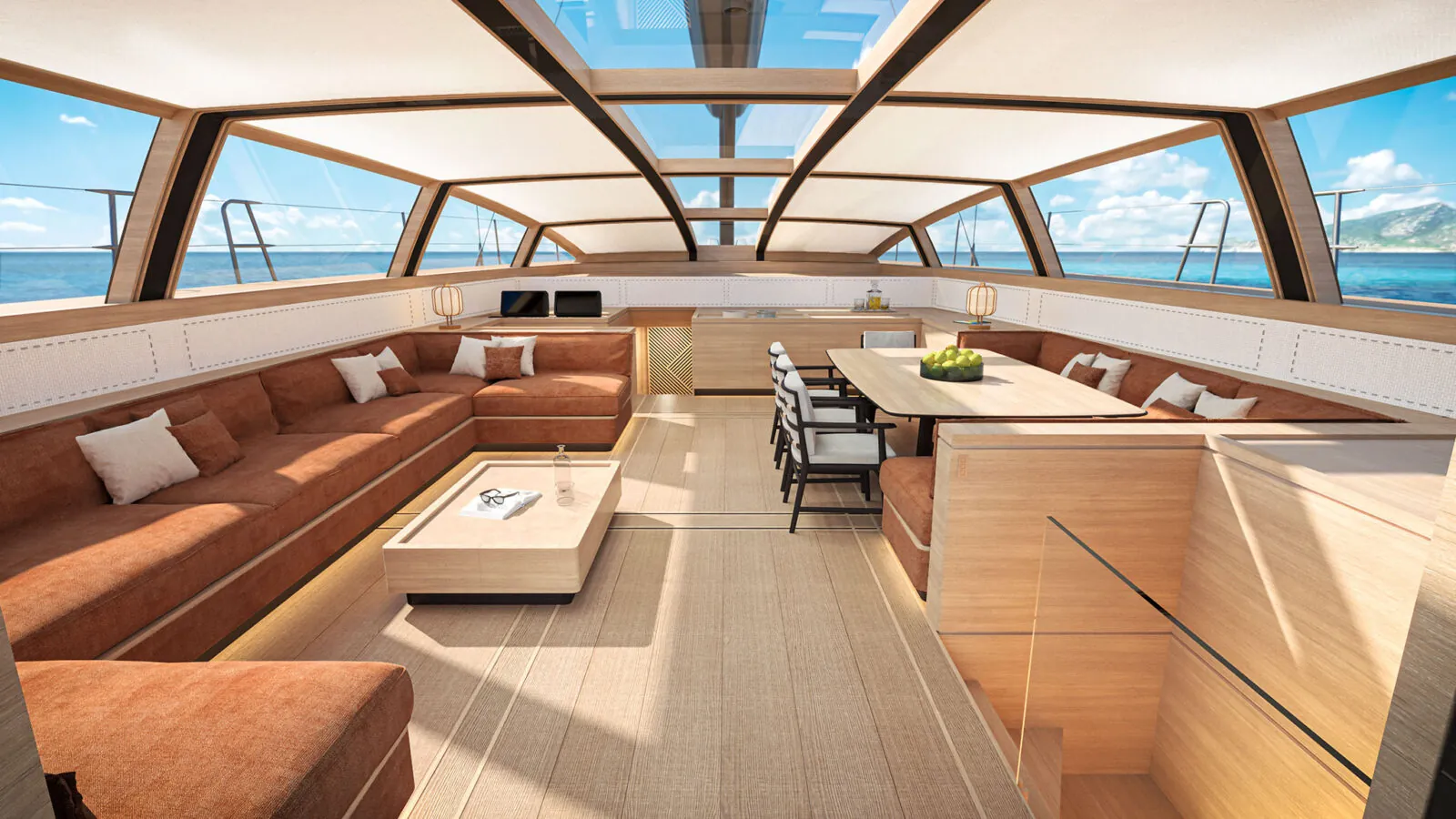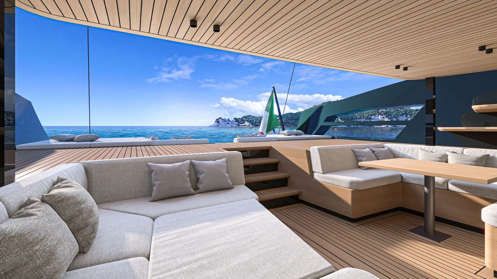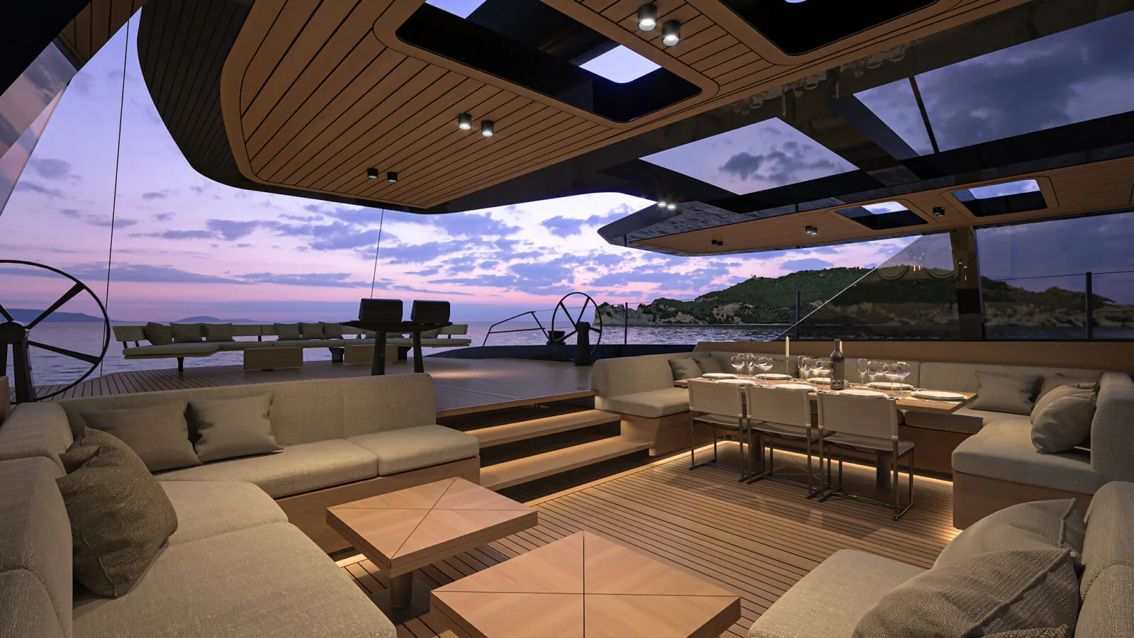 A sleek, glass deckhouse roof swoops aft, largely concealed behind the raised bulwarks which preserve the elegant overall proportions of the yacht. This is the social center of the wallywind150, where guests dine and relax together in the company of the seascape that surrounds the boat. It gives flush-deck access to the well-sheltered guest cockpit before climbing to the aft cockpit.