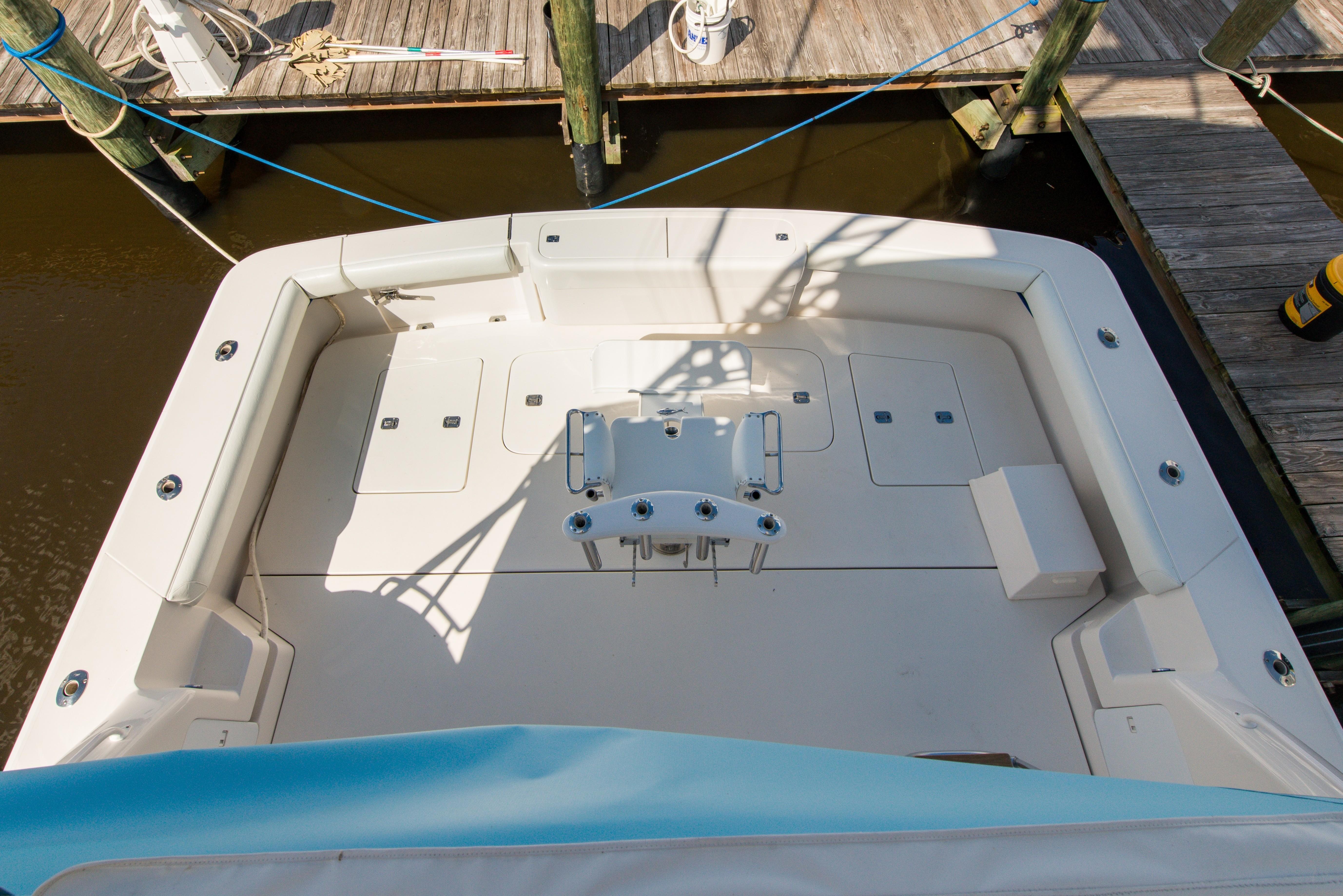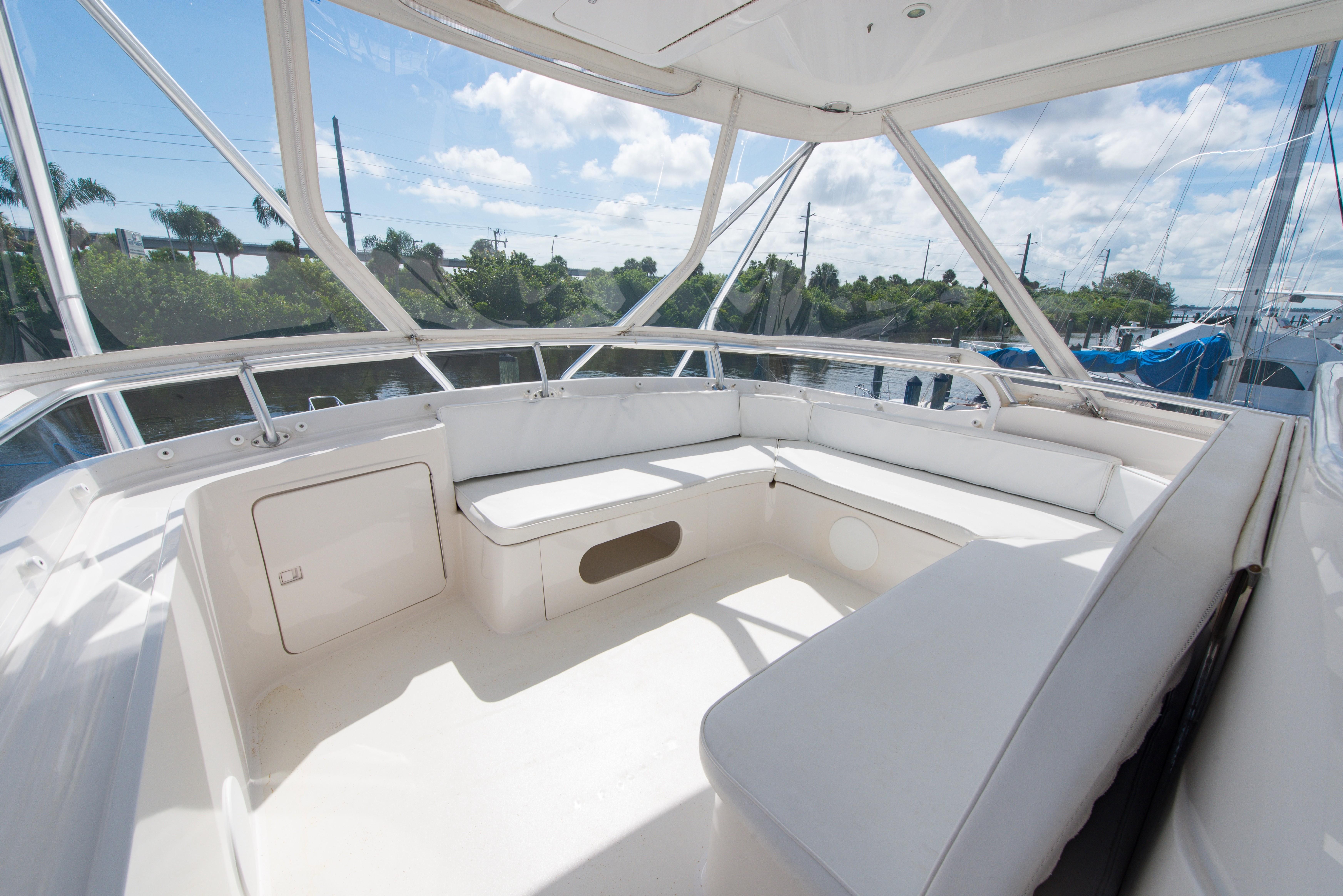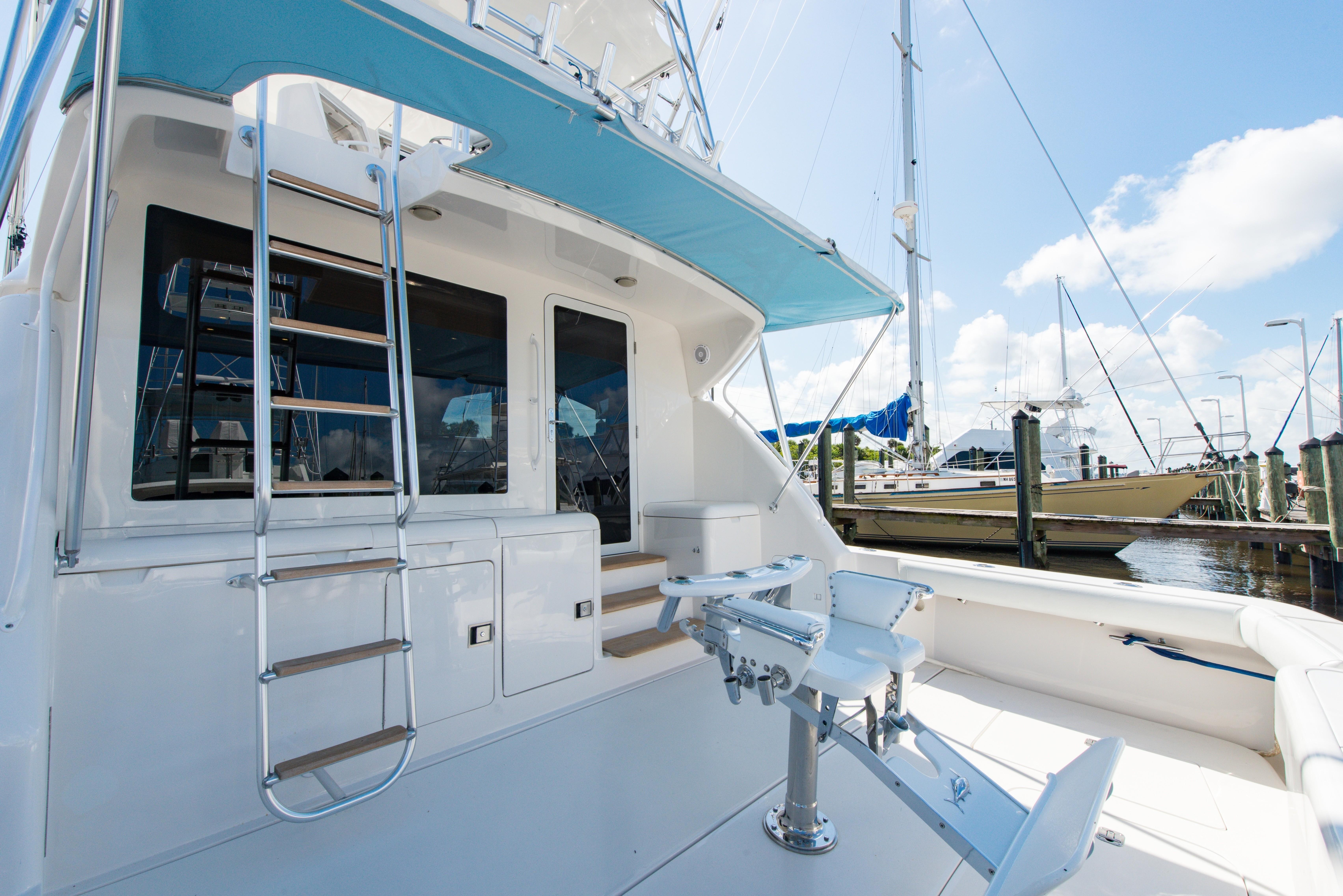 The spacious cockpit of the Bertram 510 came standard with a transom fish box, and indeck fish/storage box, tackle center with sink and livewell, and engine room access.