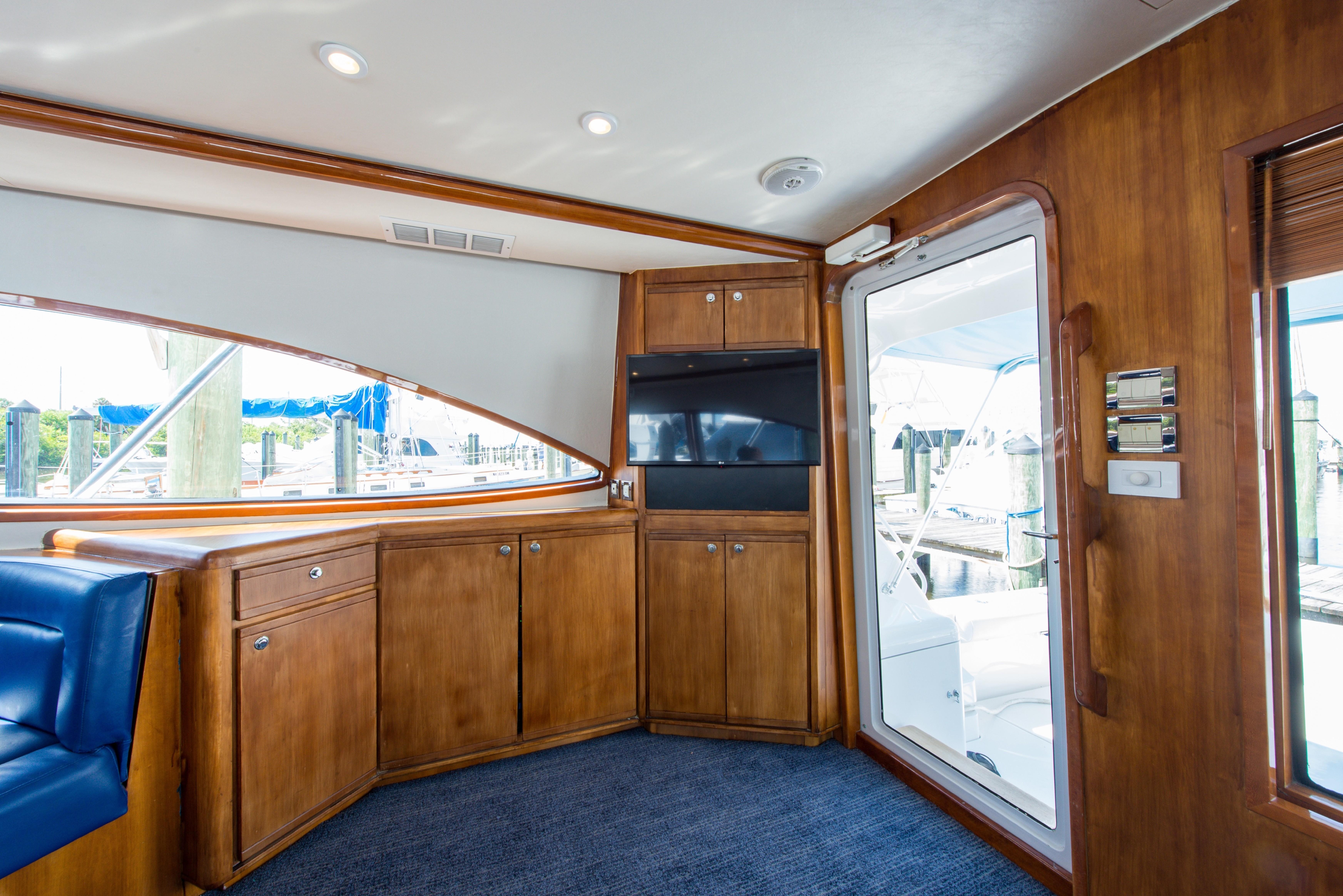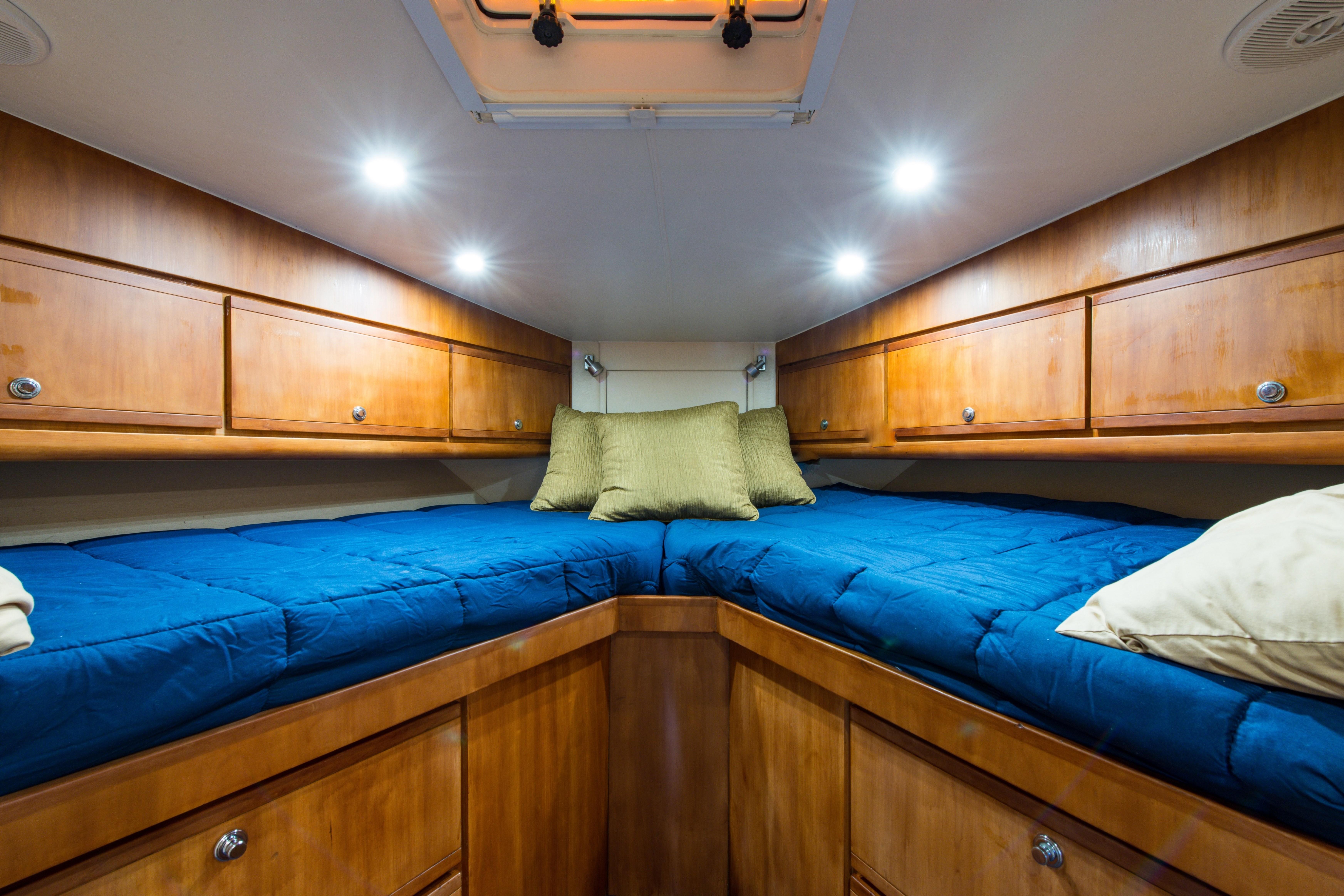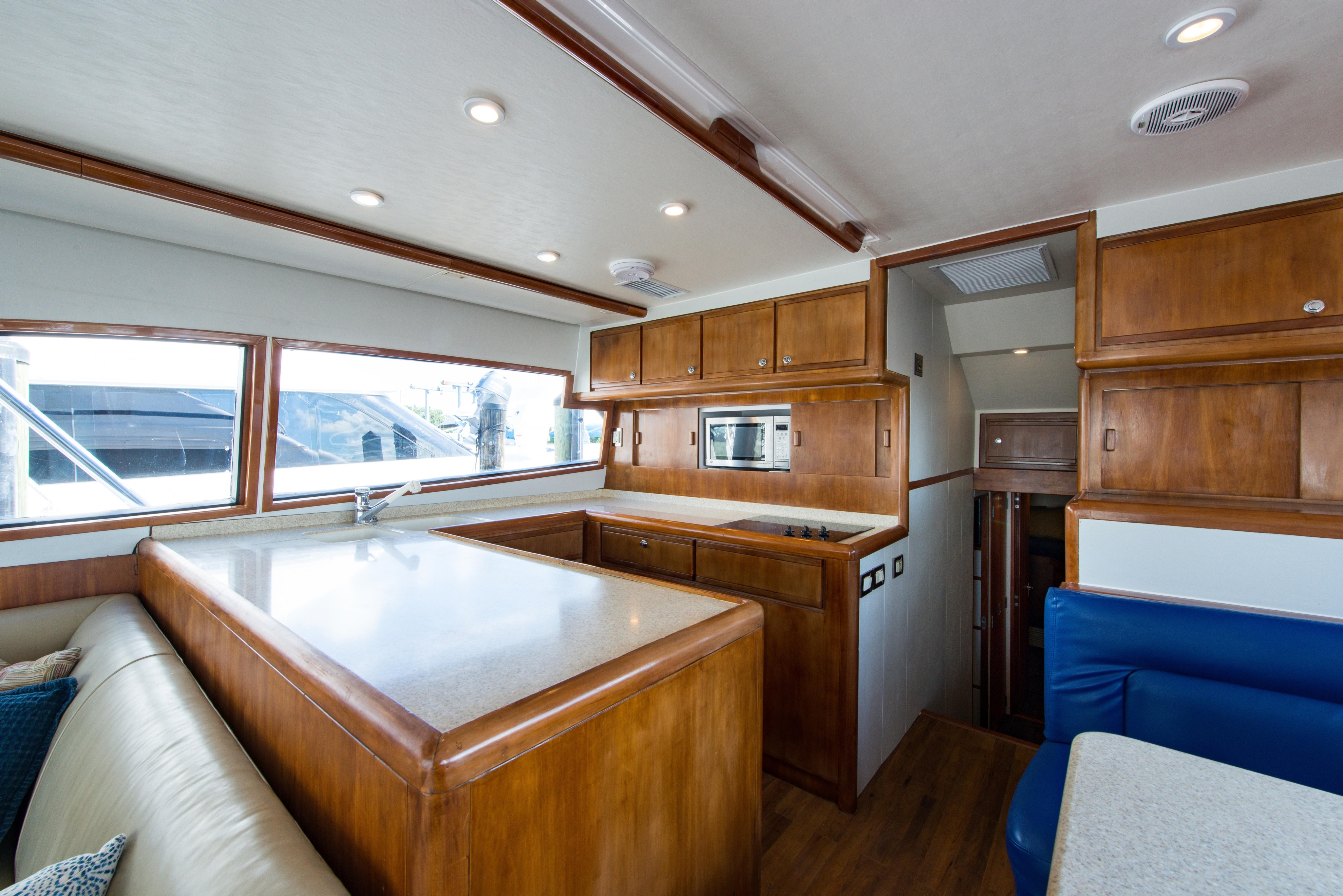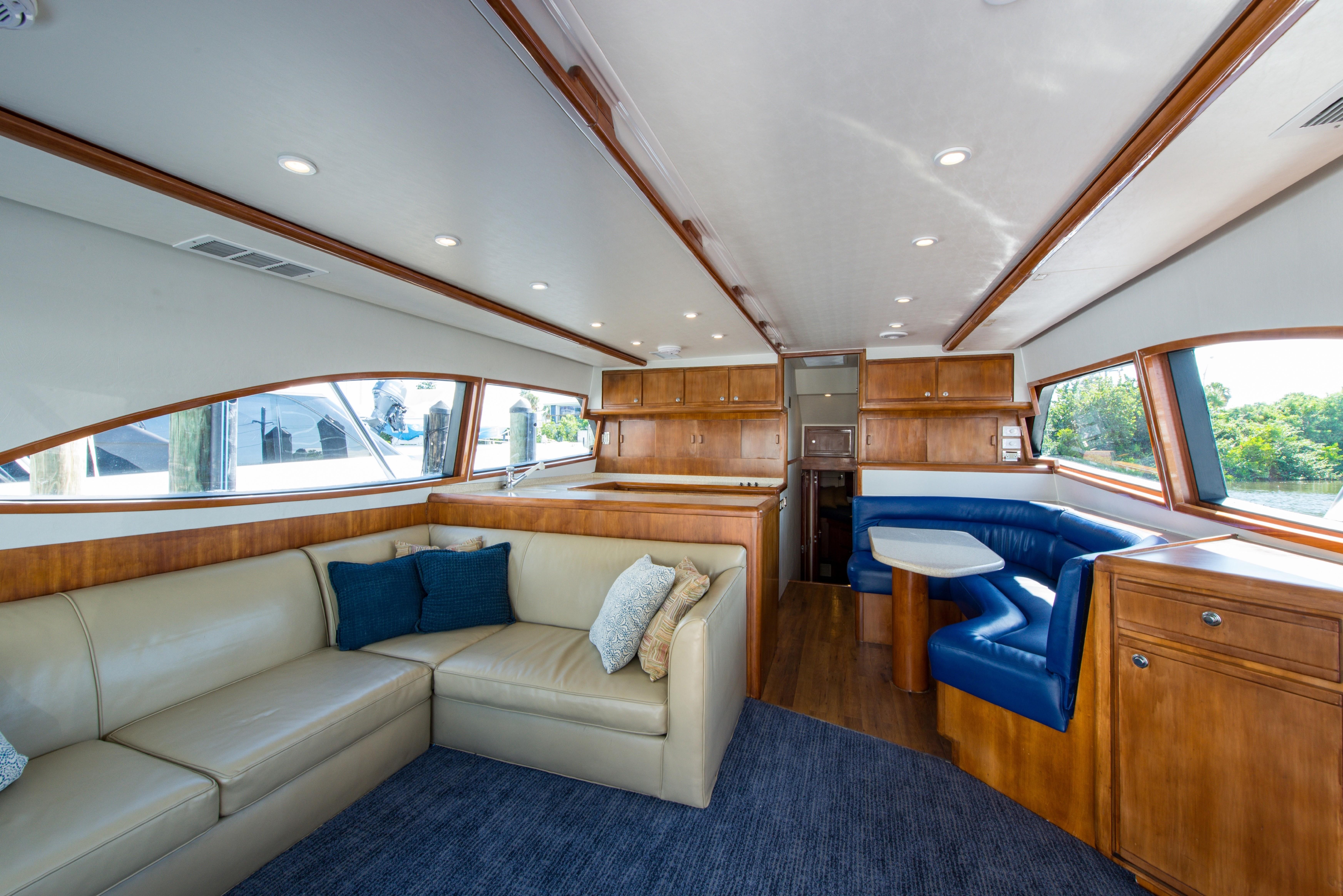 Whether fishing or cruising, the 510 provides a versatile platform that meets the demands of the most avid yachtsman. Her three stateroom cherry-wood interior features a well-appointed salon with lounge seating to port and entertainment center to starboard. A full service galley with Corian counters and SubZero refrigeration is forward to port. Like most convertibles in her class, the master stateroom is amidships, and the VIP queen stateroom is forward. Both guest staterooms share a common head and shower. Note the rod storage locker in the salon overhead.