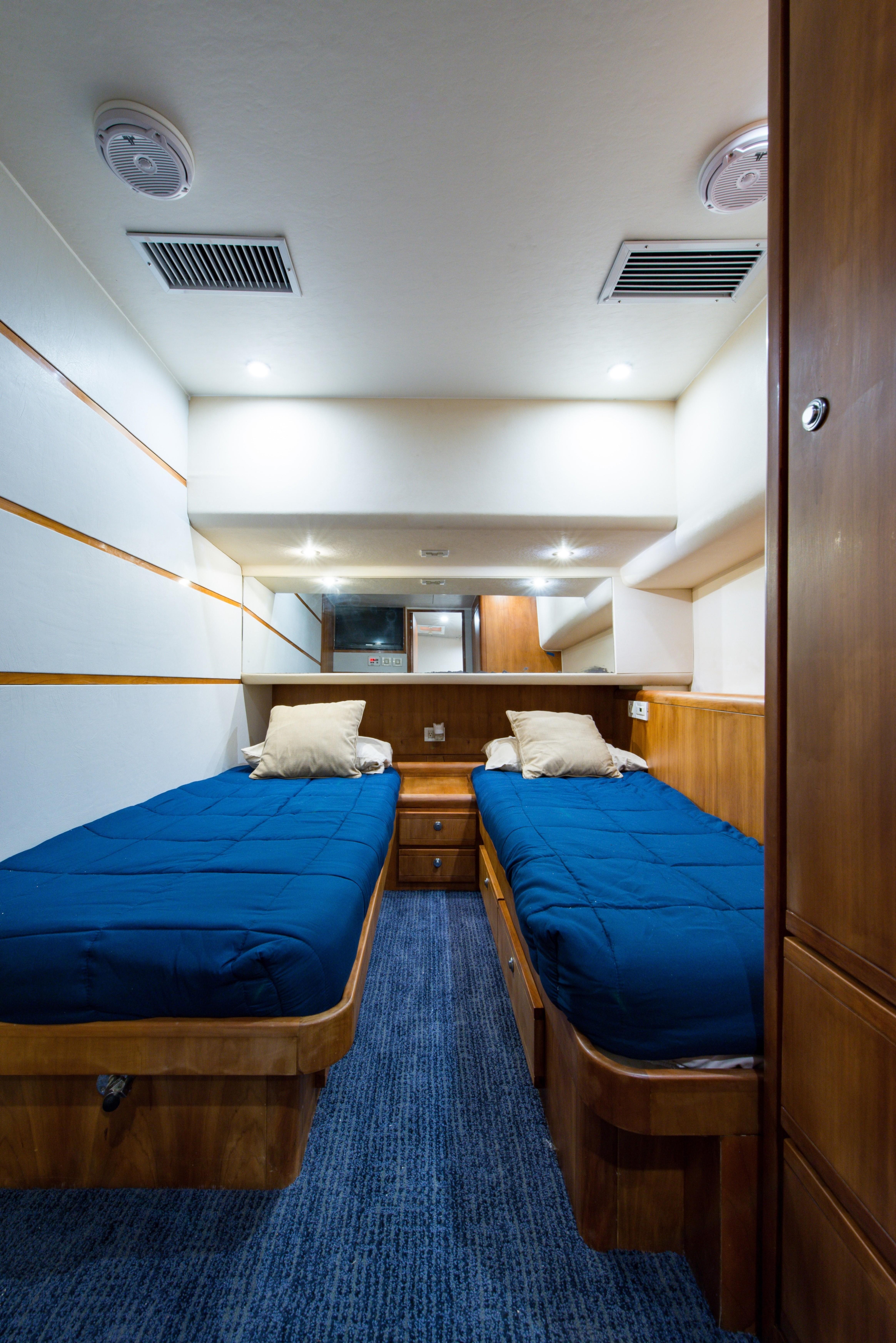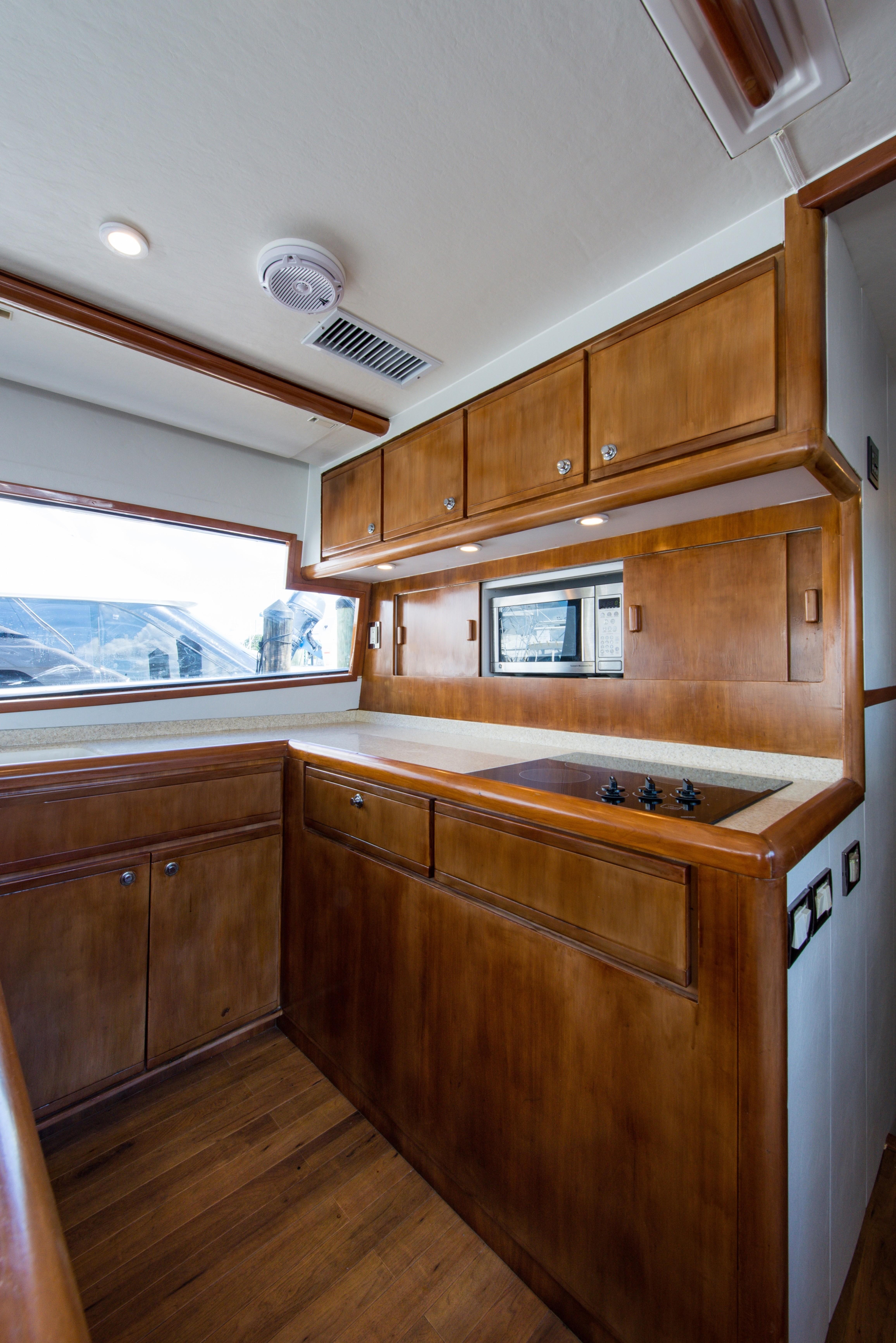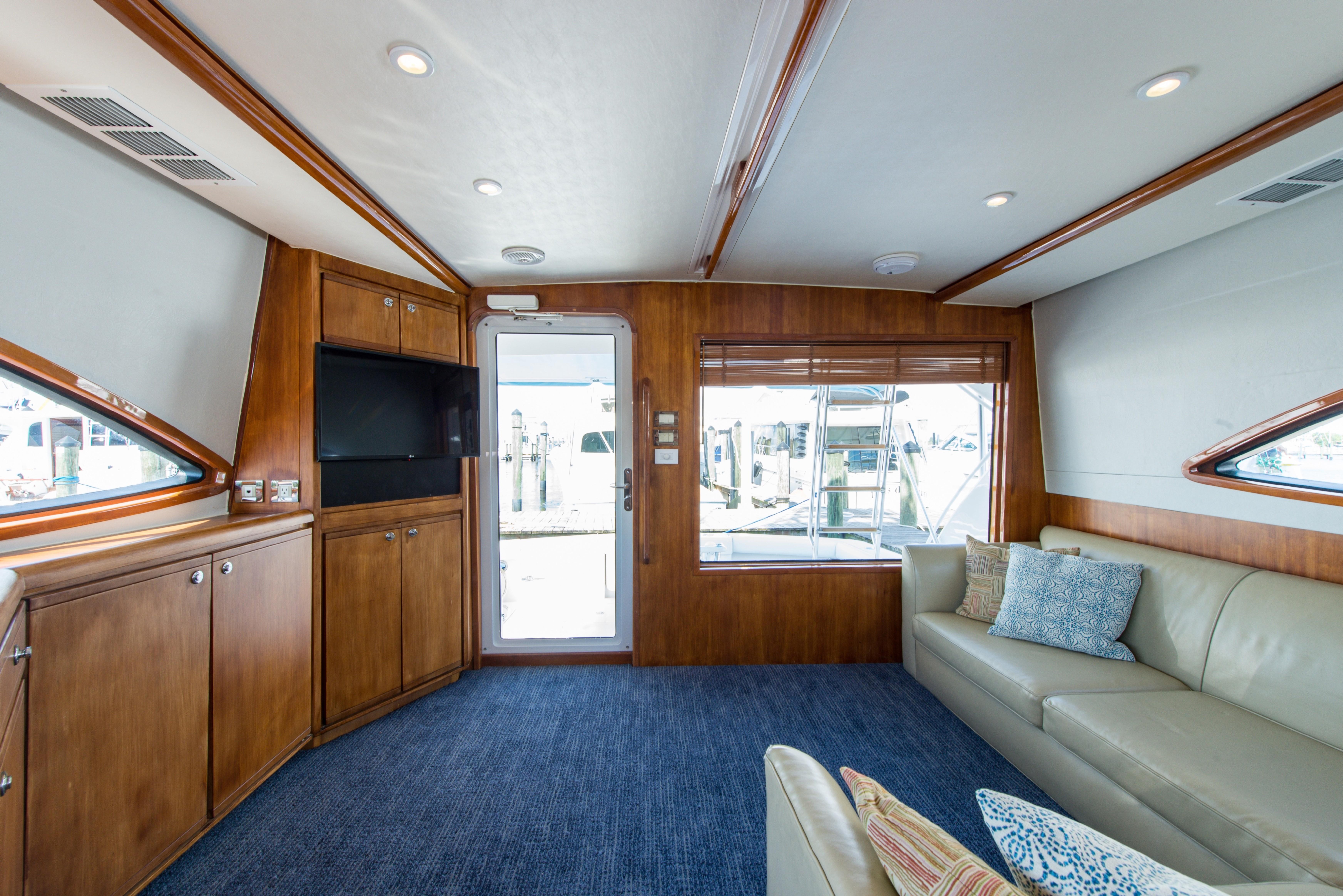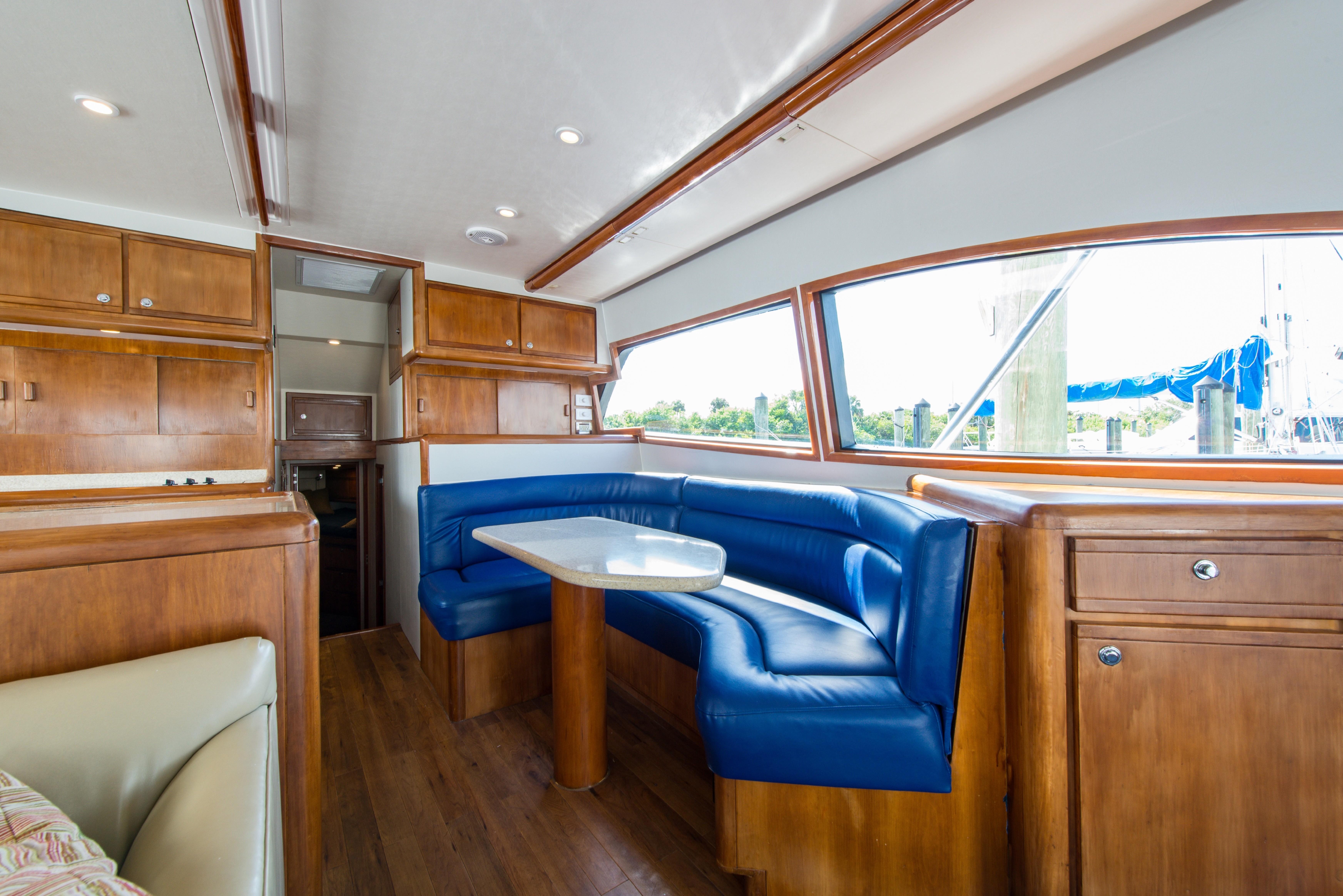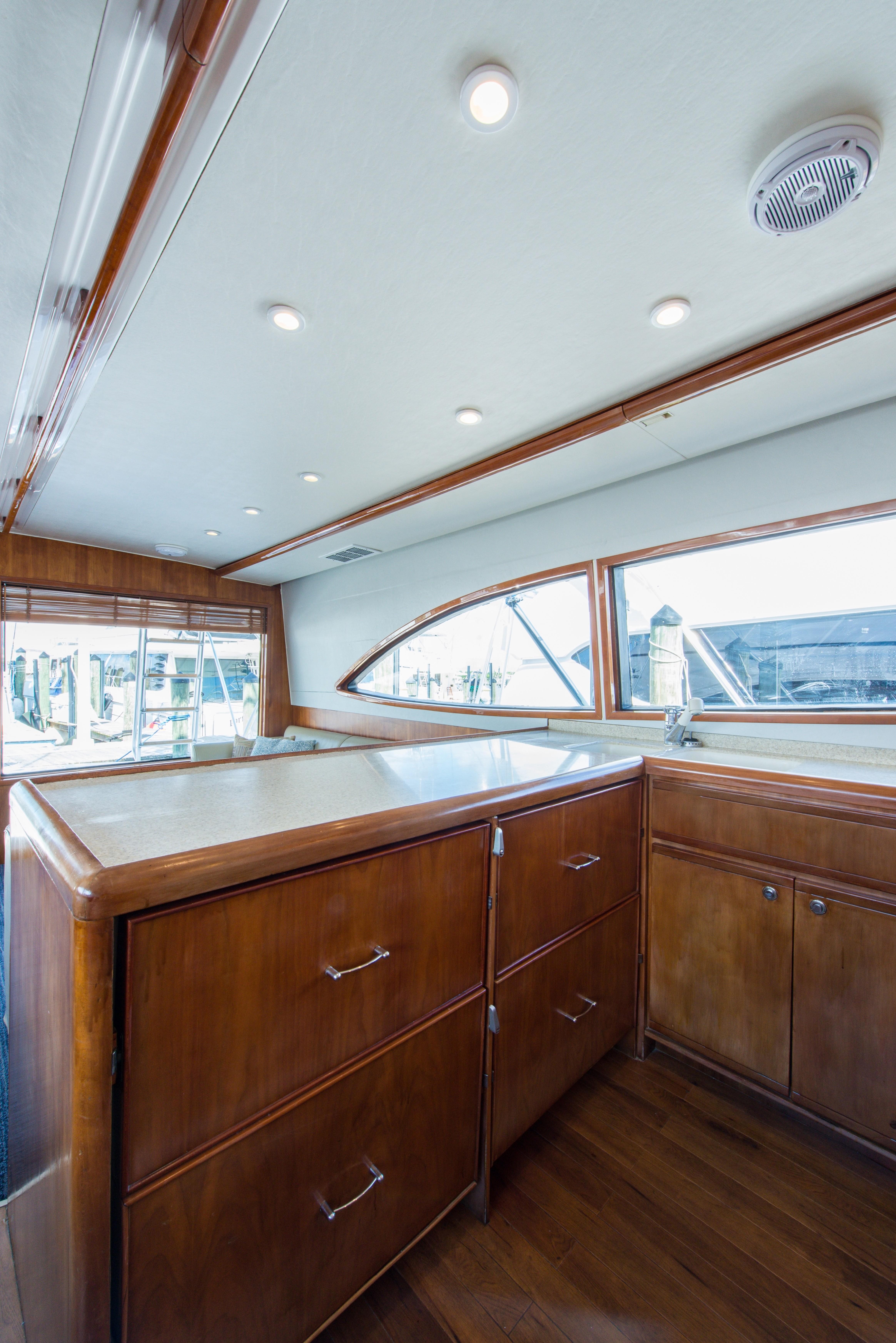Whether fishing or cruising, the 510 provides a versatile platform that meets the demands of the most avid yachtsman. Her three stateroom cherry-wood interior features a well-appointed salon with lounge seating to port and entertainment center to starboard. A full service galley with Corian counters and SubZero refrigeration is forward to port. Like most convertibles in her class, the master stateroom is amidships, and the VIP queen stateroom is forward. Both guest staterooms share a common head and shower. Note the rod storage locker in the salon overhead.