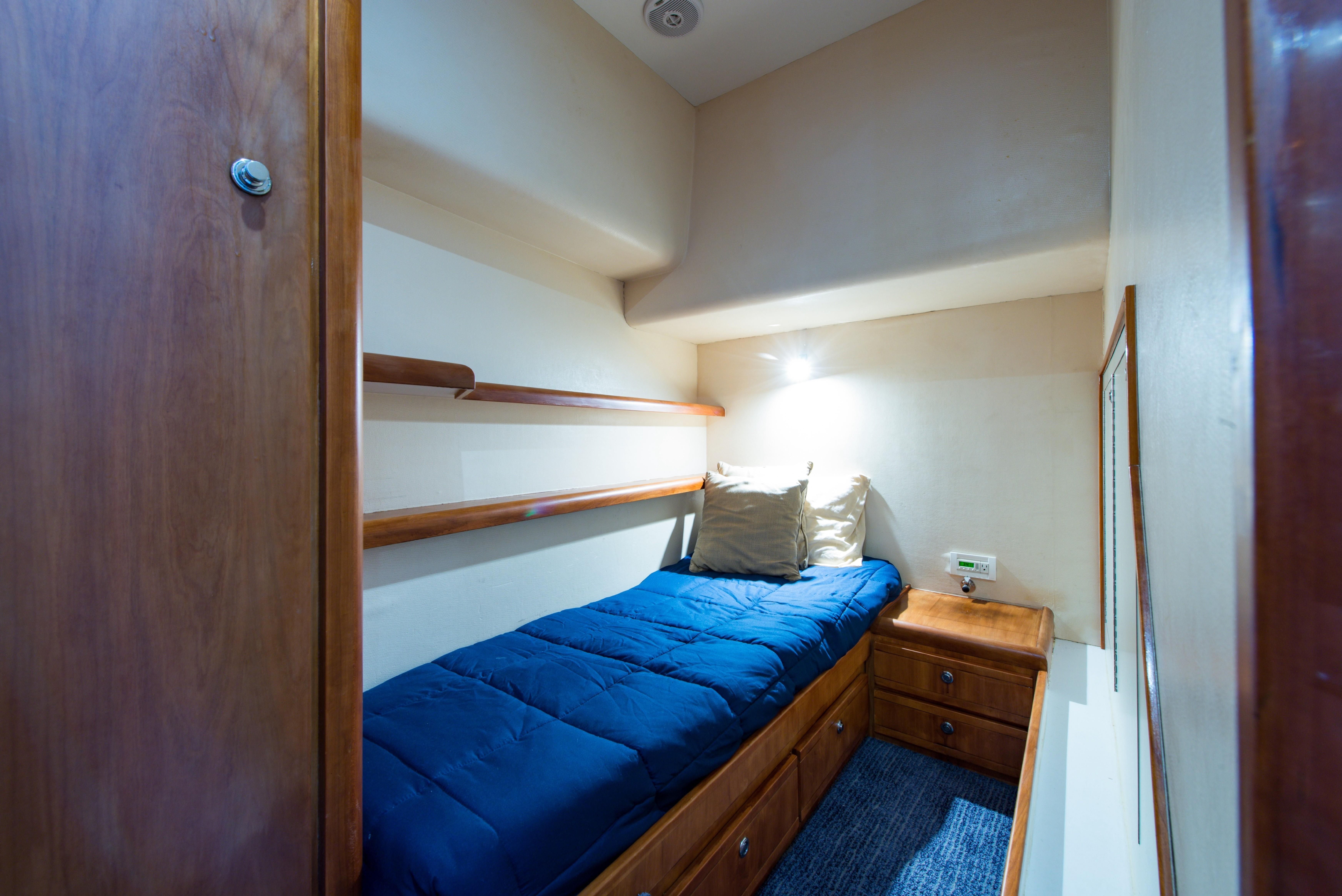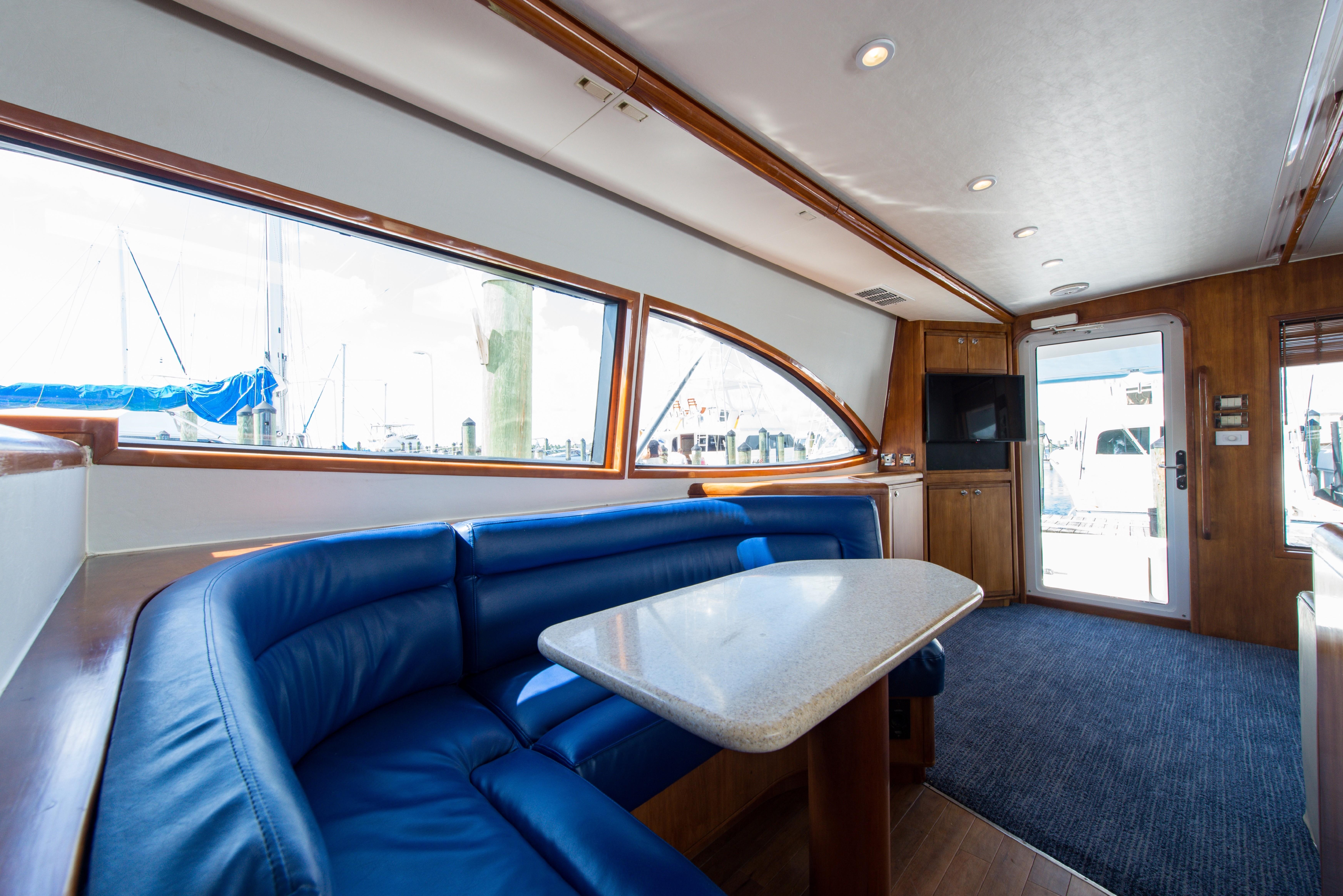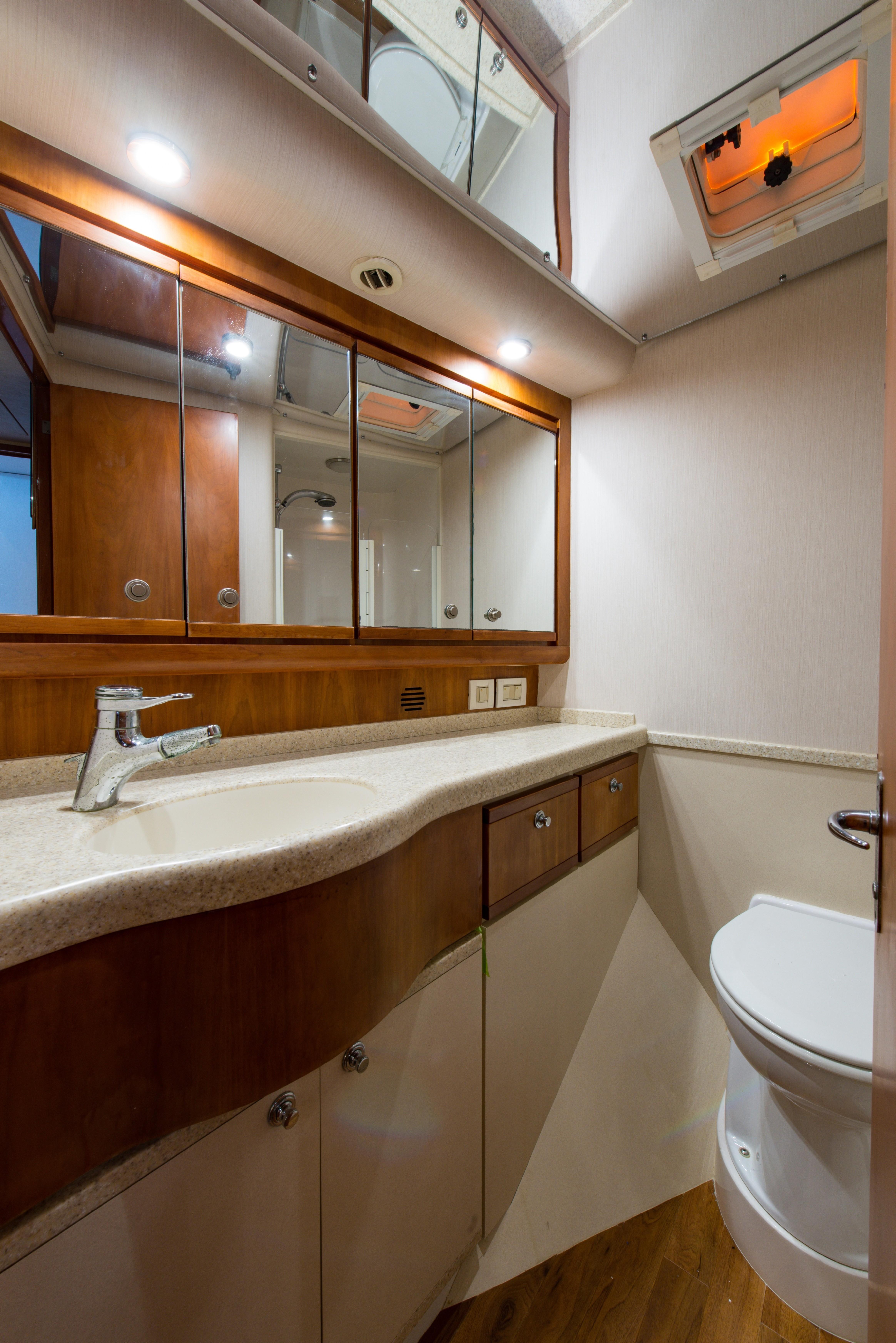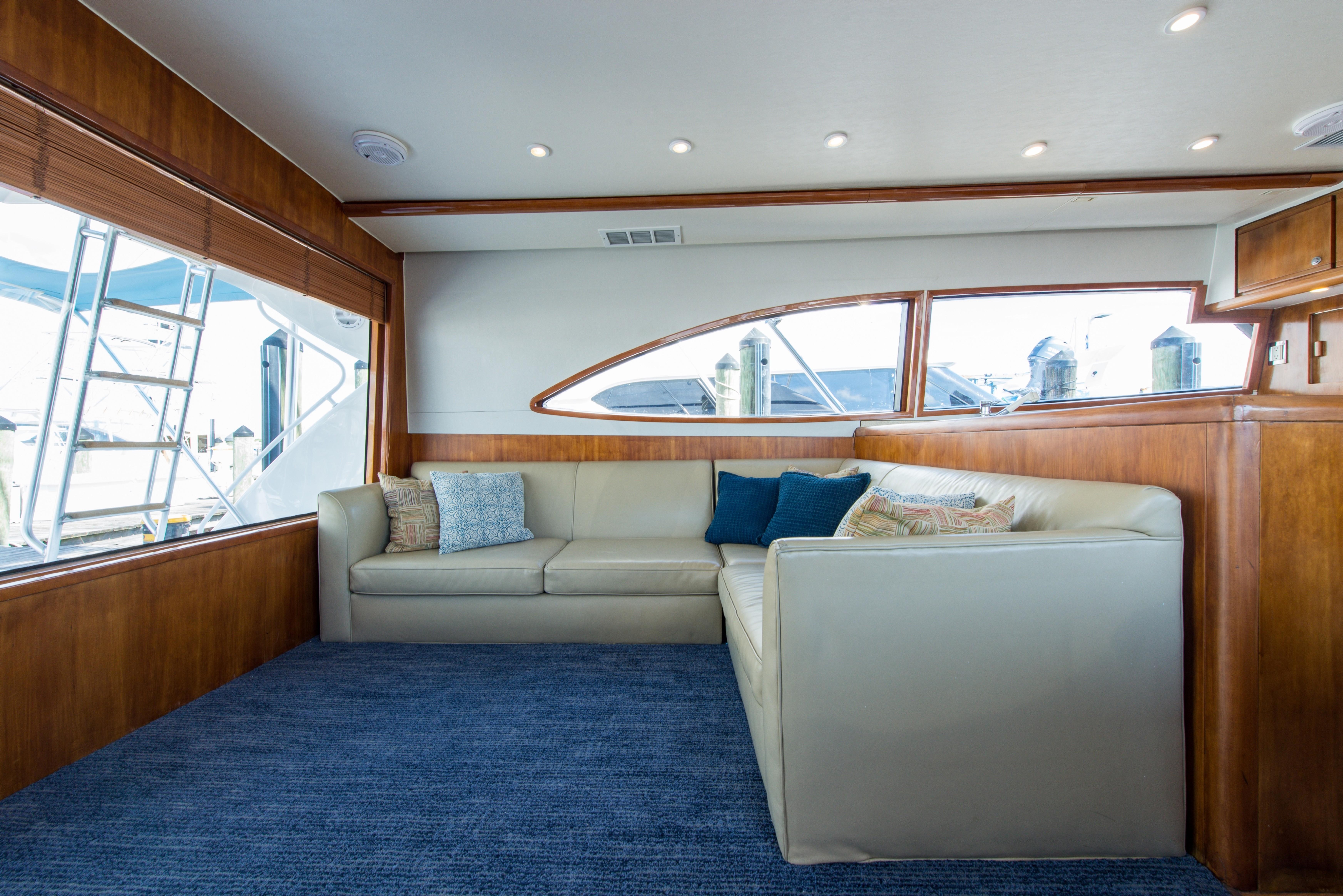 Whether fishing or cruising, the 510 provides a versatile platform that meets the demands of the most avid yachtsman. Her three stateroom cherry-wood interior features a well-appointed salon with lounge seating to port and entertainment center to starboard. A full service galley with Corian counters and SubZero refrigeration is forward to port. Like most convertibles in her class, the master stateroom is amidships, and the VIP queen stateroom is forward. Both guest staterooms share a common head and shower. Note the rod storage locker in the salon overhead.