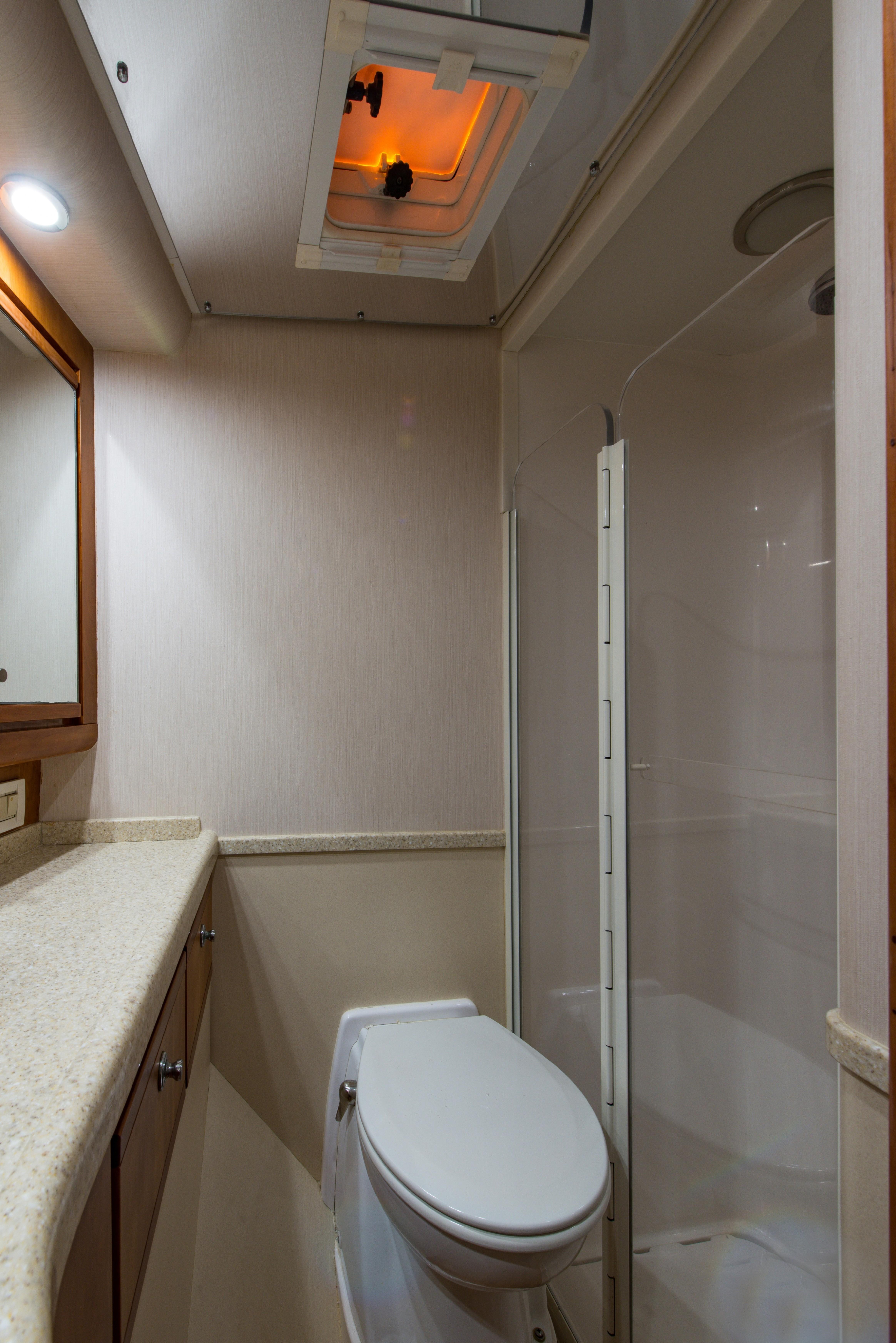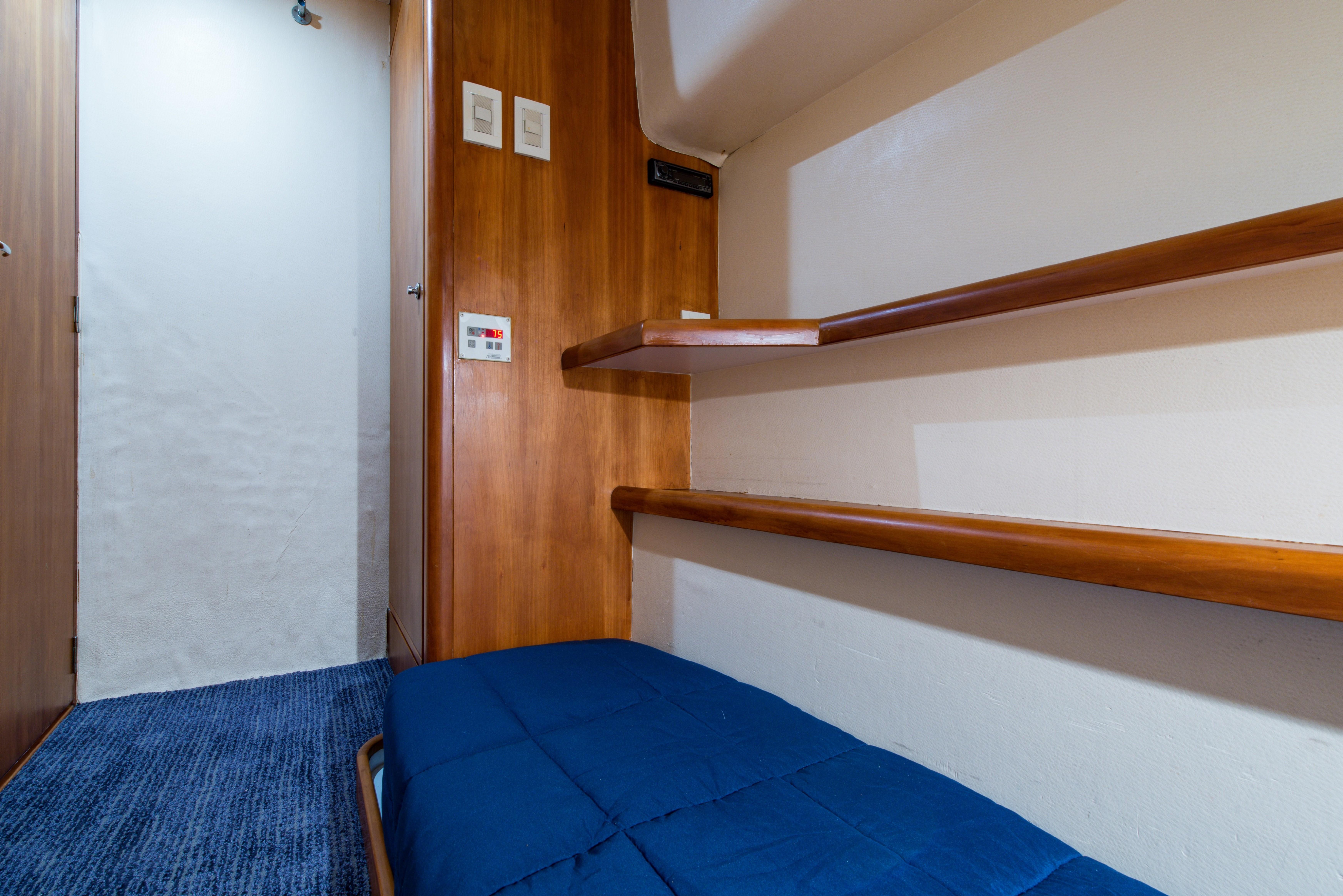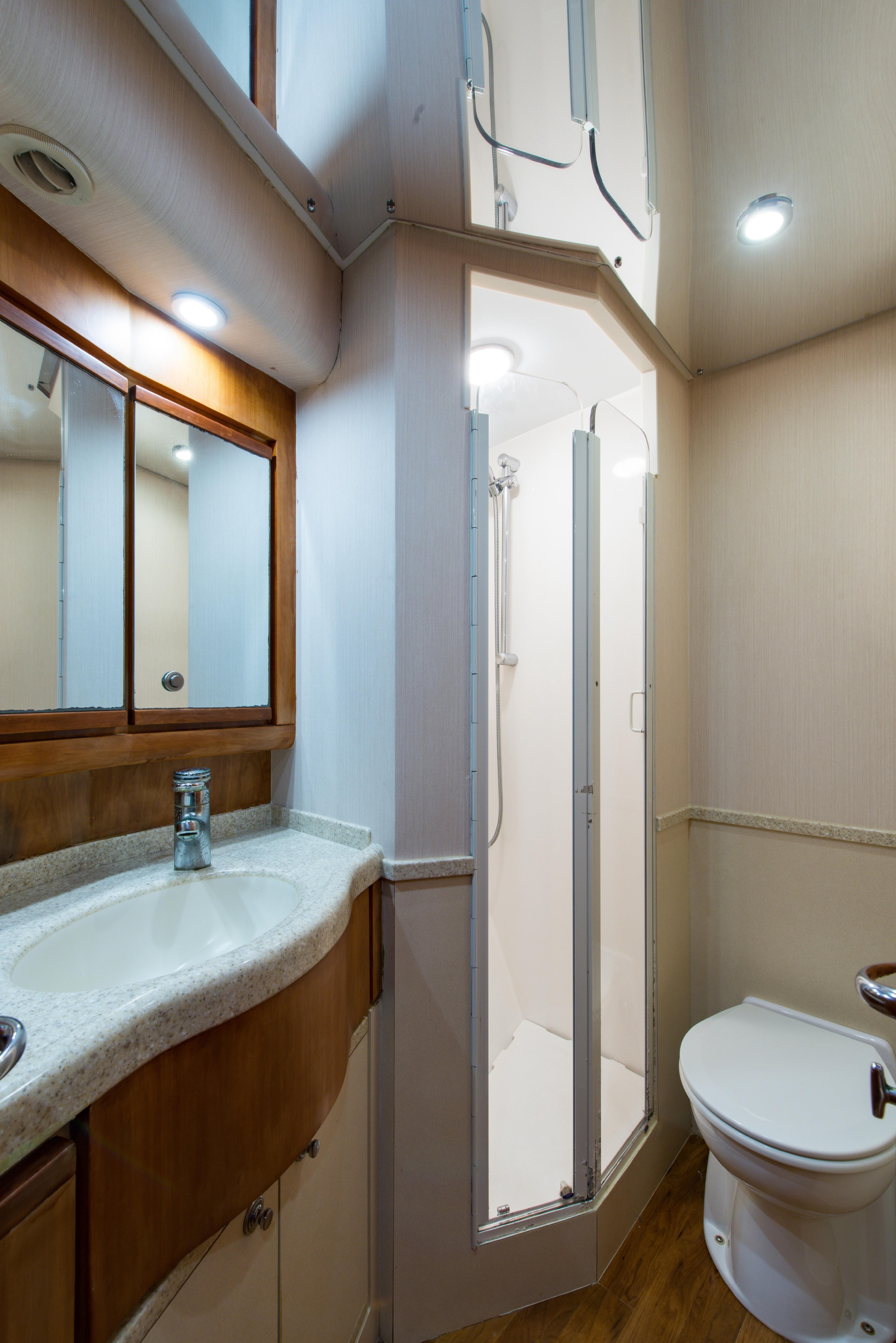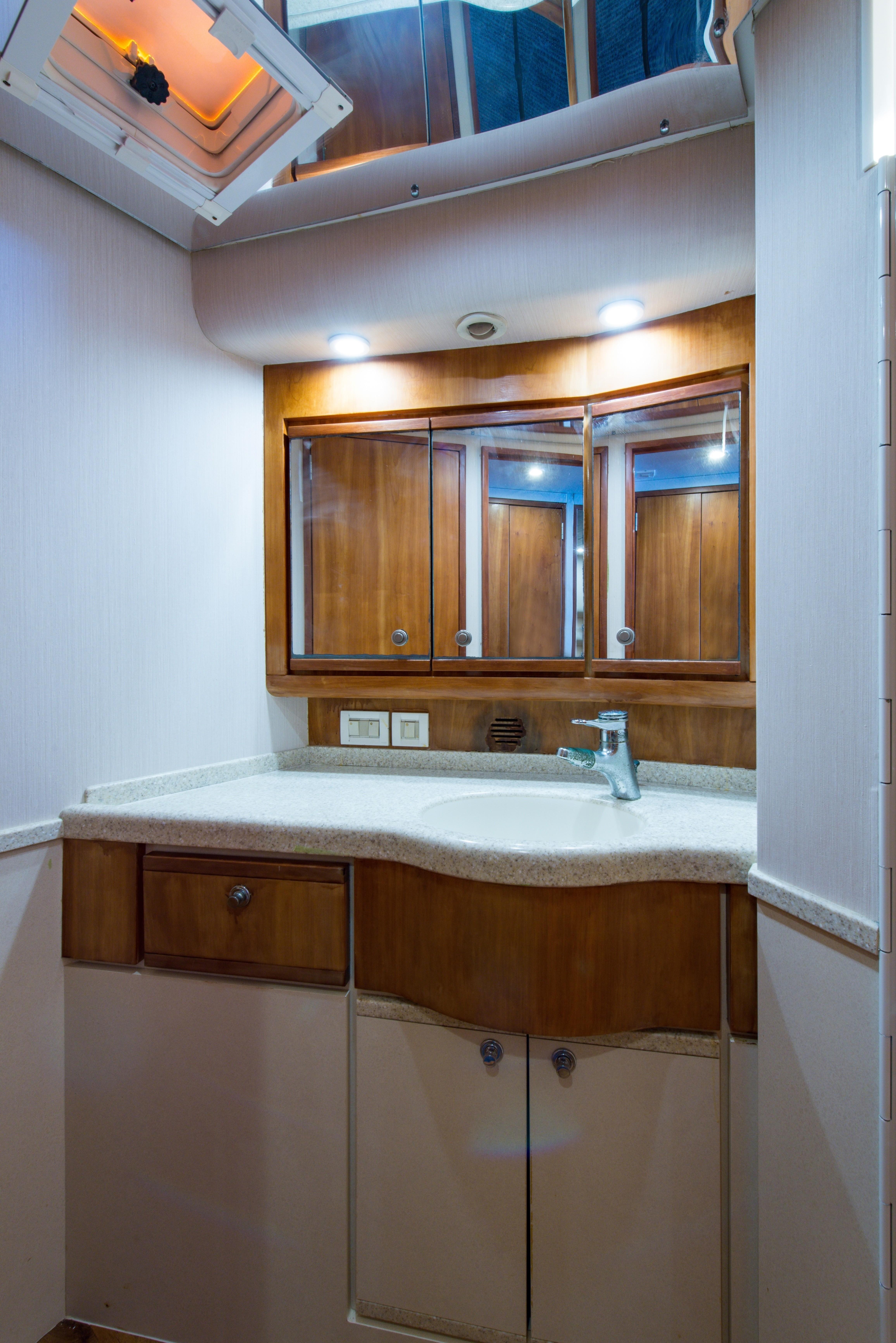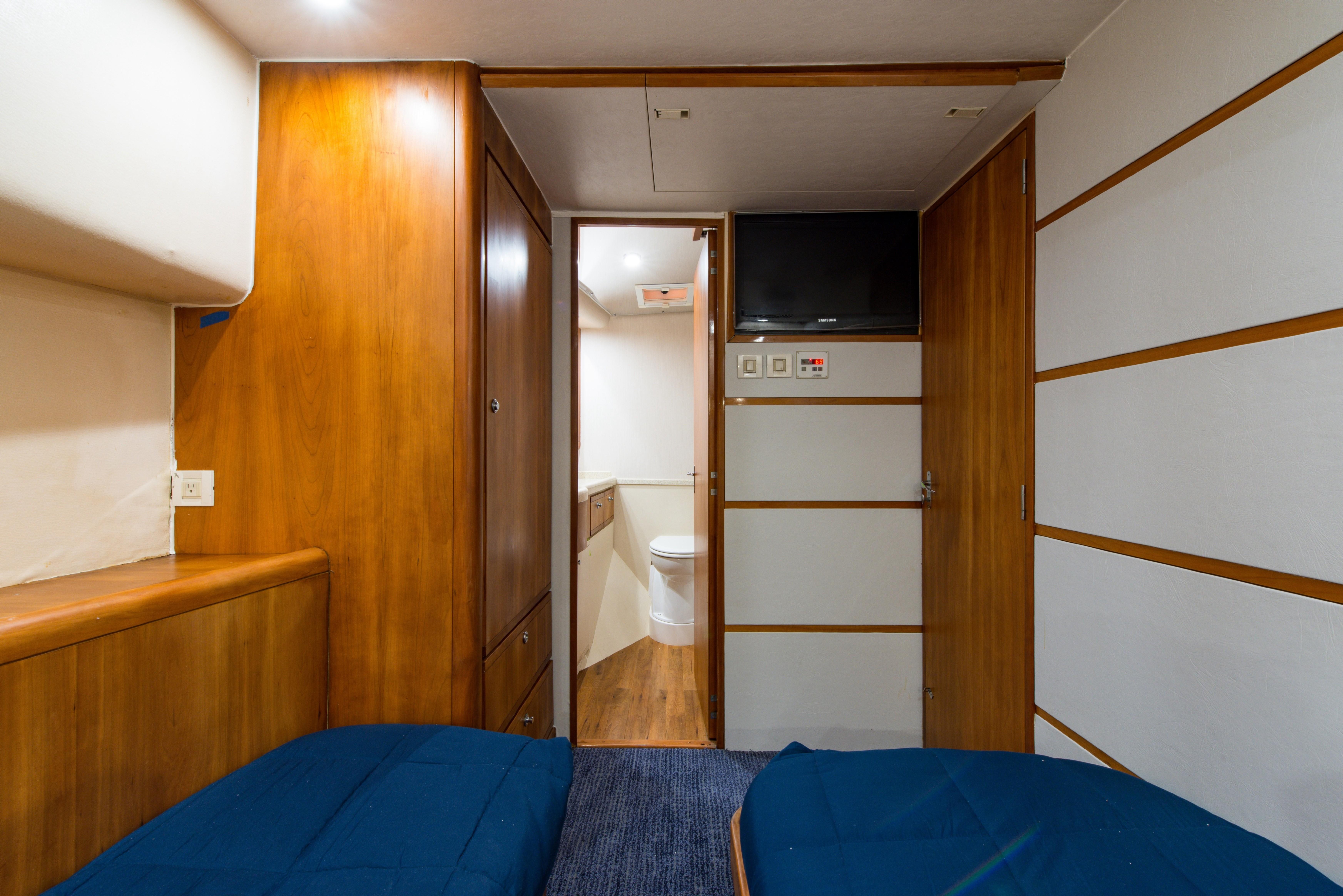 Whether fishing or cruising, the 510 provides a versatile platform that meets the demands of the most avid yachtsman. Her three stateroom cherry-wood interior features a well-appointed salon with lounge seating to port and entertainment center to starboard. A full service galley with Corian counters and SubZero refrigeration is forward to port. Like most convertibles in her class, the master stateroom is amidships, and the VIP queen stateroom is forward. Both guest staterooms share a common head and shower. Note the rod storage locker in the salon overhead.