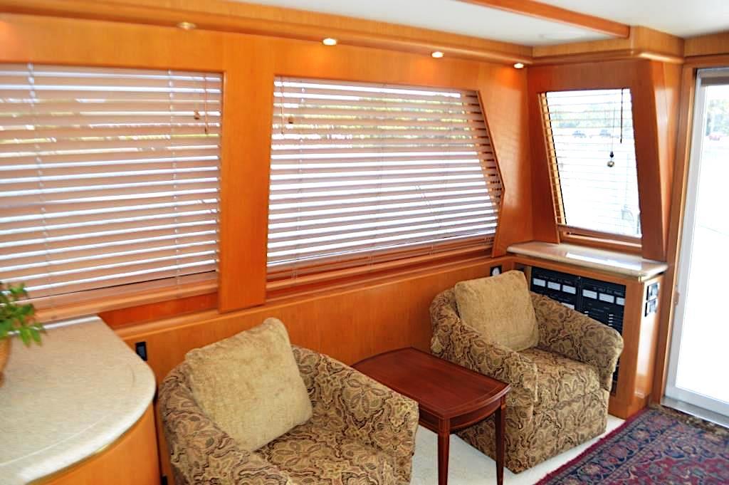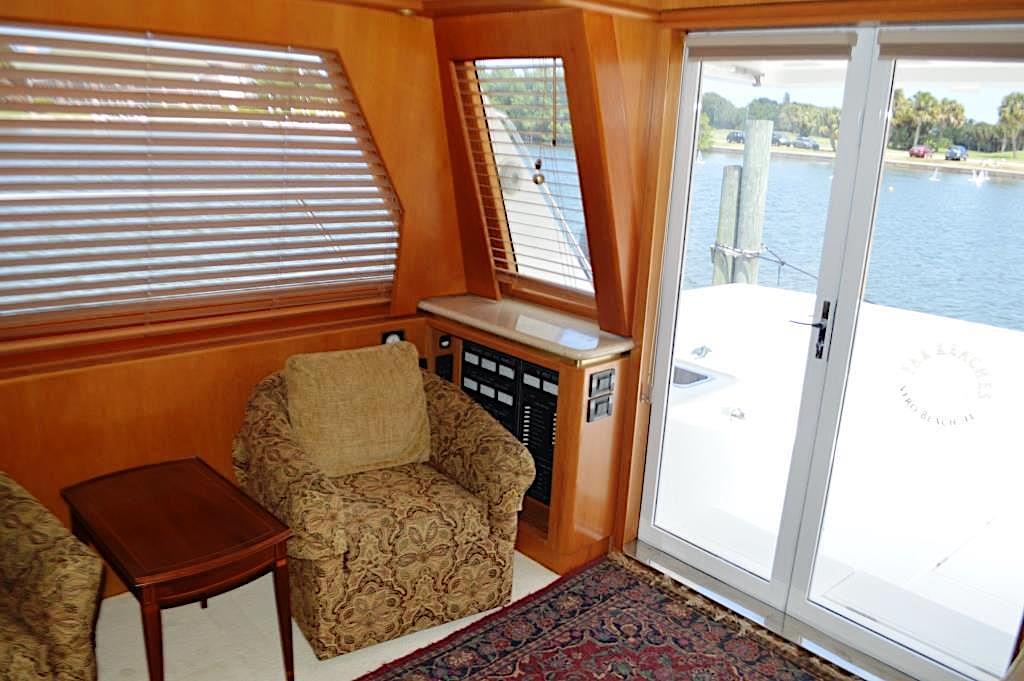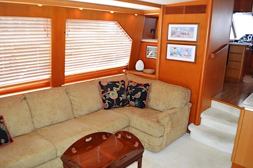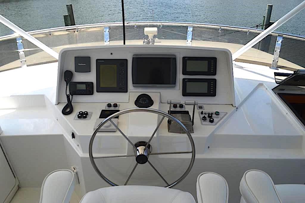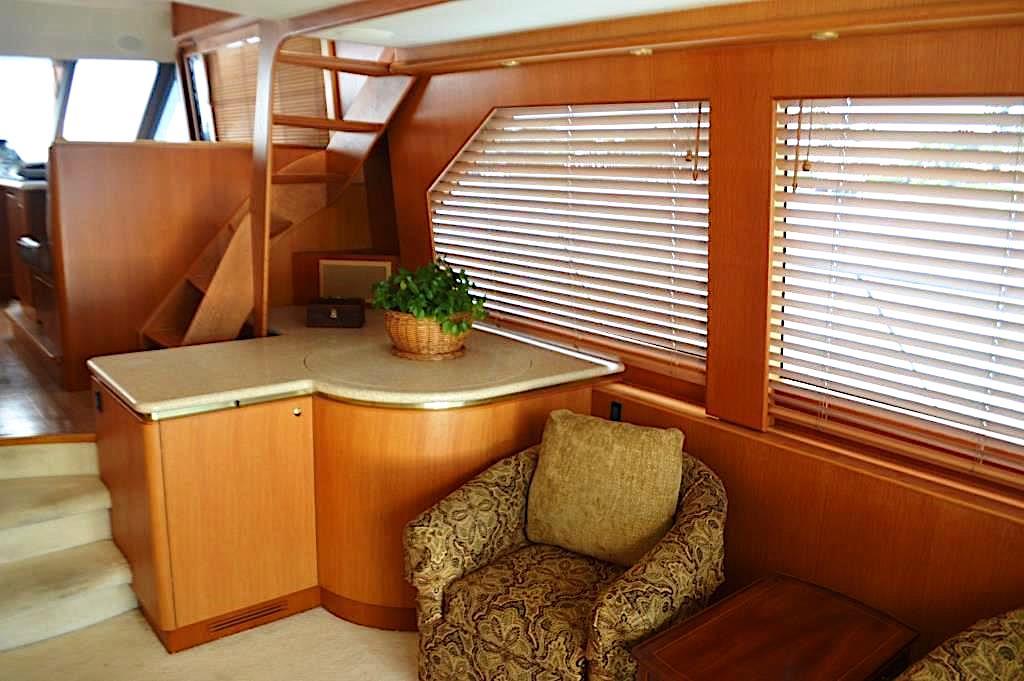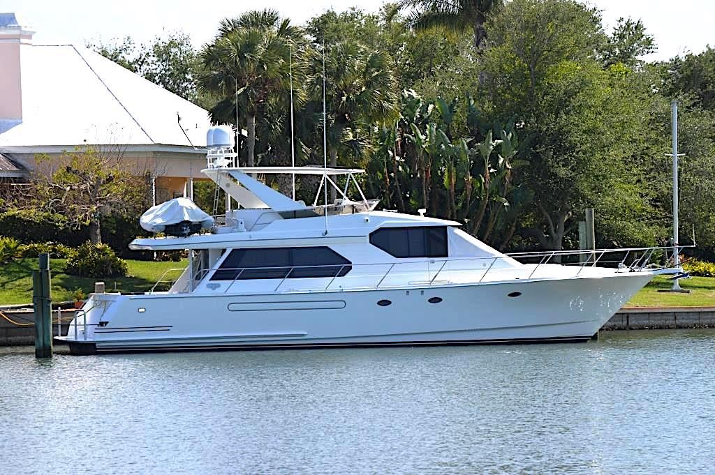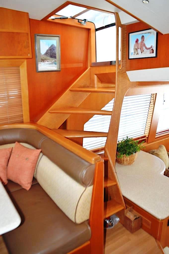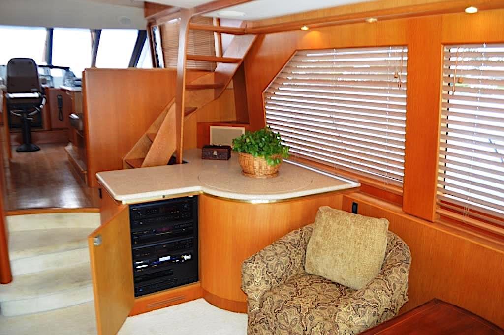 Highlights include a tasteful salon with U-shaped seating, two occasional chairs, and an entertainment center; a pilothouse designed with a full-service galley with dinette; a full-beam master stateroom with queen berth, queen VIP stateroom, and 3rd stateroom with over/under berth; and a standup engine room with easy cockpit access. There also is a large lazarette with spacious storage.