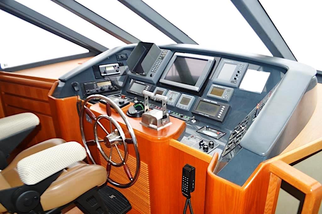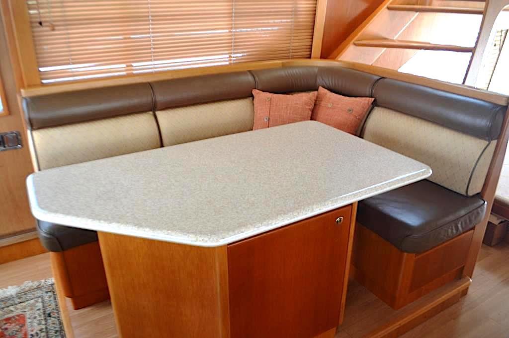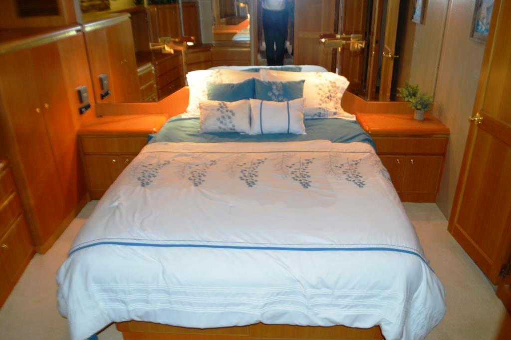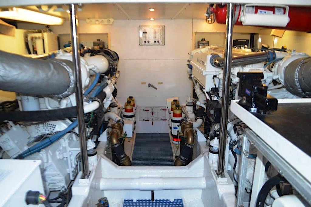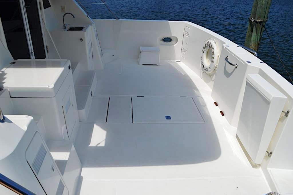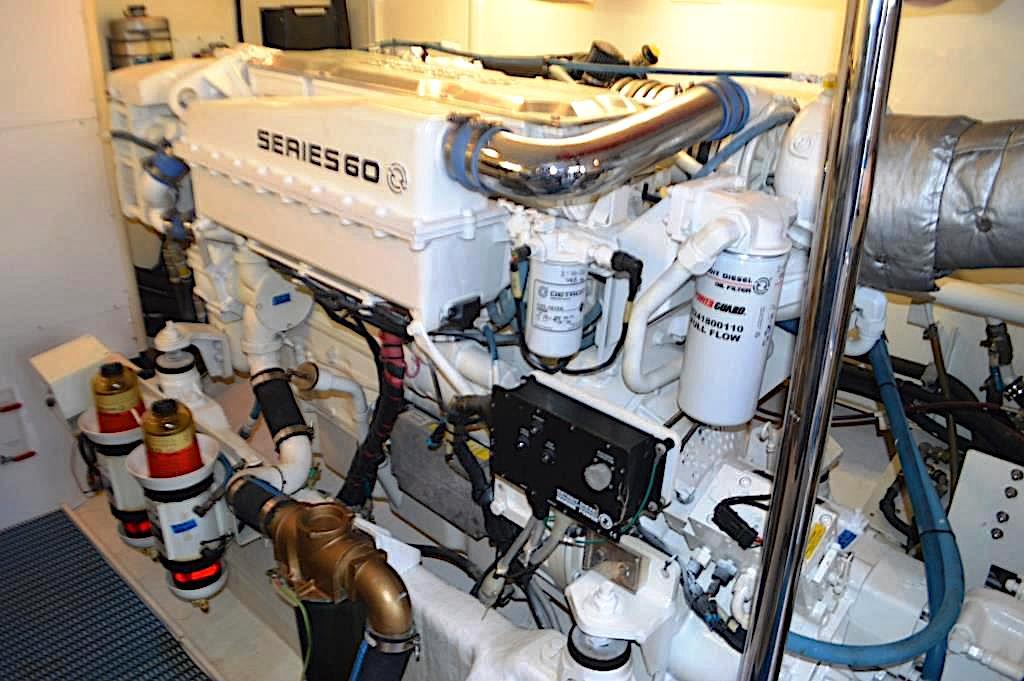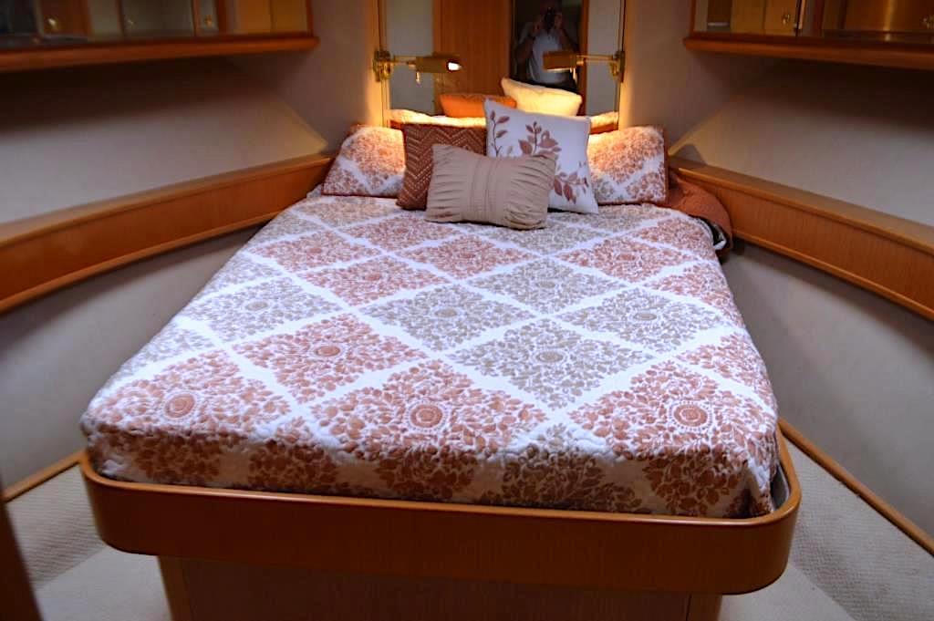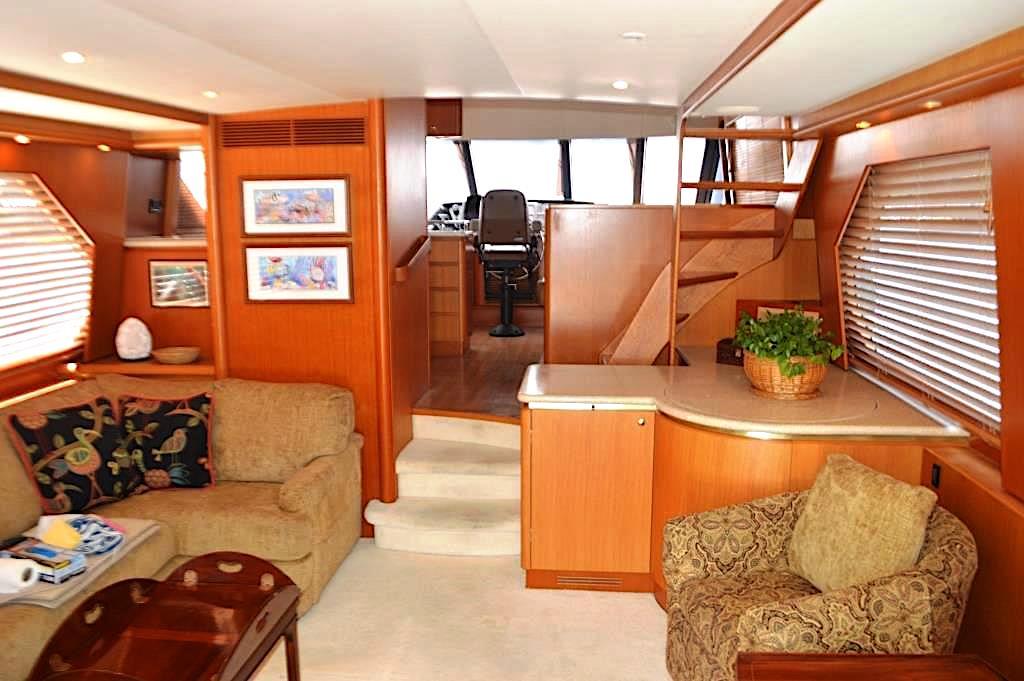Highlights include a tasteful salon with U-shaped seating, two occasional chairs, and an entertainment center; a pilothouse designed with a full-service galley with dinette; a full-beam master stateroom with queen berth, queen VIP stateroom, and 3rd stateroom with over/under berth; and a standup engine room with easy cockpit access. There also is a large lazarette with spacious storage.
