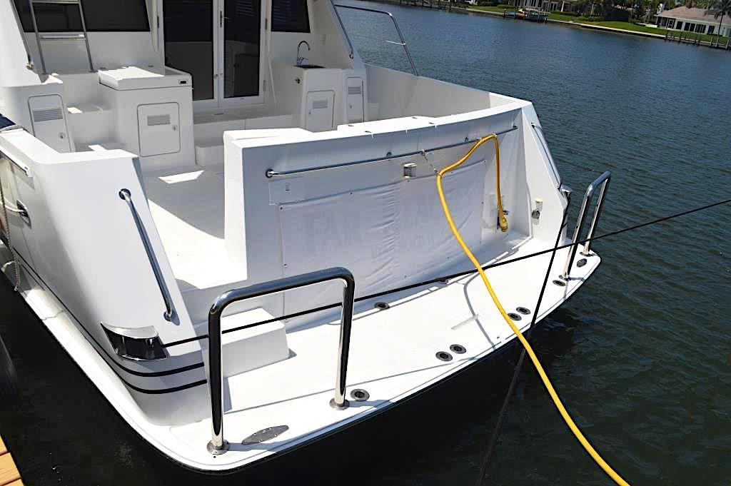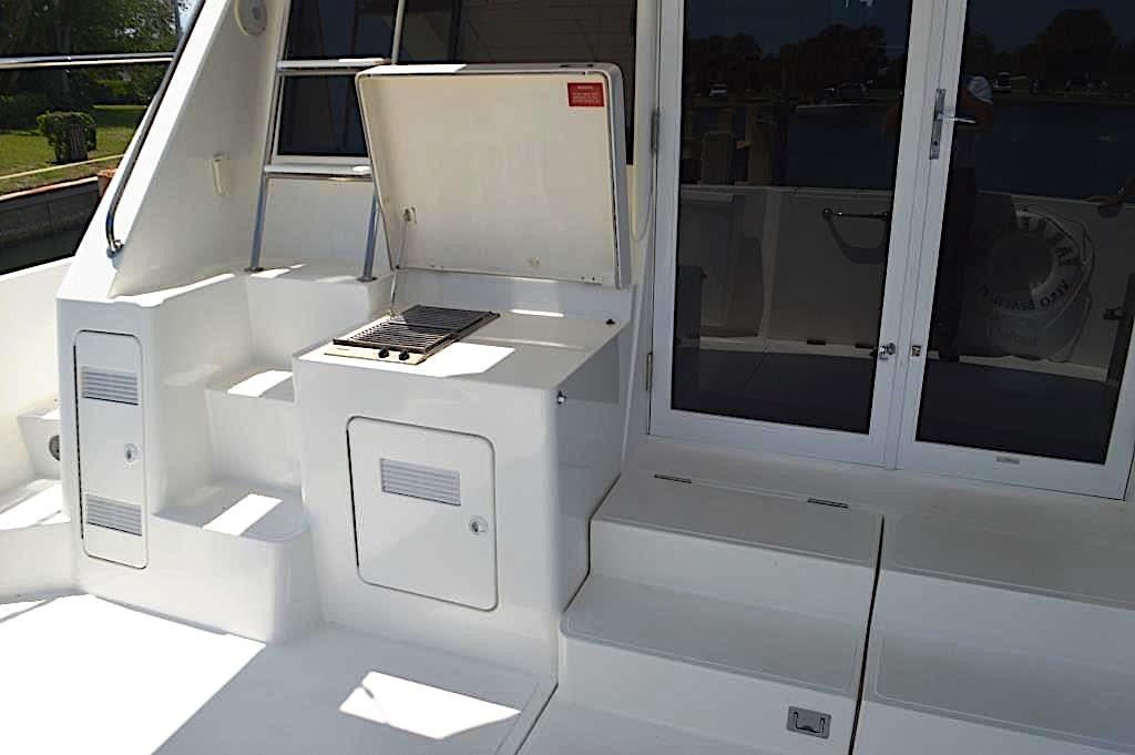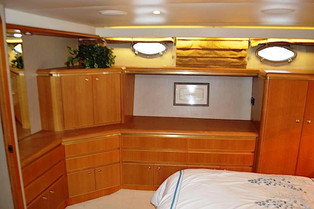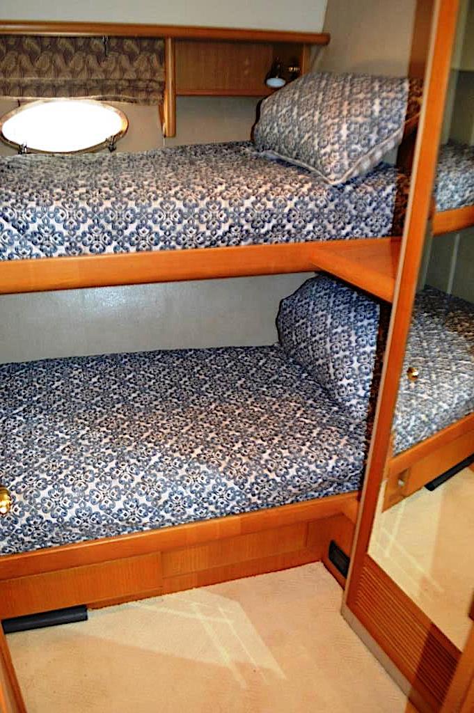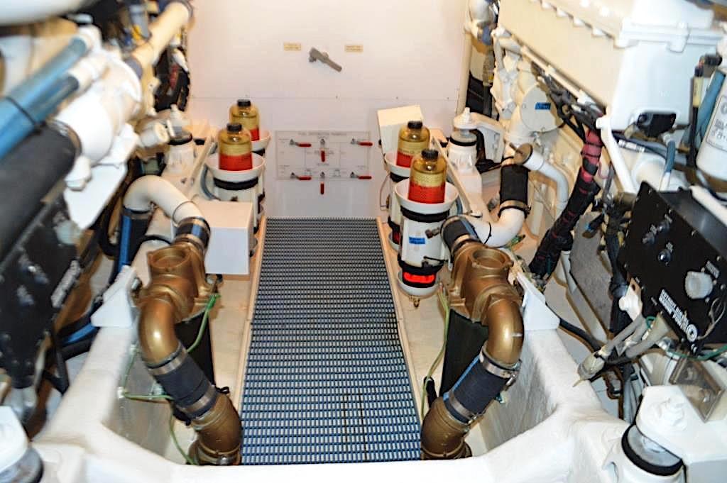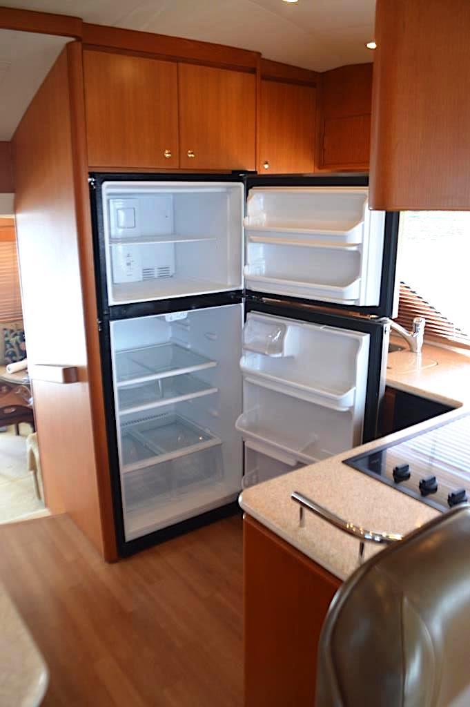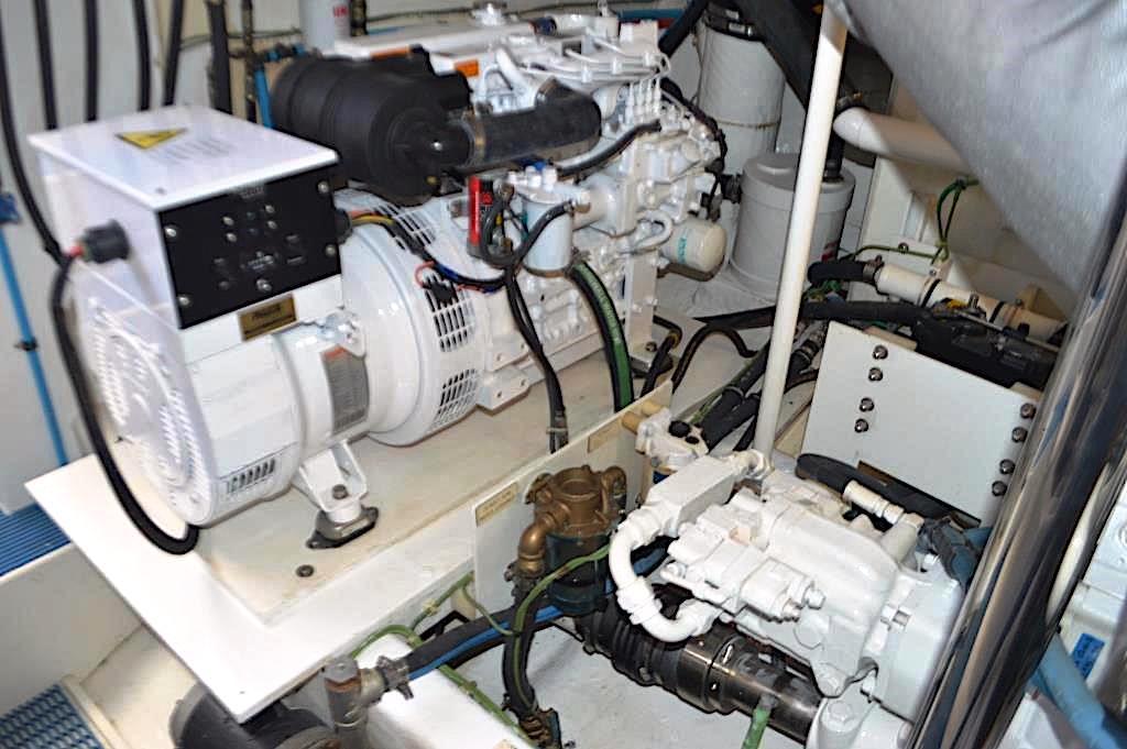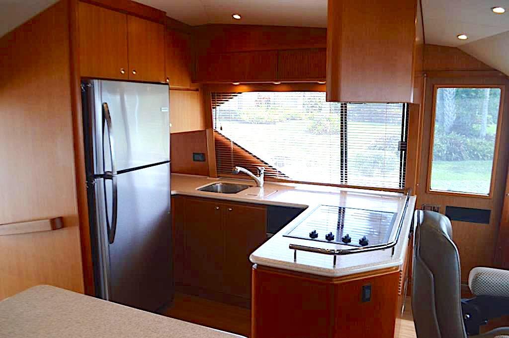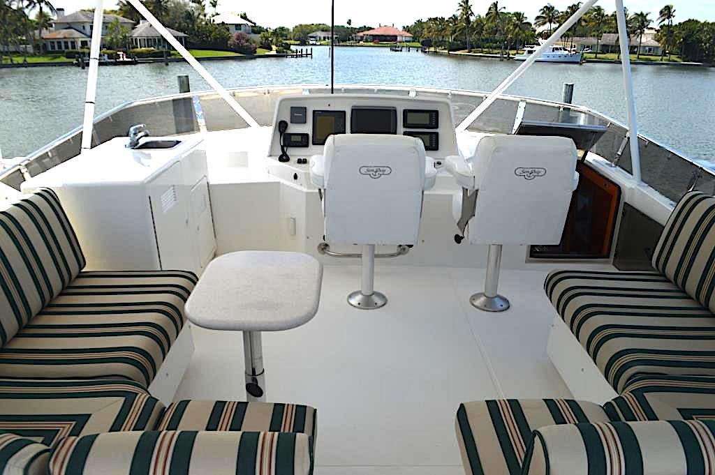 Highlights include a tasteful salon with U-shaped seating, two occasional chairs, and an entertainment center; a pilothouse designed with a full-service galley with dinette; a full-beam master stateroom with queen berth, queen VIP stateroom, and 3rd stateroom with over/under berth; and a standup engine room with easy cockpit access. There also is a large lazarette with spacious storage.