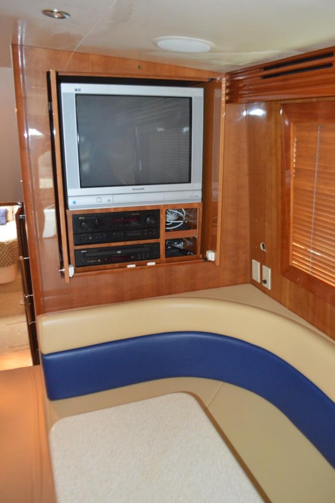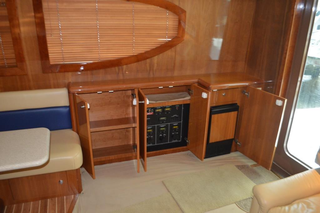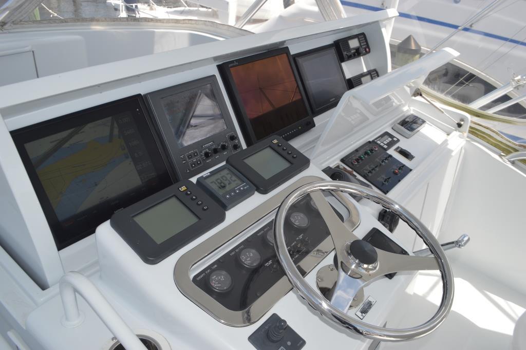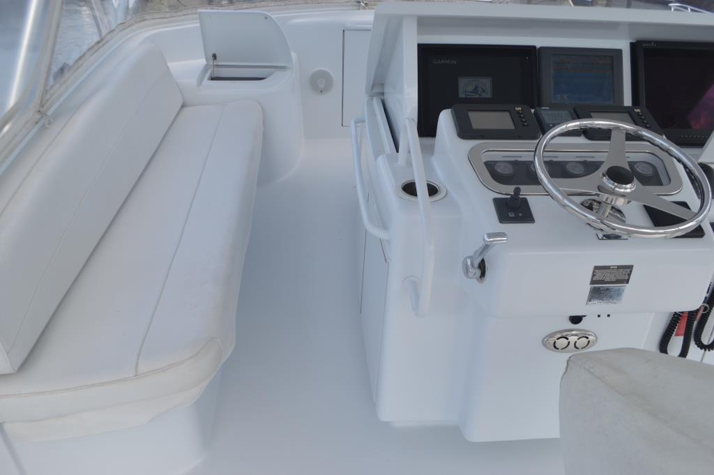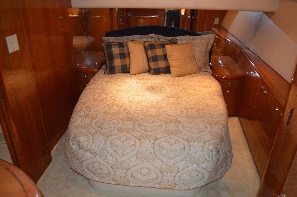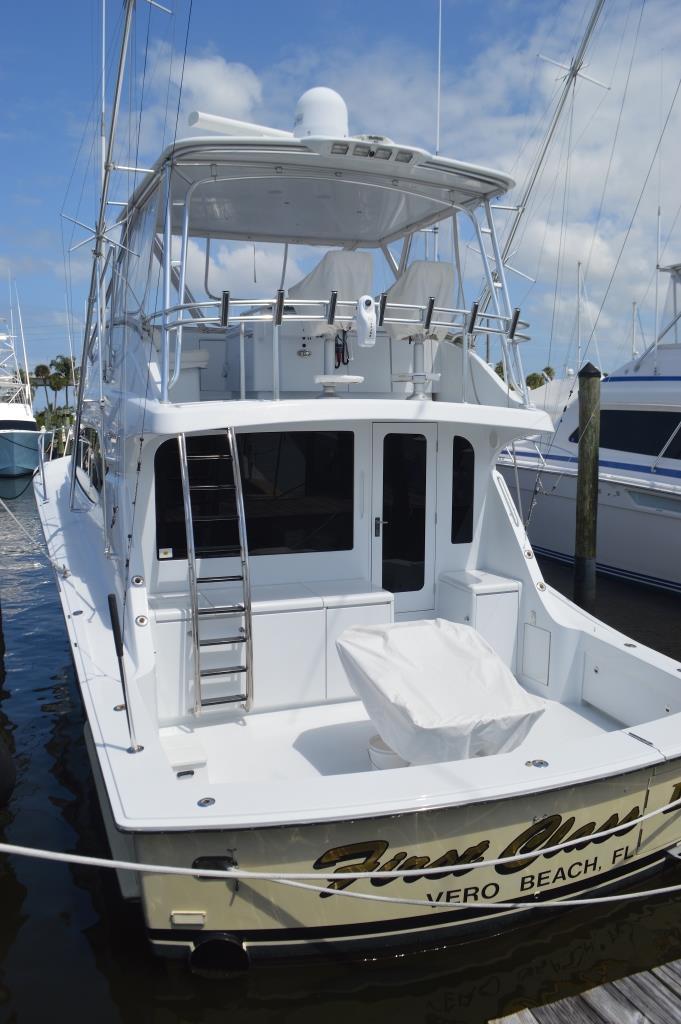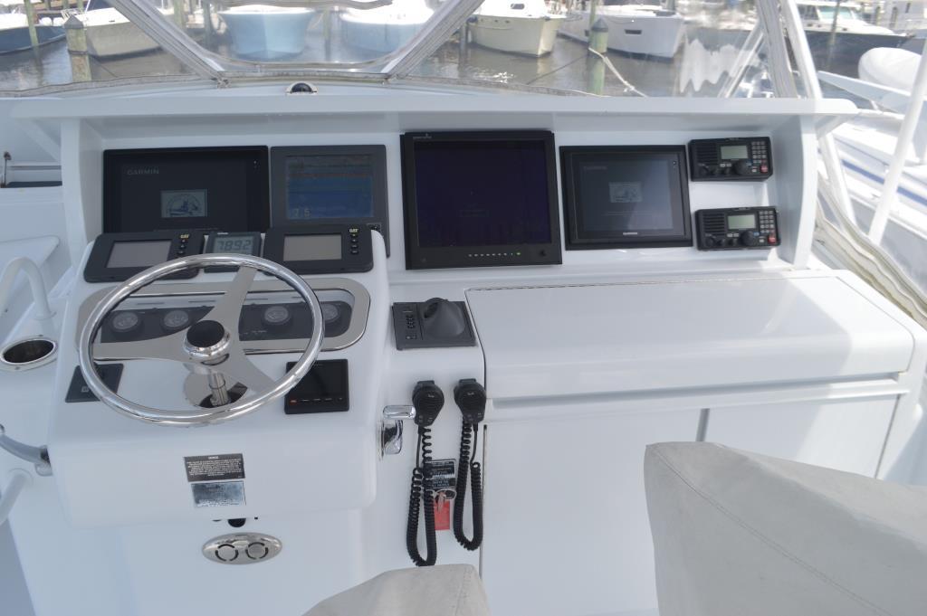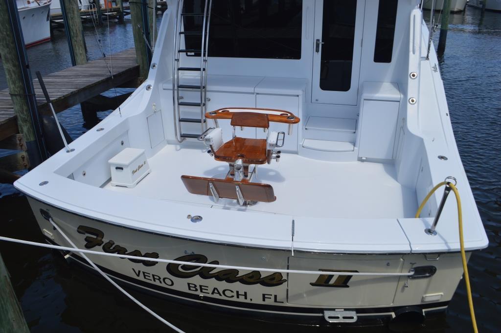 FIRST CLASS II is the new design from Hatteras Yachts: Sleek and good looking with shallow keel, propeller pockets to reduce shaft angle, and comfortable ride. The interior is a classic galley-up forward design with dinette on the starboard side and is meticulously finished with high gloss cherry woodwork. Below are three excellent staterooms. The Master offers a walk-around queen berth with storage beneath and an ensuite head/shower; the VIP is forward and features a center line queen with storage beneath as well as a private entrance to the second head/shower; the third stateroom is fitted with twin lower berths. The cockpit is a spacious 150-square-feet, incorporating a large fighting chair and all necessary equipment for serious fishing. The fly bridge is equally as large, designed with helm & companion chairs, a retractable electronics console, and two bench seats with storage.