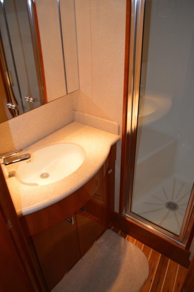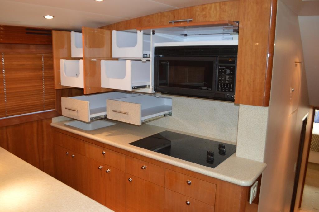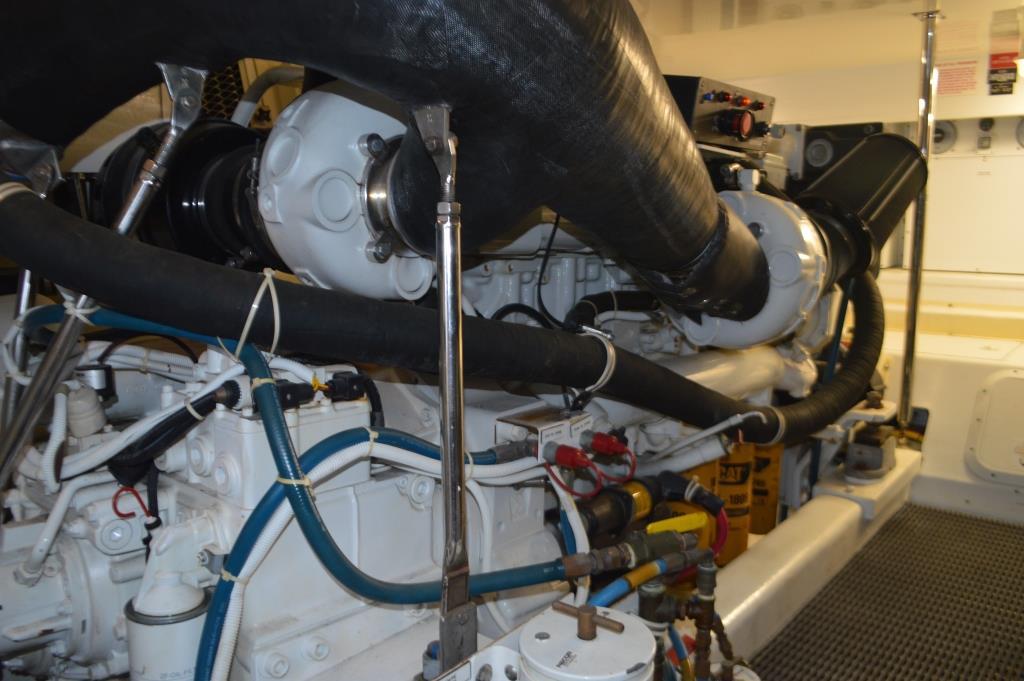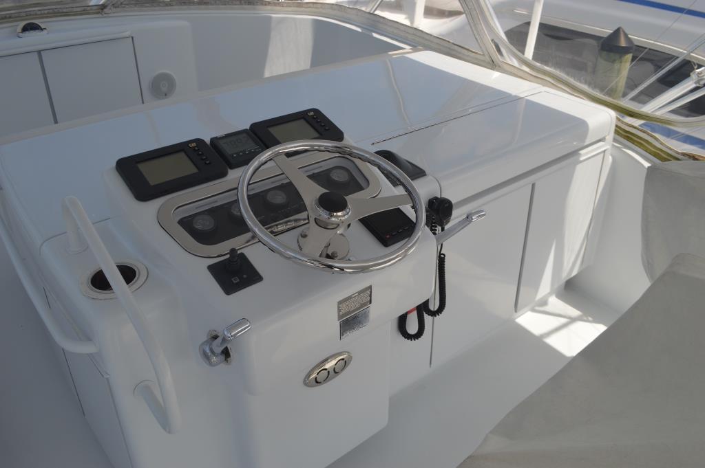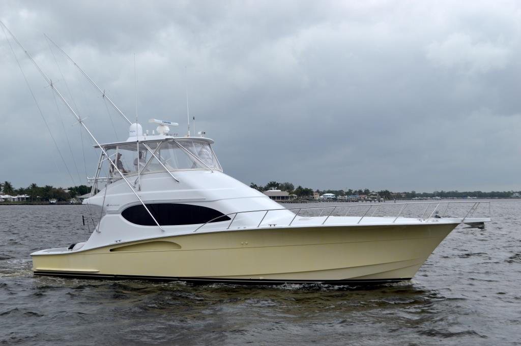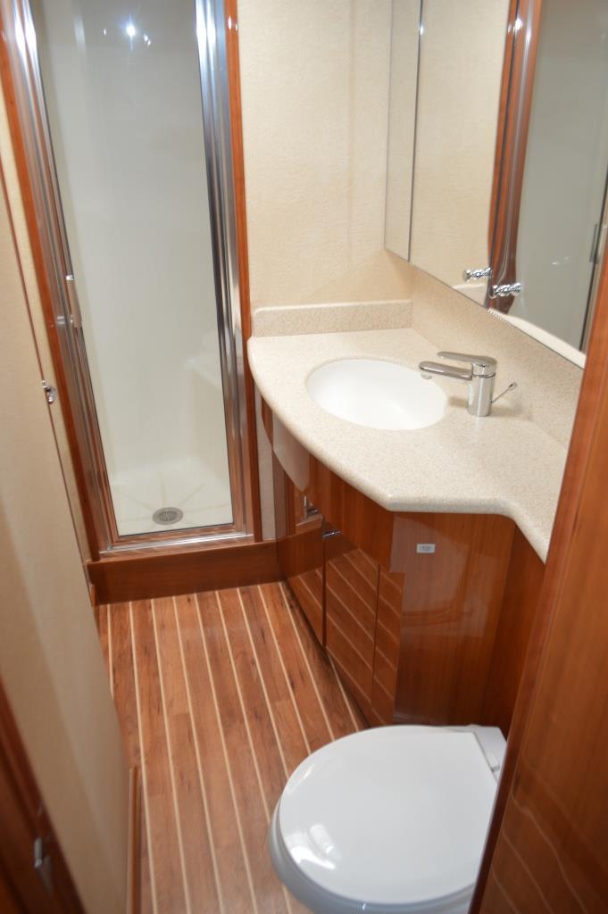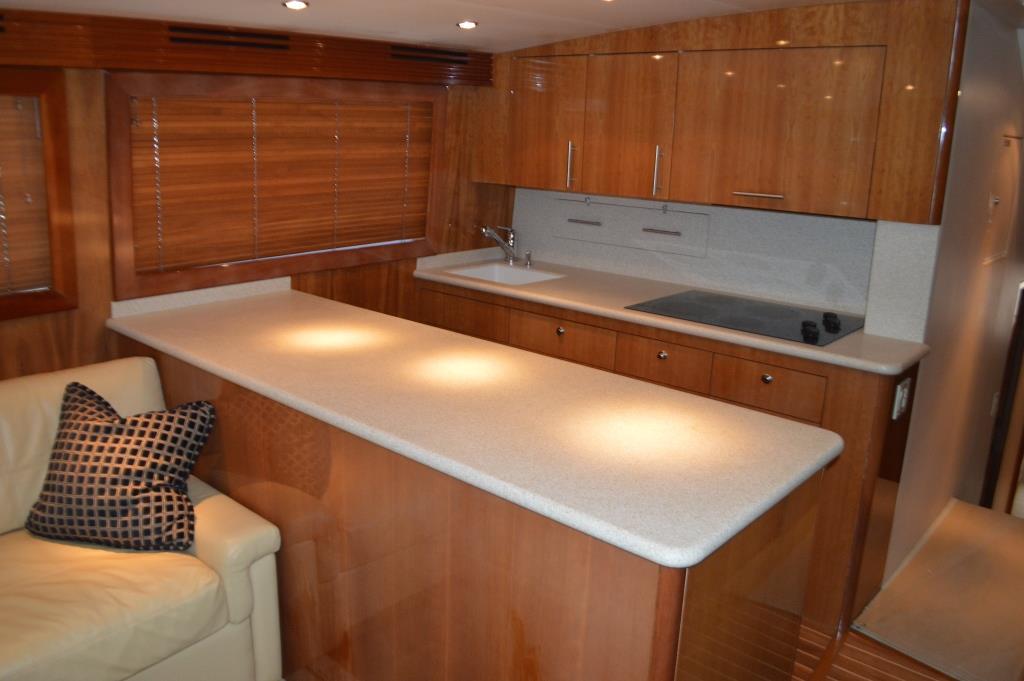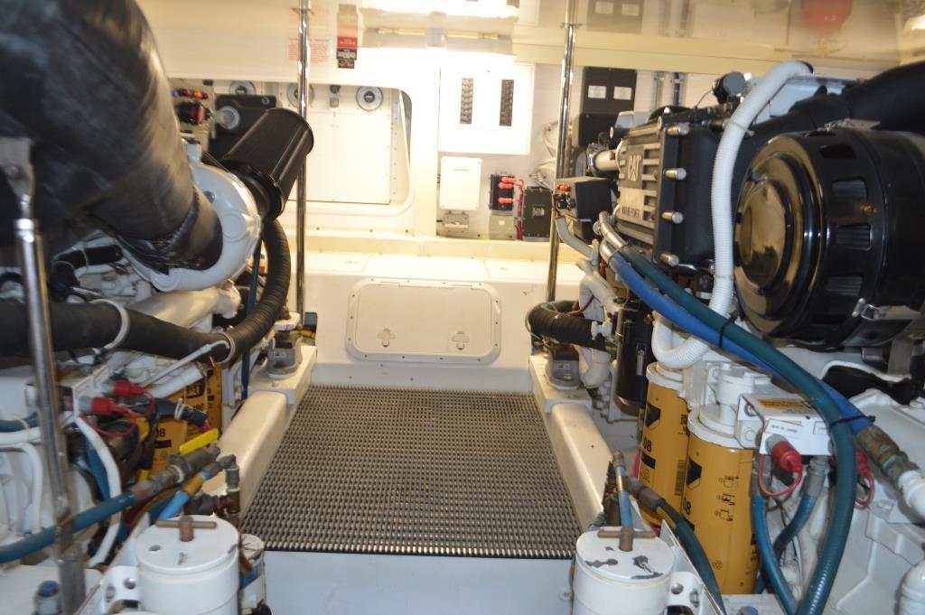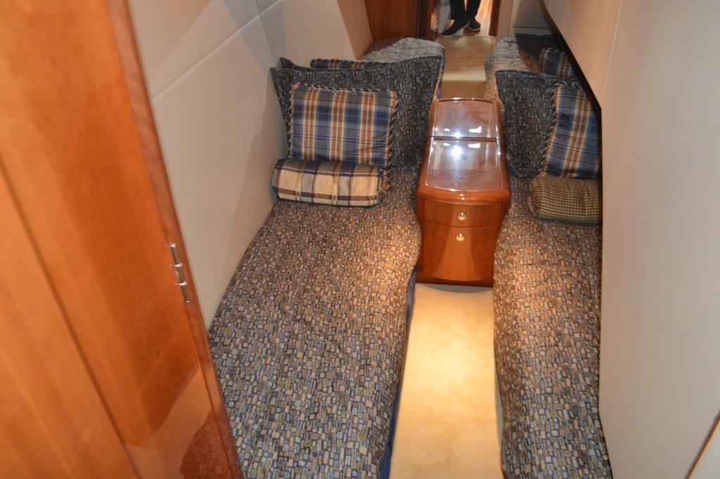 FIRST CLASS II is the new design from Hatteras Yachts: Sleek and good looking with shallow keel, propeller pockets to reduce shaft angle, and comfortable ride. The interior is a classic galley-up forward design with dinette on the starboard side and is meticulously finished with high gloss cherry woodwork. Below are three excellent staterooms. The Master offers a walk-around queen berth with storage beneath and an ensuite head/shower; the VIP is forward and features a center line queen with storage beneath as well as a private entrance to the second head/shower; the third stateroom is fitted with twin lower berths. The cockpit is a spacious 150-square-feet, incorporating a large fighting chair and all necessary equipment for serious fishing. The fly bridge is equally as large, designed with helm & companion chairs, a retractable electronics console, and two bench seats with storage.