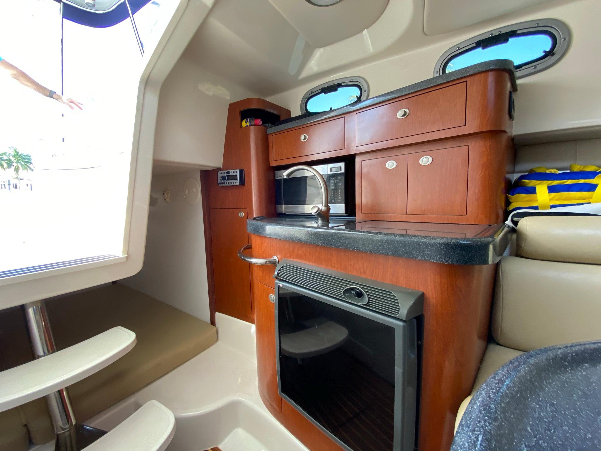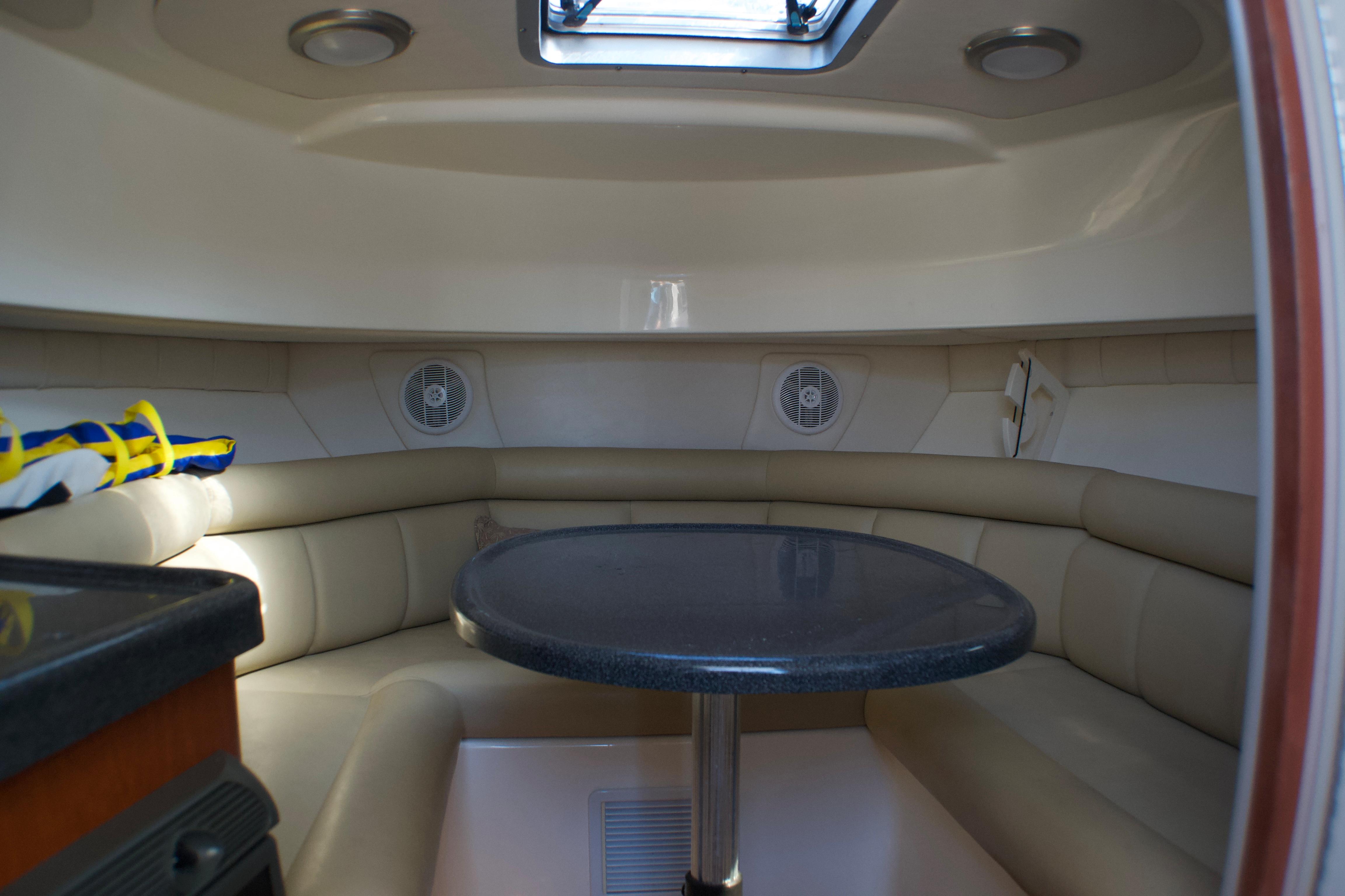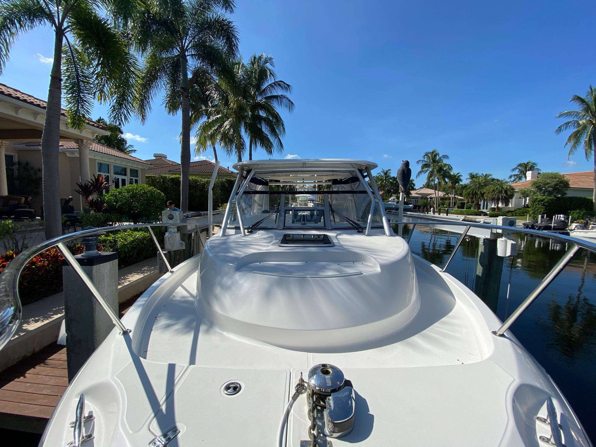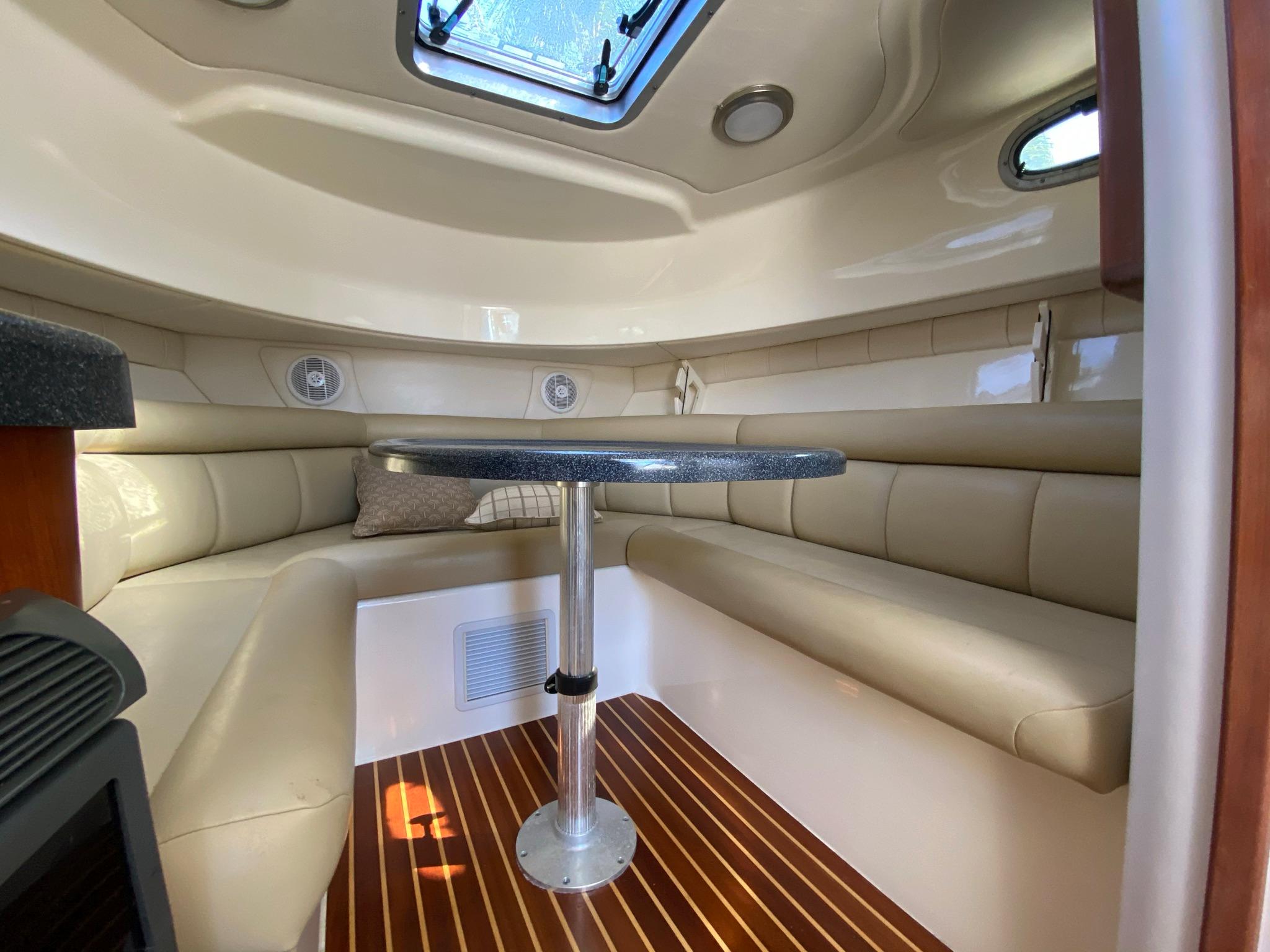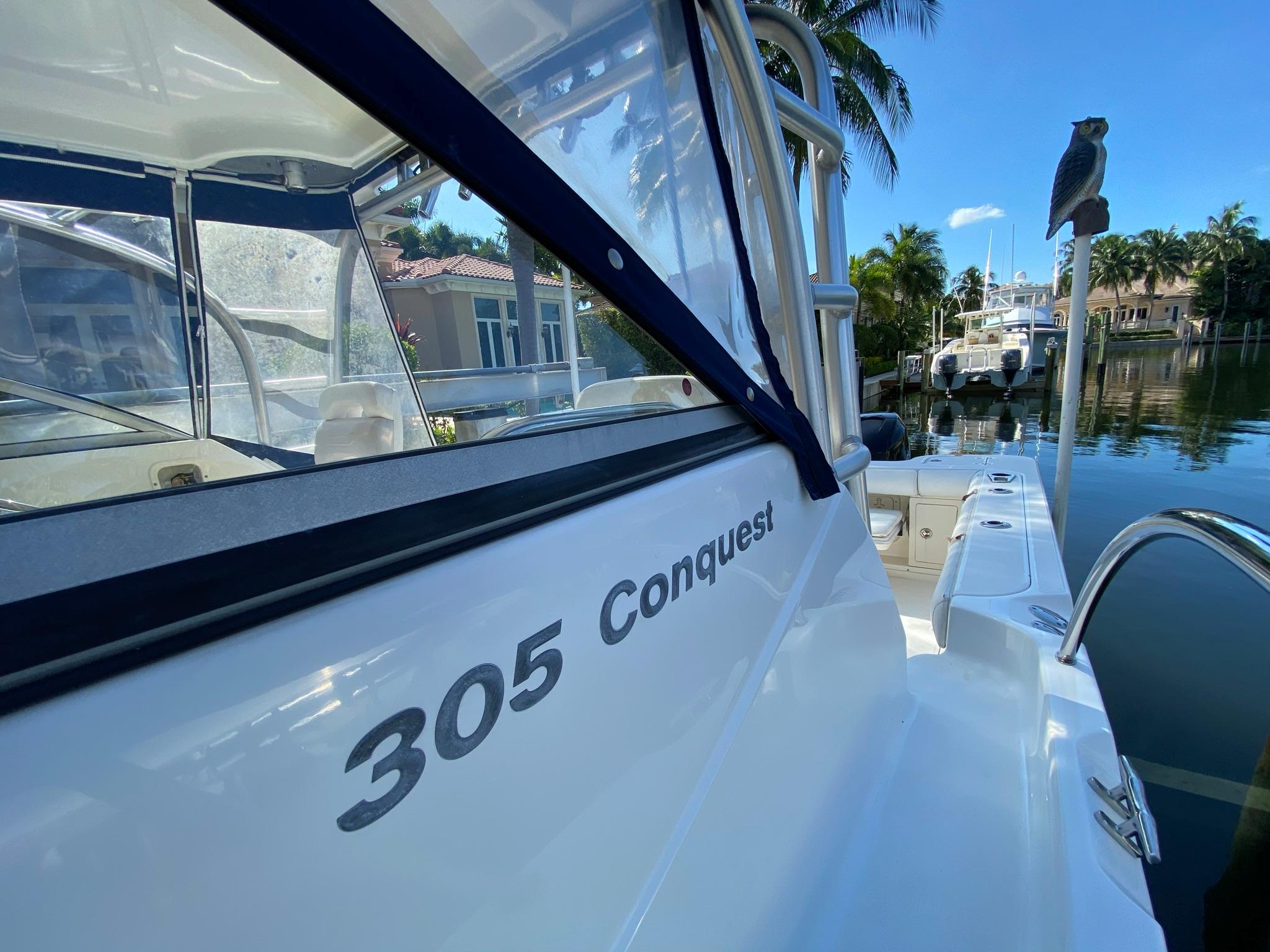 This is the perfect 2006 Boston Whaler Conquest with only 300 hours on the engines! She is practically new for the price of a preowned. This Conquest is a top-of-the-line express with over 60 ft.² of cockpit space and a versatile layout to make her the ideal boat for fishing cruising or entertaining. At the helm you will find a captains chair elevated to provide a clear 360° view of the water and to the left there is a spacious bench seat perfect for lounging while underway. The spacious cabin interior sleeps four and includes a full galley with Corian countertops. The dinette table in the center of the V-birth drops down to create a second full-size bed. To complete the total comfort of this cabin is a full sized head and shower, everything needed for a weekend on the water. Overall, this Boston Whaler 305 Conquest is clean, fun and ready to “tackle” all your boating desires.