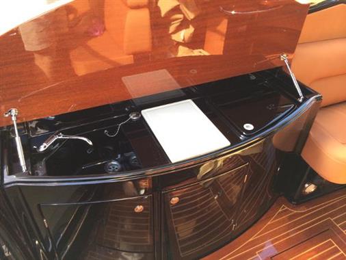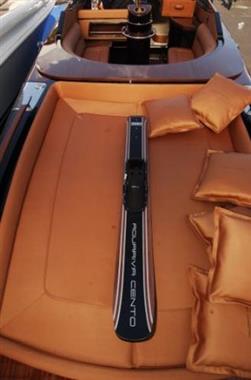 The Aquariva Cento, limited edition realized by Riva to celebrate the production of the 100th unit of the Aquariva, portrays Riva's natural style evolution from past to present exalting the pleasure of boating in a timeless classic offering unique, incomparable comfort and emotion. The soft, elegant lines of the 33 foot Aquariva Cento exude tradition, whilst still managing to be highly innovative. The valuable, skilfully carpentered woods of the deck (mahogany with maple inlay), are also used for the walking surfaces. Even the hood-cover hatch and upper parts of the side lockers are mahogany. The ivory and orange fabrics used below deck perfectly match the valuable dash-board and rudder upholstery leathers with elegant mechanical finishing, the skipper's seat has a convenient headrest and a useful storage compartment is situated to the rear of the backrest. Even the metallic black hull was specially chosen for this limited edition. Lastly, the innovative, electronically-controlled, two speed gearbox brings out all the passion and power of the two 380 horsepower Yanmar engines, resulting in an exceptional performance (top speed of 42 knots, and a cruising speed of 36).