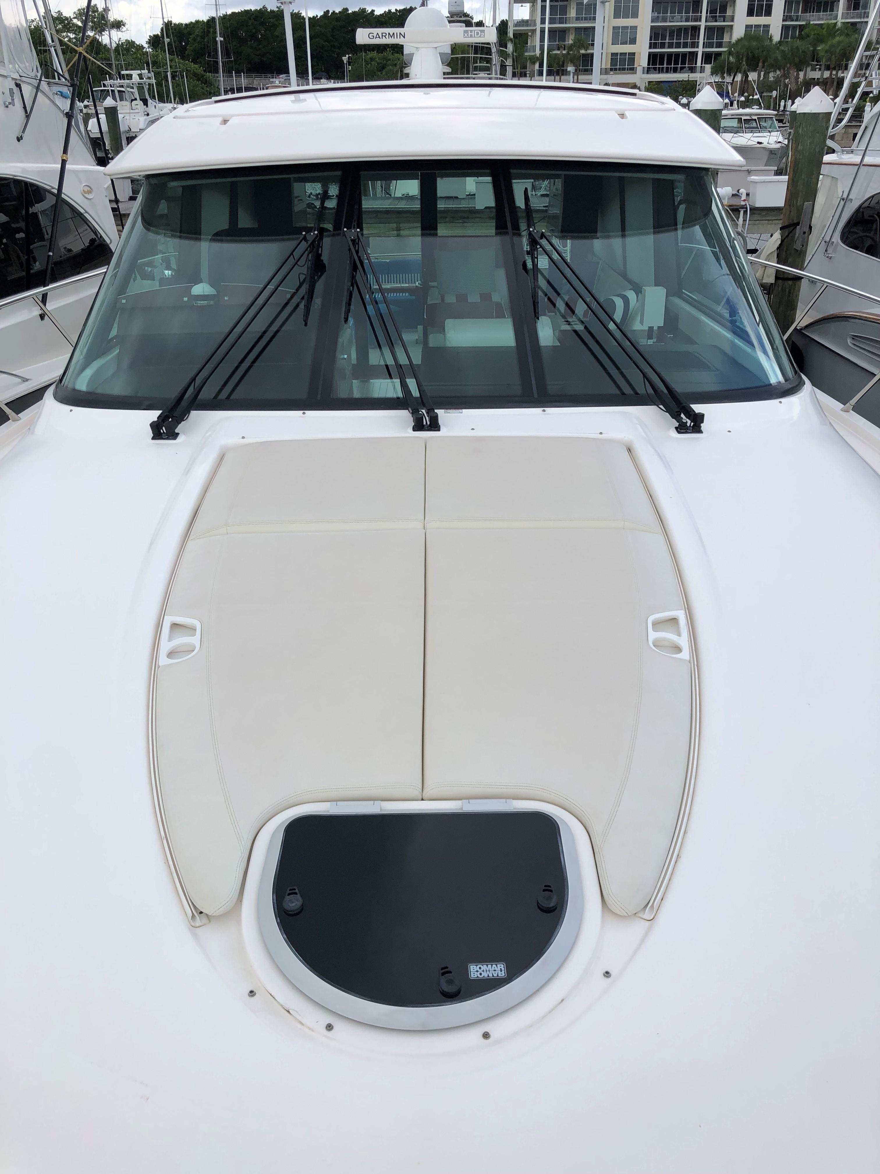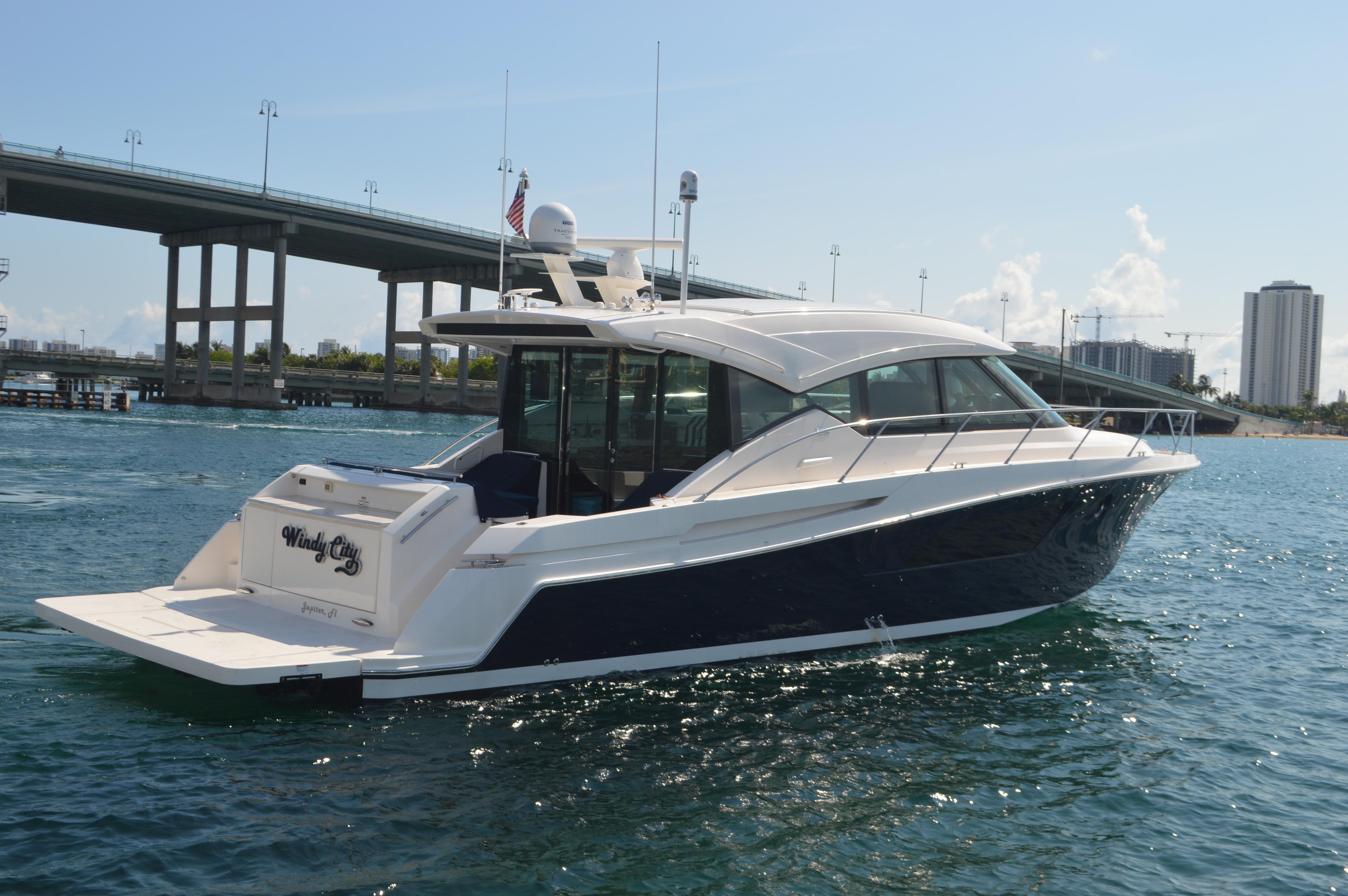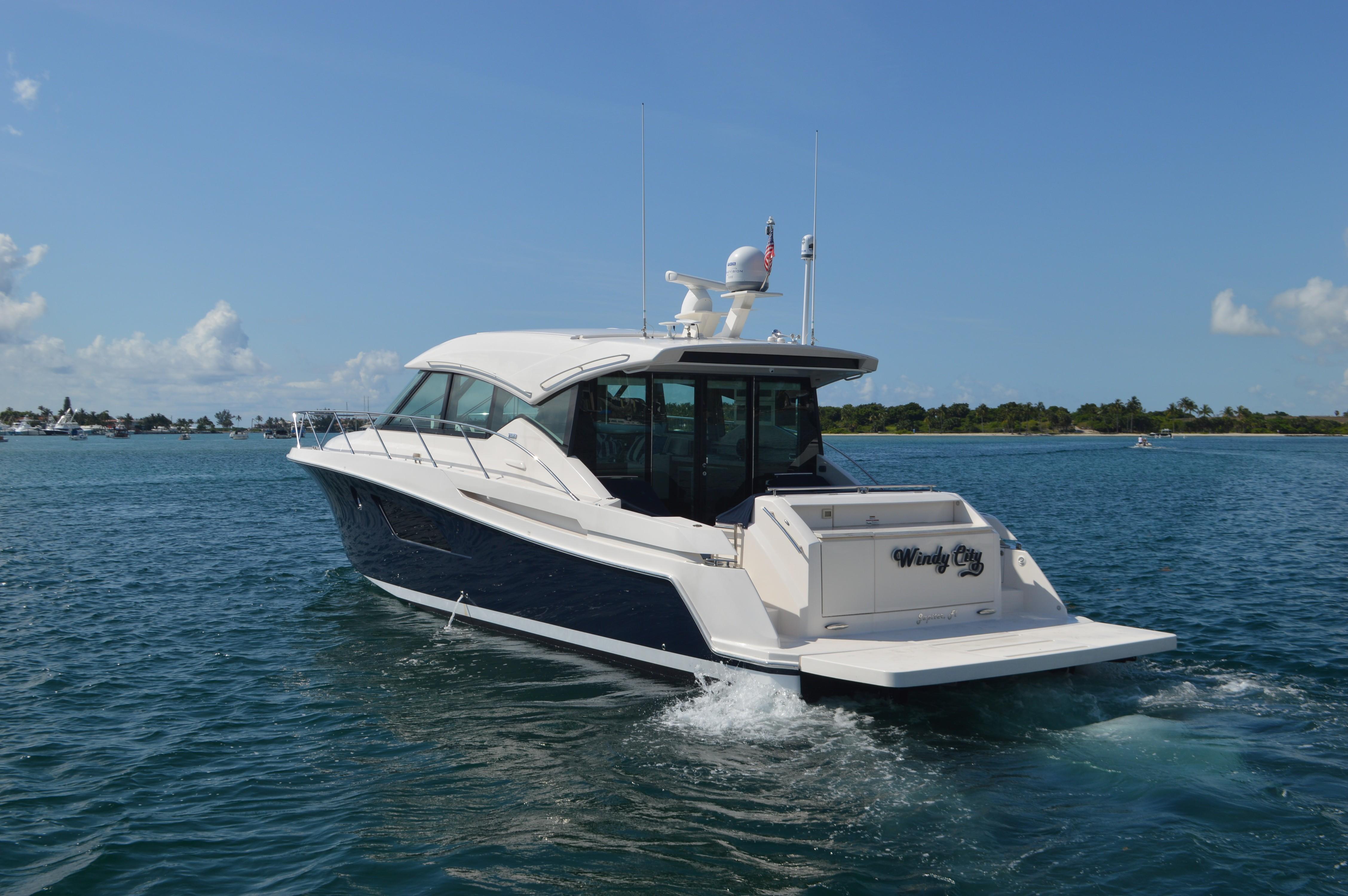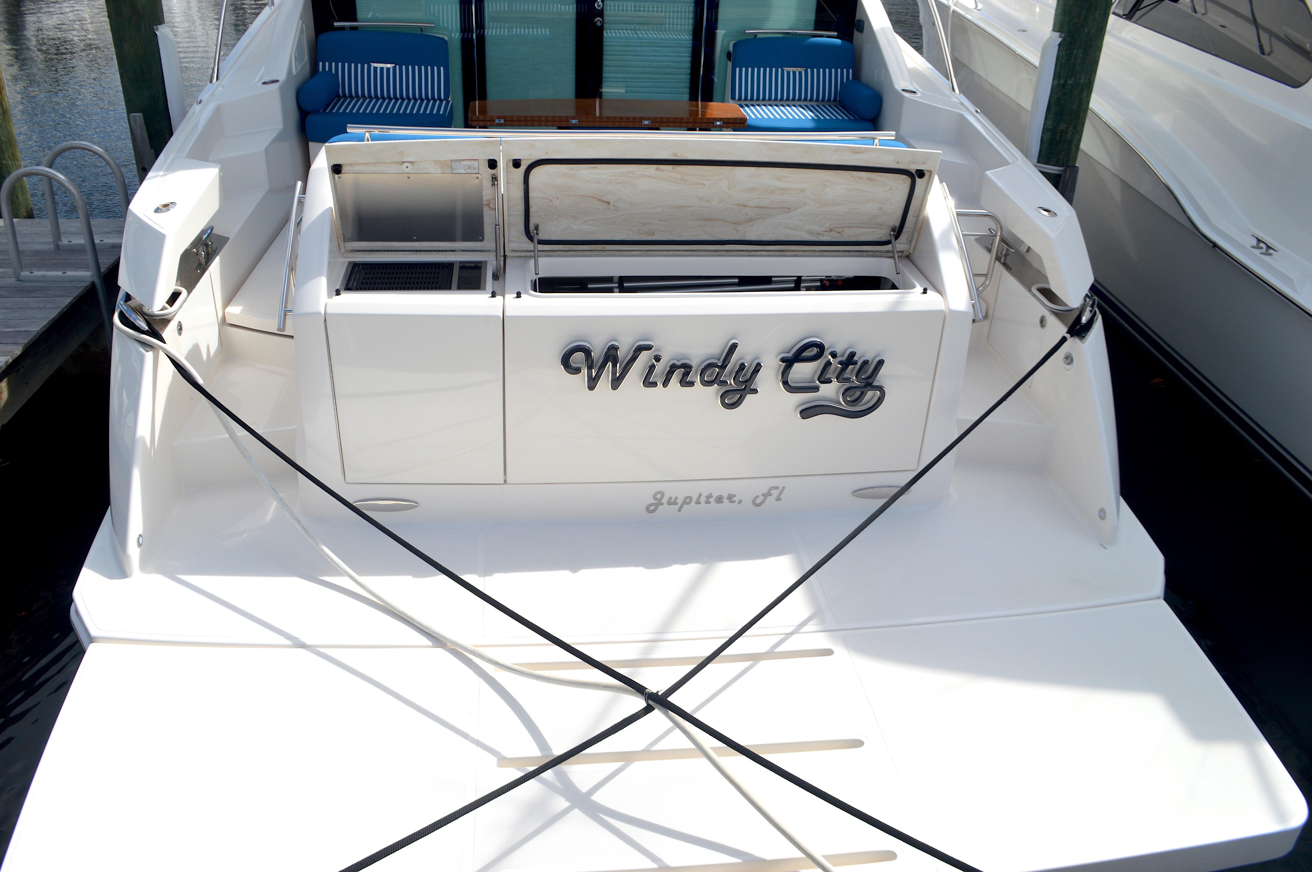 WINDY CITY features a SeaKeep 9 Gyro stabilizer, Garmin Electronics, Hydraulic 70" Swim Platform, hydraulic powered sunroof, joystick docking controls, electric aft cockpit sunshade, custom navy blue hull color and engine room / salon camera systems. Low hour Volvo Penta IPS 950, 725 hp diesel engines allow a fast and efficient 27 knots cruising speed. The Volvo joystick control provides easy docking and maneuverability not found in other yachts. WINDY CITY is an excellent example of Tiara quality and technology!
