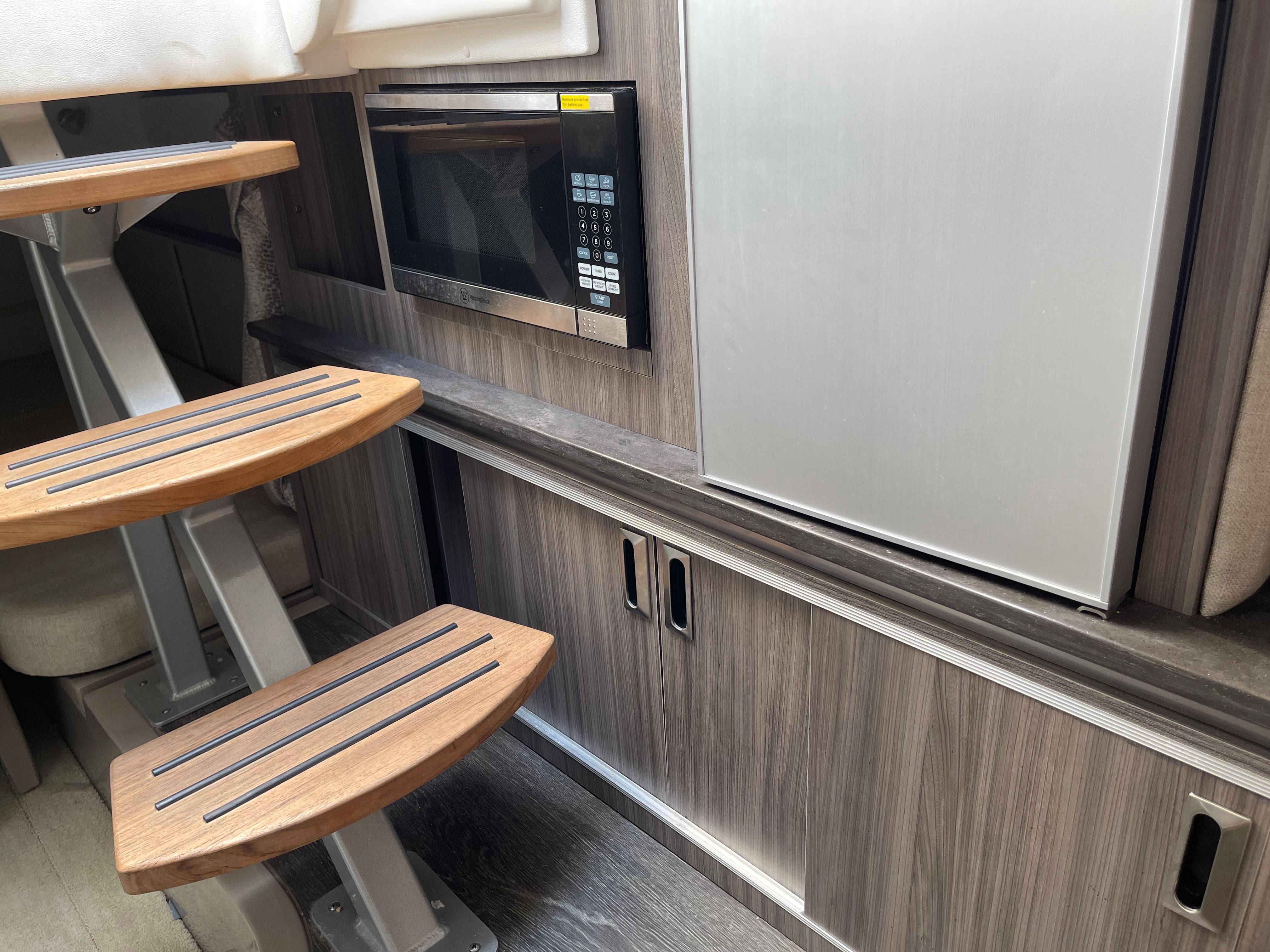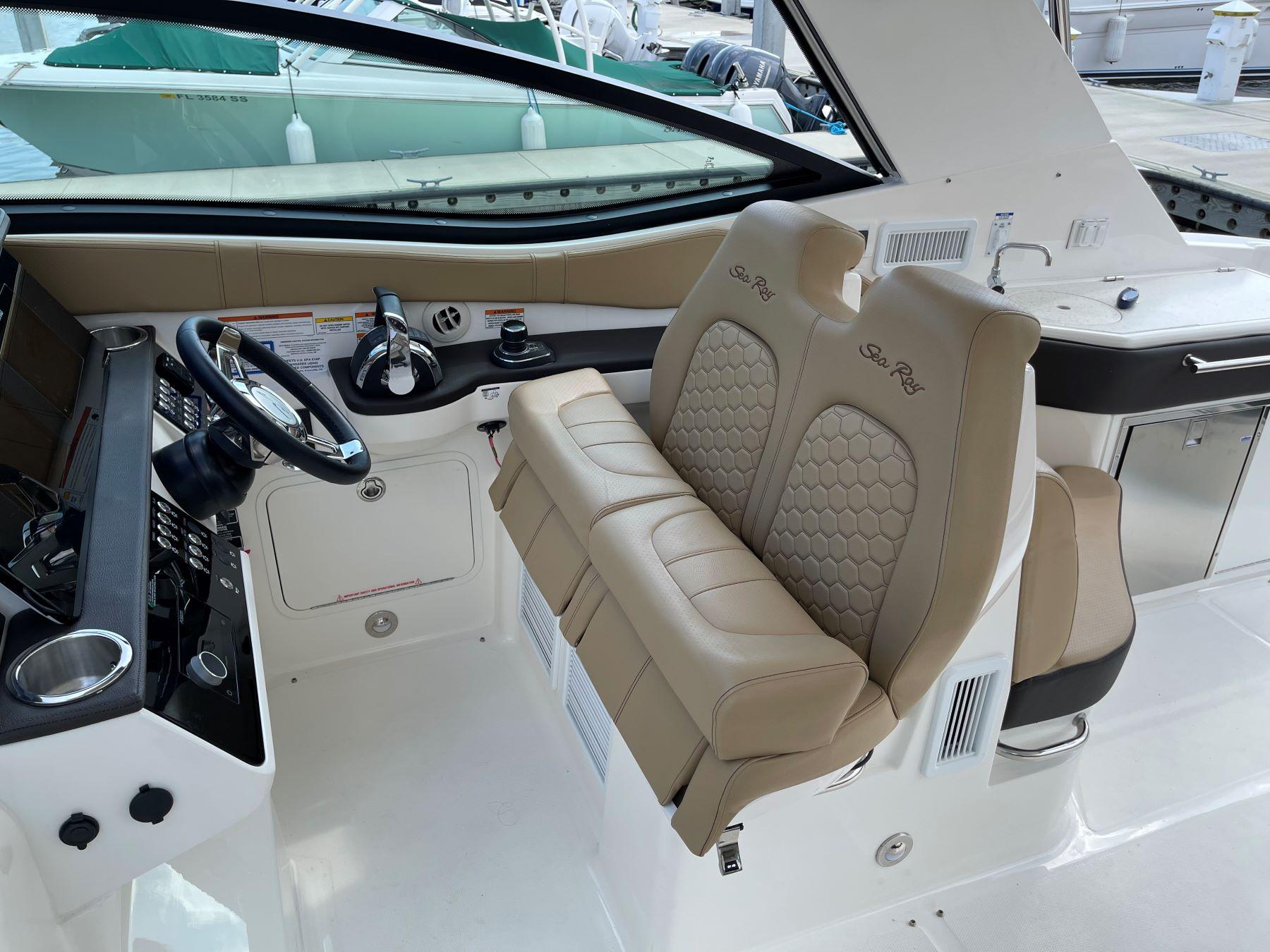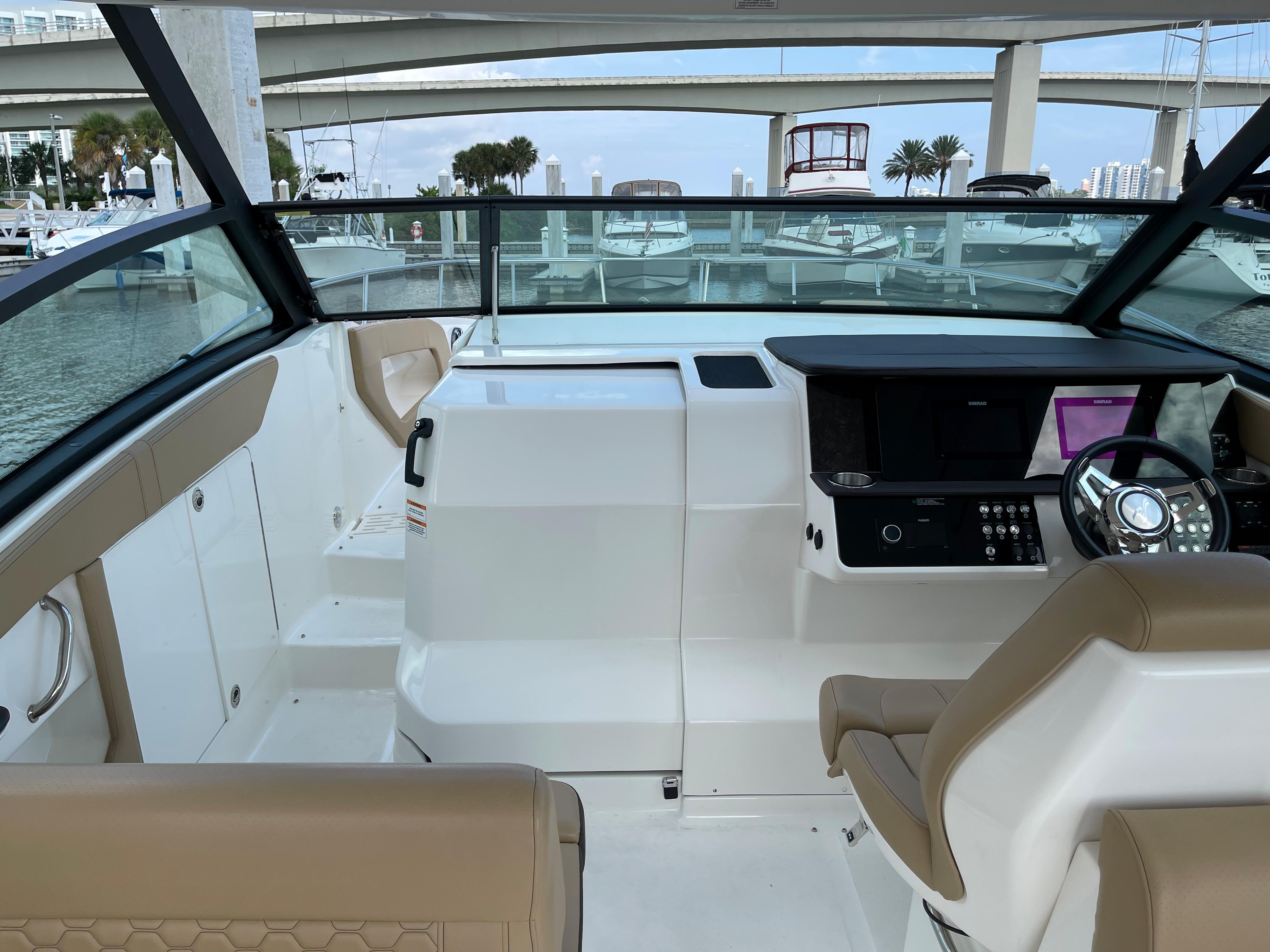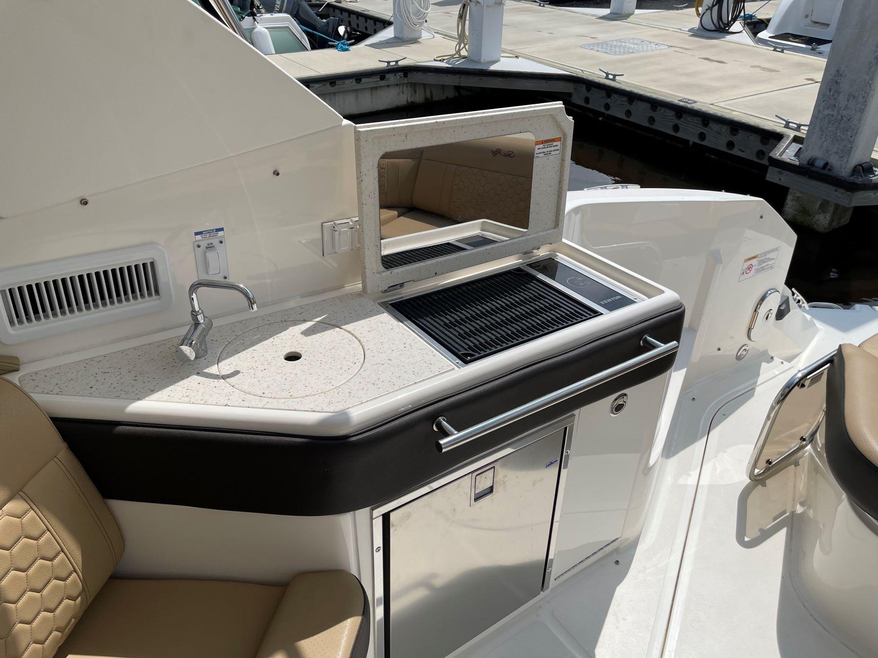 The cockpit features a reversible helm companion seat that converts to face aft, as well equipped standard wet bar with sink and storage and offers a refrigerator and grill.