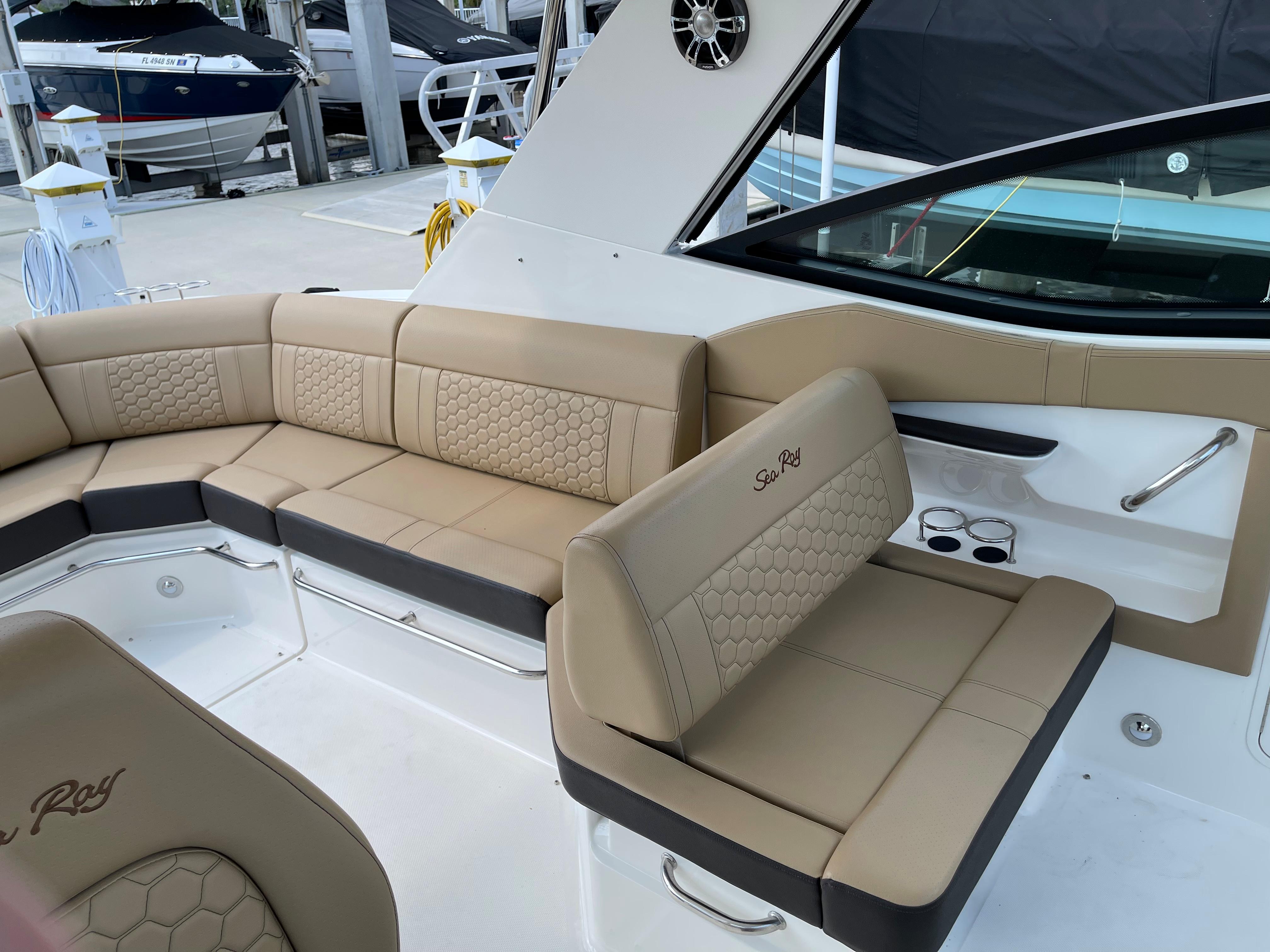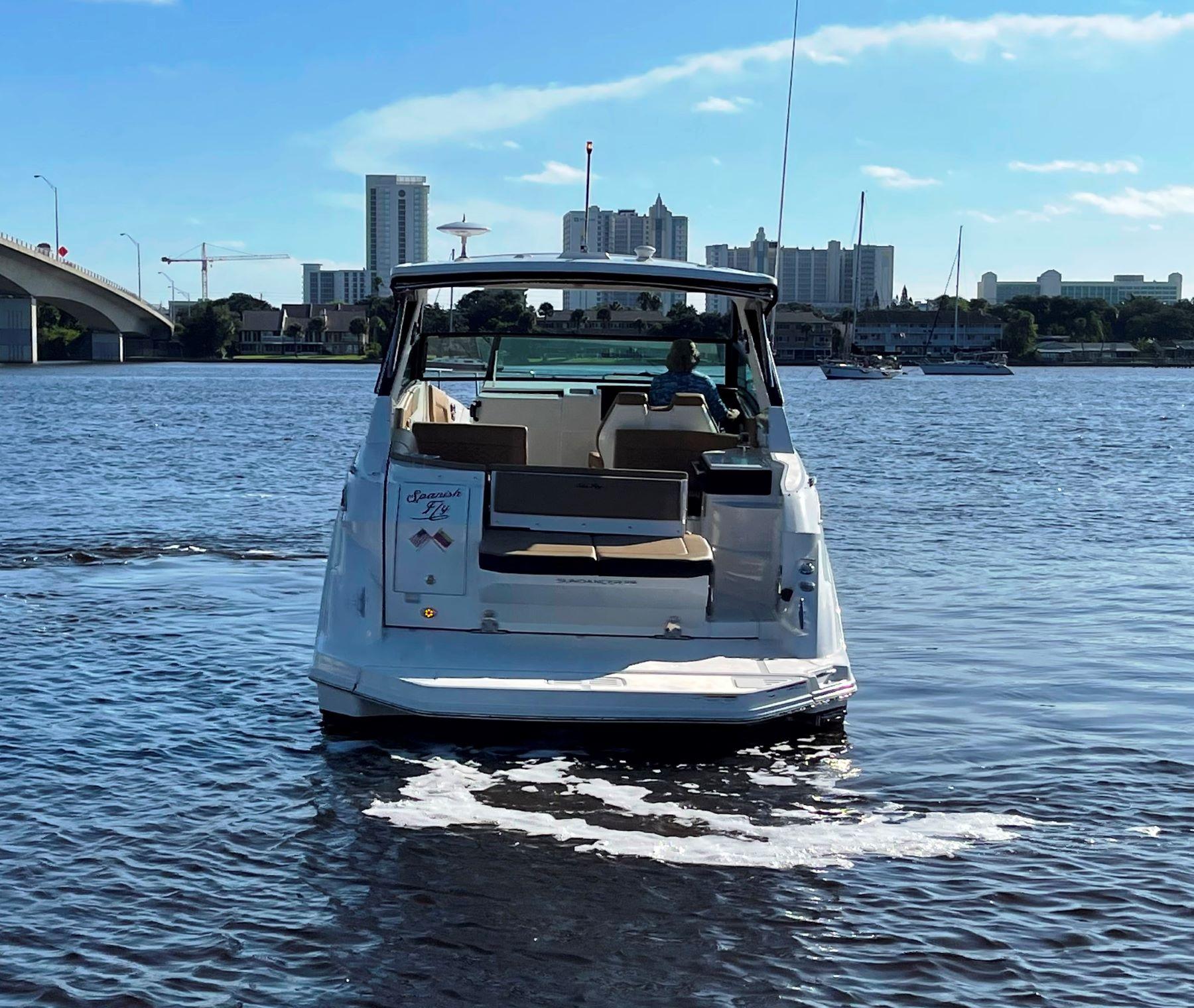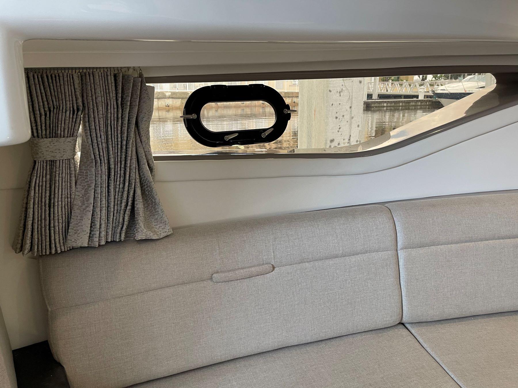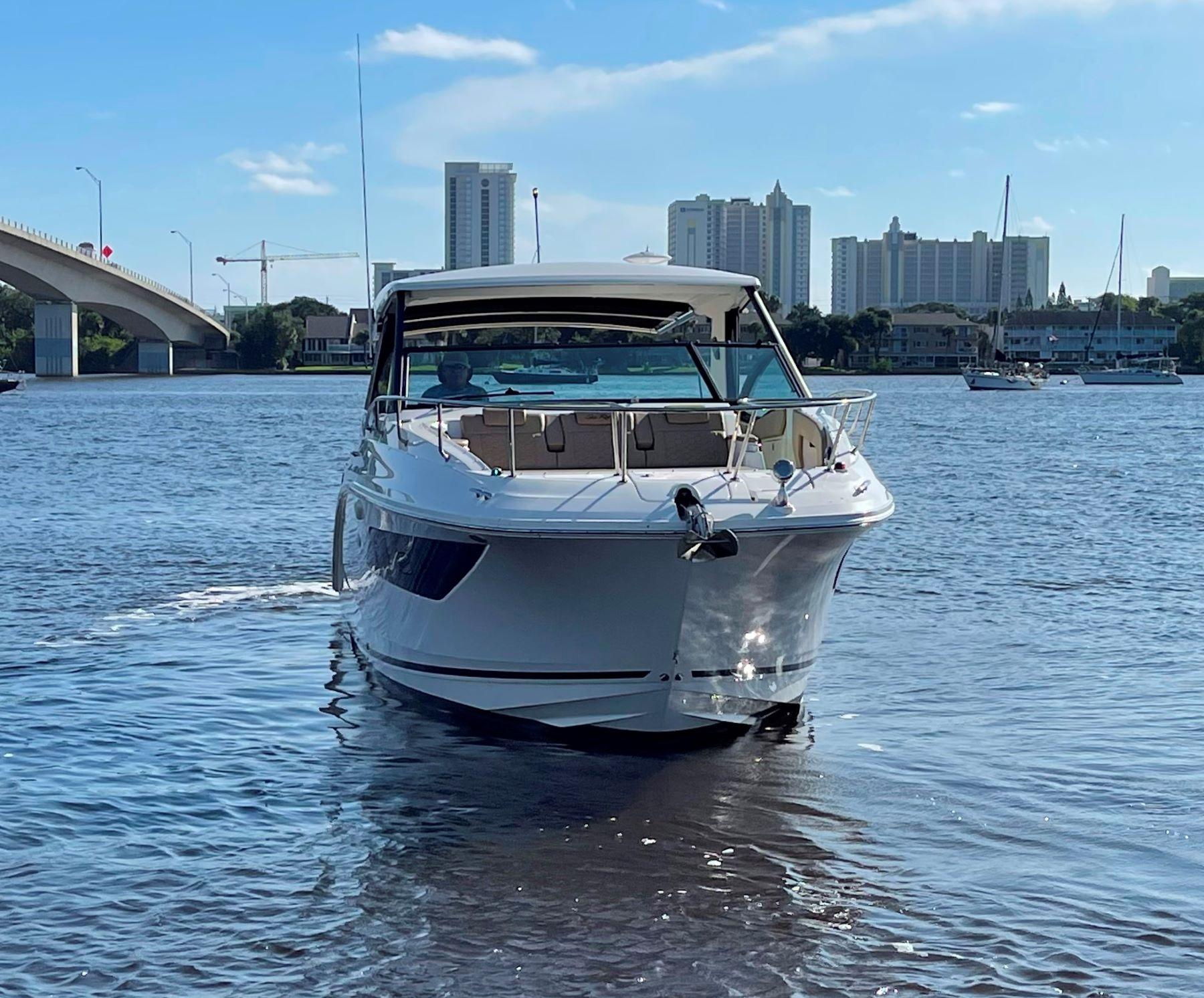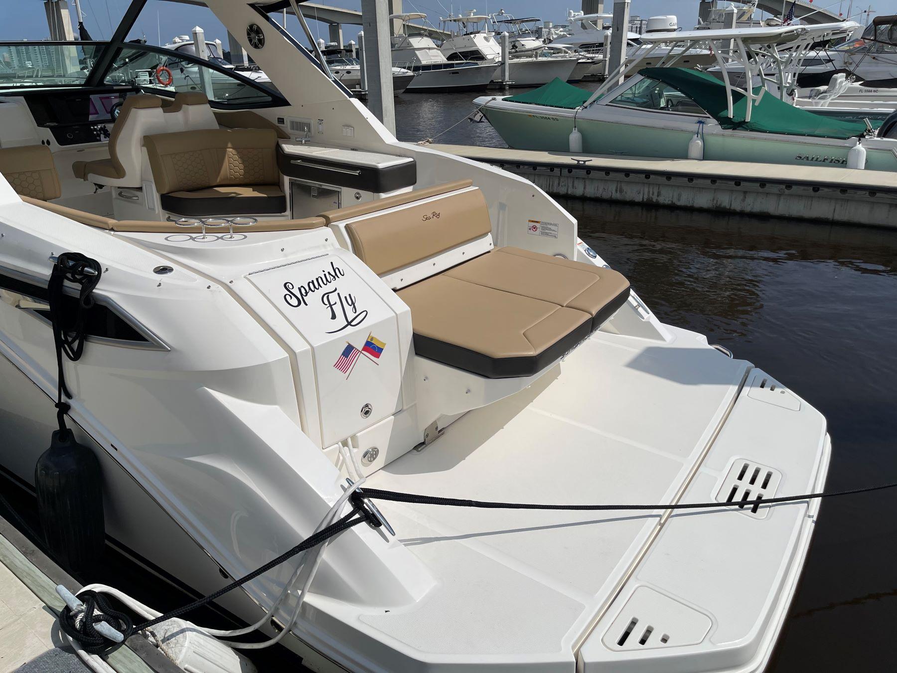 The cockpit features a reversible helm companion seat that converts to face aft, as well equipped standard wet bar with sink and storage and offers a refrigerator and grill.