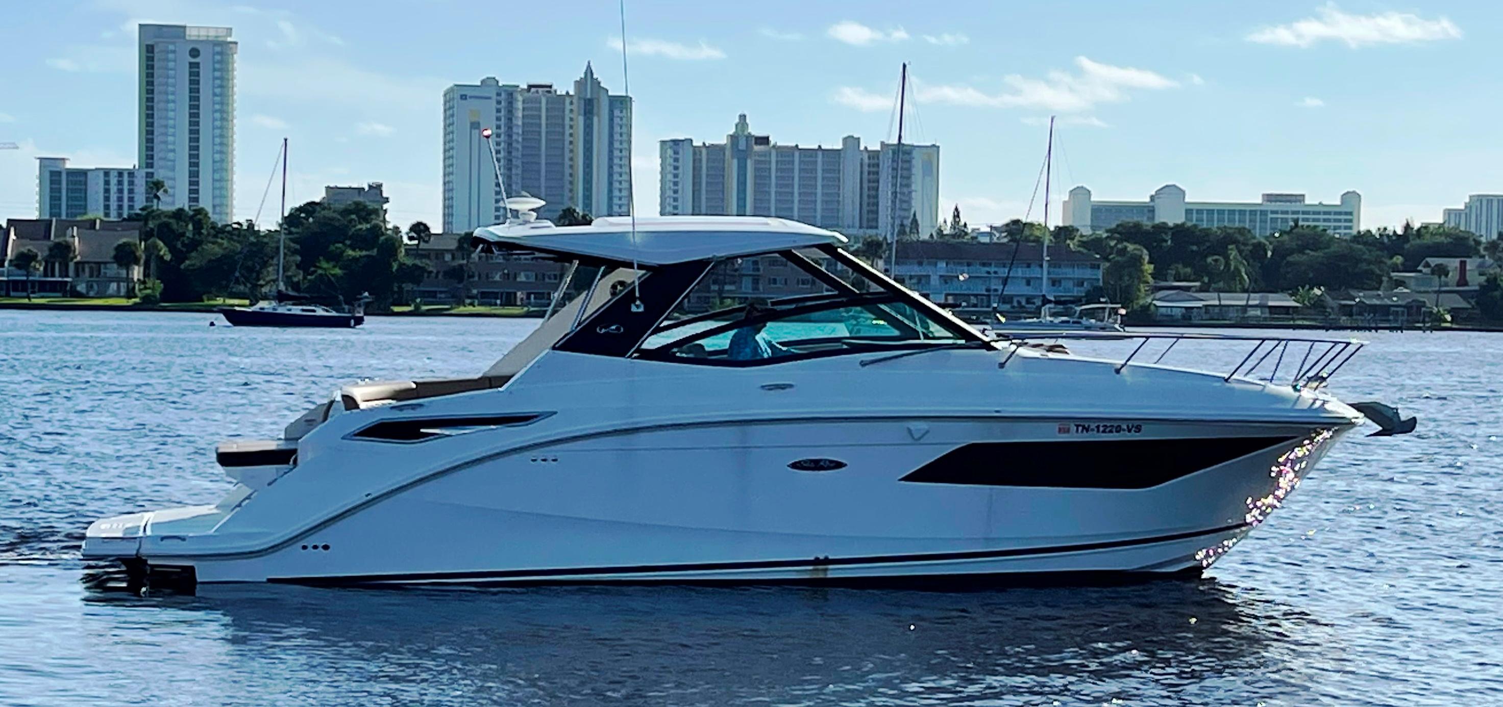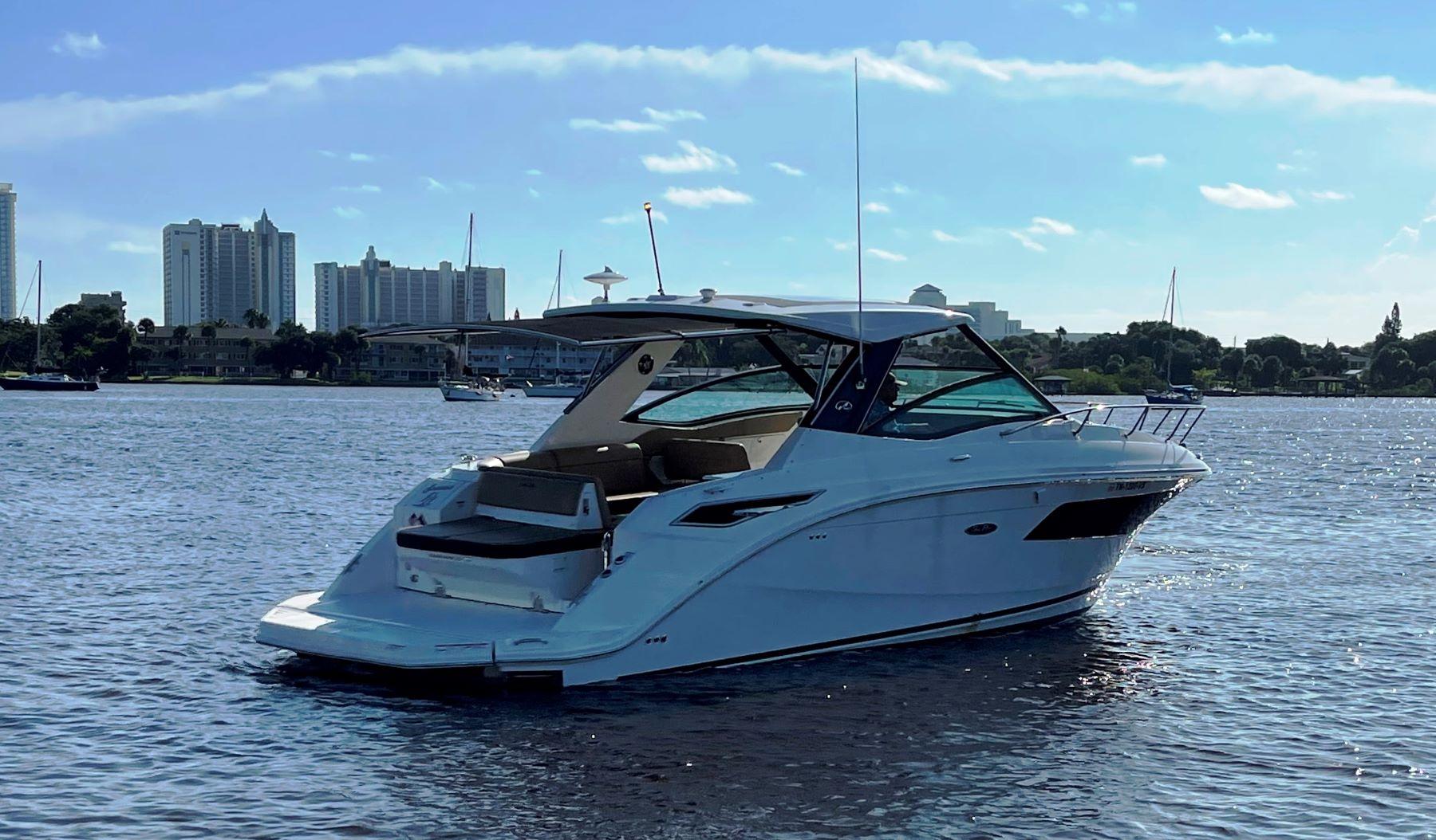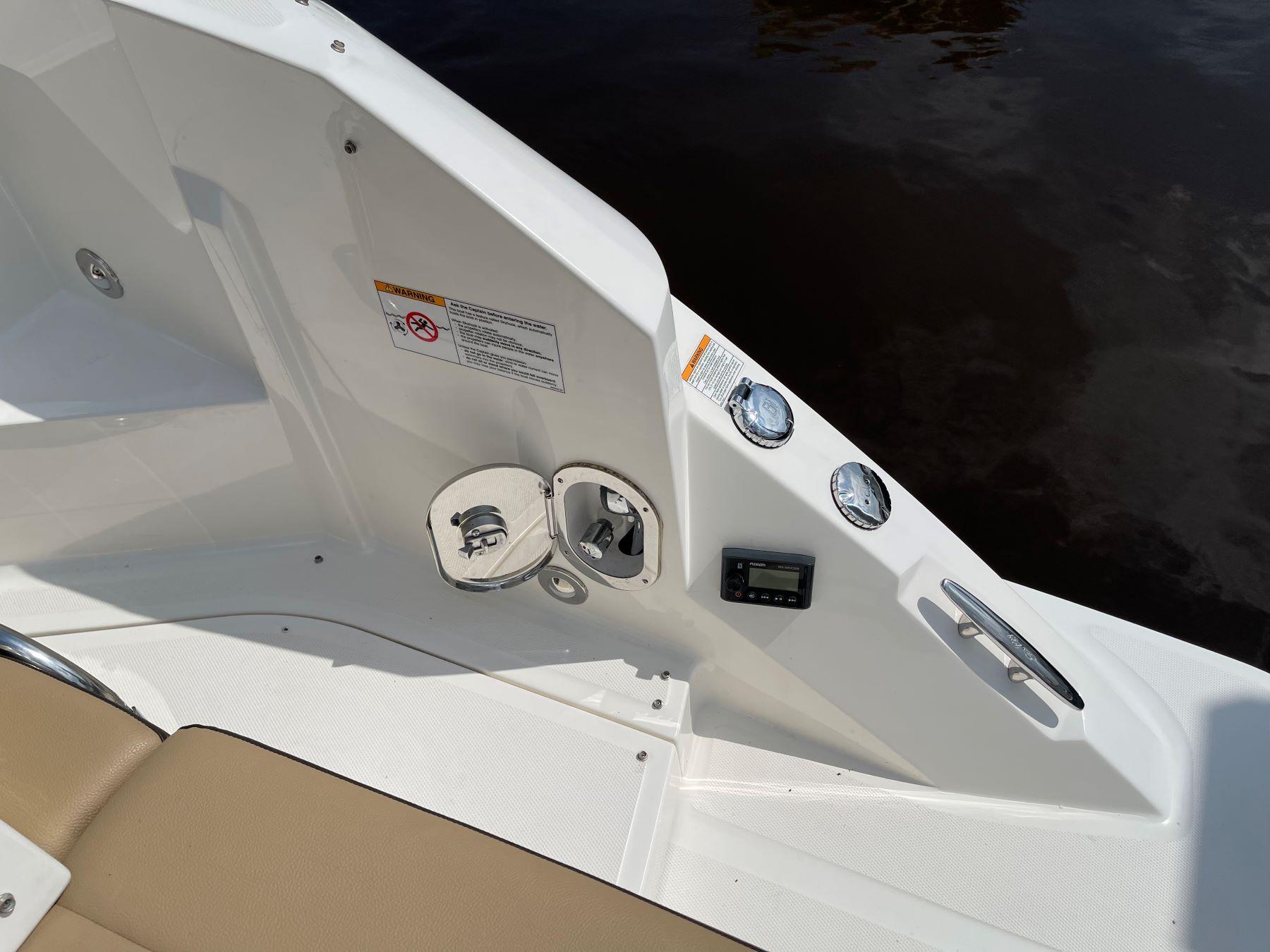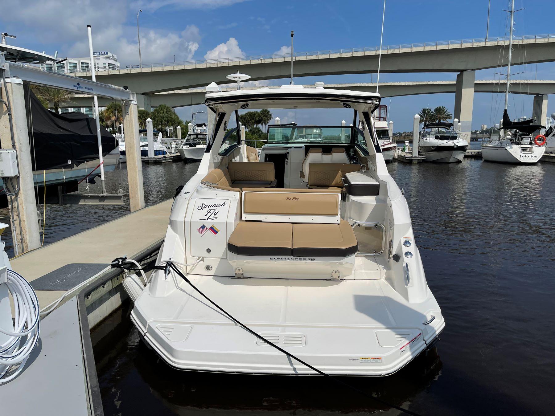 The cockpit features a reversible helm companion seat that converts to face aft, as well equipped standard wet bar with sink and storage and offers a refrigerator and grill.
