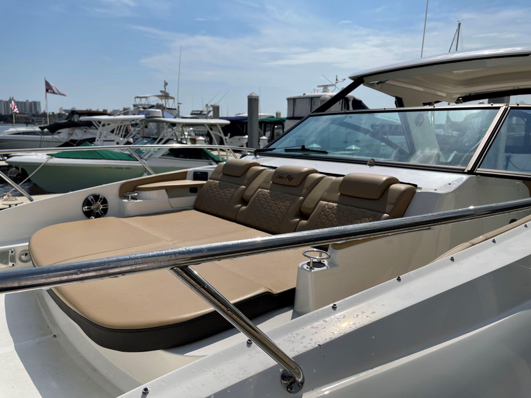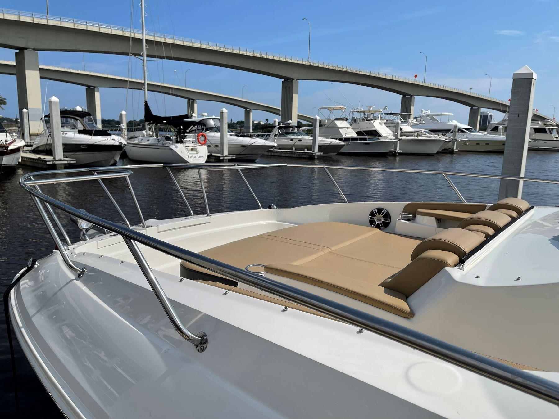 Robust bow lounging and seating area with actuated headrest and armrests allow for perfect comfort while underway or at rest.