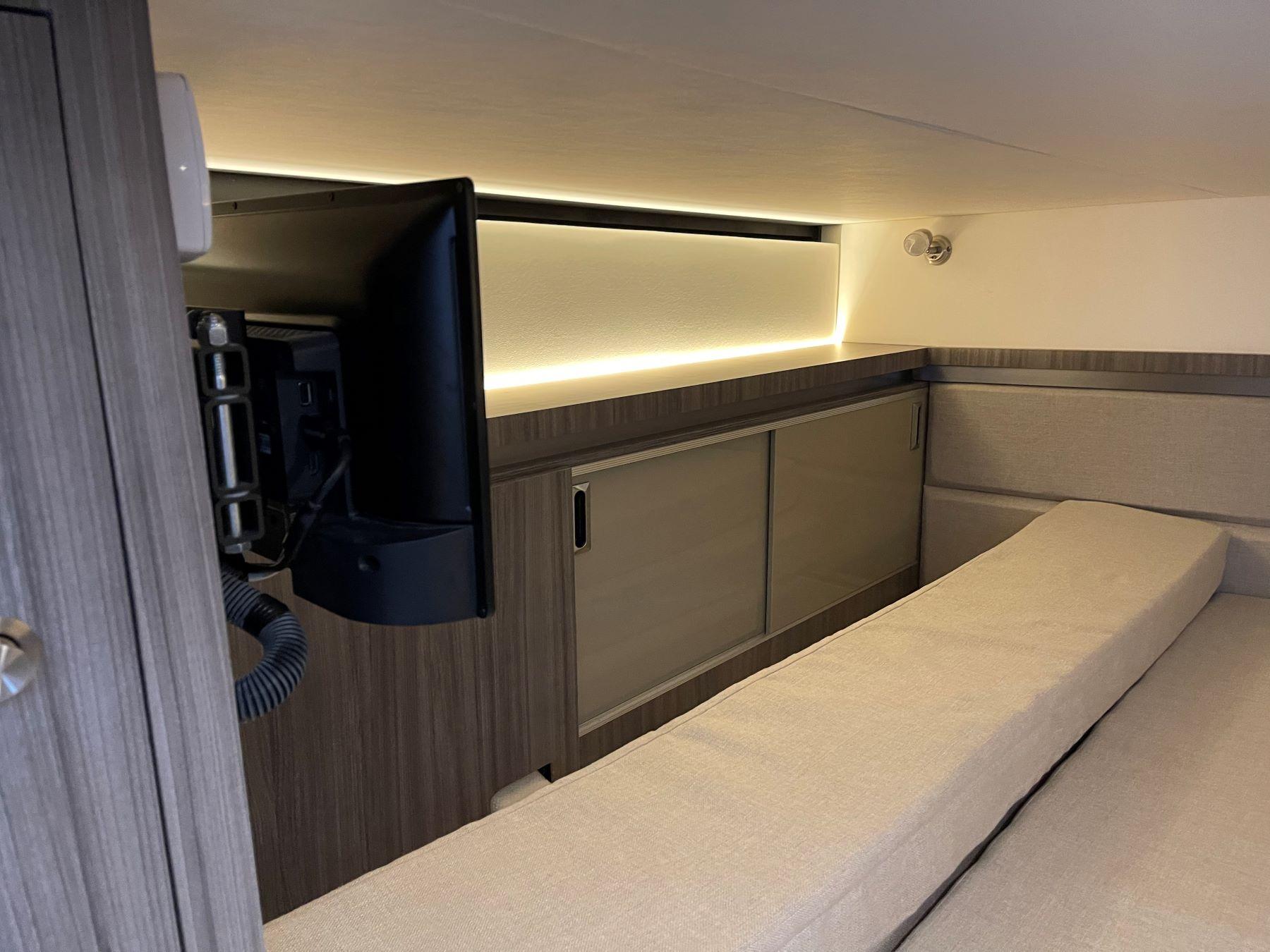 A deluxe head, two flat screen TVs and generous storage are features of a beautifully designed cabin with sleeping accommodations for four.