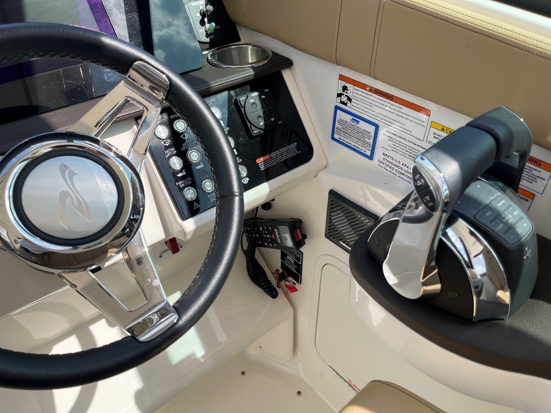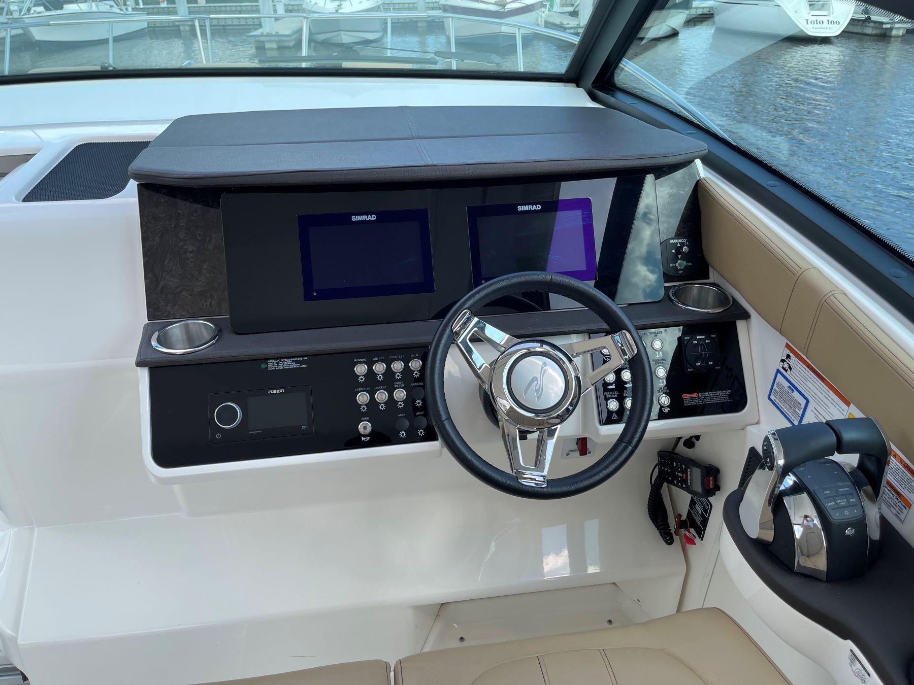Intuitive helm station features dual digital dash with 9” Simrad touchscreens displays.