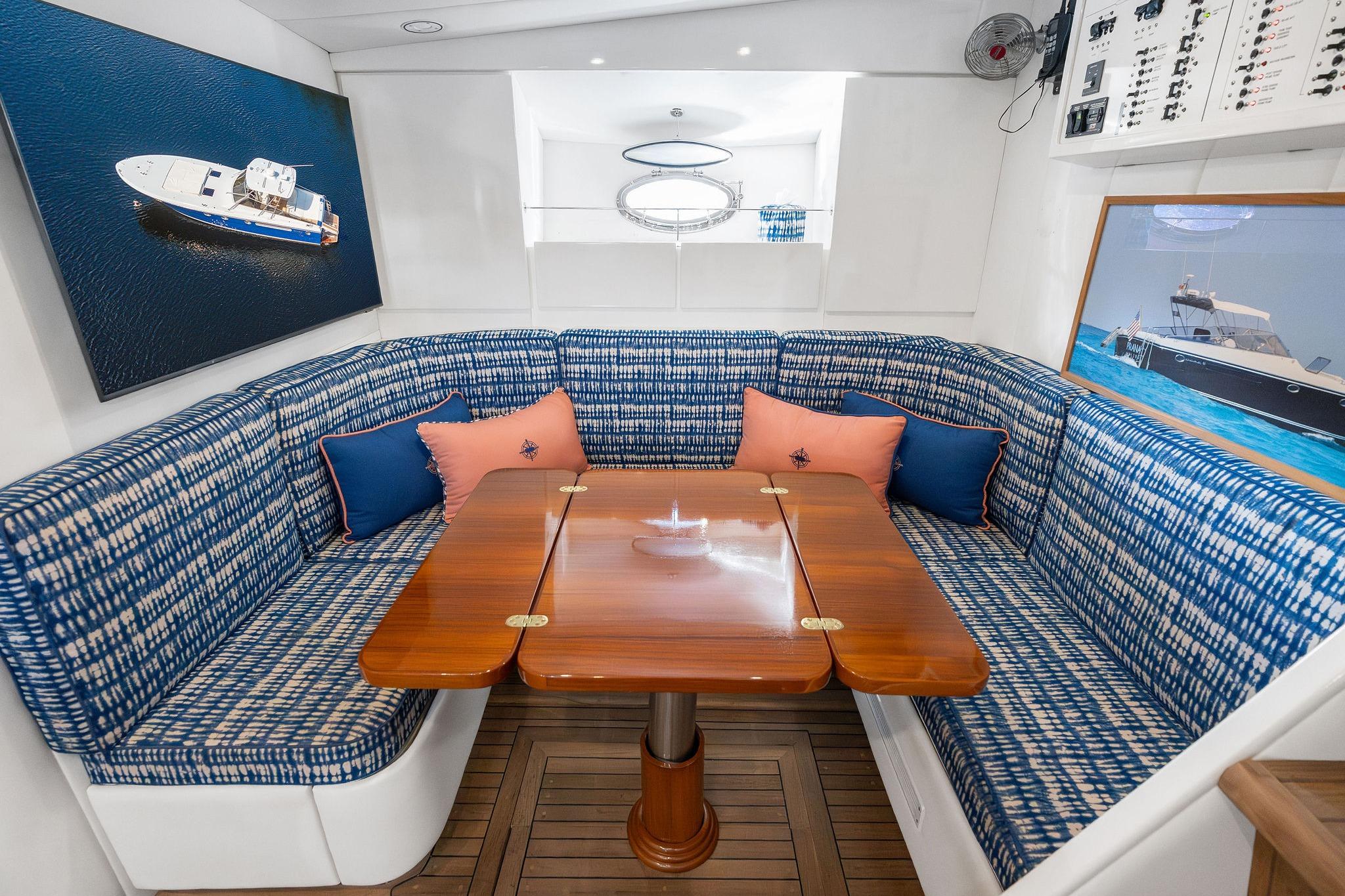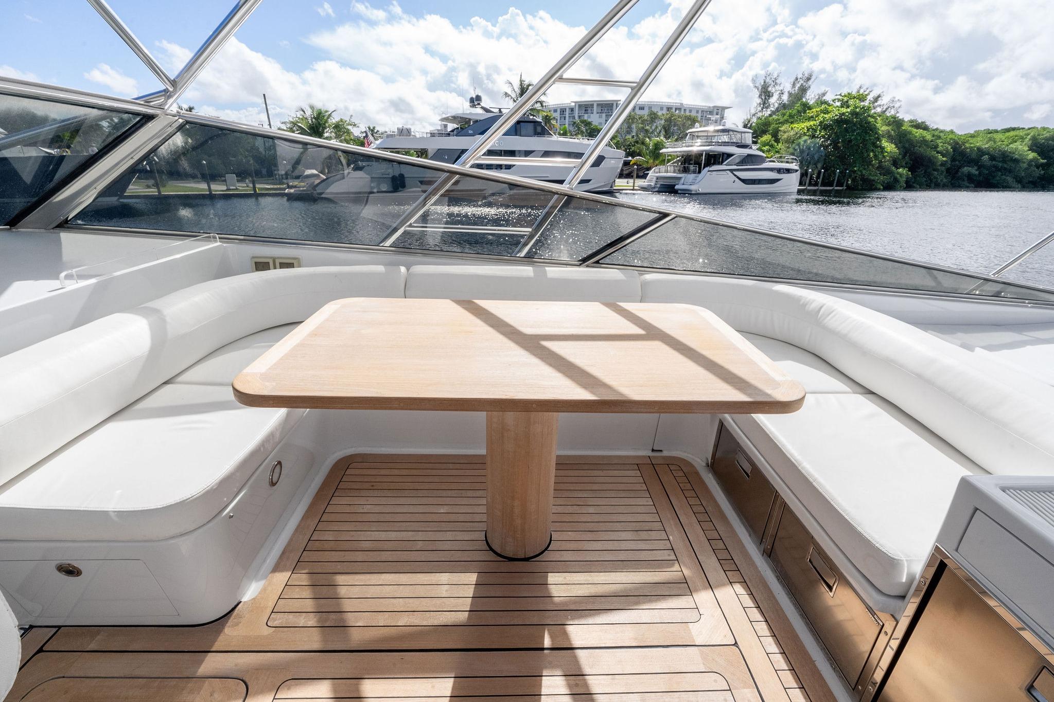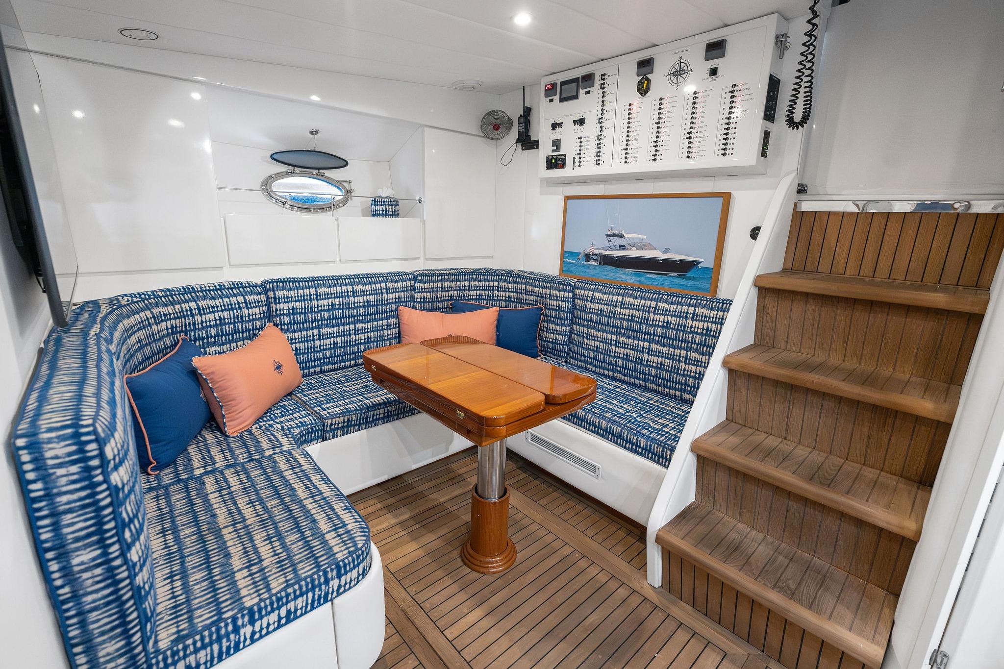 The yacht's interior is adorned with premium fabrics from world-renowned designers Lee Jofa and Pindler, ensuring the tactile experience that compliments the visual splendor. This attention to detail extends to the exterior, where high-performance upholstery from PPS UF Ultrafabrics and Perennials combines style with durability, ideally suited for life at sea.