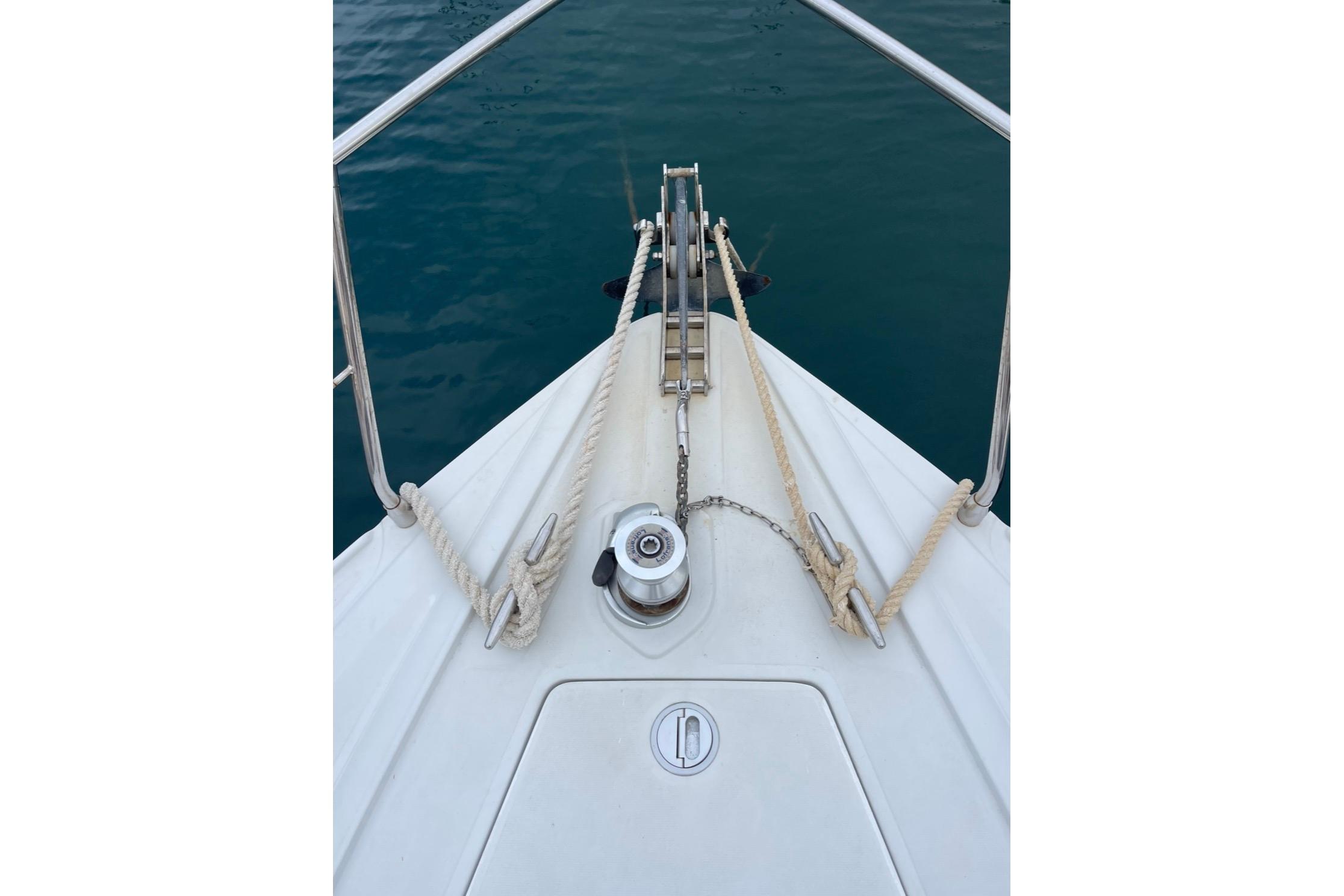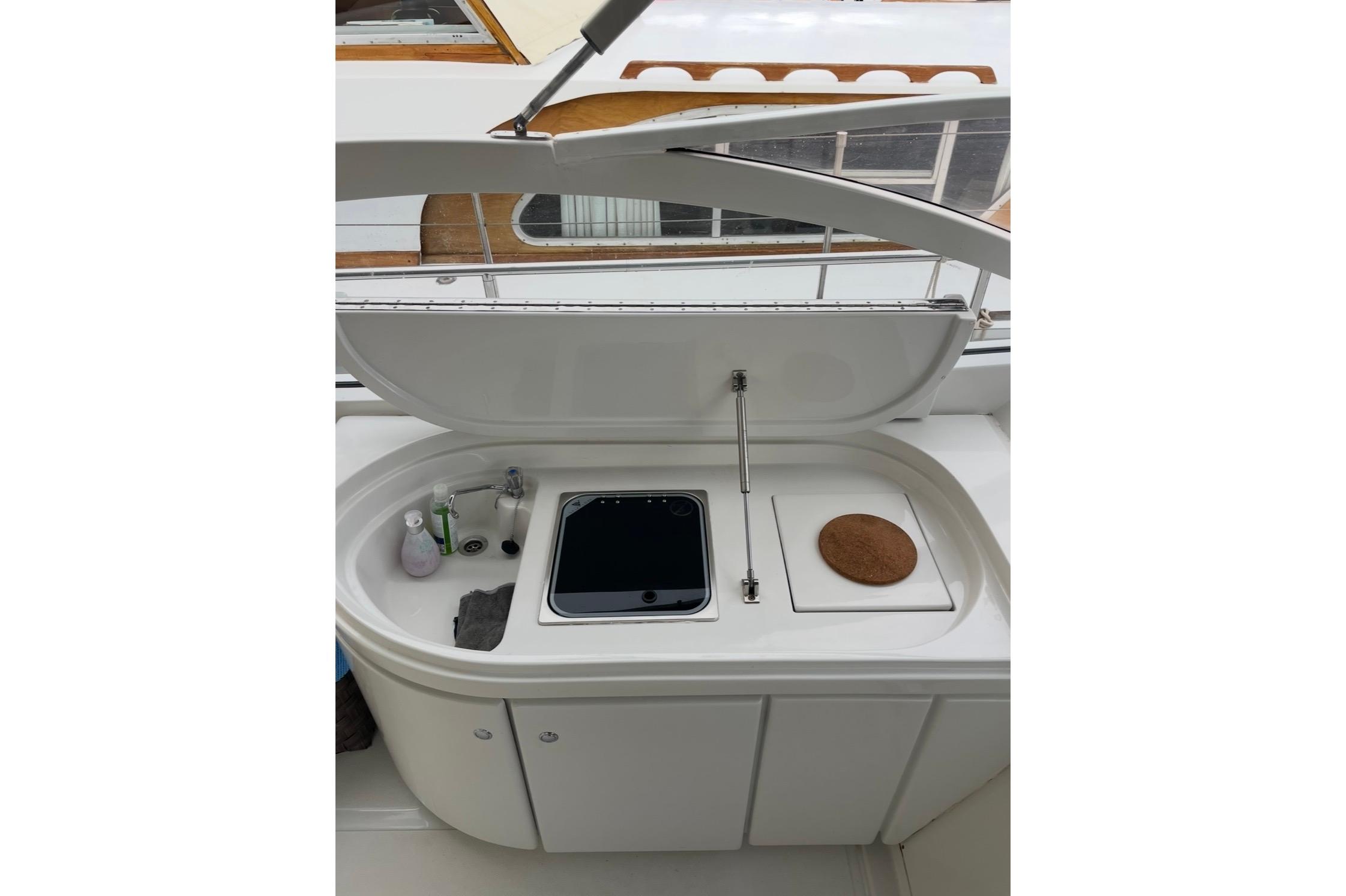 Propulsé par deux moteurs Man, il offre des vitesses de croisière impressionnantes tout en conservant un confort de navigation exceptionnel. Le cockpit spacieux, la large plateforme arrière et le design intemporel du pont en teck invitent à la détente comme aux sensations fortes.