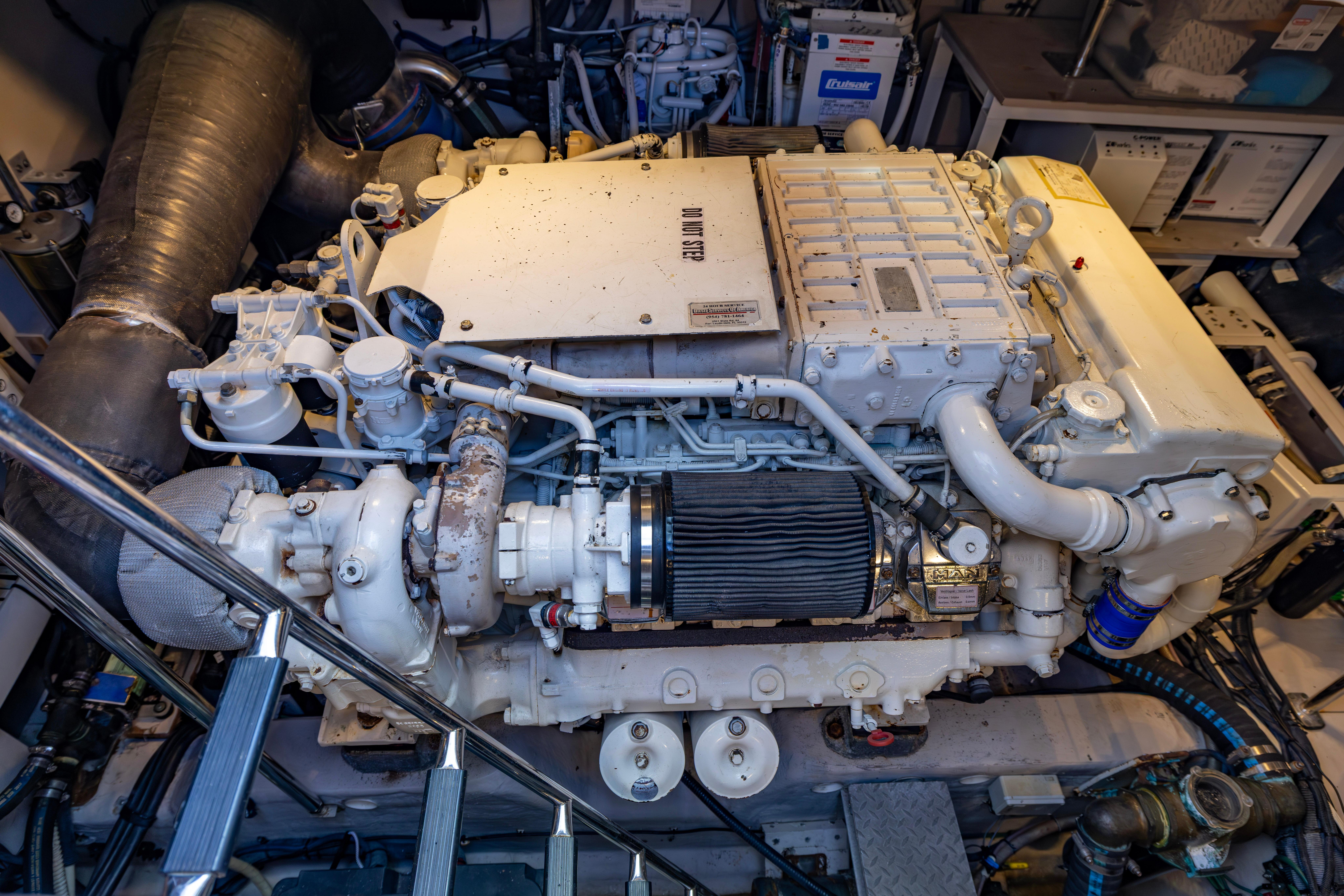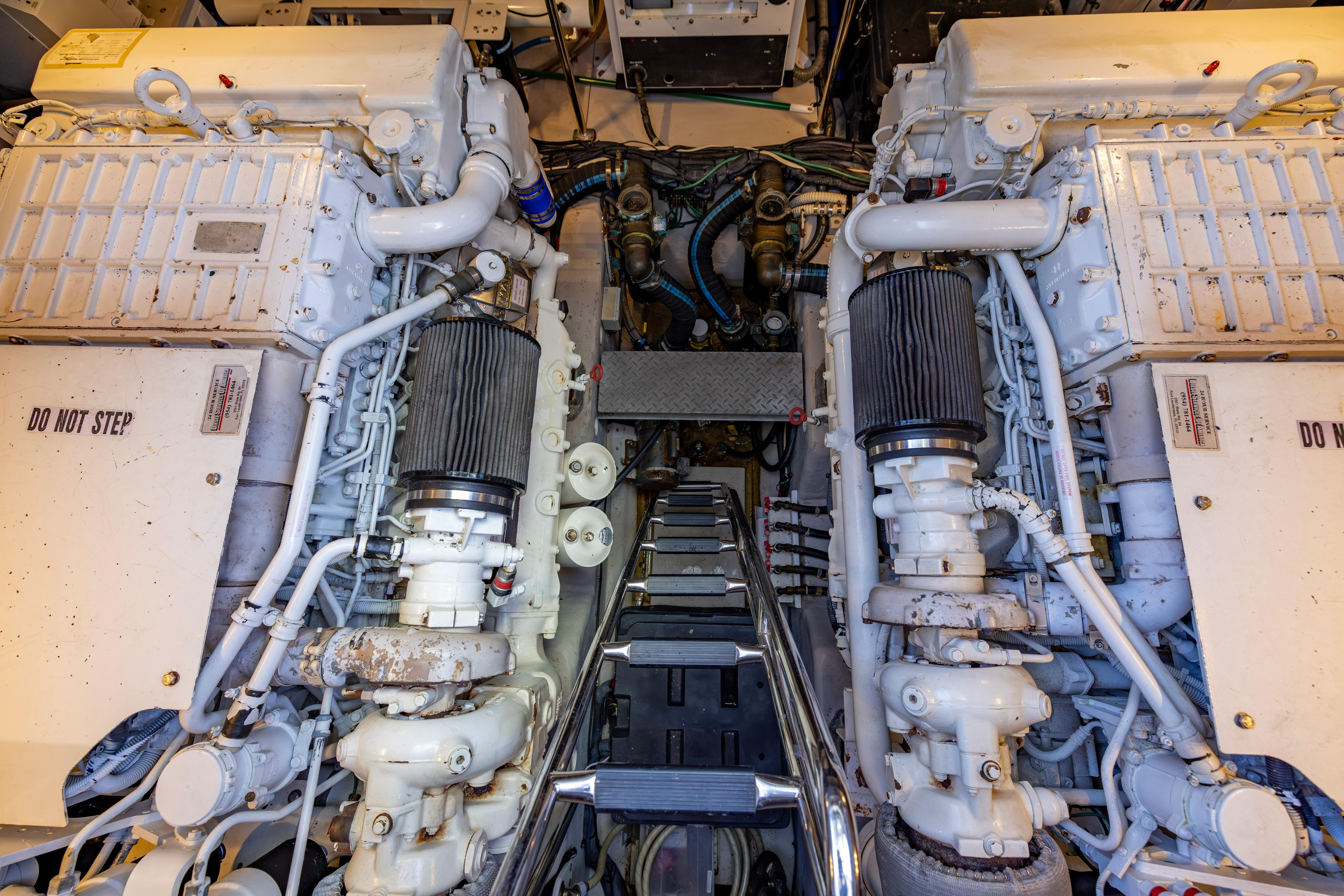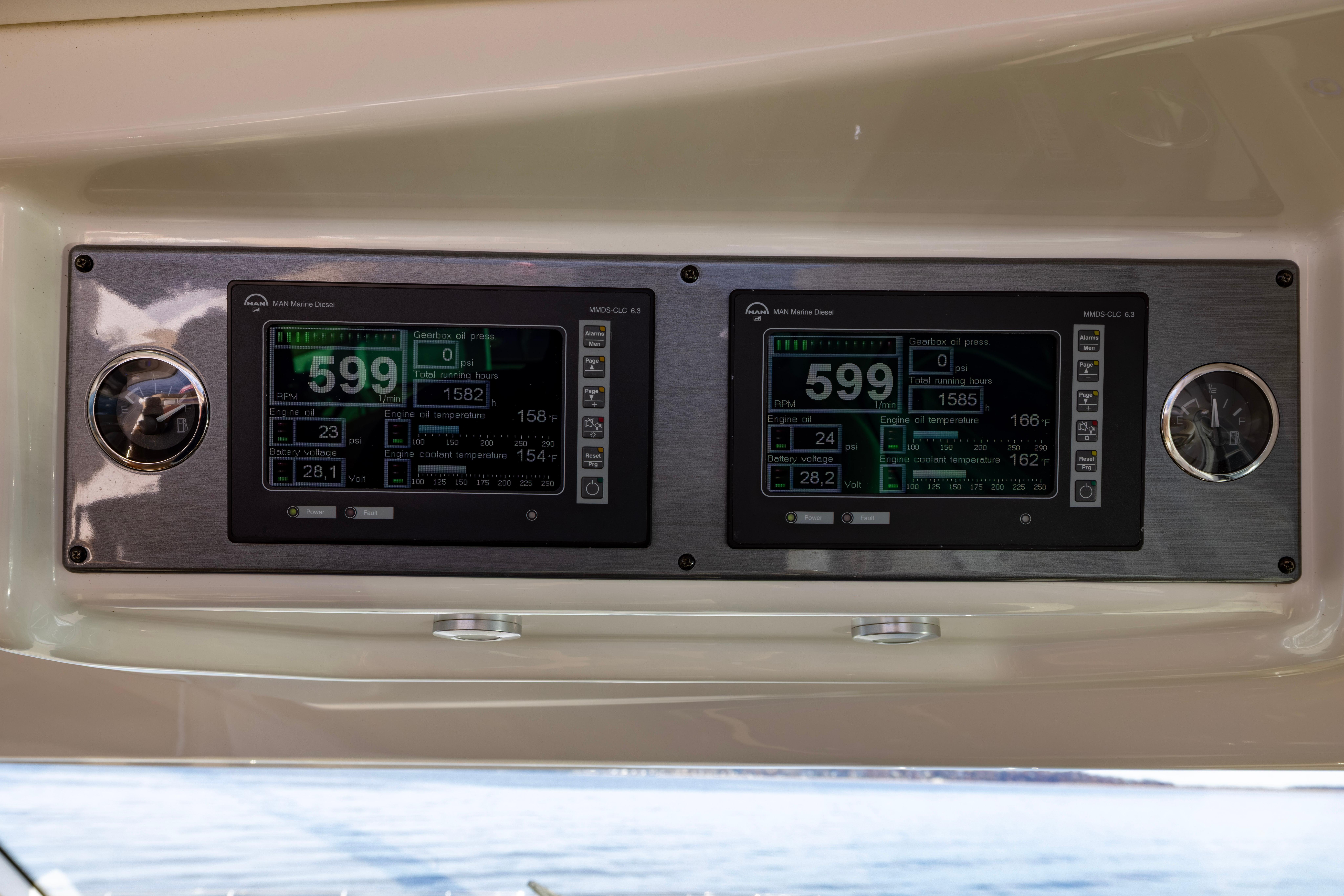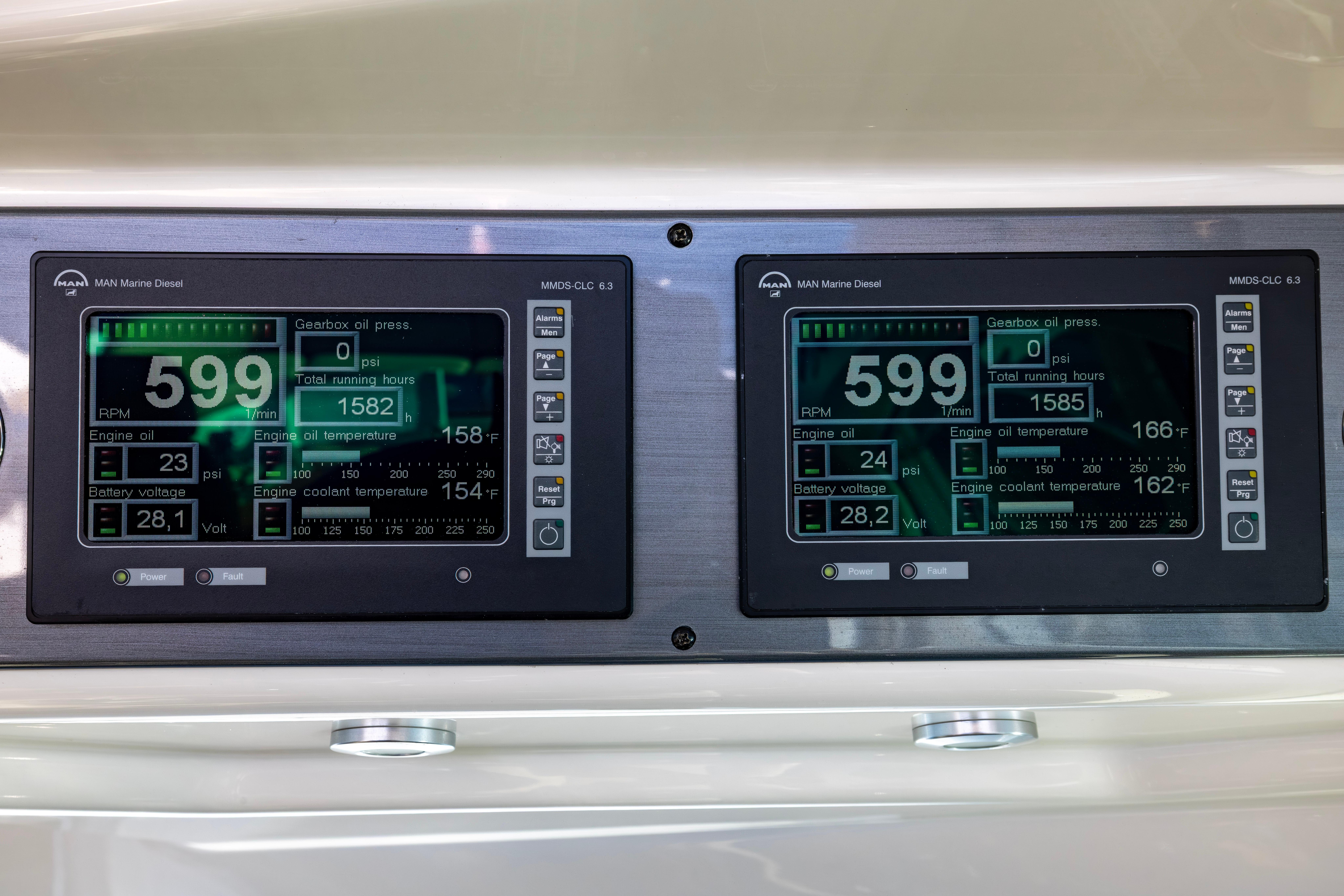 Reliable MAN Diesel Power: This model is powered by twin MAN V10 Common-Rail diesel engines (1,100 hp each). These engines are powerful, responsive, and provide a great combination of cruising speed (mid-20 knots) and reliability.