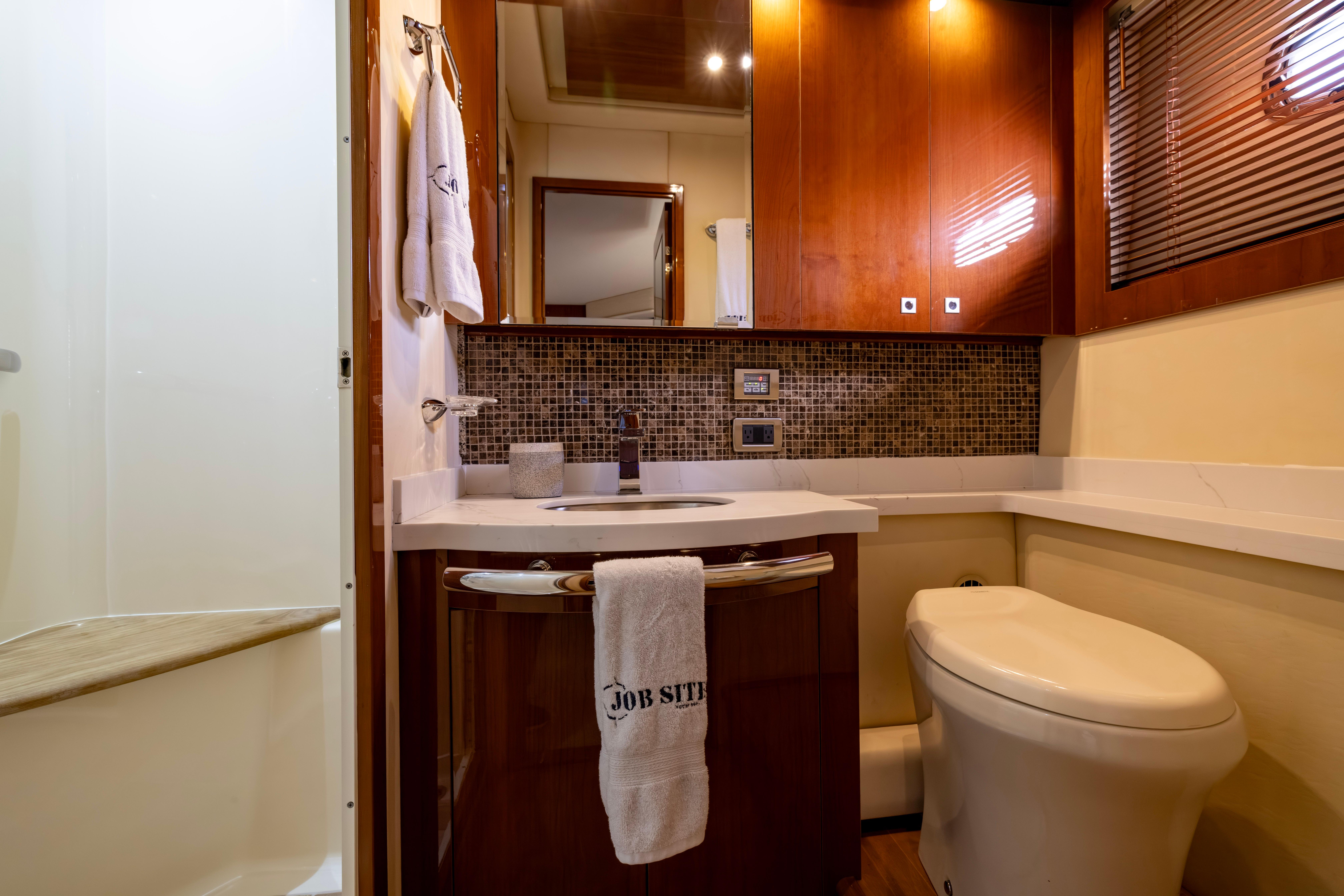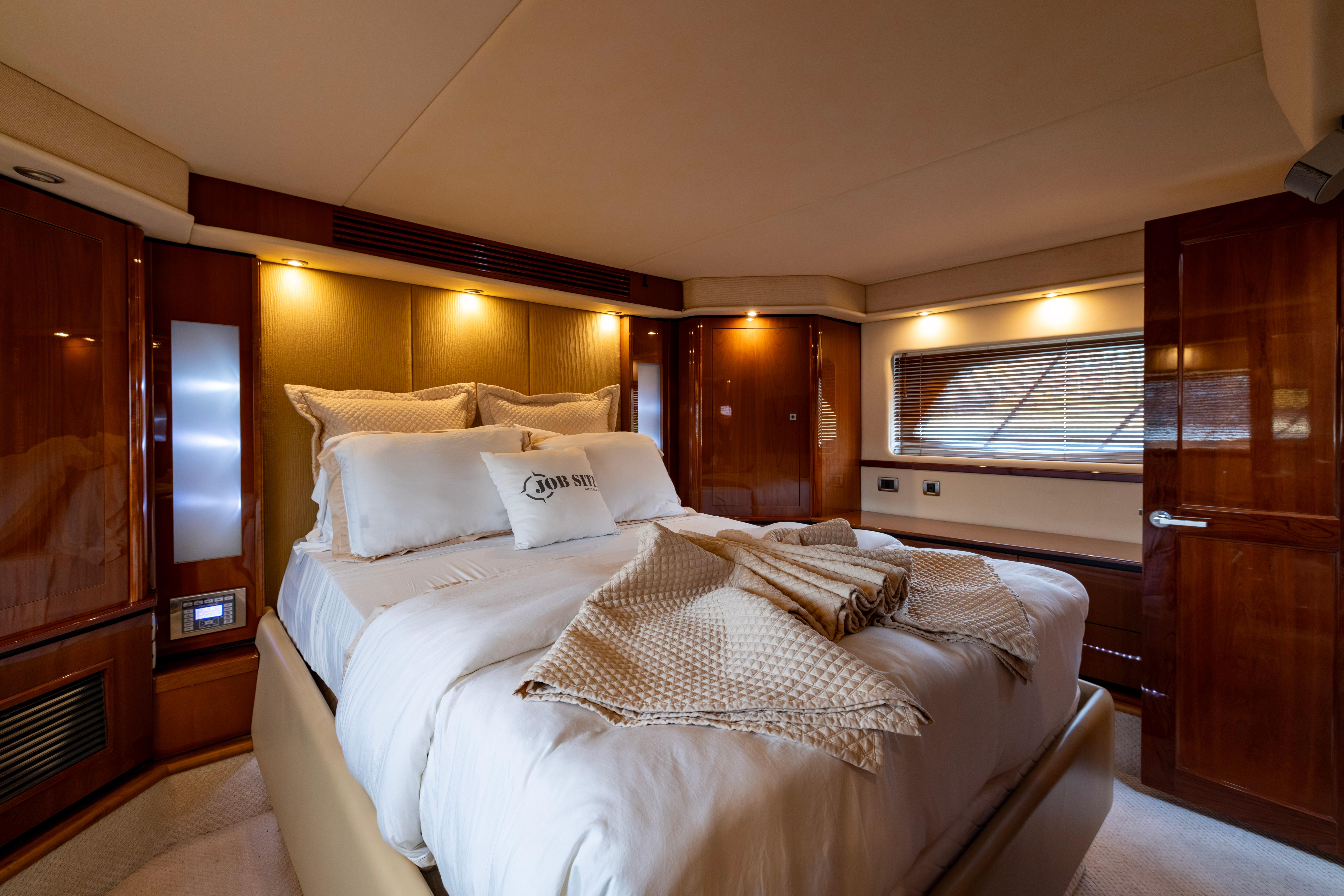 Full-Beam Master Stateroom: Unlike many express cruisers, the 60 Sundancer features a truly spacious, full-beam master suite located amidship, complete with large hullside windows for natural light, a private head, and a queen berth.