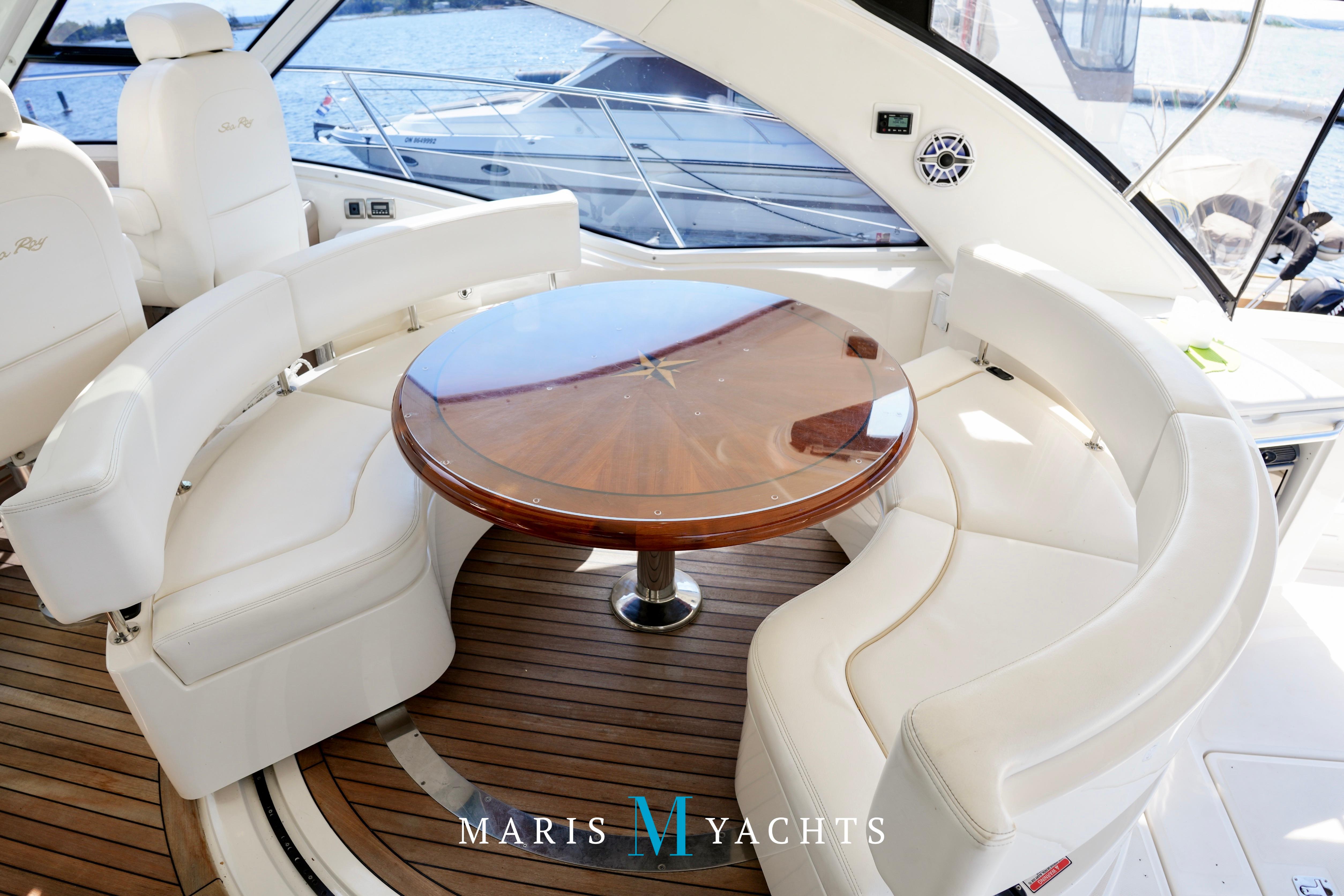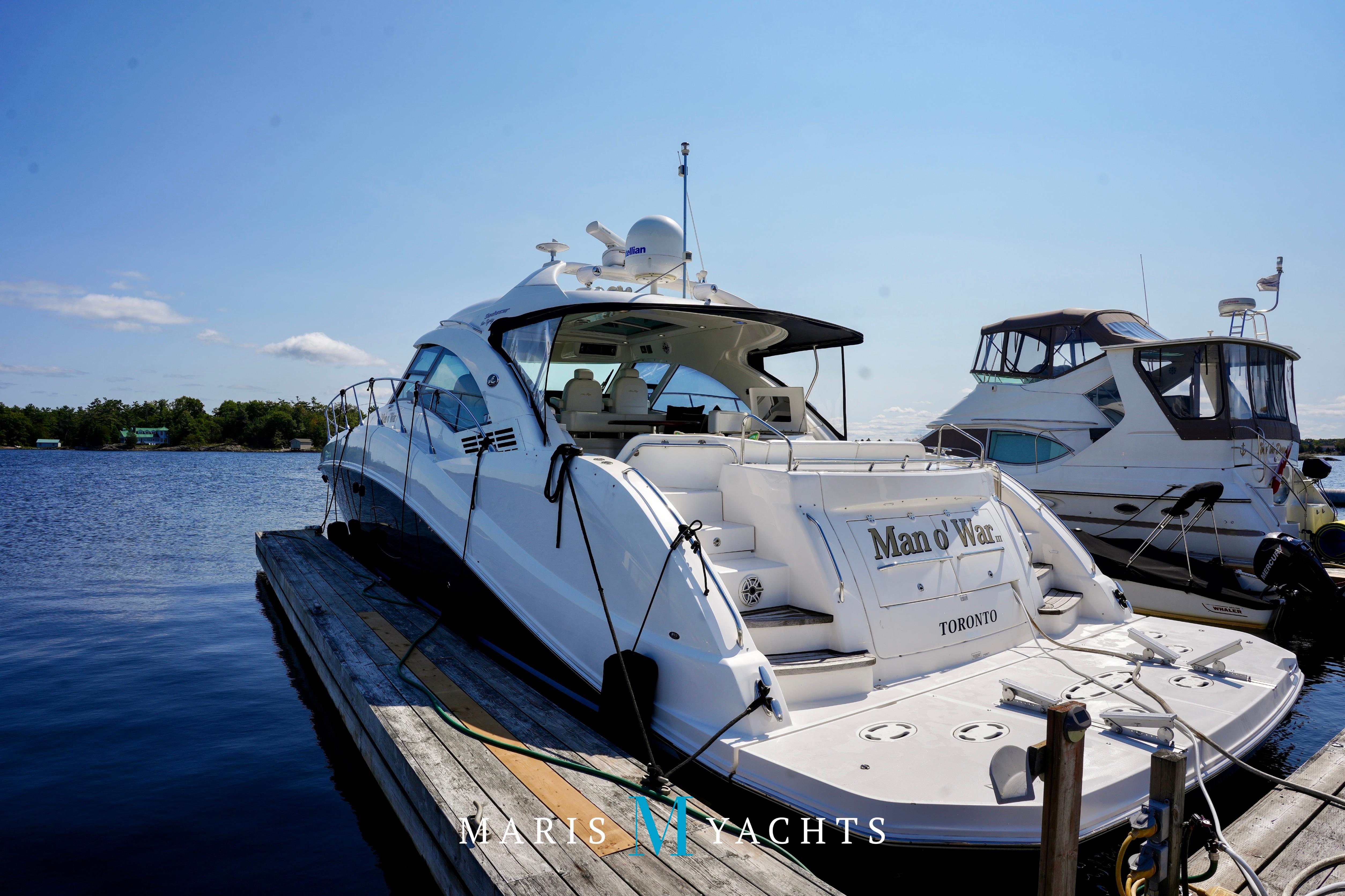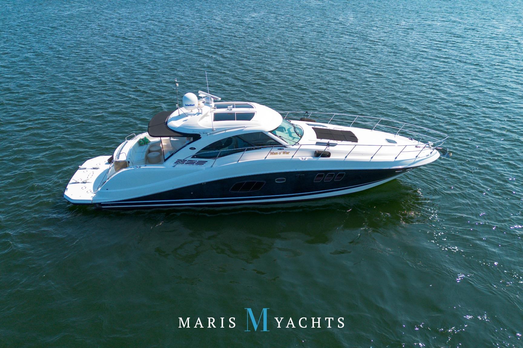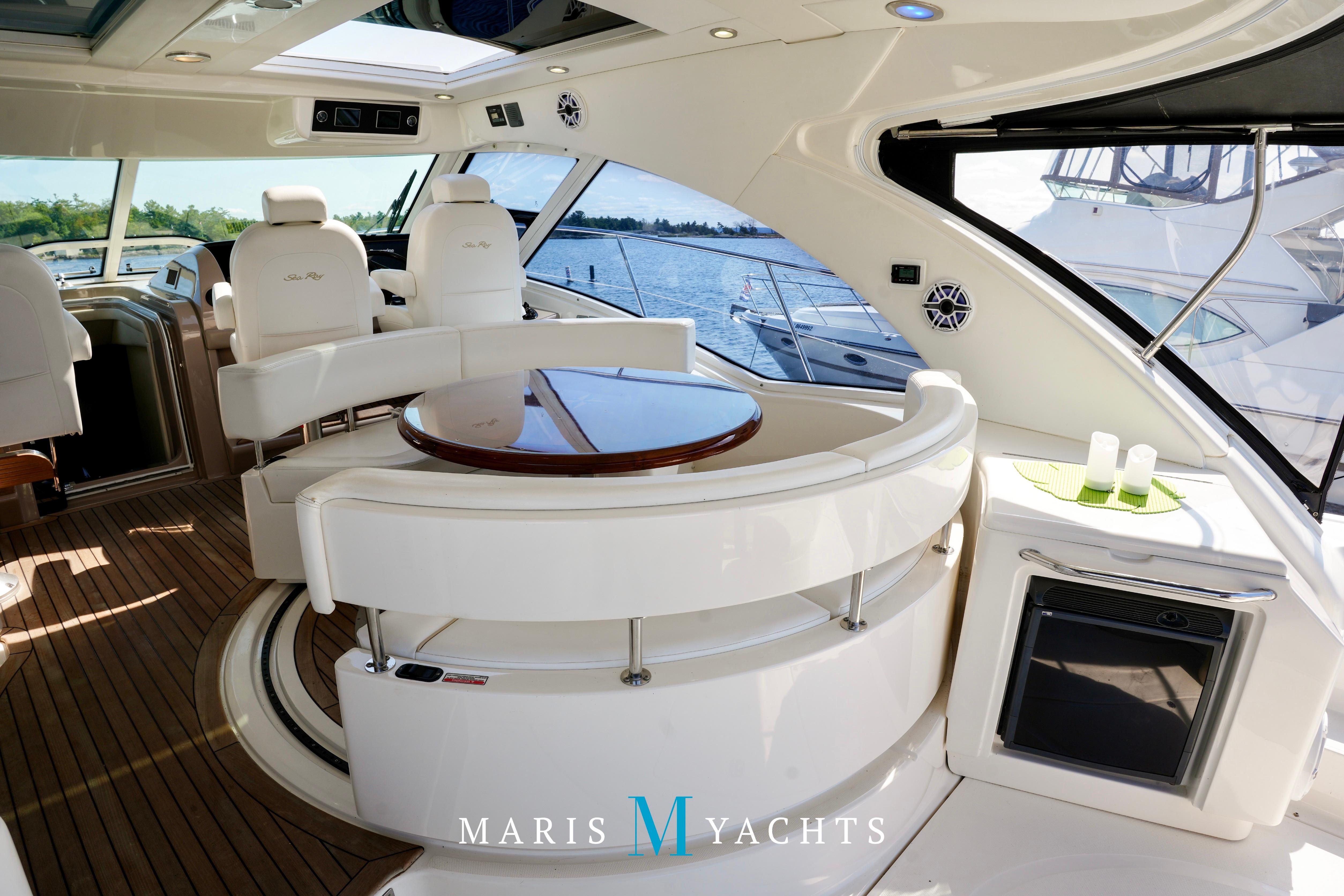 The 2009 Sea Ray 55 Sundancer, which became rebranded in 2010 as the 580 Sundancer, is a luxurious and impeccably designed yacht that offers unparalleled comfort and functionality. With its two-stateroom layout and expansive cockpit, the 55 Sundancer is the ultimate boat for entertaining and relaxing in style.This vessel underwent a significant upgrade in 2022 with the installation of two new FPT Marine engines, now with only 114 hours and 825HP each, in lieu of the 765HP MANN 800CR engines previously installed. She also is powered by a 21.5 Onan generator. The exterior of “Man O War” features a hydraulic swim platform, teak flooring in the upper cockpit, JL audio speakers, and a Fusion sound system. The large aft bench seating area includes a high-gloss table with two removable chairs, while the midship customizable carousel seating in the cockpit enhances versatility – providing the perfect space for social gatherings. The cockpit also has a fully equipped wet bar complete with sink, ice maker, fridge, electric grill and a mounted flat screen TV. The helm station is designed for ease of navigation and comfort, featuring fully adjustable dual captain’s seats with excellent visibility and a double-wide companion seat on the port side. The hardtop is enclosed and includes two independent retractable sunroofs and power side windows, offering both protection from the elements and a connection to the open air.The helm is equipped with dual Raymarine Hybrid Touch screen GS series color displays with GPS, plotter, radar and autopilot with a smart controller. Bow and stern thrusters ensure effortless maneuvering in any docking situation. Below deck, the cabin has rich dark cherry cabinetry with ample storage, a pop-up flat-screen TV and an L-shaped Ultraleather settee with a slide out that converts this into a double bed, allowing 6 adults to comfortably sleep on board. The U-shaped galley is both stylish and functional, featuring a hidden microwave oven, a three-burner electric stove, a refrigerator, a freezer, a sink and ample storage space. The forward VIP stateroom offers a queen-sized island-style bed, a large closet, and private access to the day head, ensuring comfort and convenience for guests. The full-beam master stateroom, located midship, features a queen-sized island-style actuating bed with massage function, a full dresser, ample storage, a mounted flat-screen TV and access to the full ensuite head Featuring