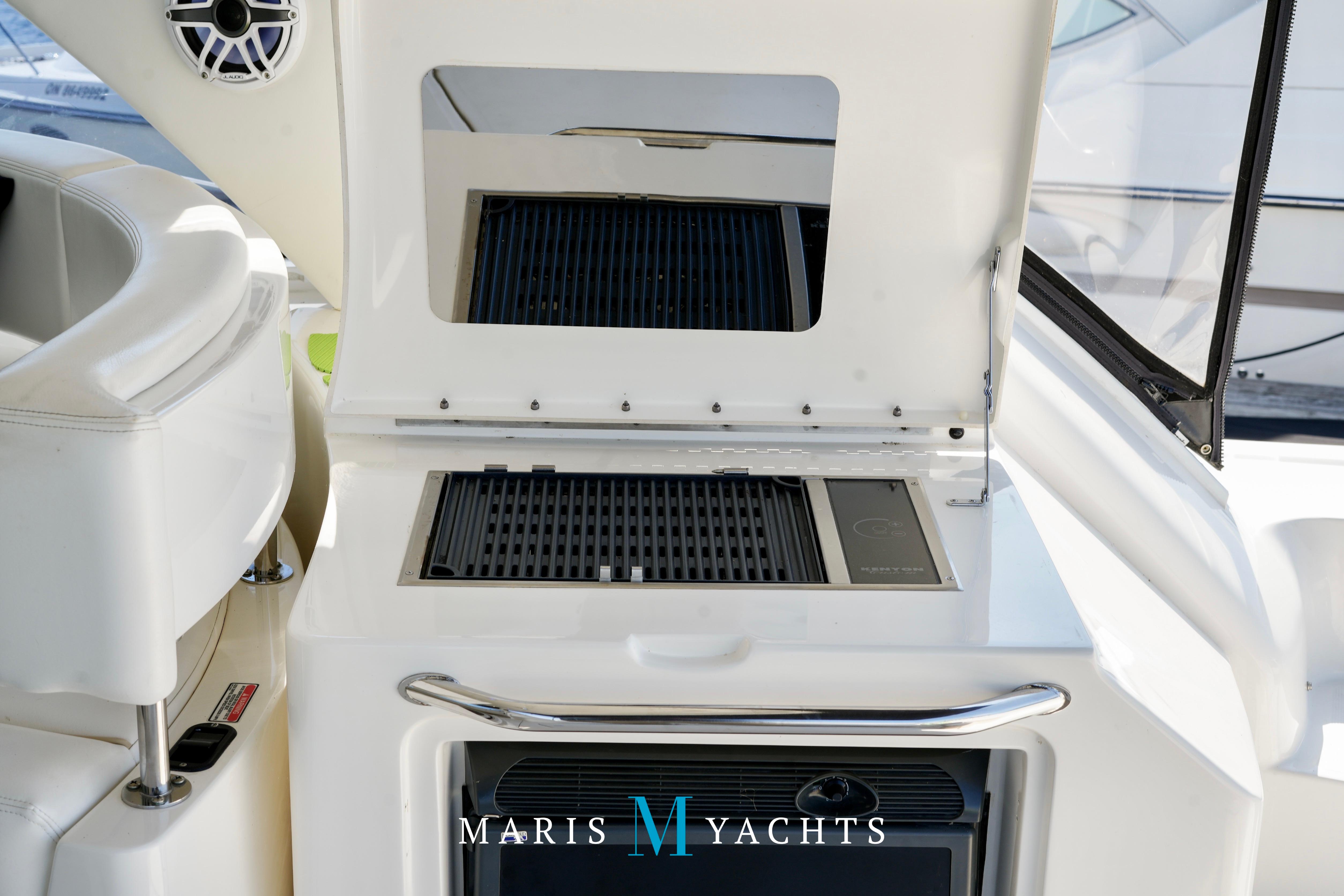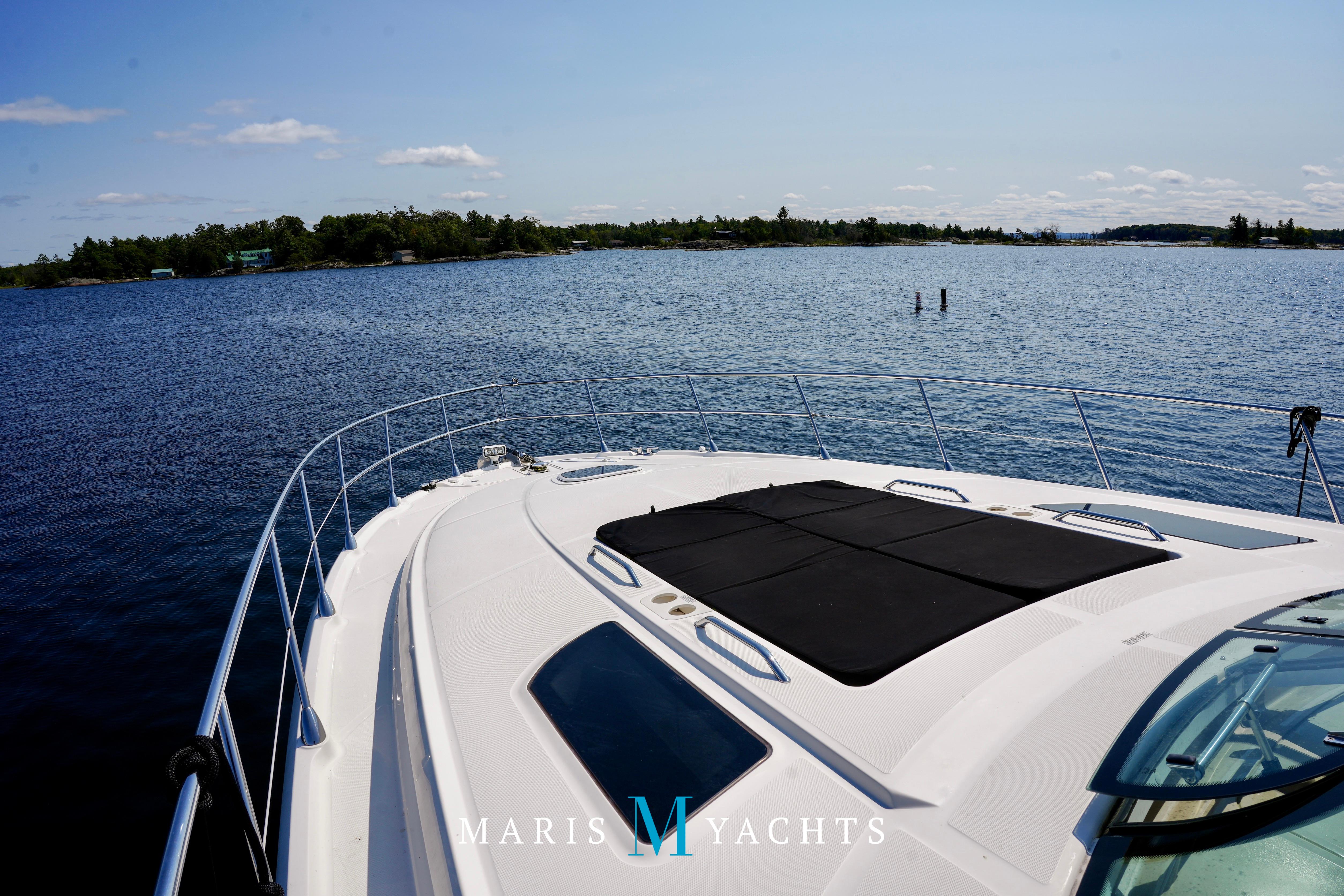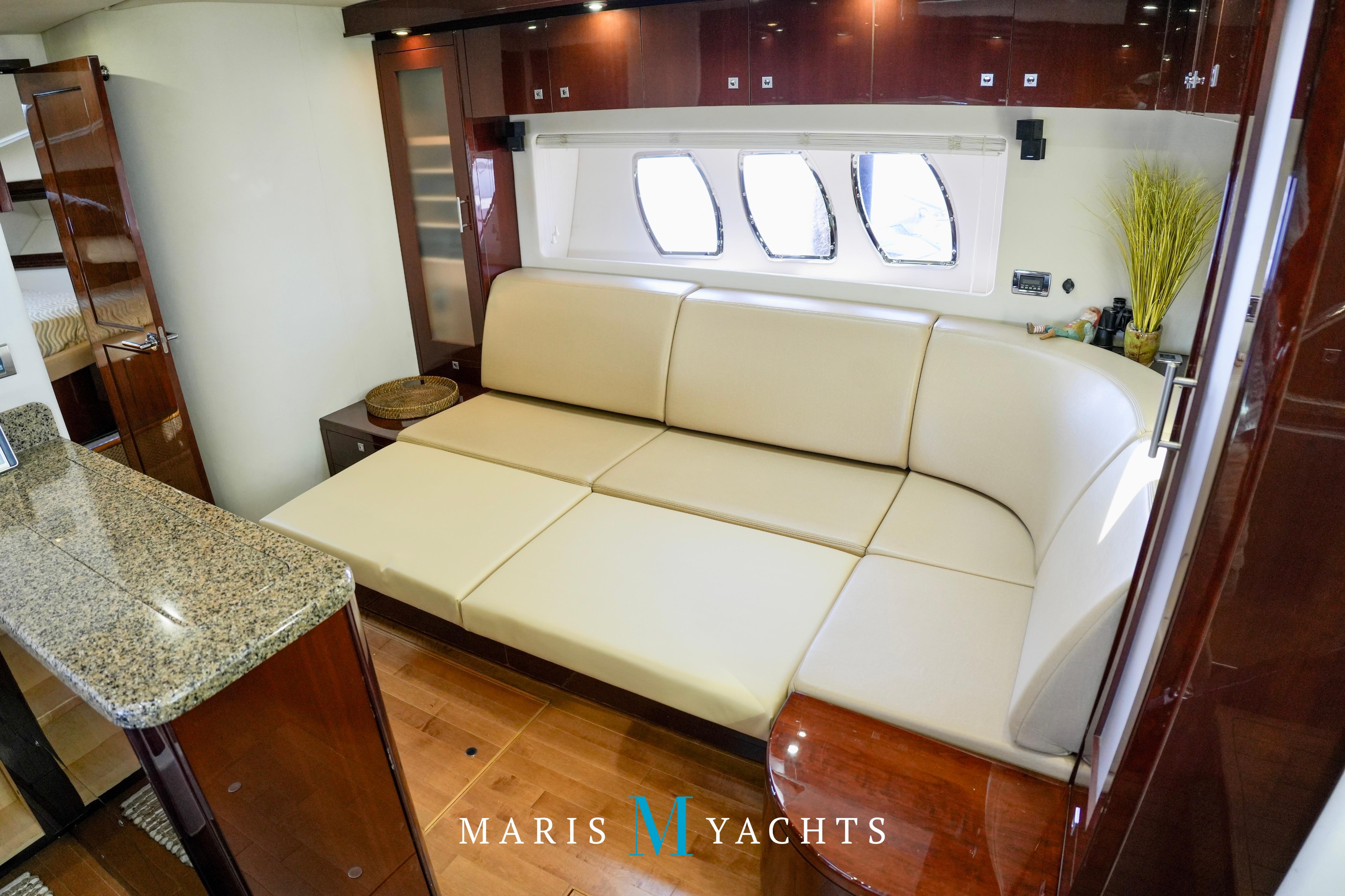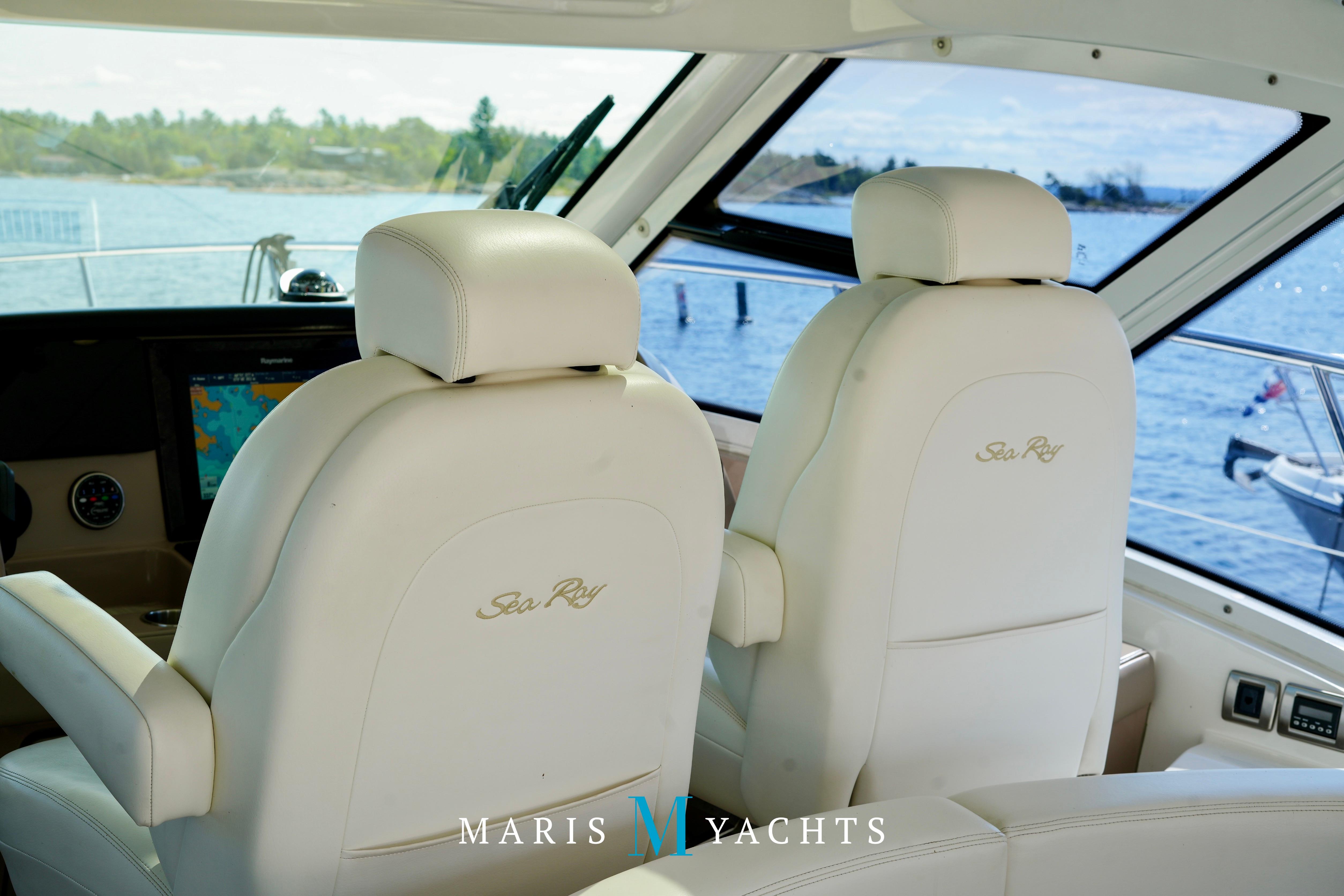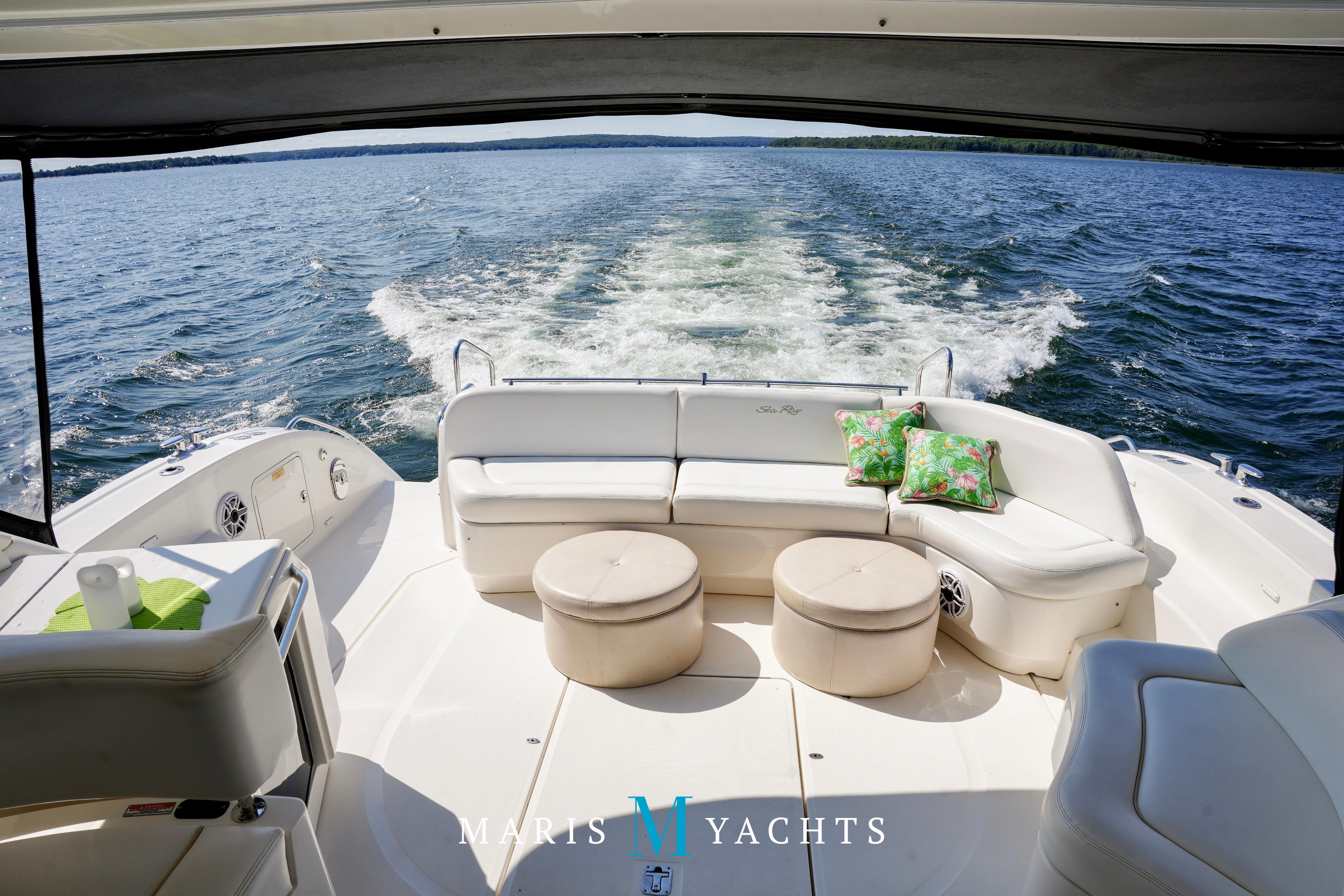 The 2009 Sea Ray 55 Sundancer, which became rebranded in 2010 as the 580 Sundancer, is a luxurious and impeccably designed yacht that offers unparalleled comfort and functionality. With its two-stateroom layout and expansive cockpit, the 55 Sundancer is the ultimate boat for entertaining and relaxing in style.This vessel underwent a significant upgrade in 2022 with the installation of two new FPT Marine engines, now with only 114 hours and 825HP each, in lieu of the 765HP MANN 800CR engines previously installed. She also is powered by a 21.5 Onan generator. The exterior of “Man O War” features a hydraulic swim platform, teak flooring in the upper cockpit, JL audio speakers, and a Fusion sound system. The large aft bench seating area includes a high-gloss table with two removable chairs, while the midship customizable carousel seating in the cockpit enhances versatility – providing the perfect space for social gatherings. The cockpit also has a fully equipped wet bar complete with sink, ice maker, fridge, electric grill and a mounted flat screen TV. The helm station is designed for ease of navigation and comfort, featuring fully adjustable dual captain’s seats with excellent visibility and a double-wide companion seat on the port side. The hardtop is enclosed and includes two independent retractable sunroofs and power side windows, offering both protection from the elements and a connection to the open air.The helm is equipped with dual Raymarine Hybrid Touch screen GS series color displays with GPS, plotter, radar and autopilot with a smart controller. Bow and stern thrusters ensure effortless maneuvering in any docking situation. Below deck, the cabin has rich dark cherry cabinetry with ample storage, a pop-up flat-screen TV and an L-shaped Ultraleather settee with a slide out that converts this into a double bed, allowing 6 adults to comfortably sleep on board. The U-shaped galley is both stylish and functional, featuring a hidden microwave oven, a three-burner electric stove, a refrigerator, a freezer, a sink and ample storage space. The forward VIP stateroom offers a queen-sized island-style bed, a large closet, and private access to the day head, ensuring comfort and convenience for guests. The full-beam master stateroom, located midship, features a queen-sized island-style actuating bed with massage function, a full dresser, ample storage, a mounted flat-screen TV and access to the full ensuite head Featuring
